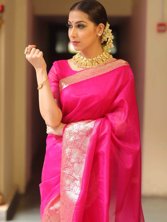 Organza Saree with Zari Border - Pink