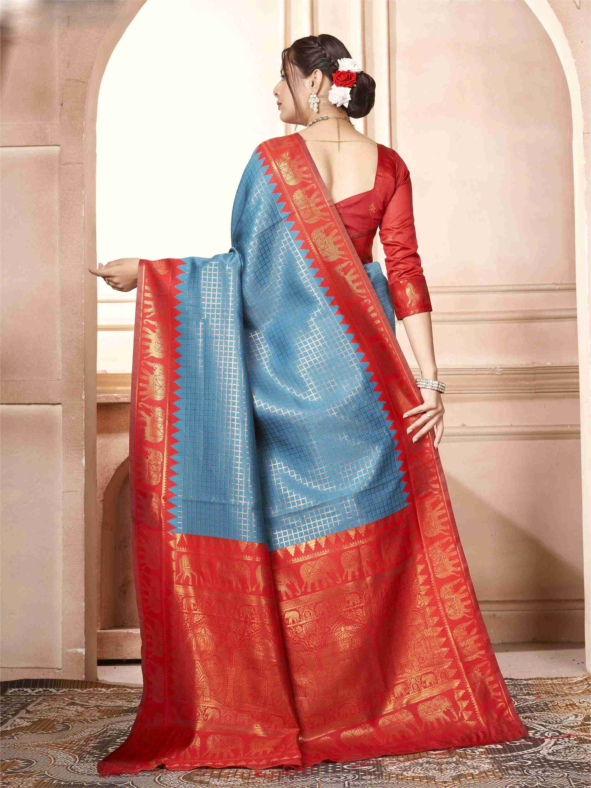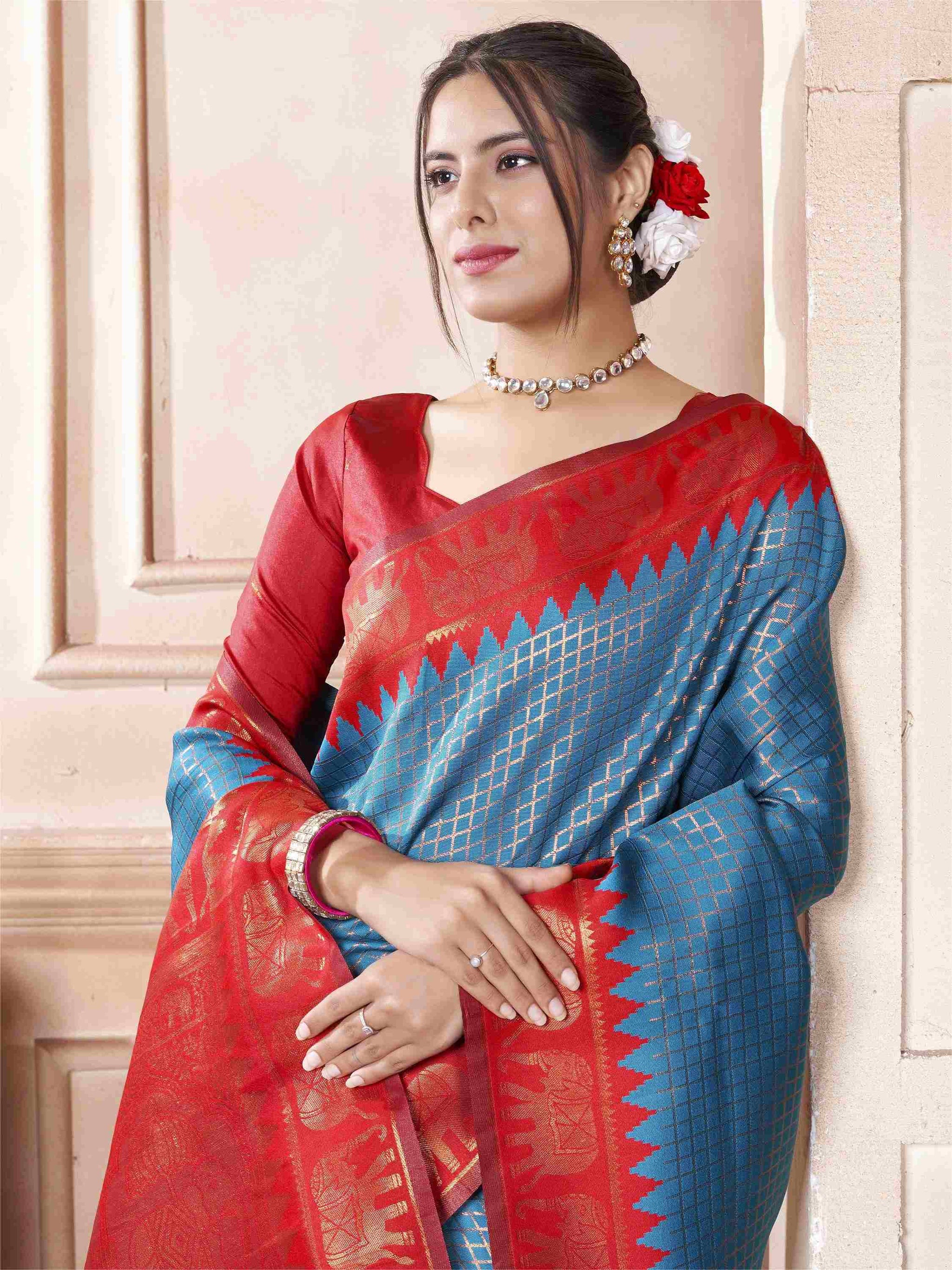 Azure Blue Kanjivaram Silk Saree with Red Border, featuring traditional ethnic motifs and rich zari weave—perfect for weddings, festivals, and party occasions.