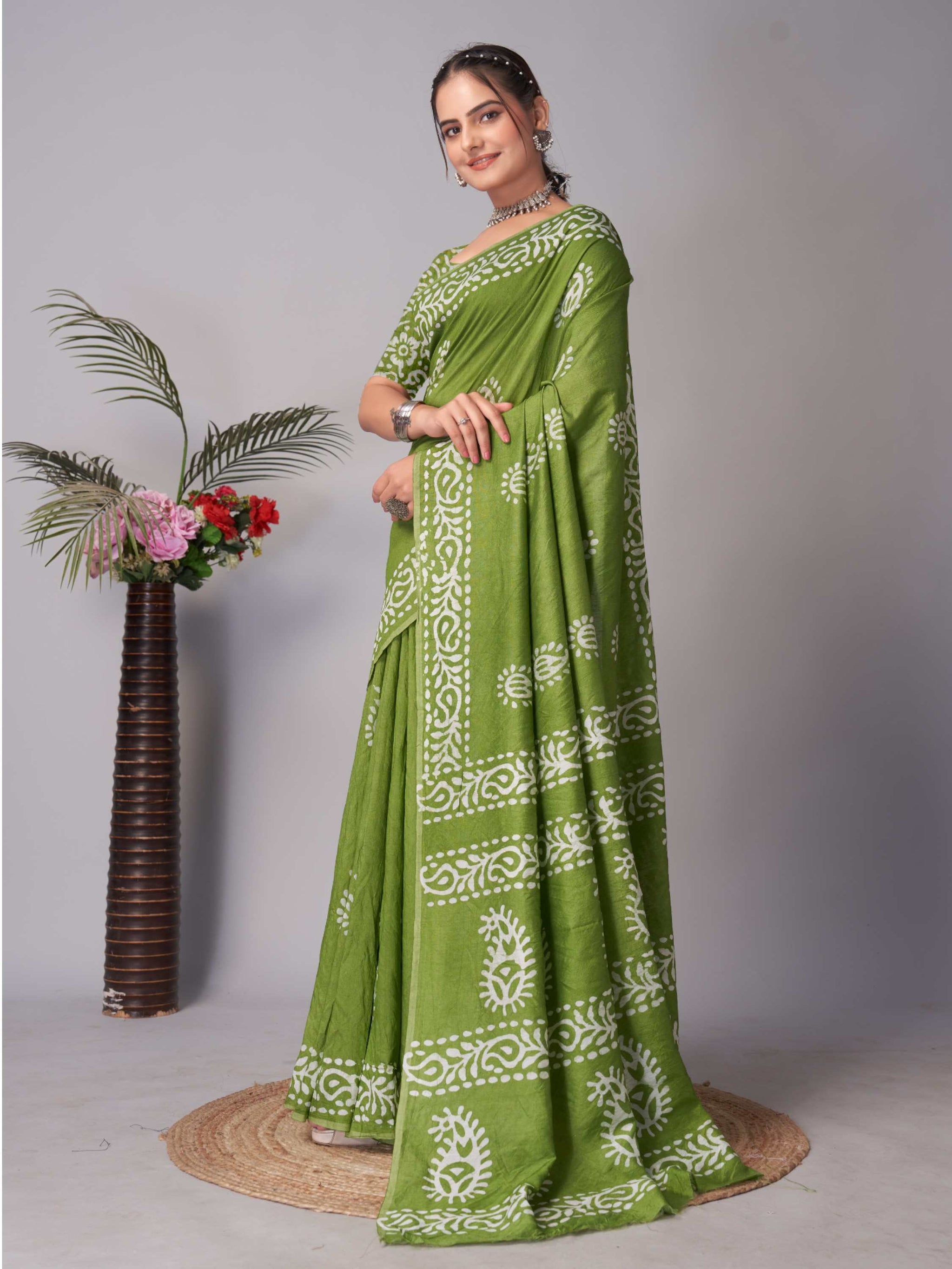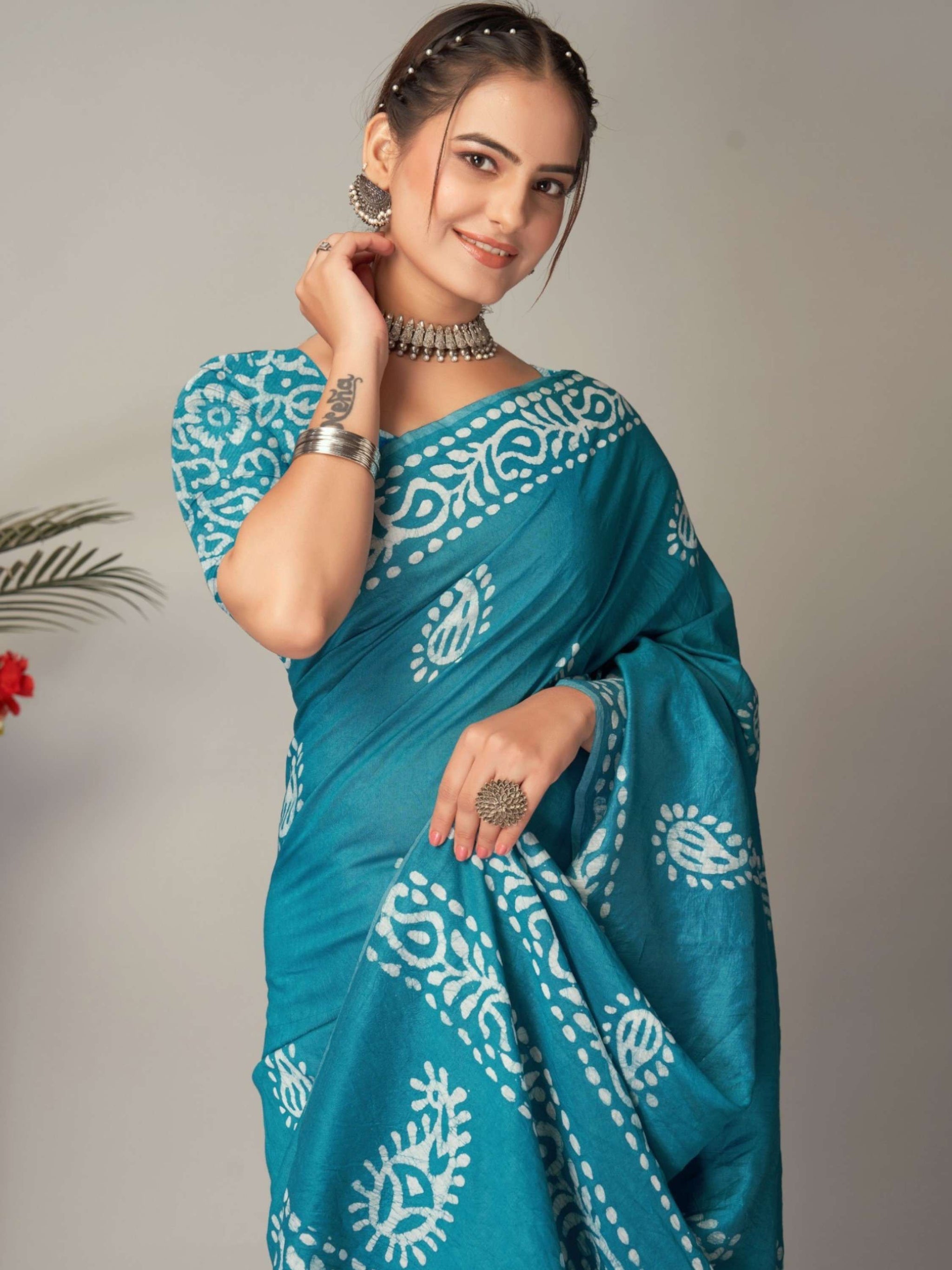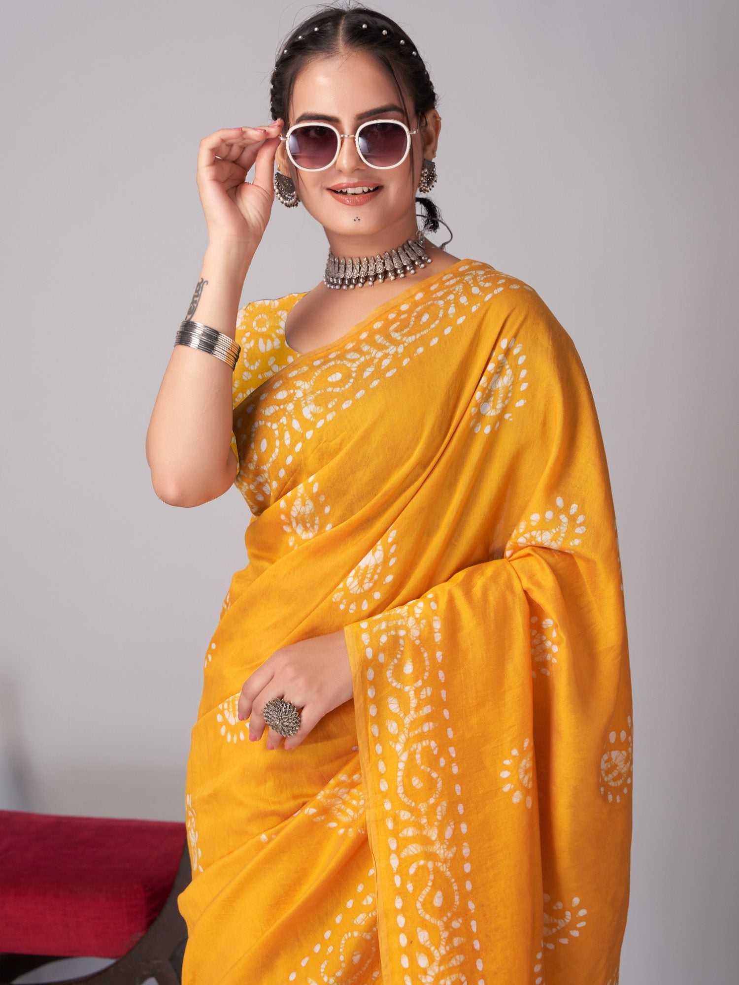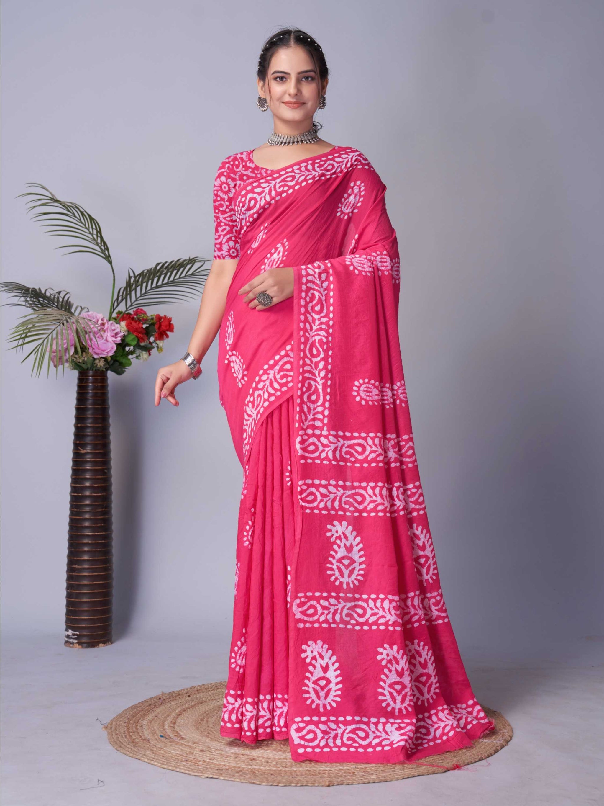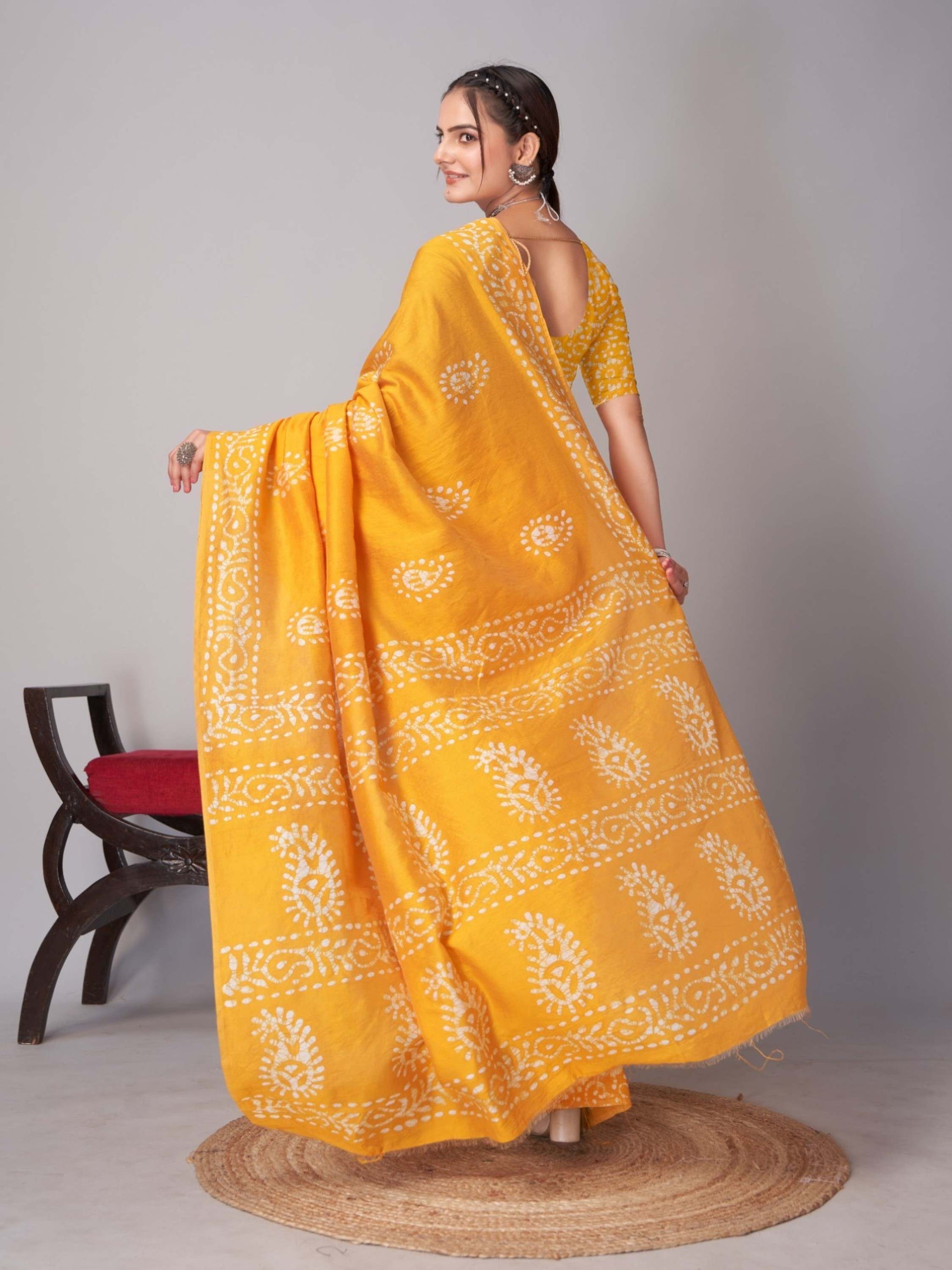 Hand-dyed Chanderi Cotton Saree with batik paisley print, printed border, and unstitched blouse. Perfect for daily and festive wear. Buy online now!