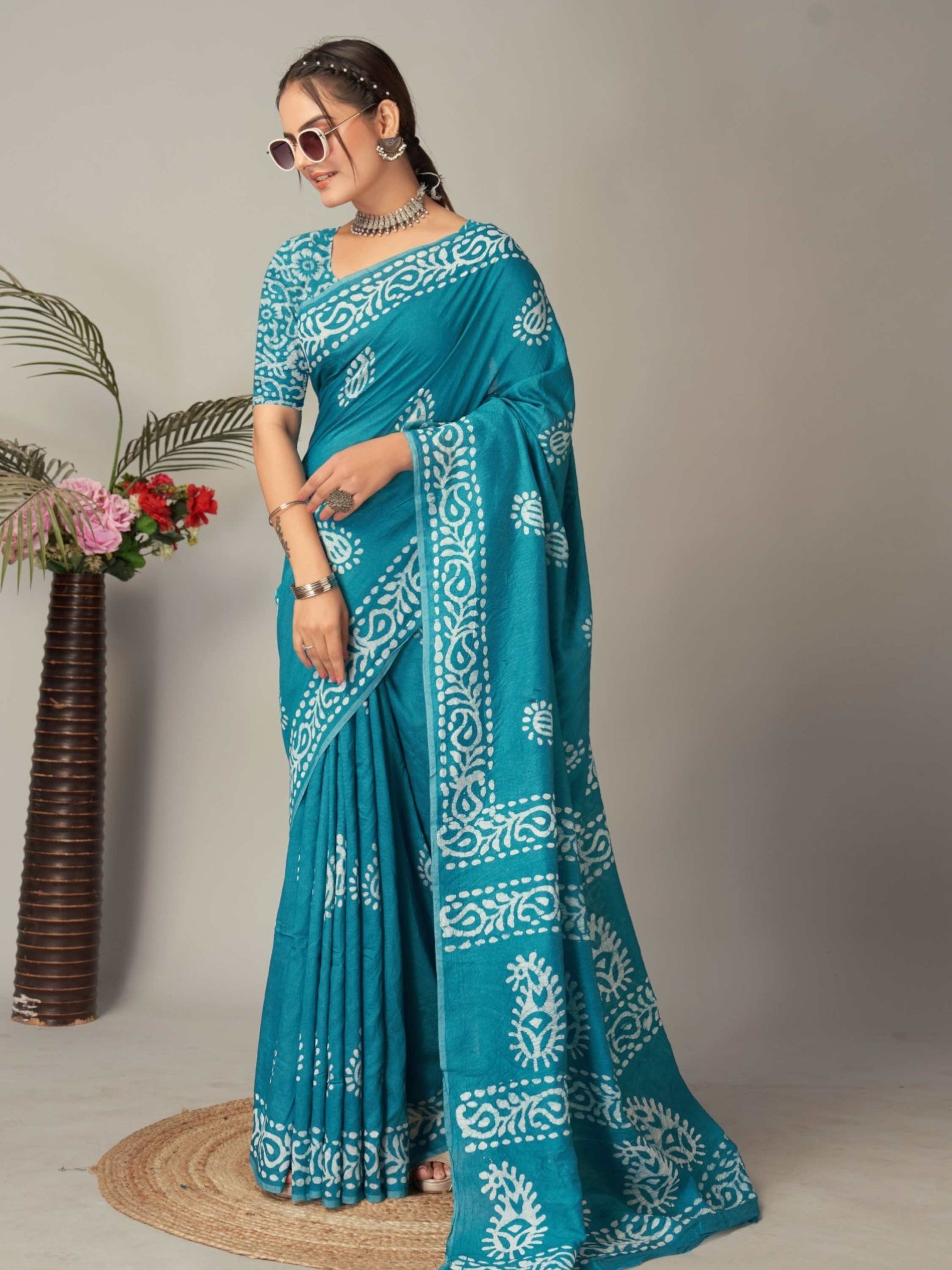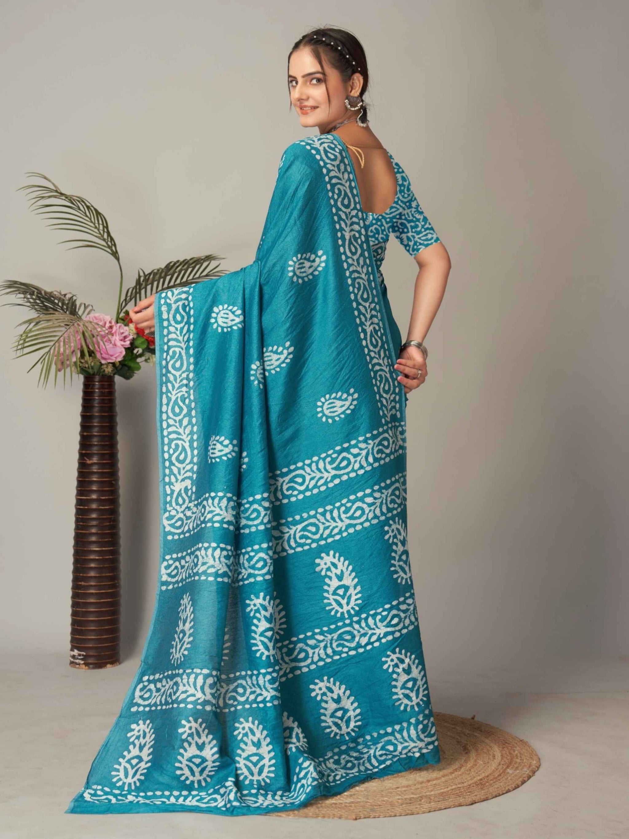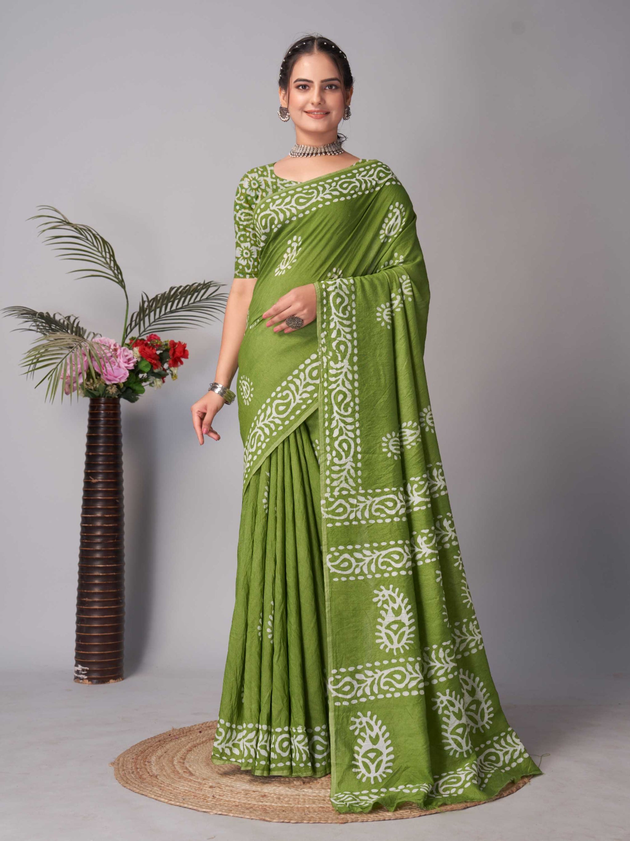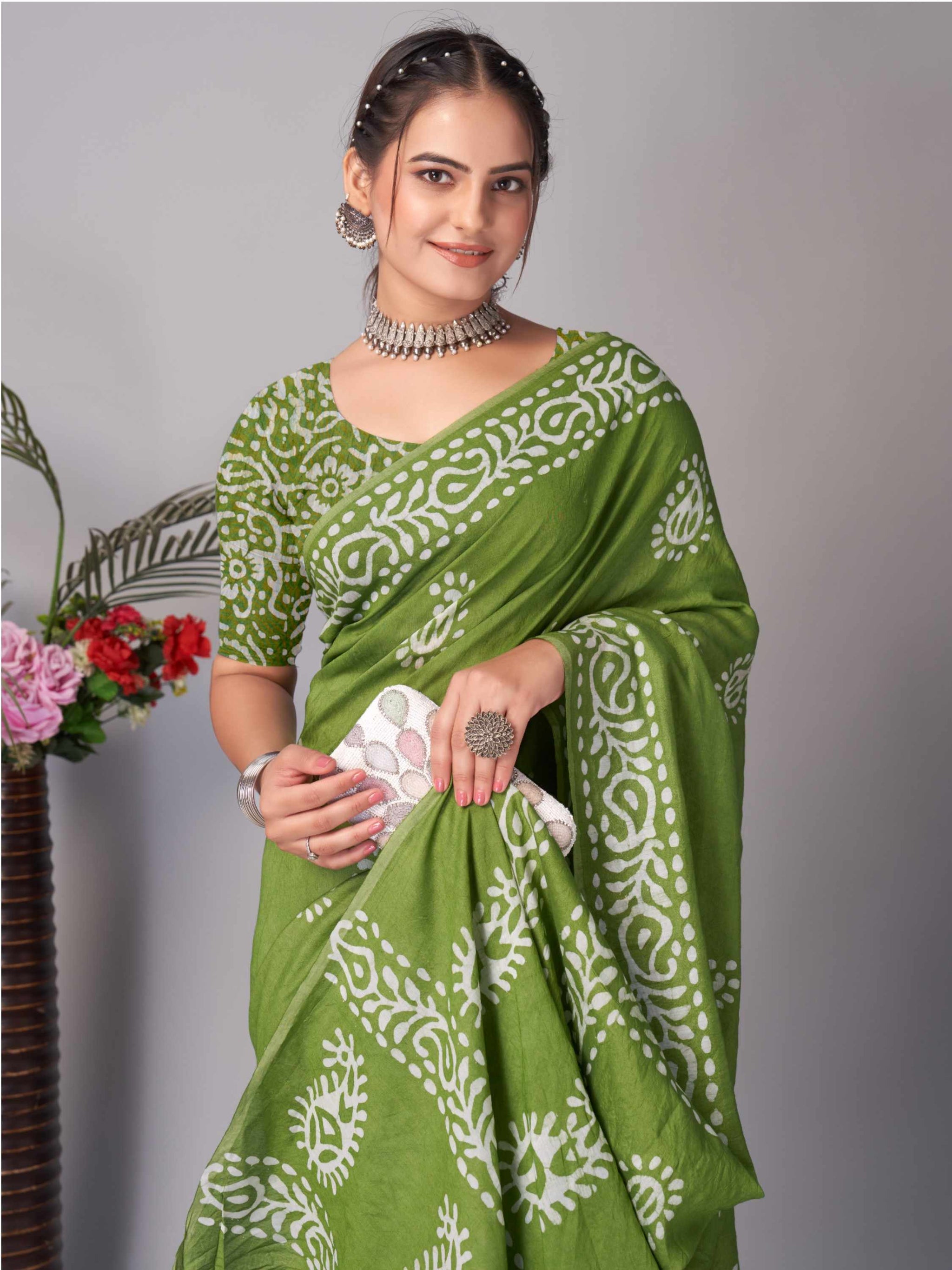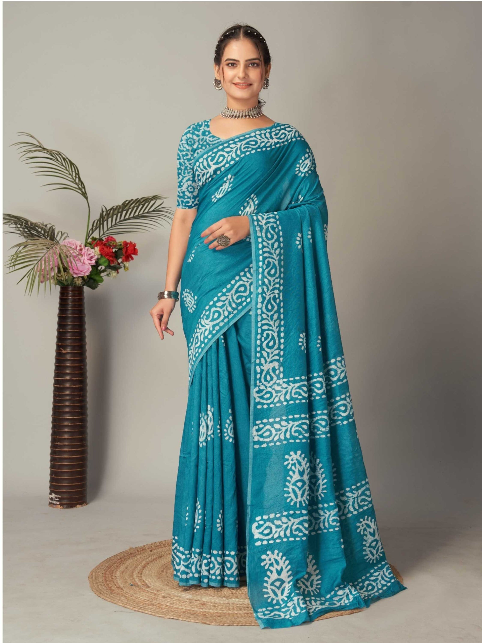 Hand-dyed Chanderi Cotton Saree with batik paisley print, printed border, and unstitched blouse. Perfect for daily and festive wear. Buy online now!