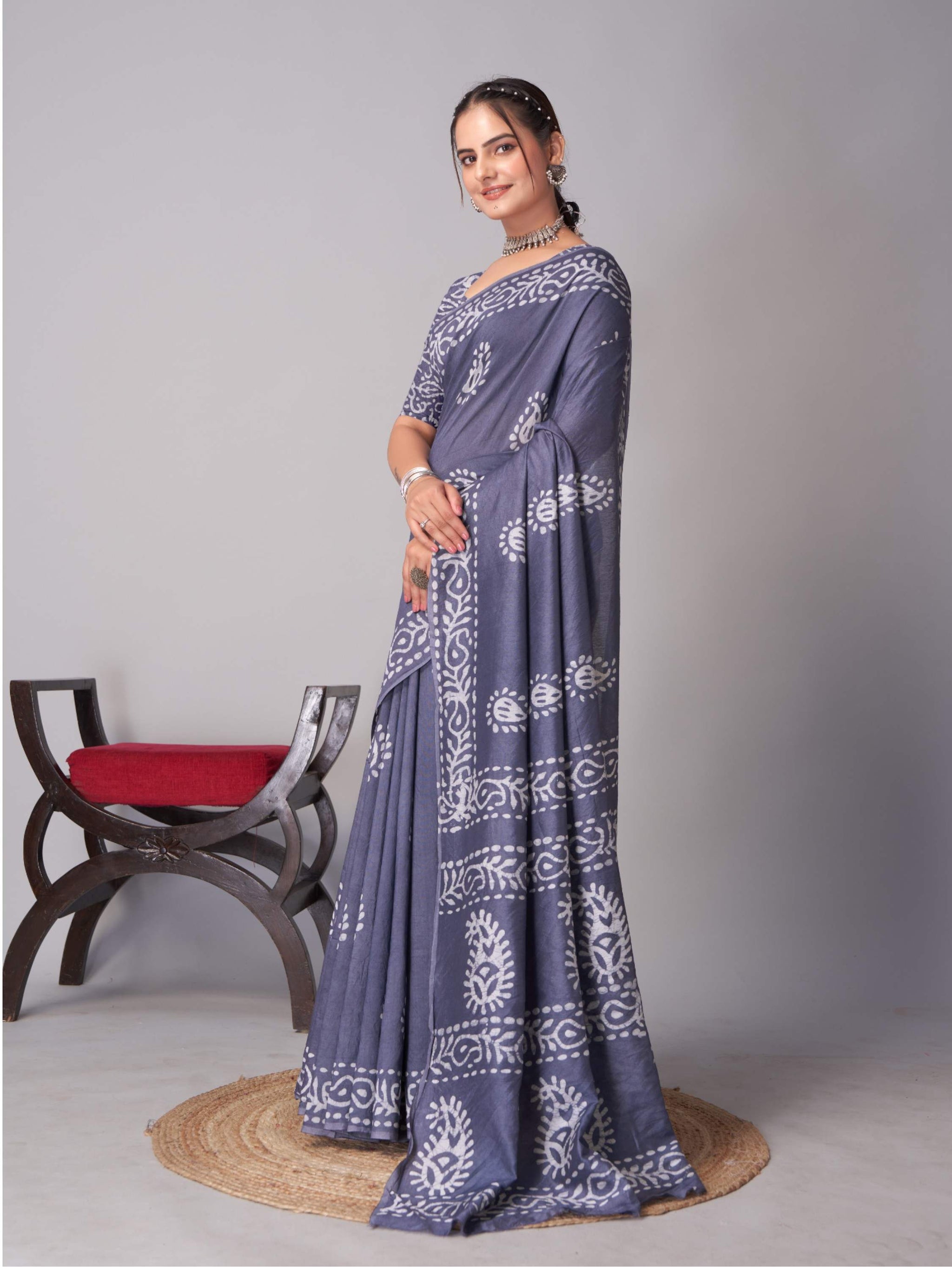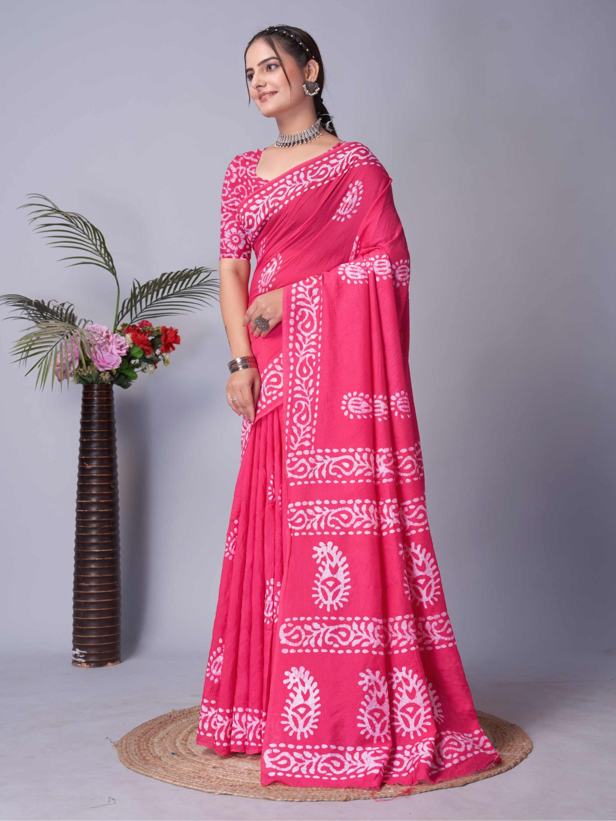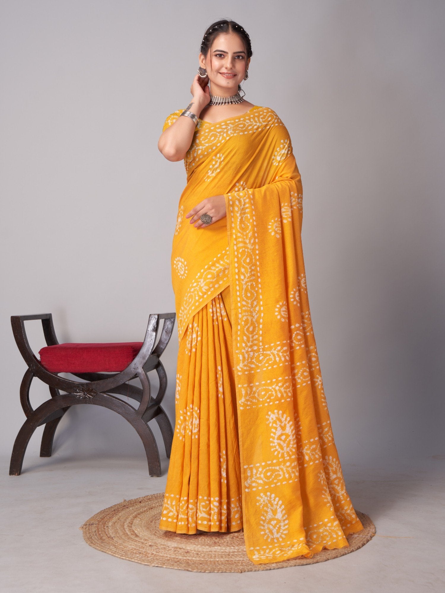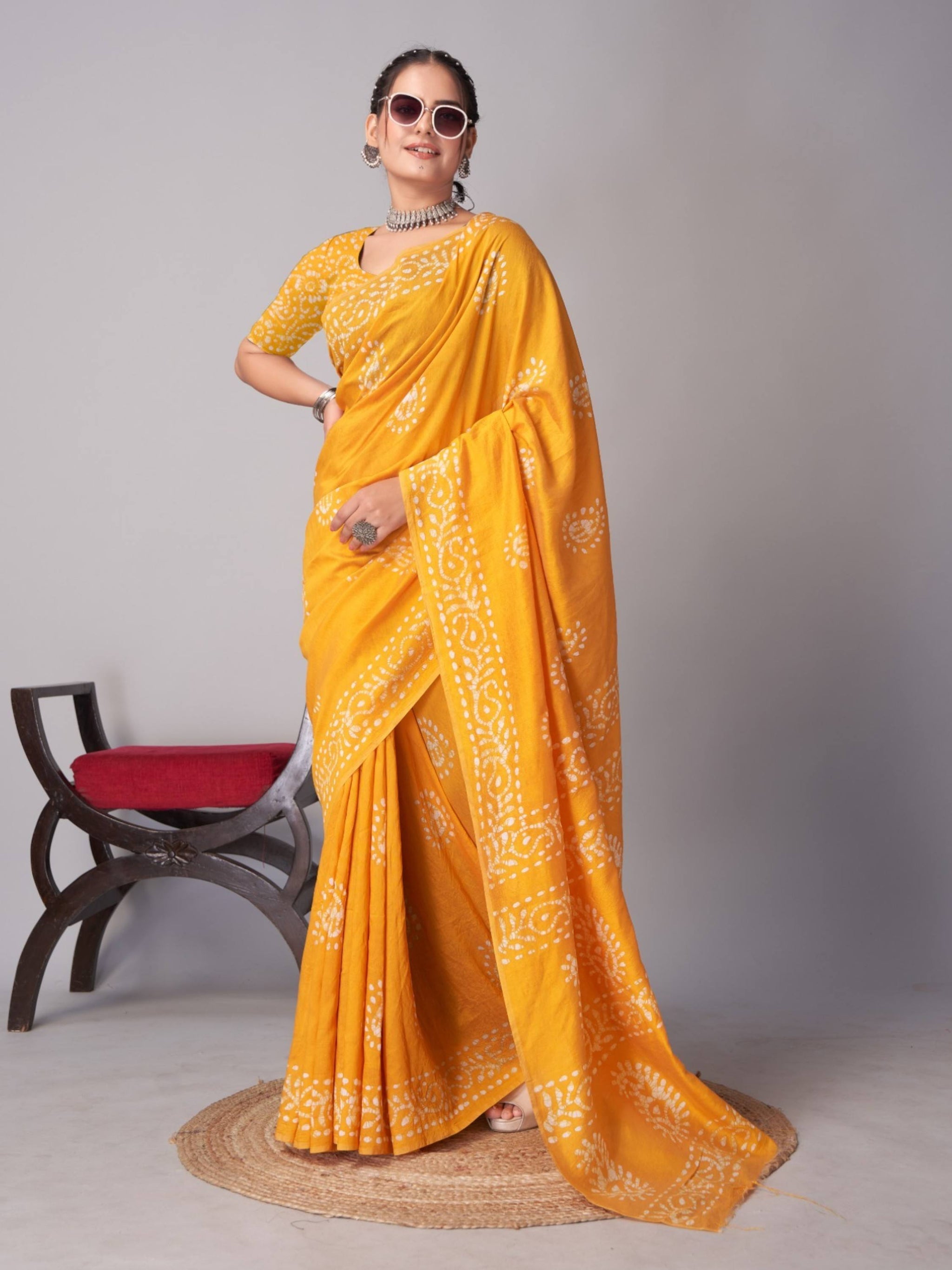Hand-dyed Chanderi Cotton Saree with batik paisley print, printed border, and unstitched blouse. Perfect for daily and festive wear. Buy online now!