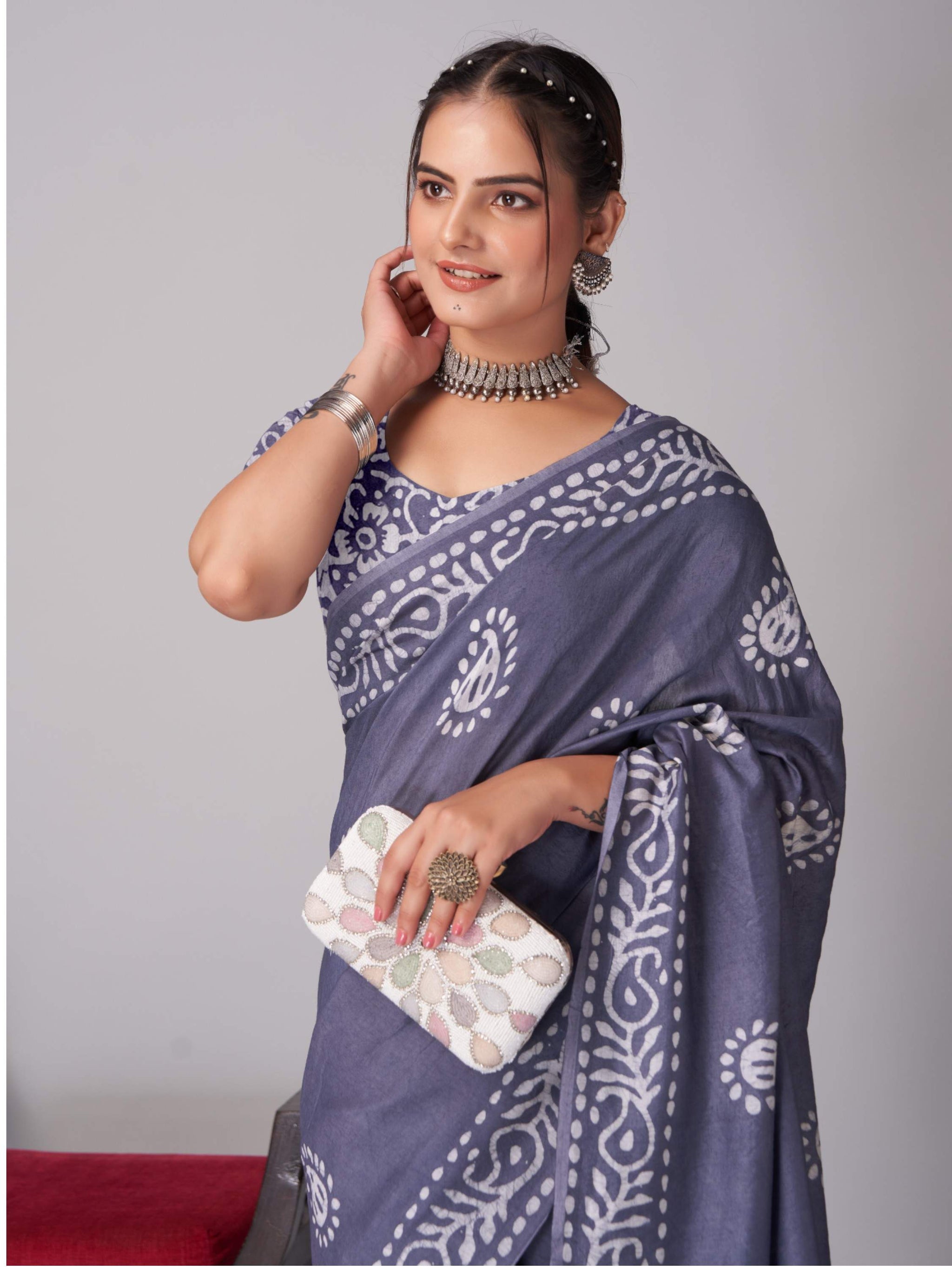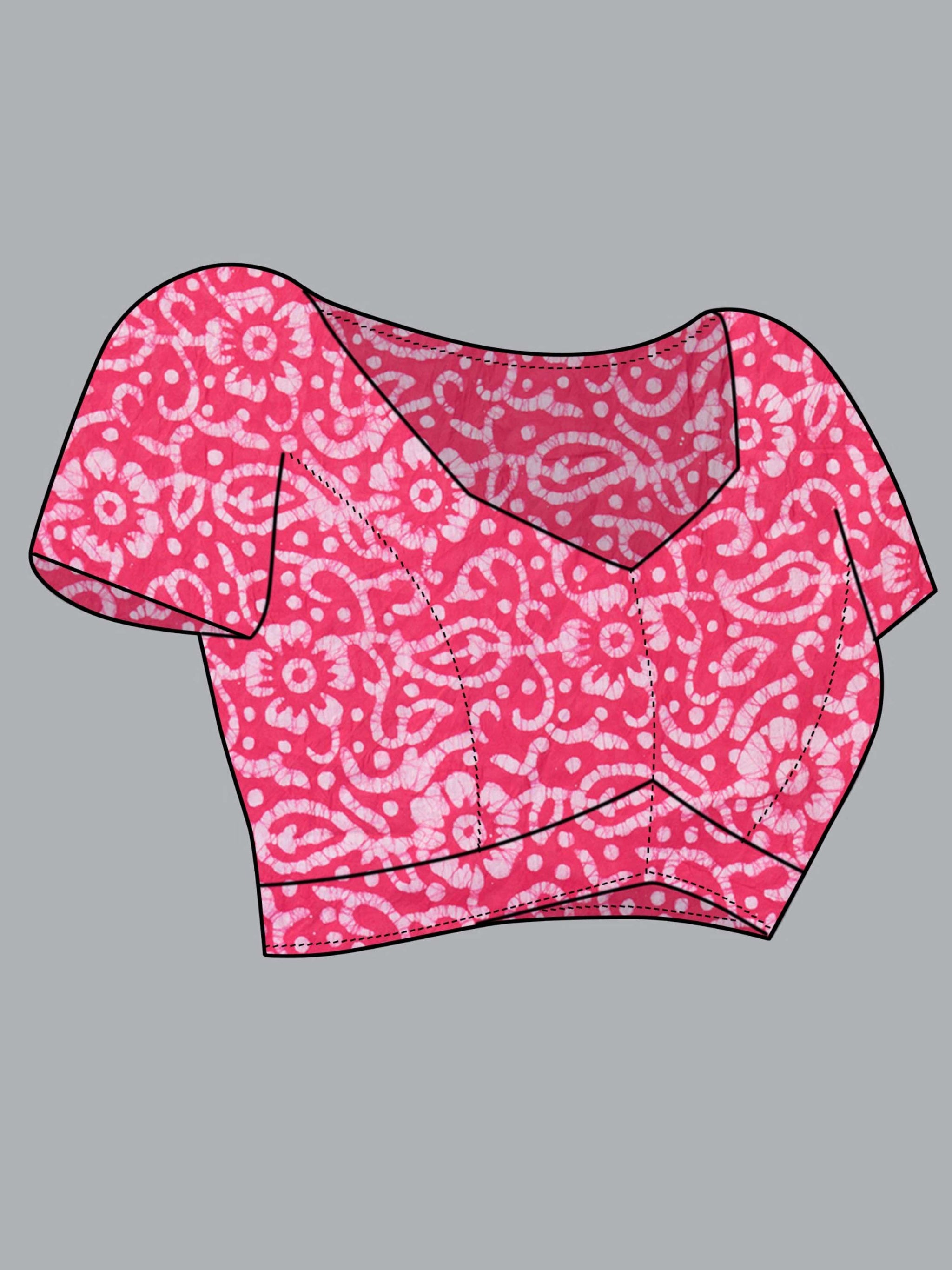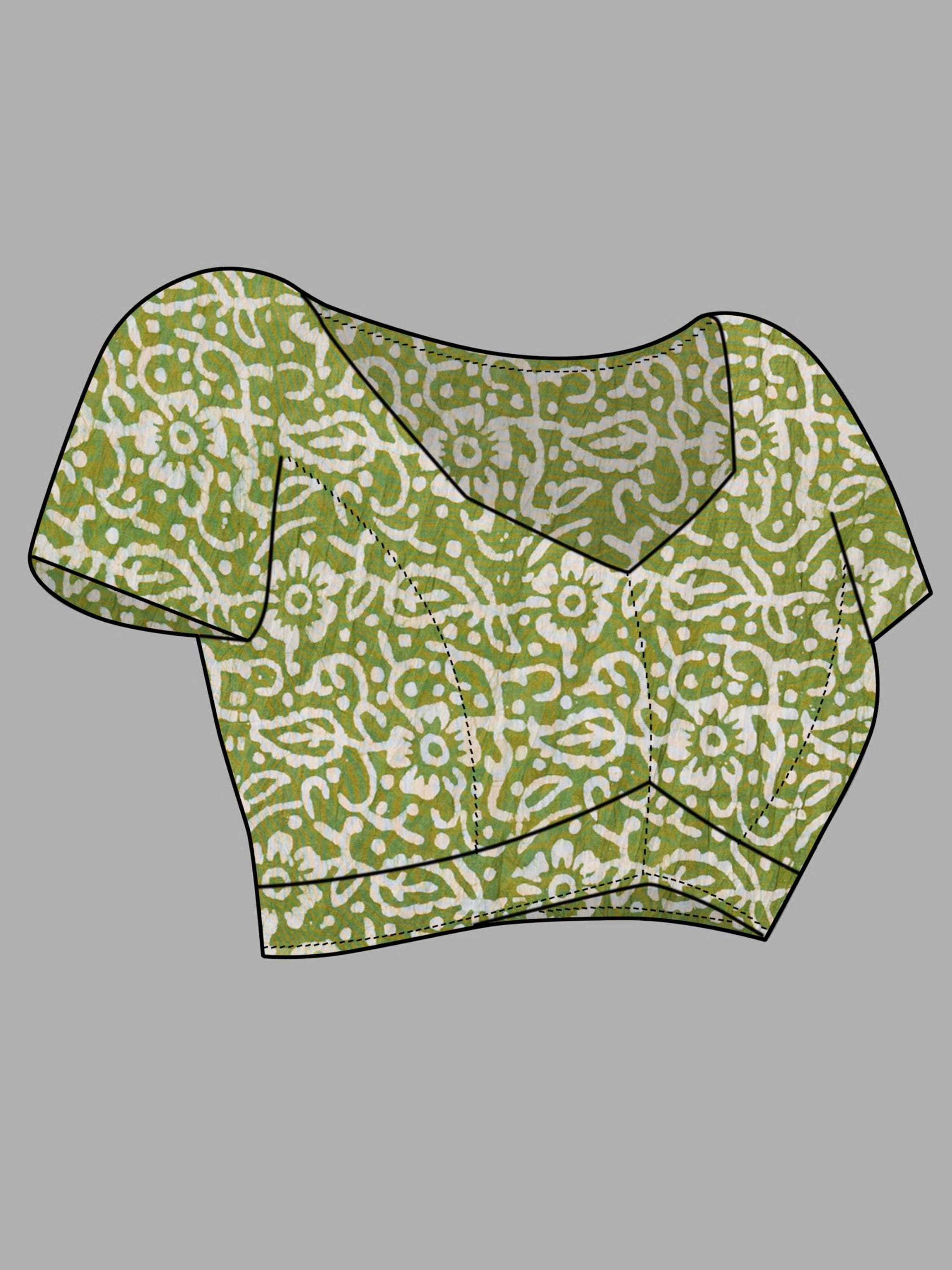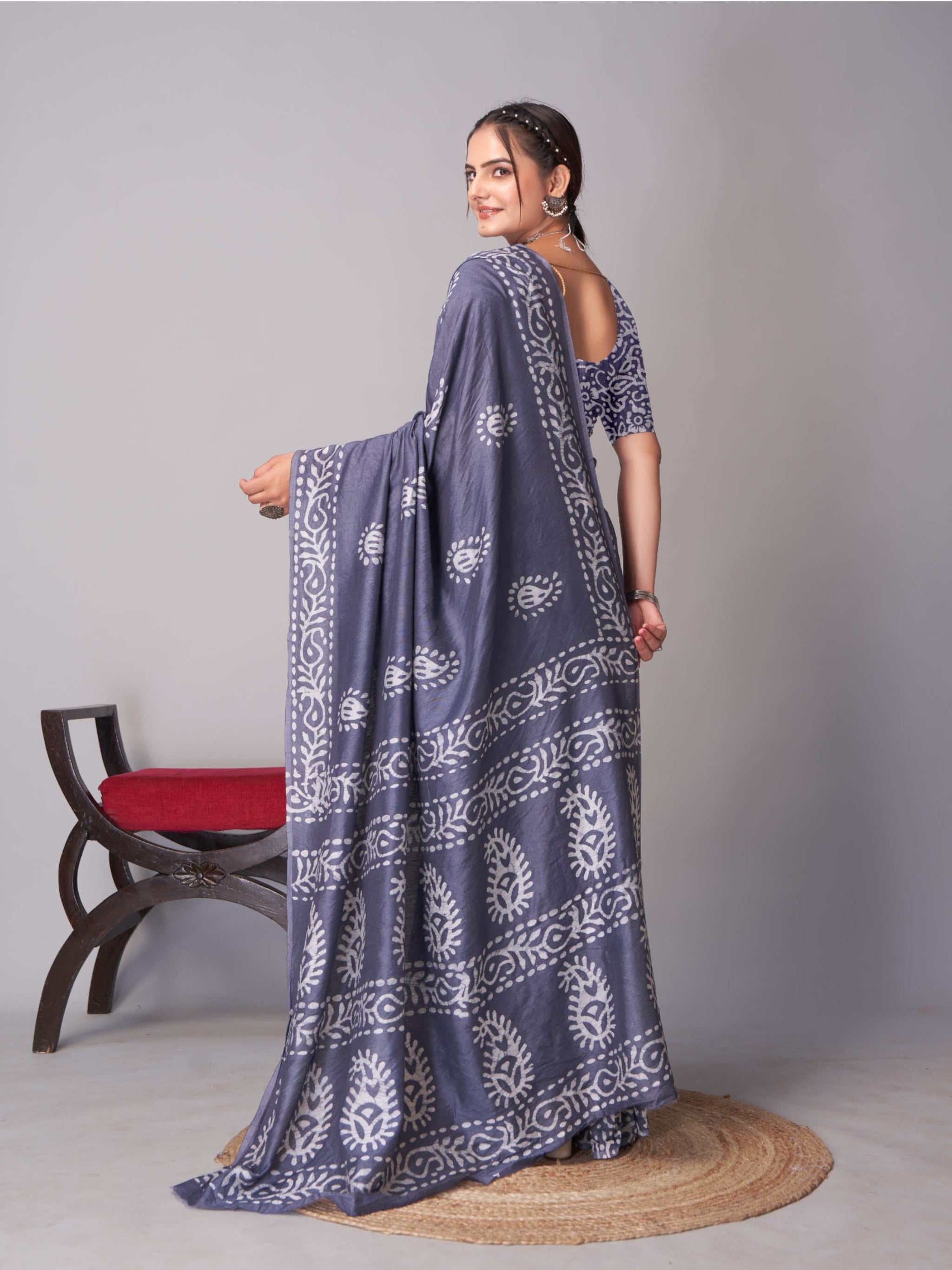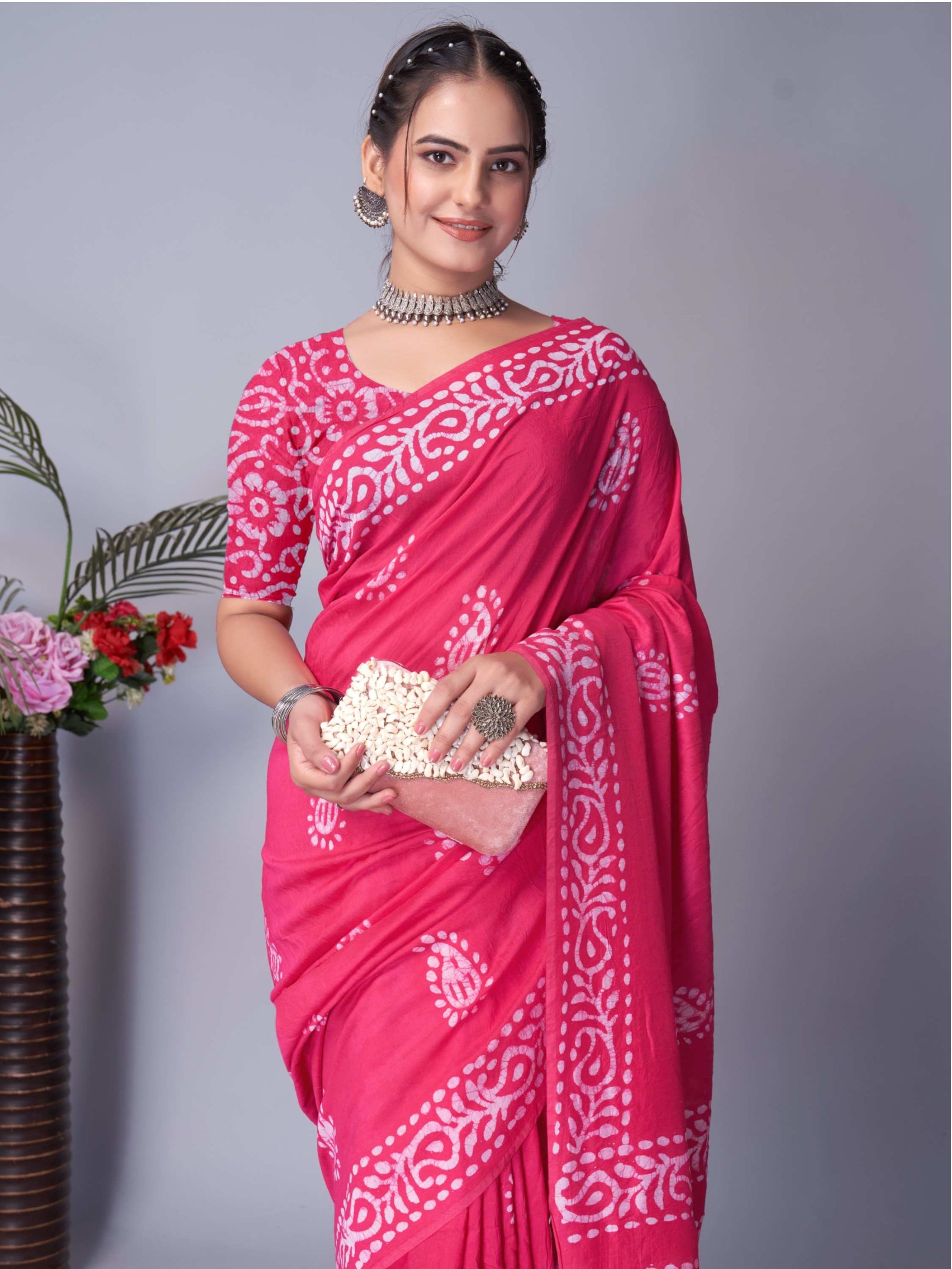 Hand-dyed Chanderi Cotton Saree with batik paisley print, printed border, and unstitched blouse. Perfect for daily and festive wear. Buy online now!