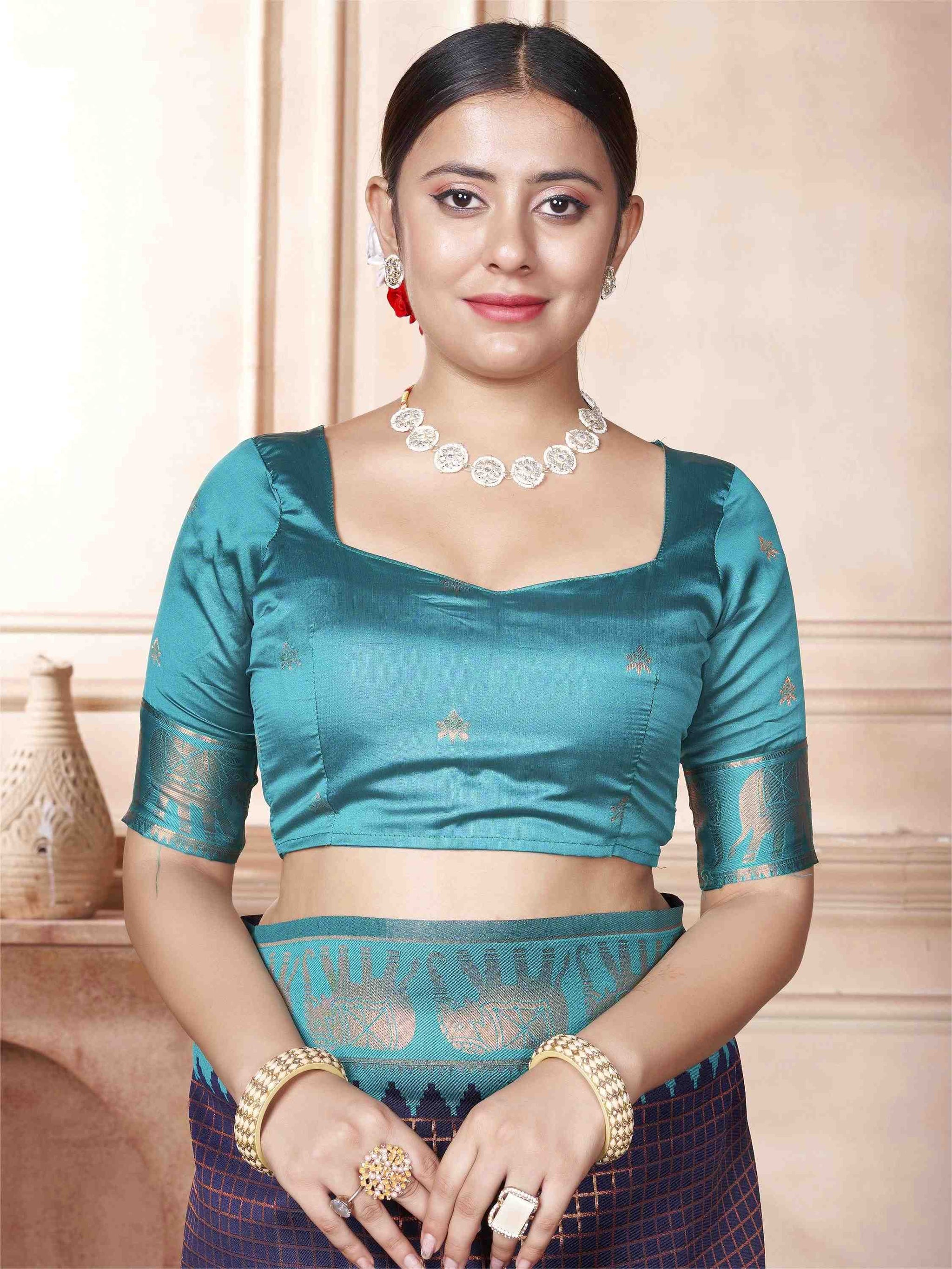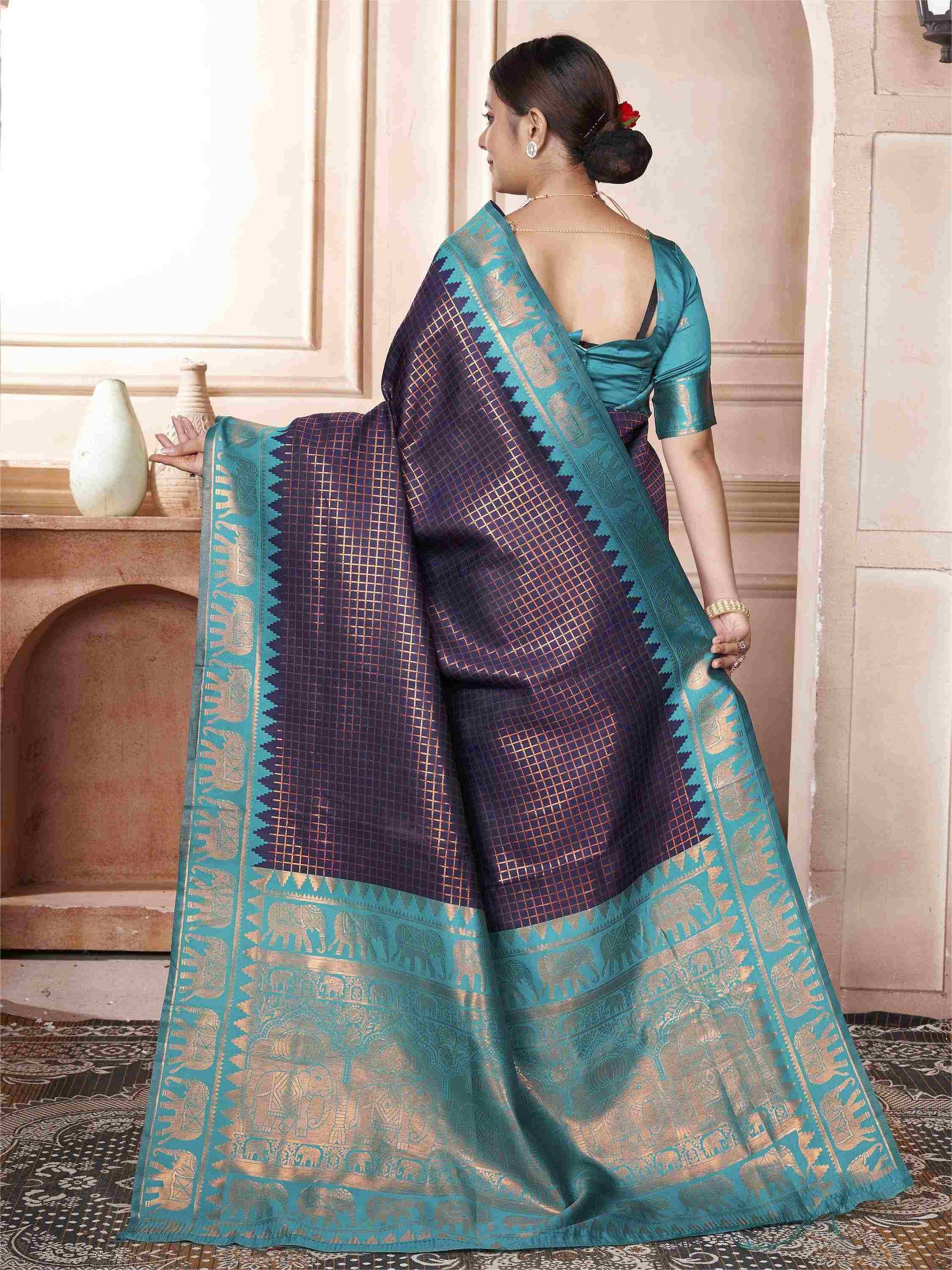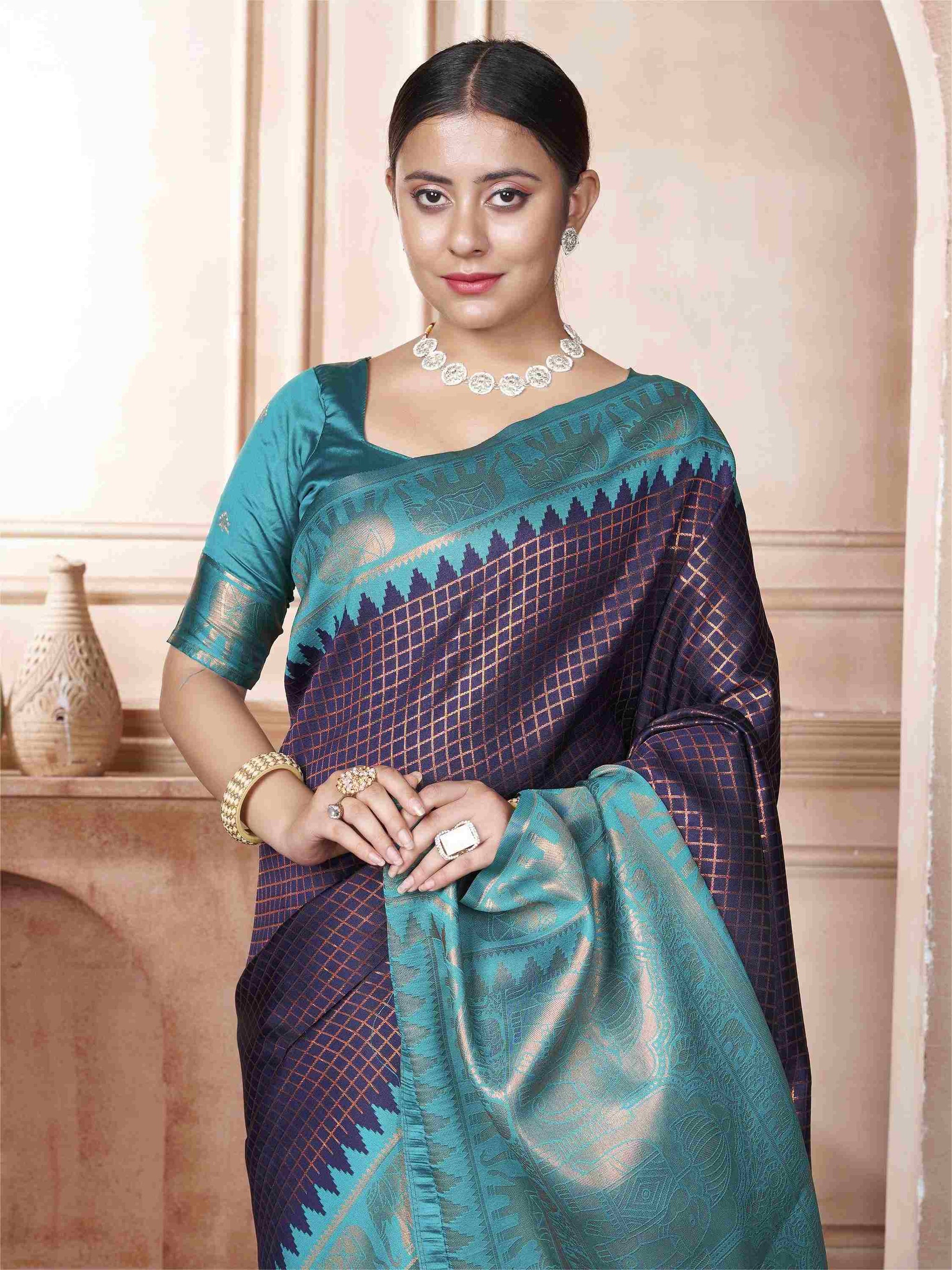 Blue Kanjivaram Silk Saree with Sky Blue Border, featuring traditional ethnic motifs and rich zari weave—perfect for weddings, festivals and party occasions.