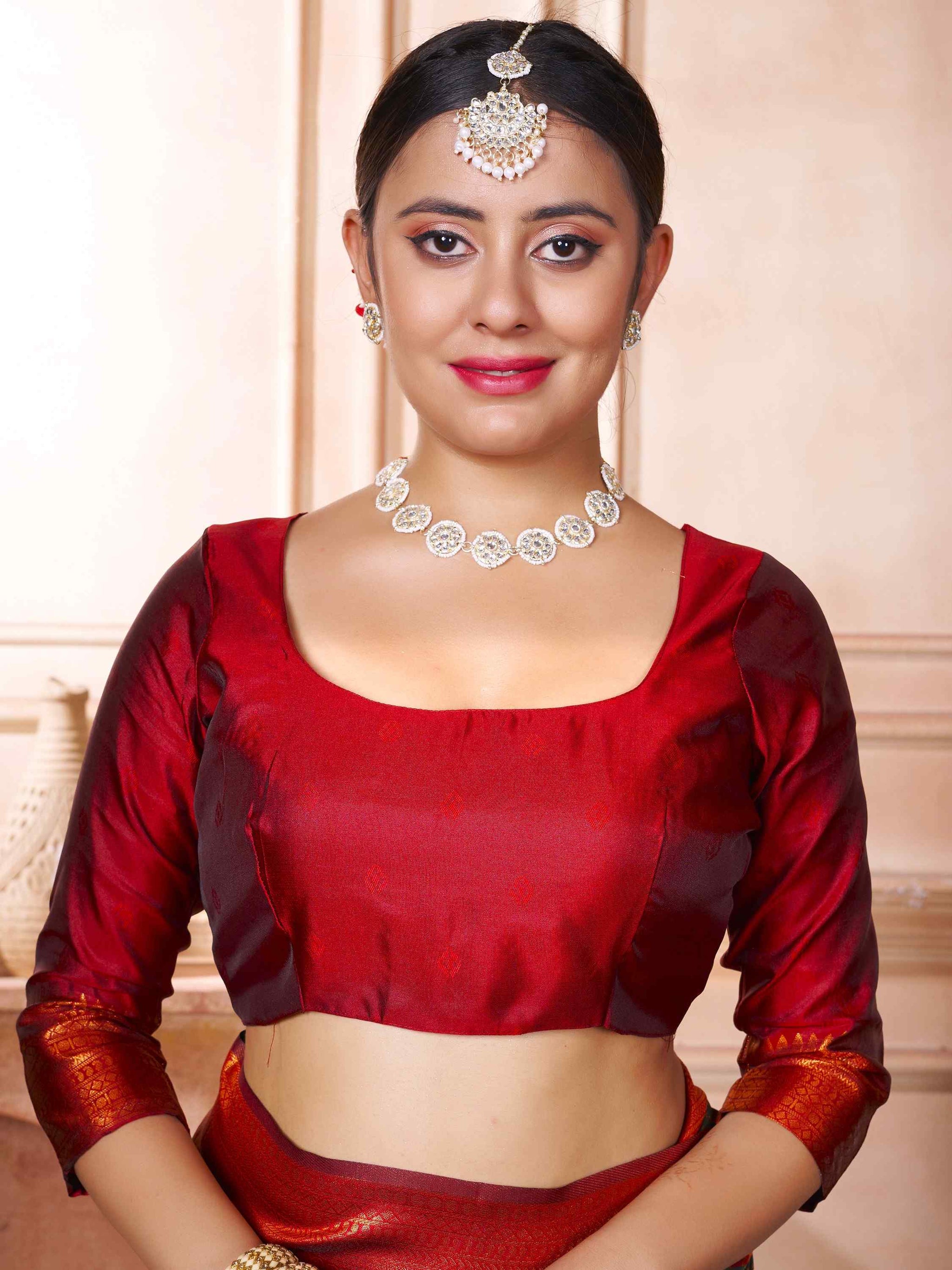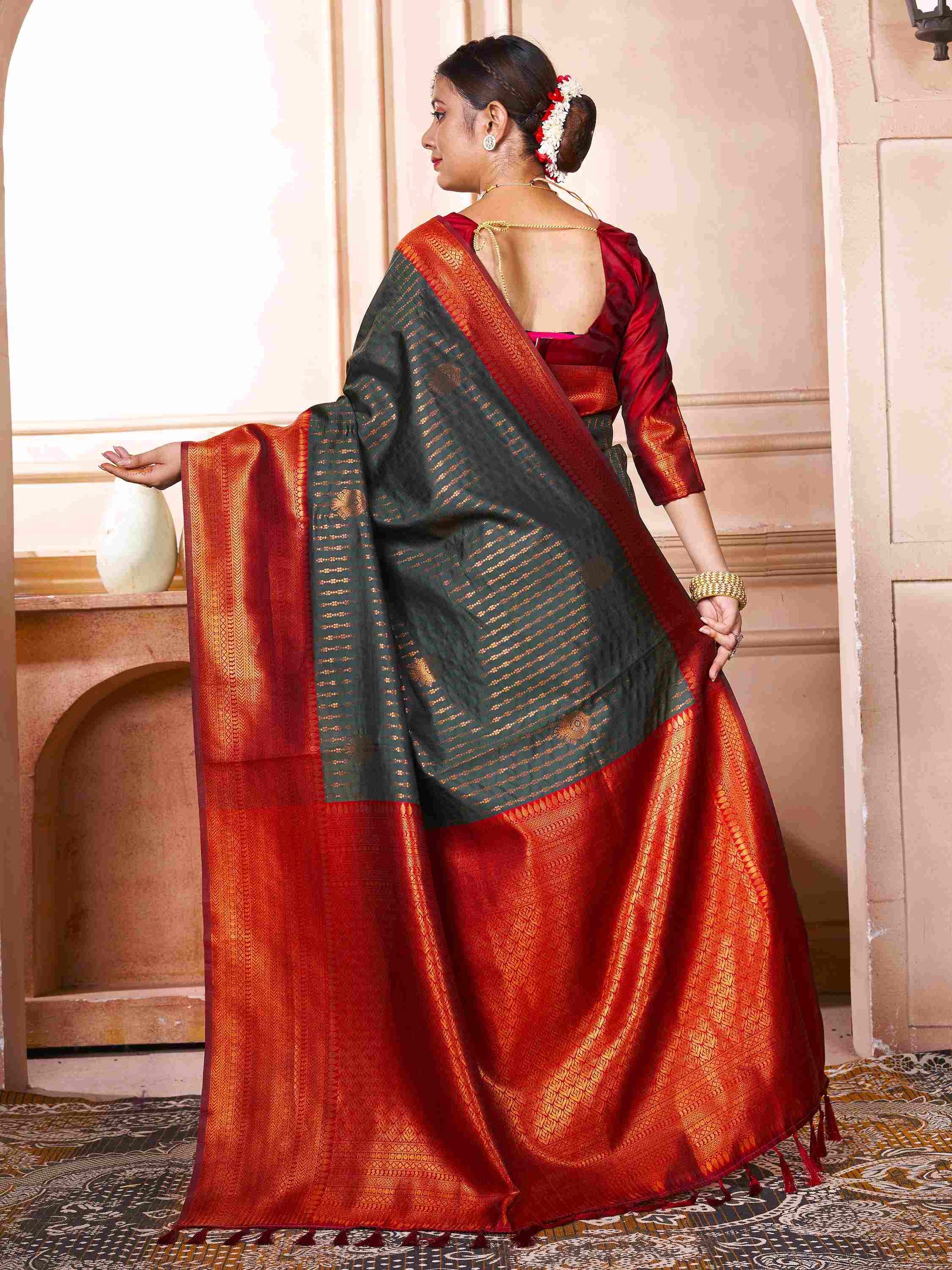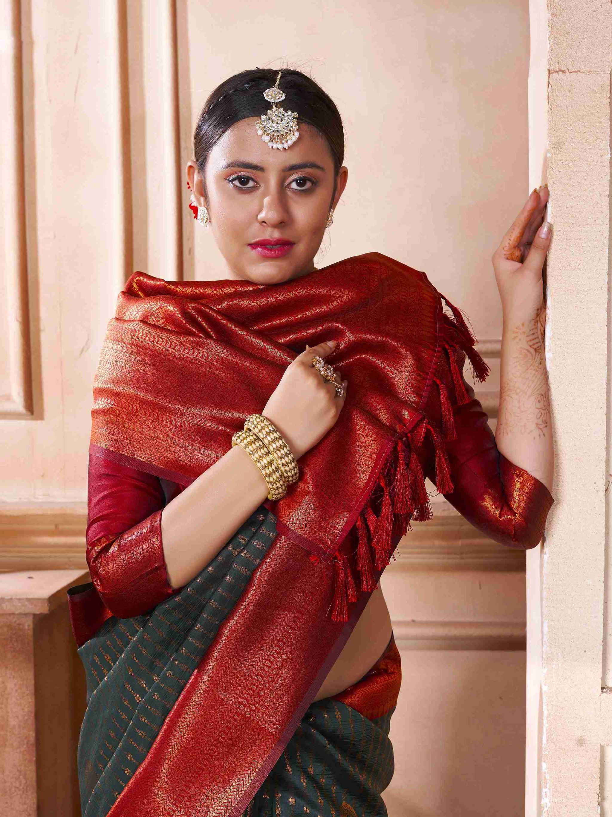 Bottle Green Kanjivaram Silk Saree has maroon border, pallu and blouse piece. This Kanchipuram Silk saree has all-over zari work, makes it perfect for wedding.