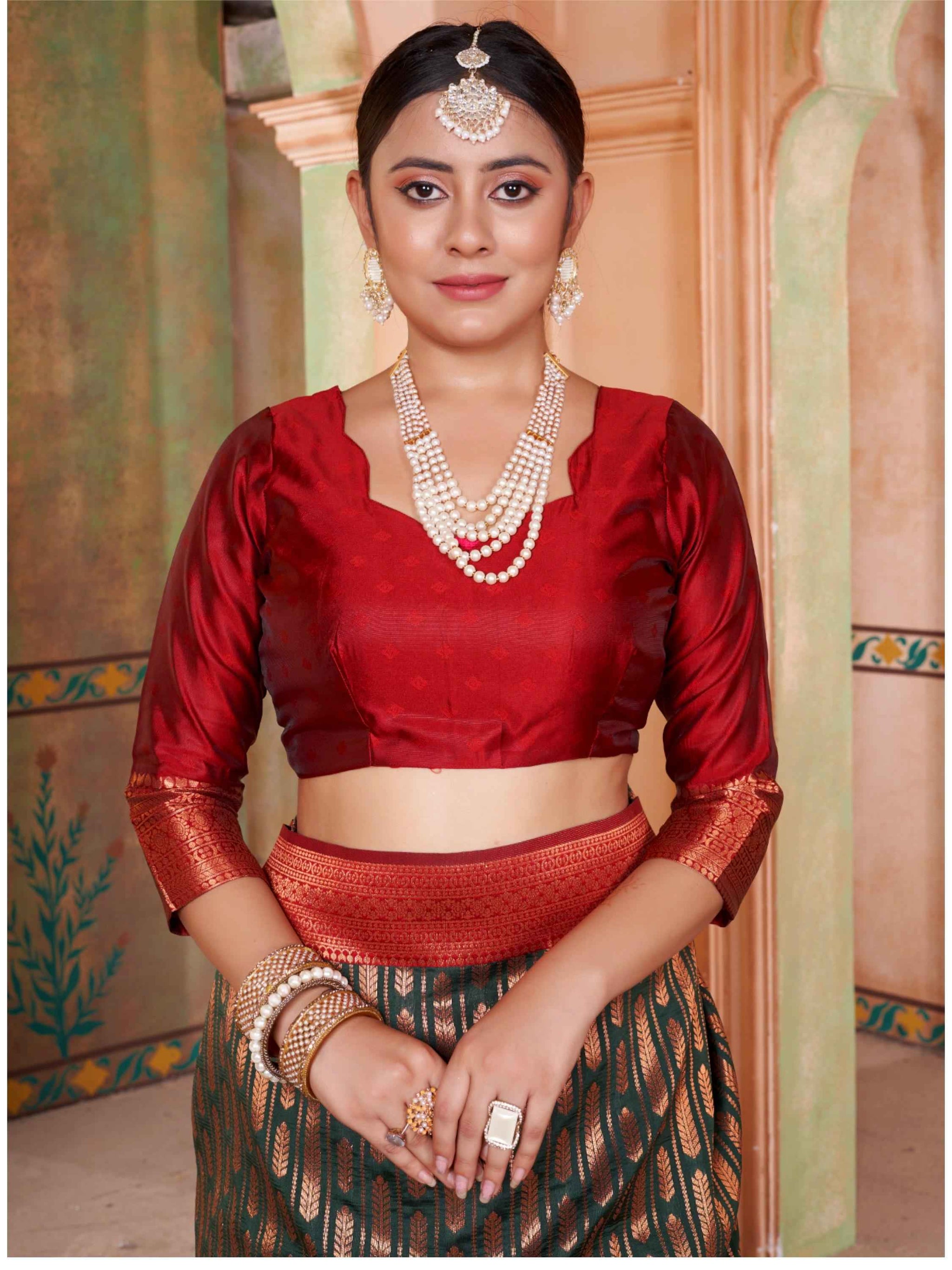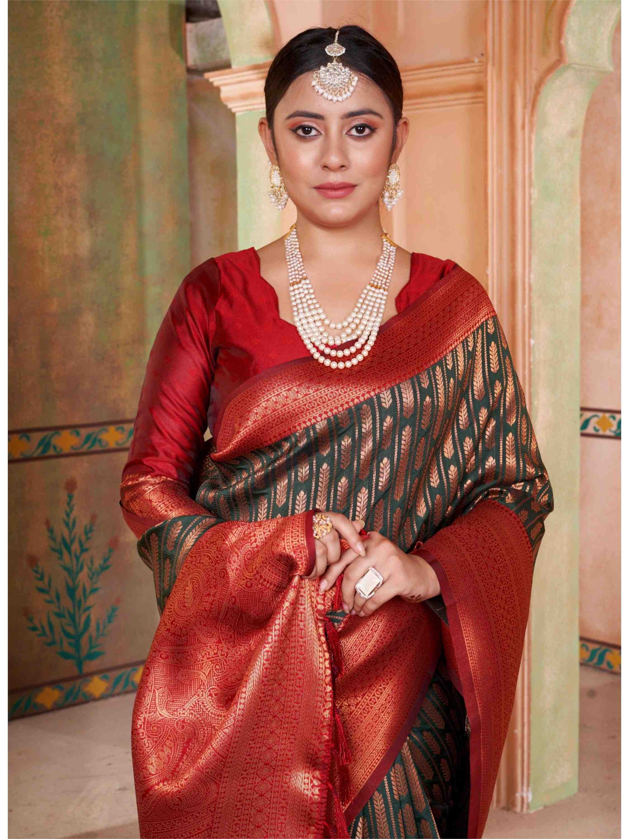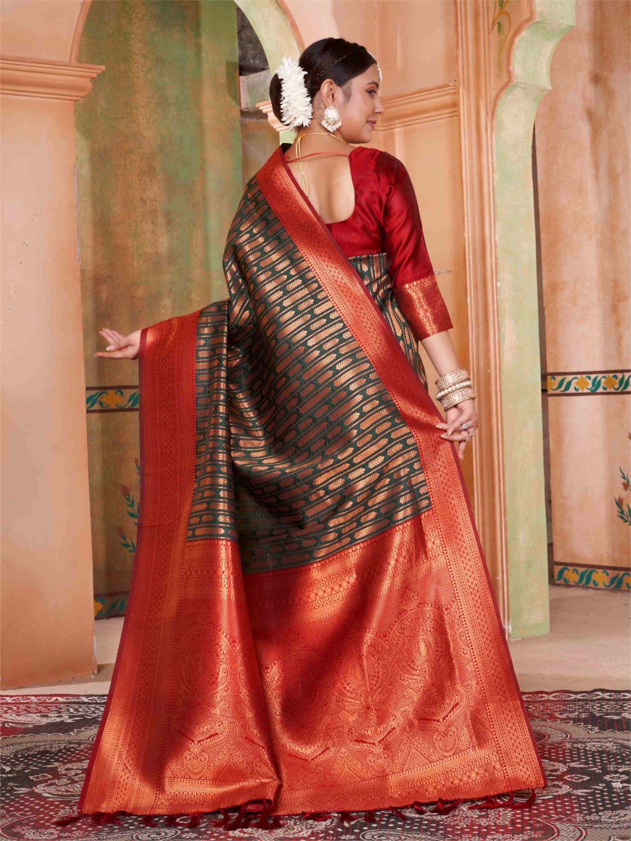Bottle Green Kanjivaram Silk Saree with Maroon Border, featuring traditional ethnic motifs and rich zari weave—perfect for weddings, festivals & party occasions