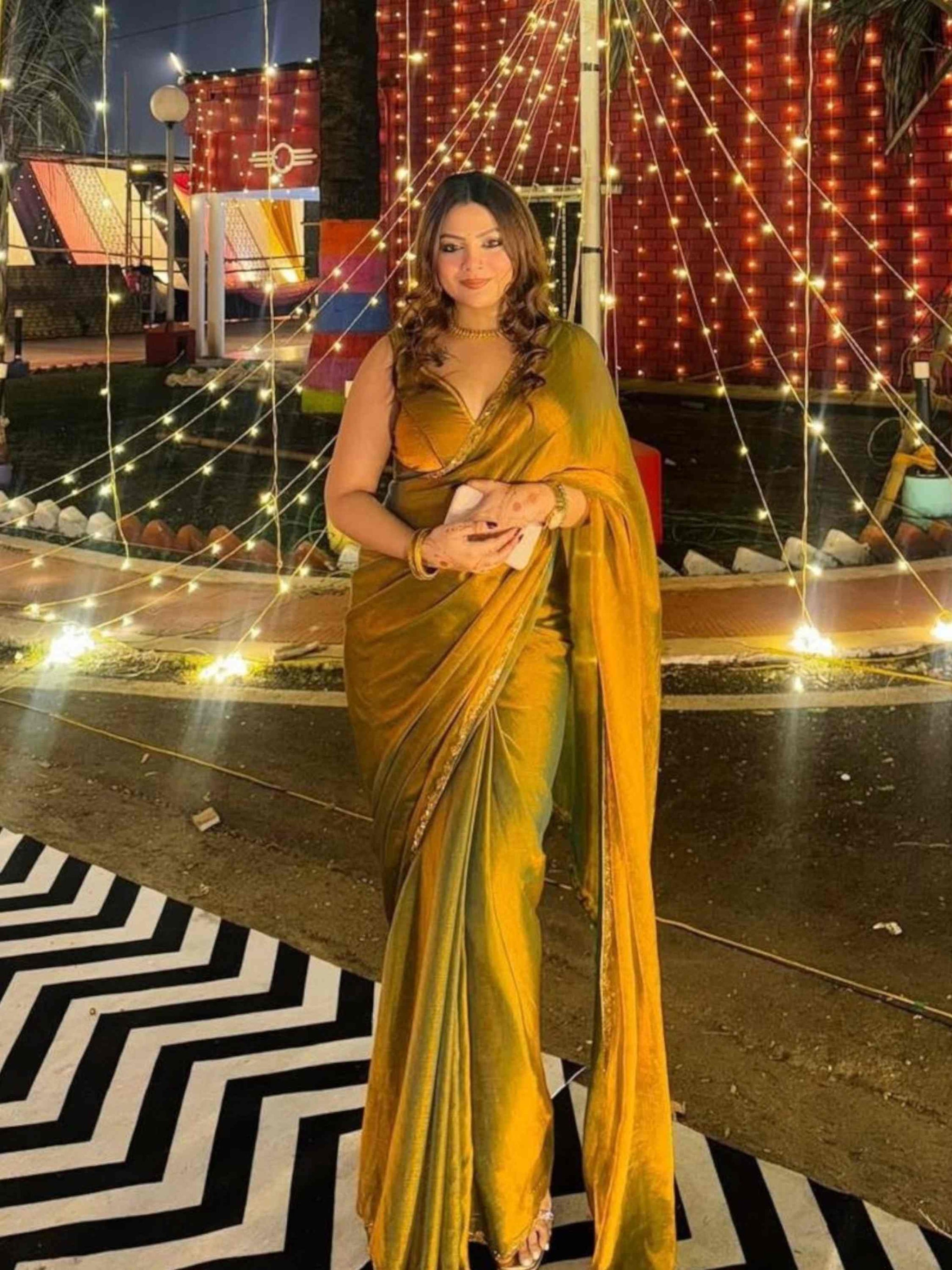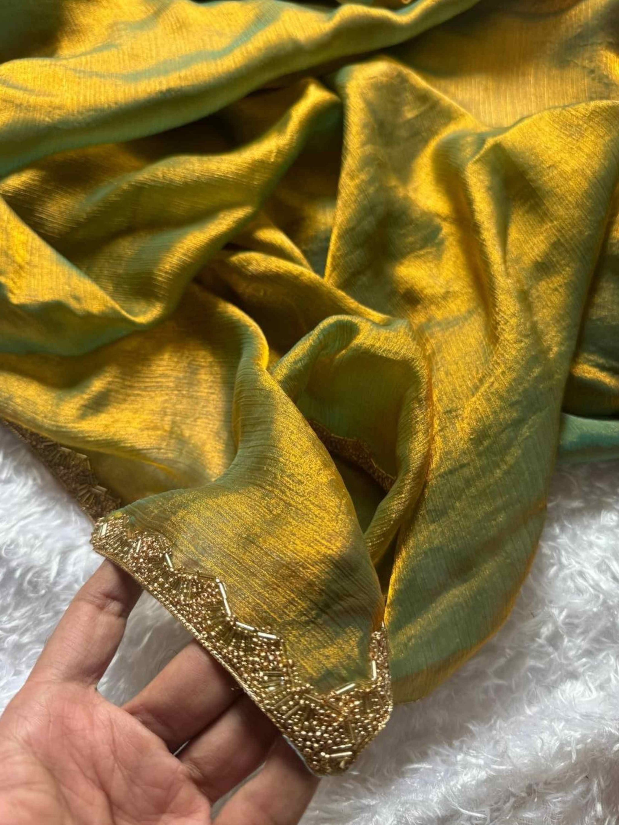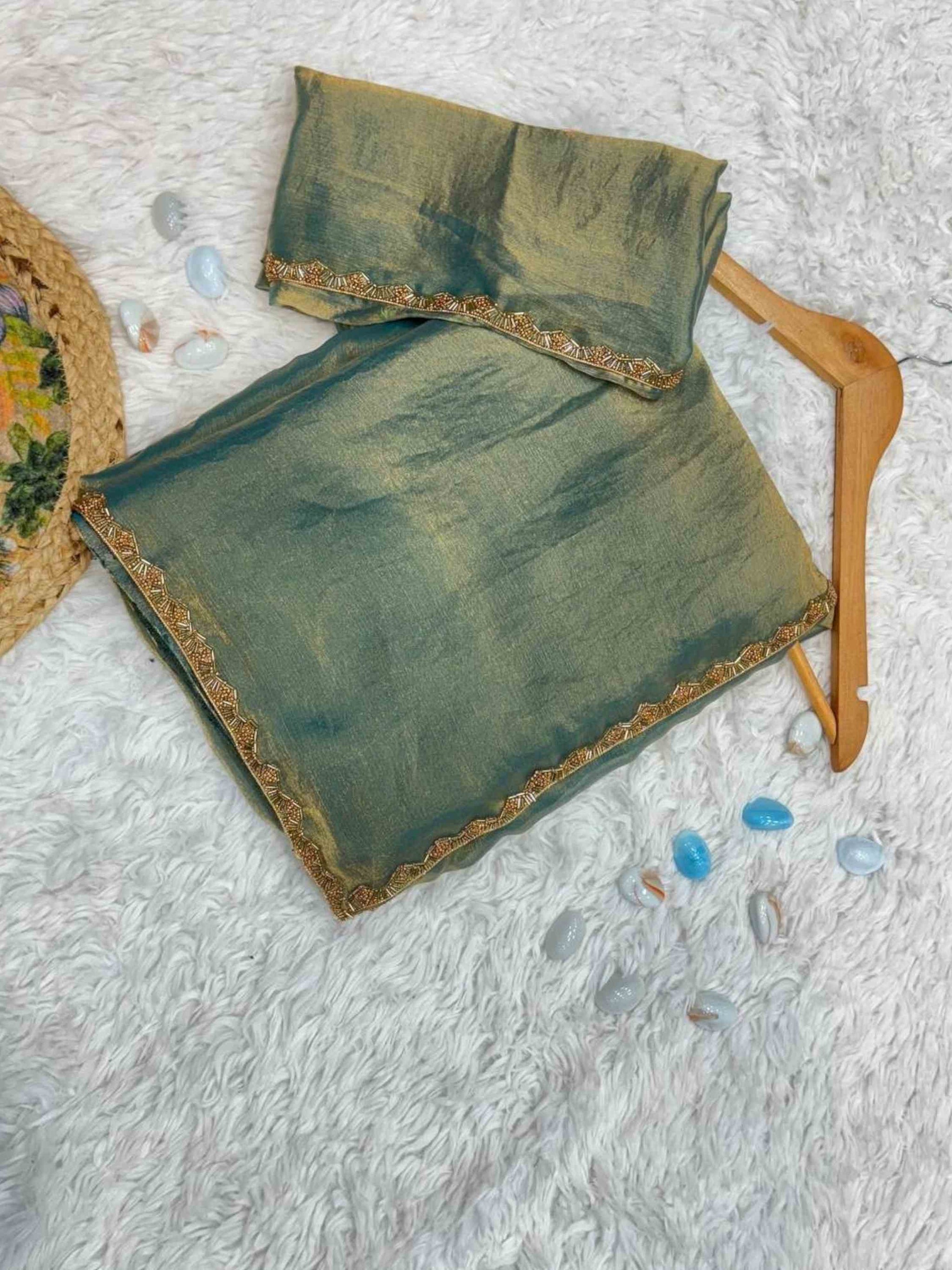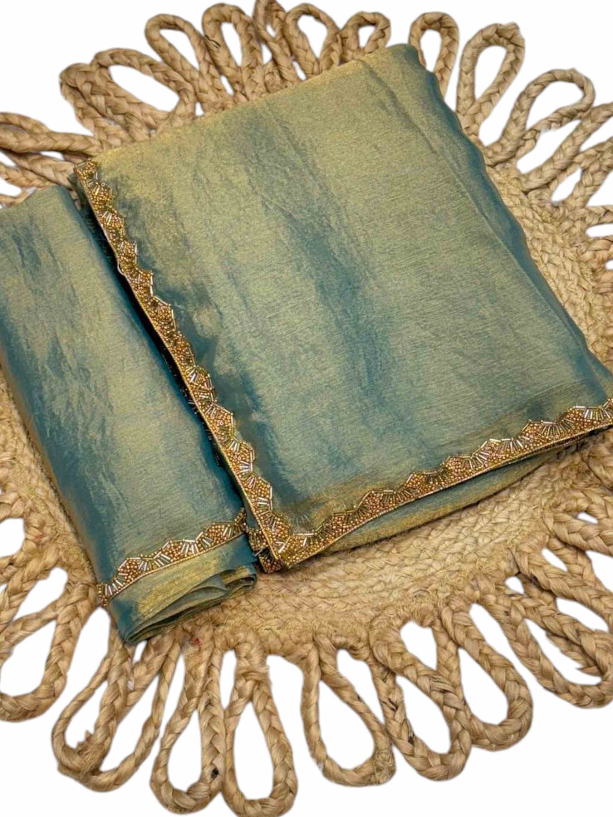Shine in this fendy chiffon Two Tone Saree featuring a solid look with hand-embroidered border and matching unstitched blouse. Wedding Wear Saree!