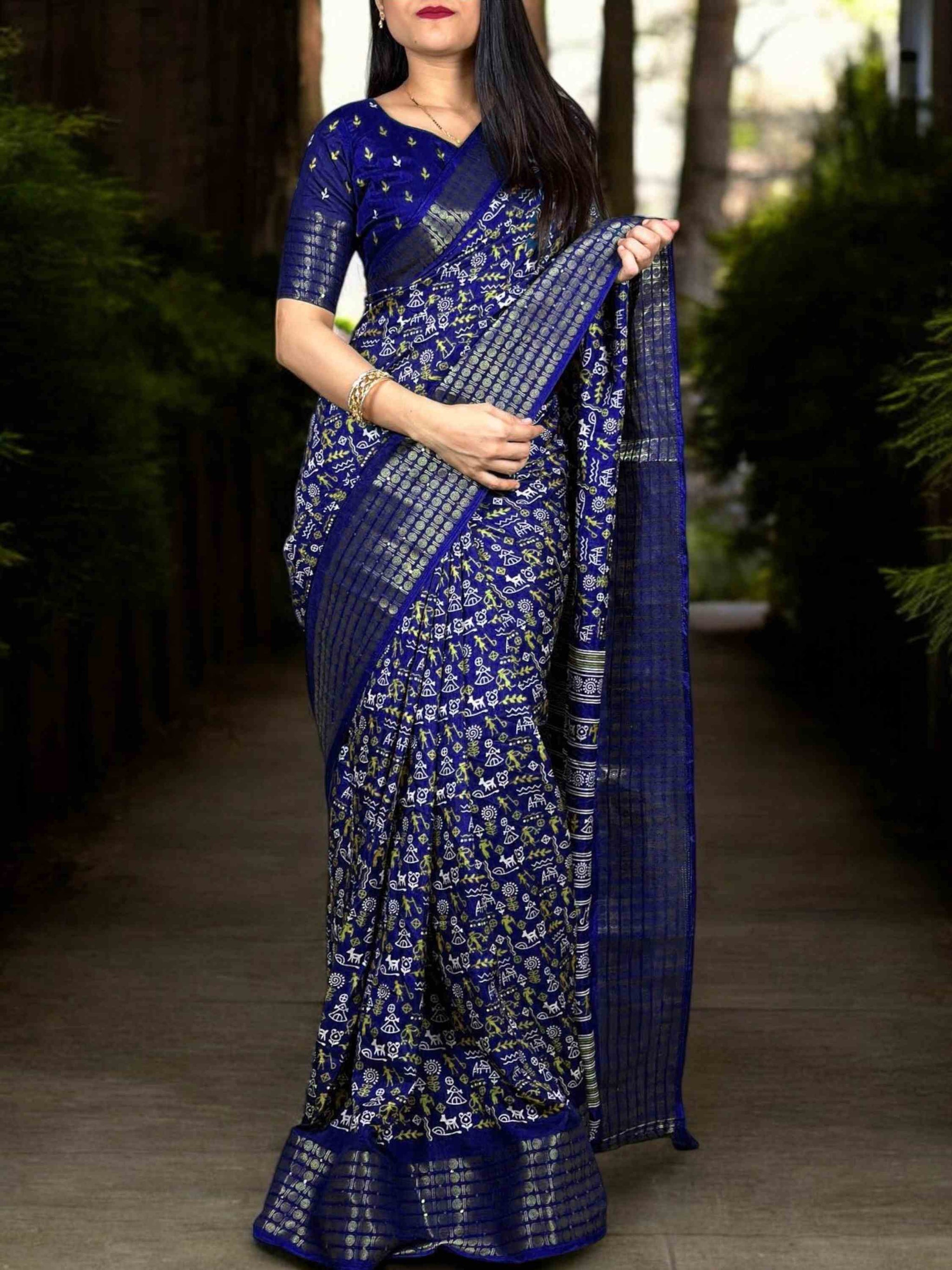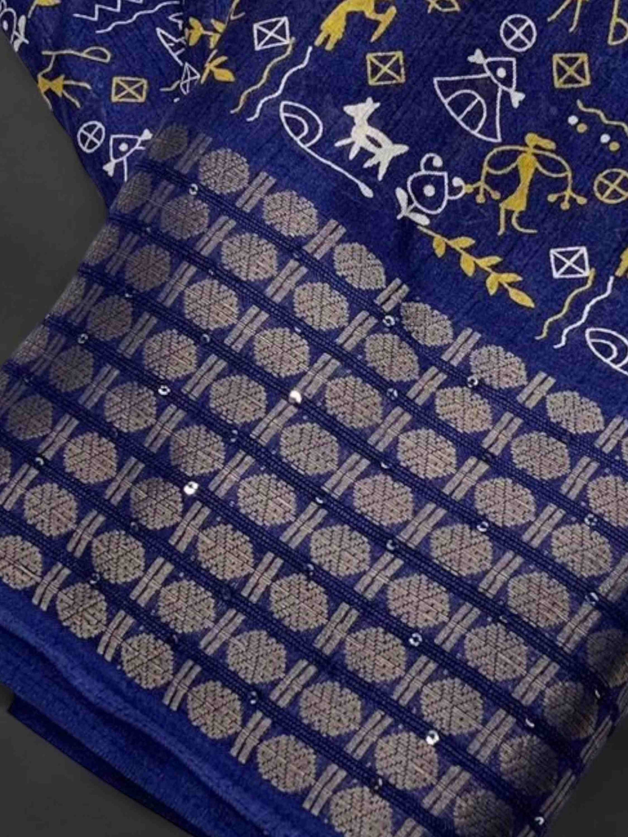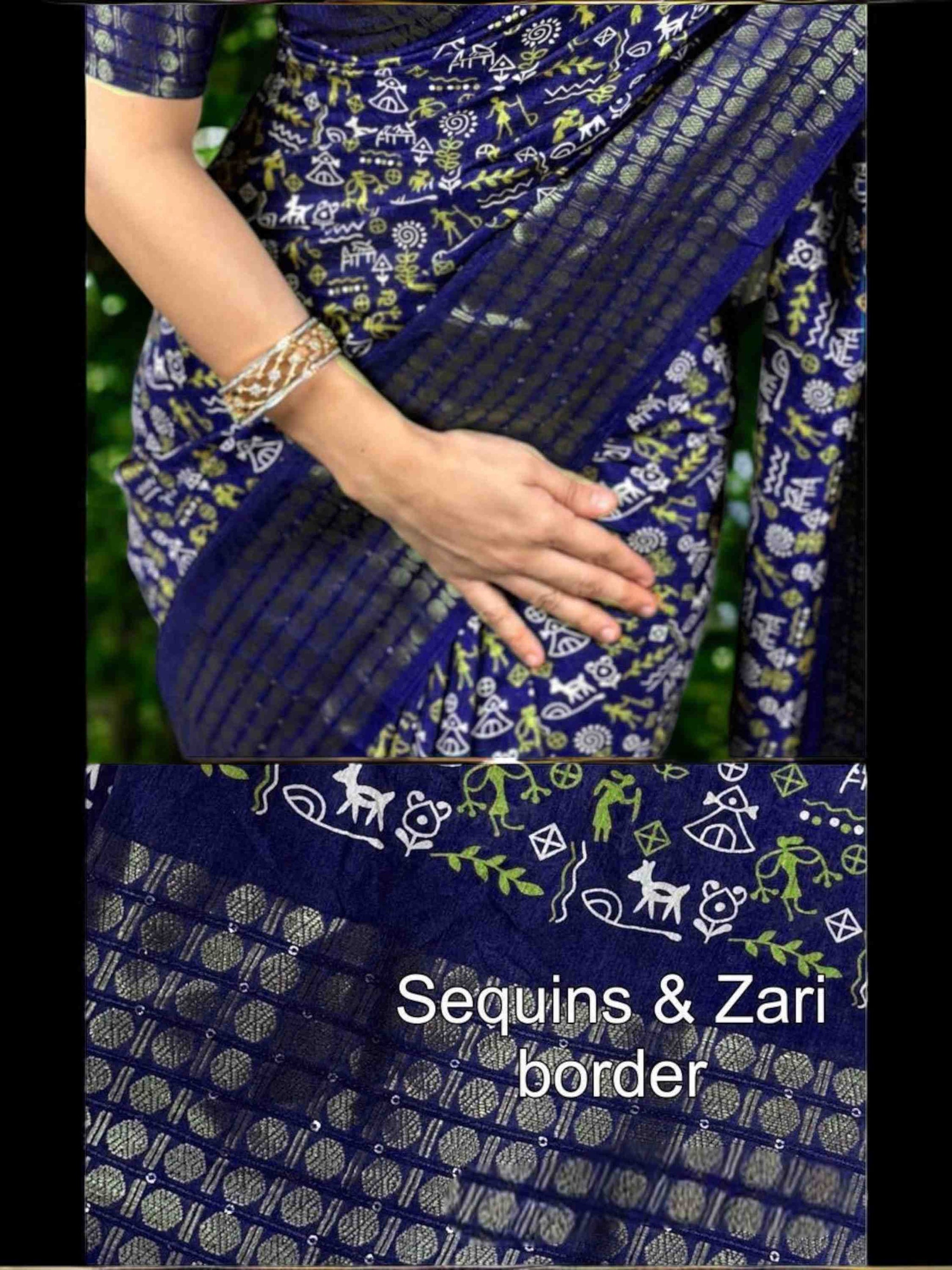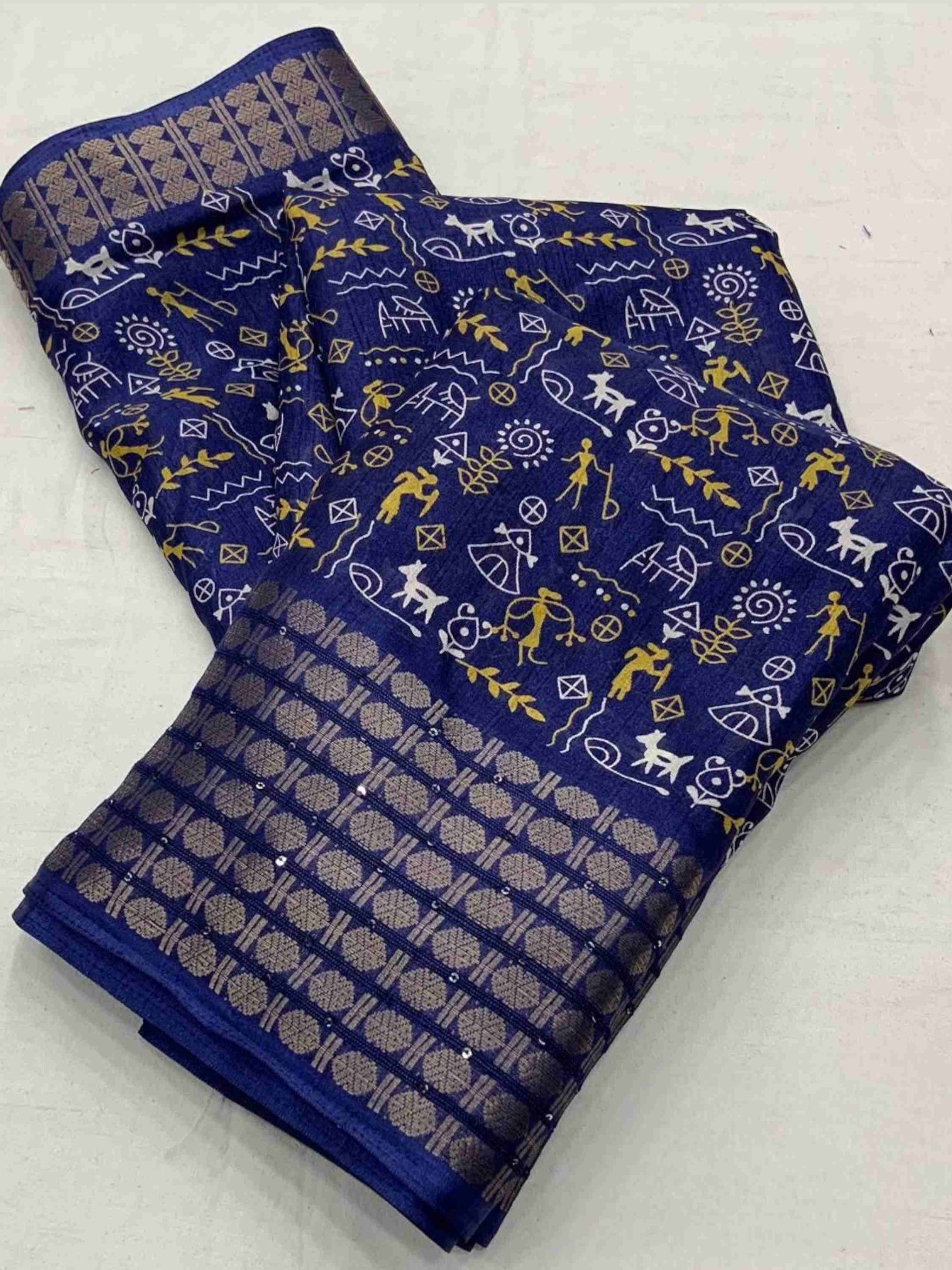 Dola Silk Saree Navy Blue with zari and sequence border for women. This Best Seller silk cotton saree comes with matching printed blouse piece. 8 available colours
