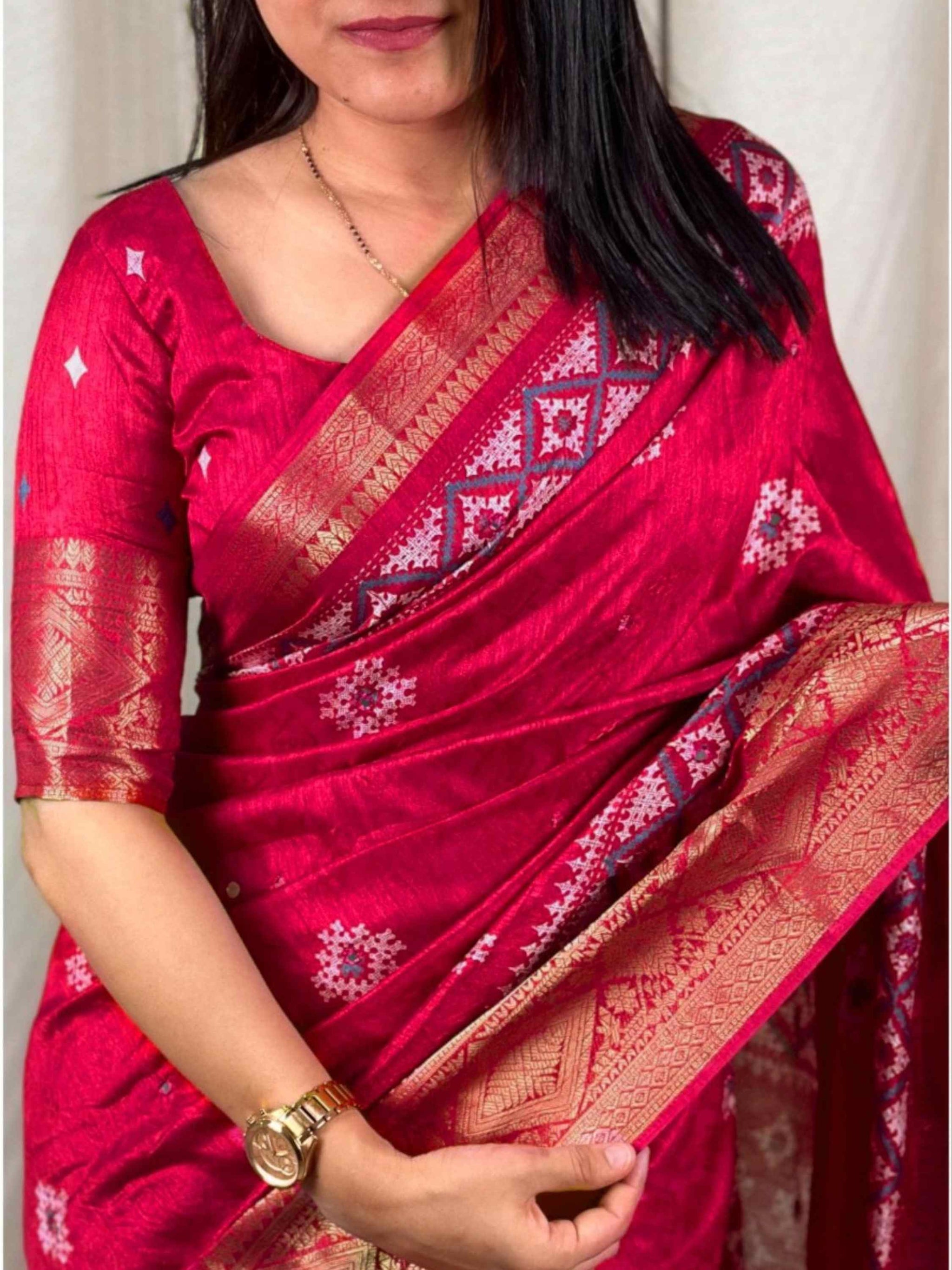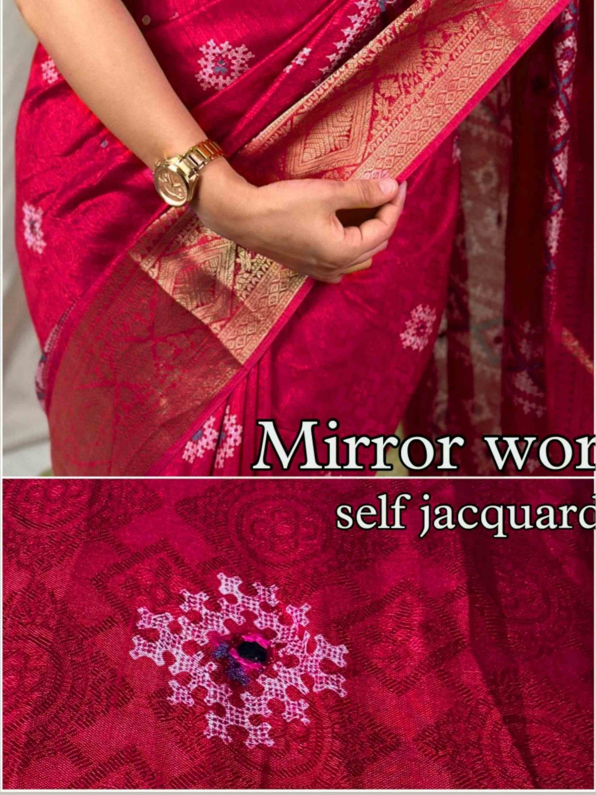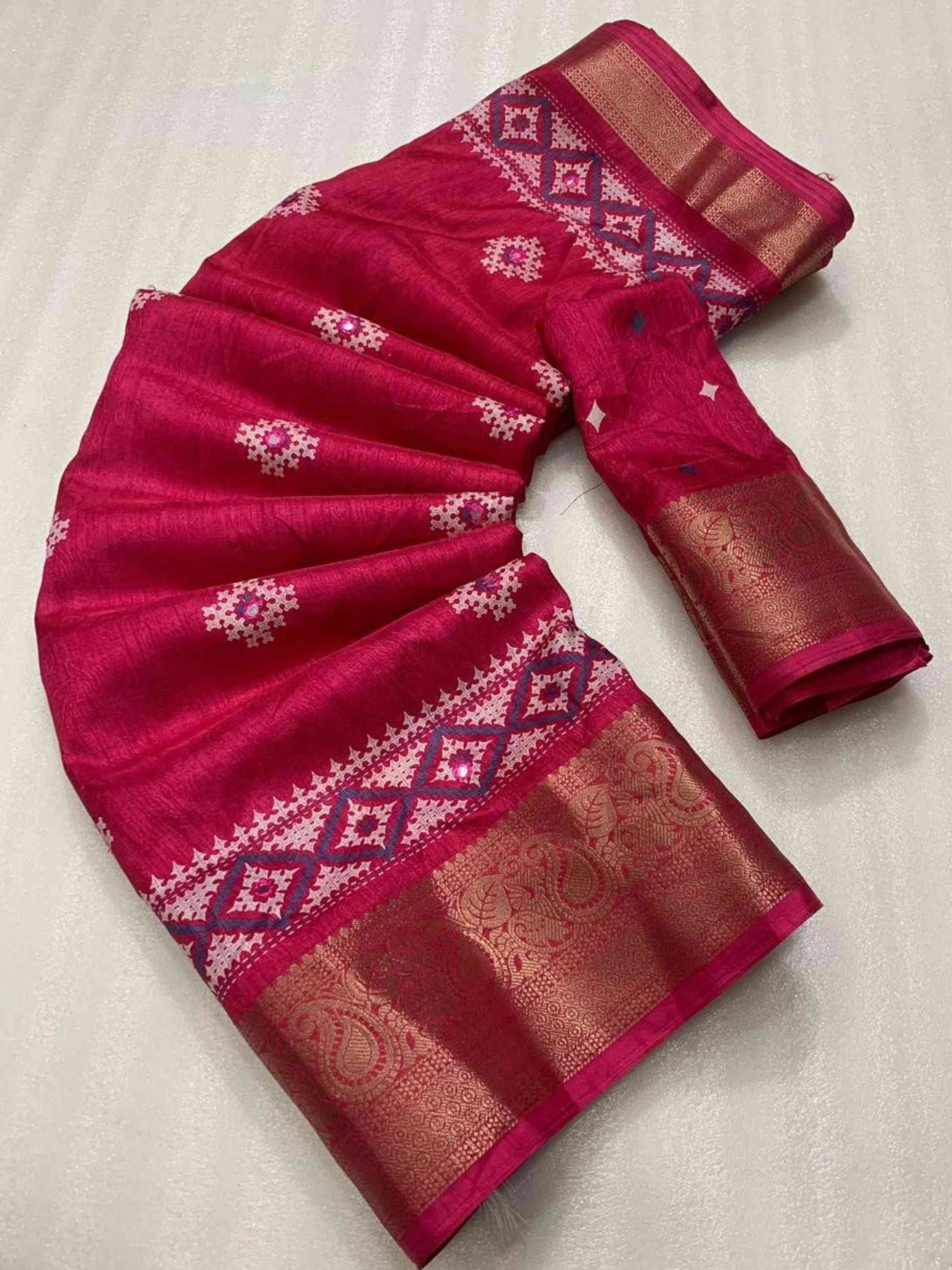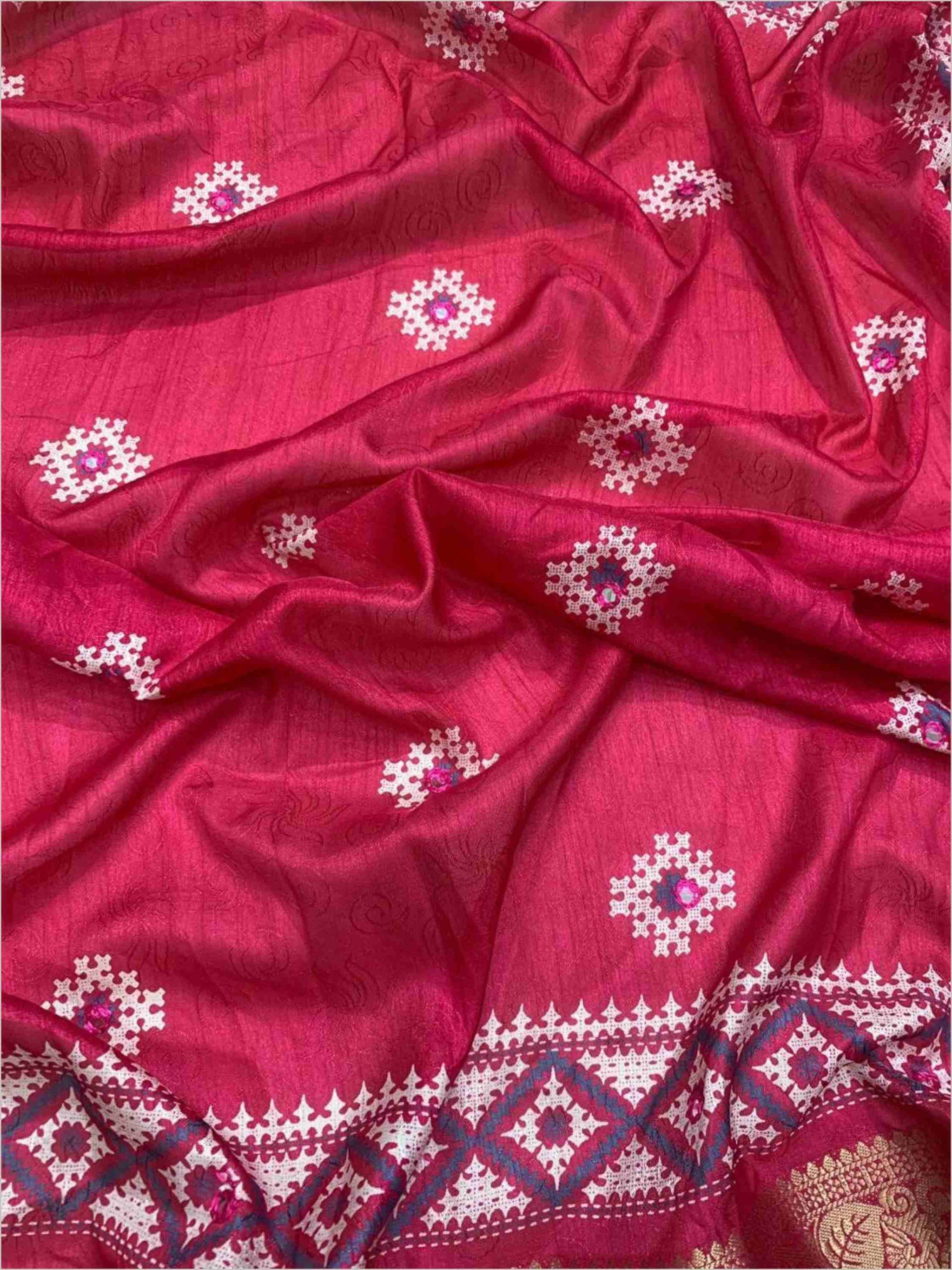Cotton Dola Silk Saree Pink has self-jacquard weave, mirror work, Zari border and tassels on pallu with matching printed blouse piece. Occasional wear saree.