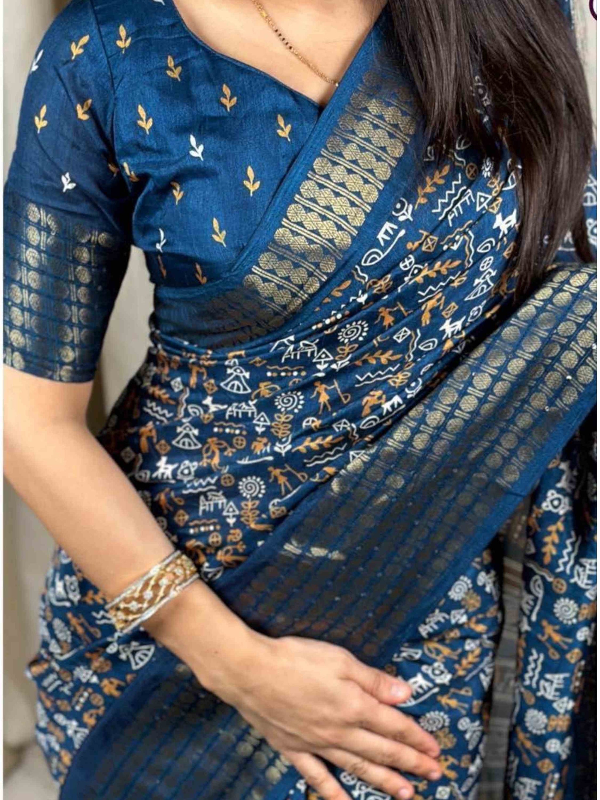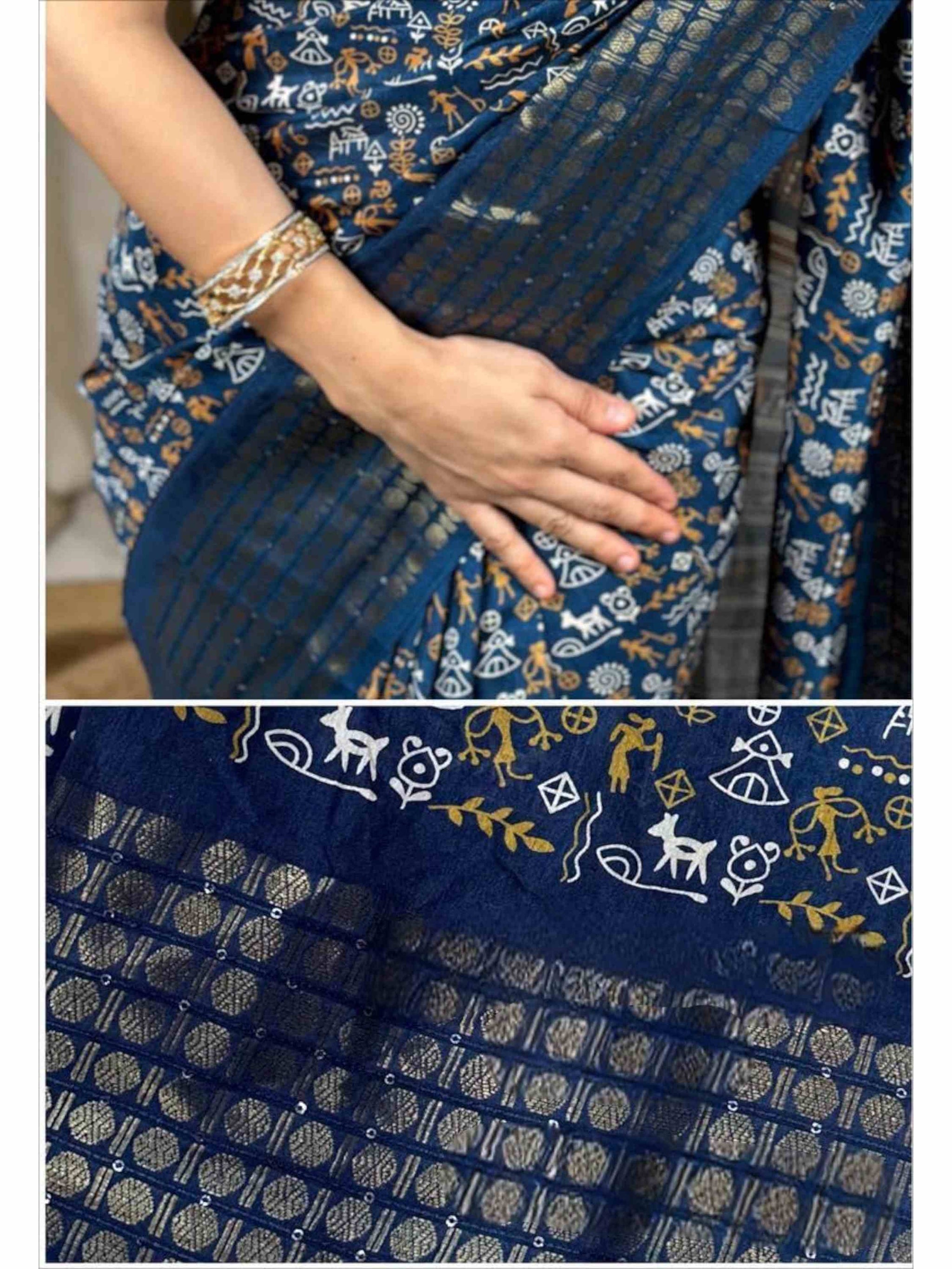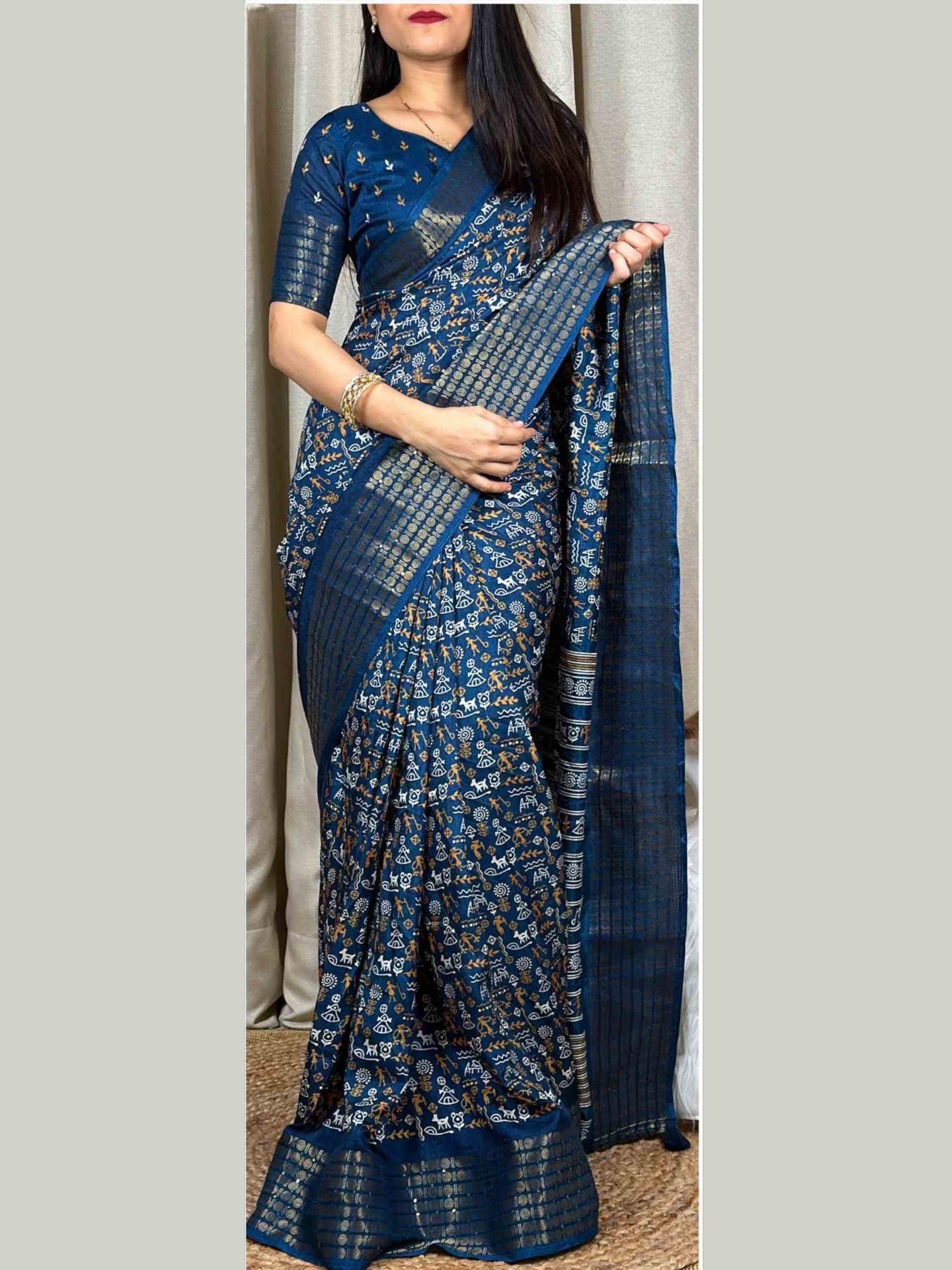 Dola Silk Saree Teal Blue with zari and sequence border for women. This Best Seller silk cotton saree comes with matching printed blouse piece. 8 available colours