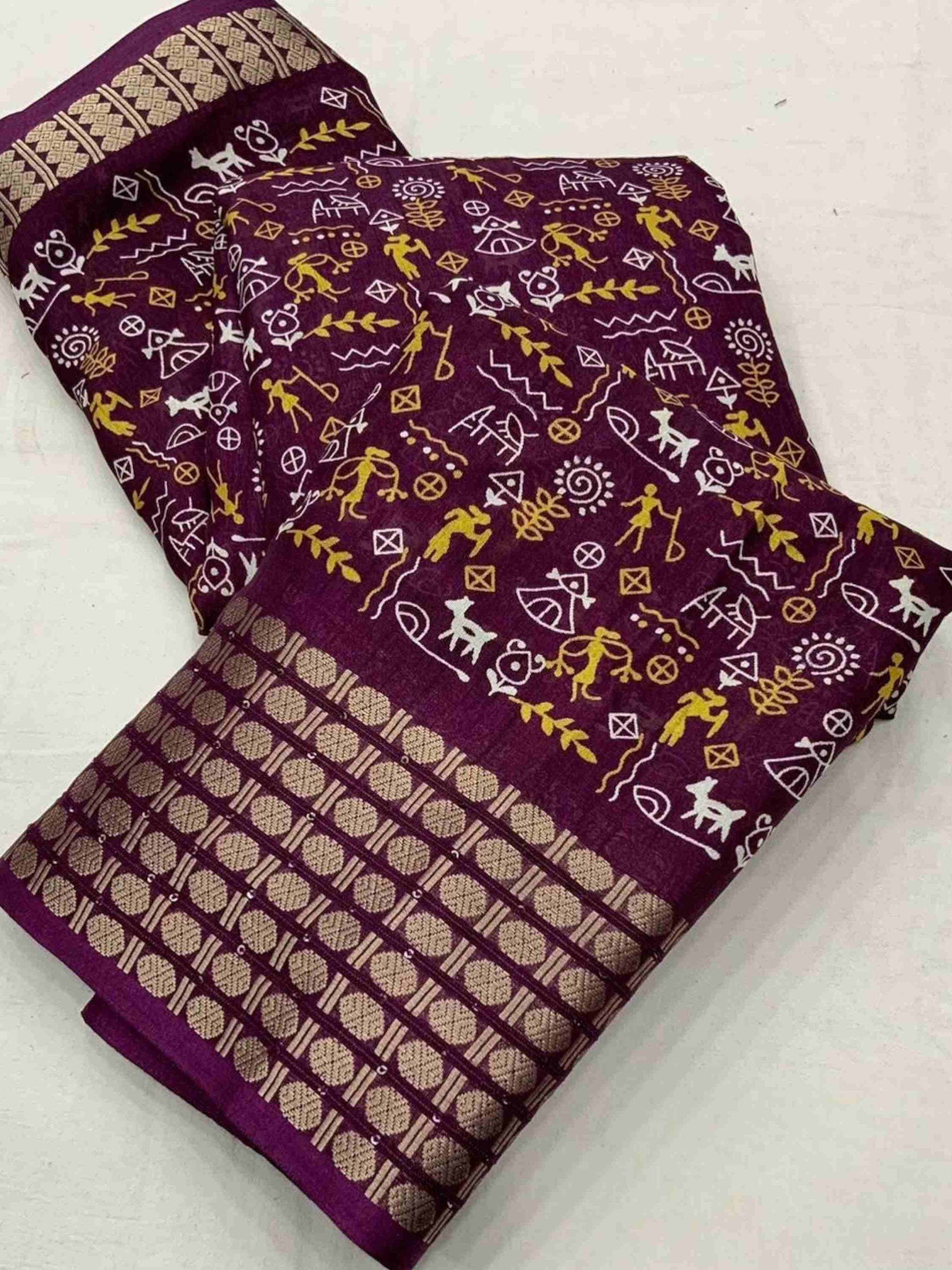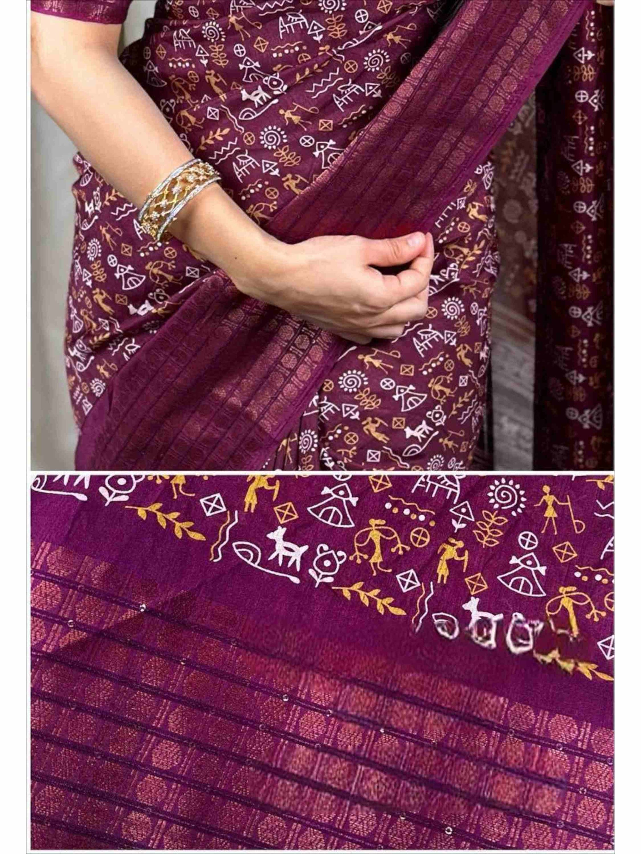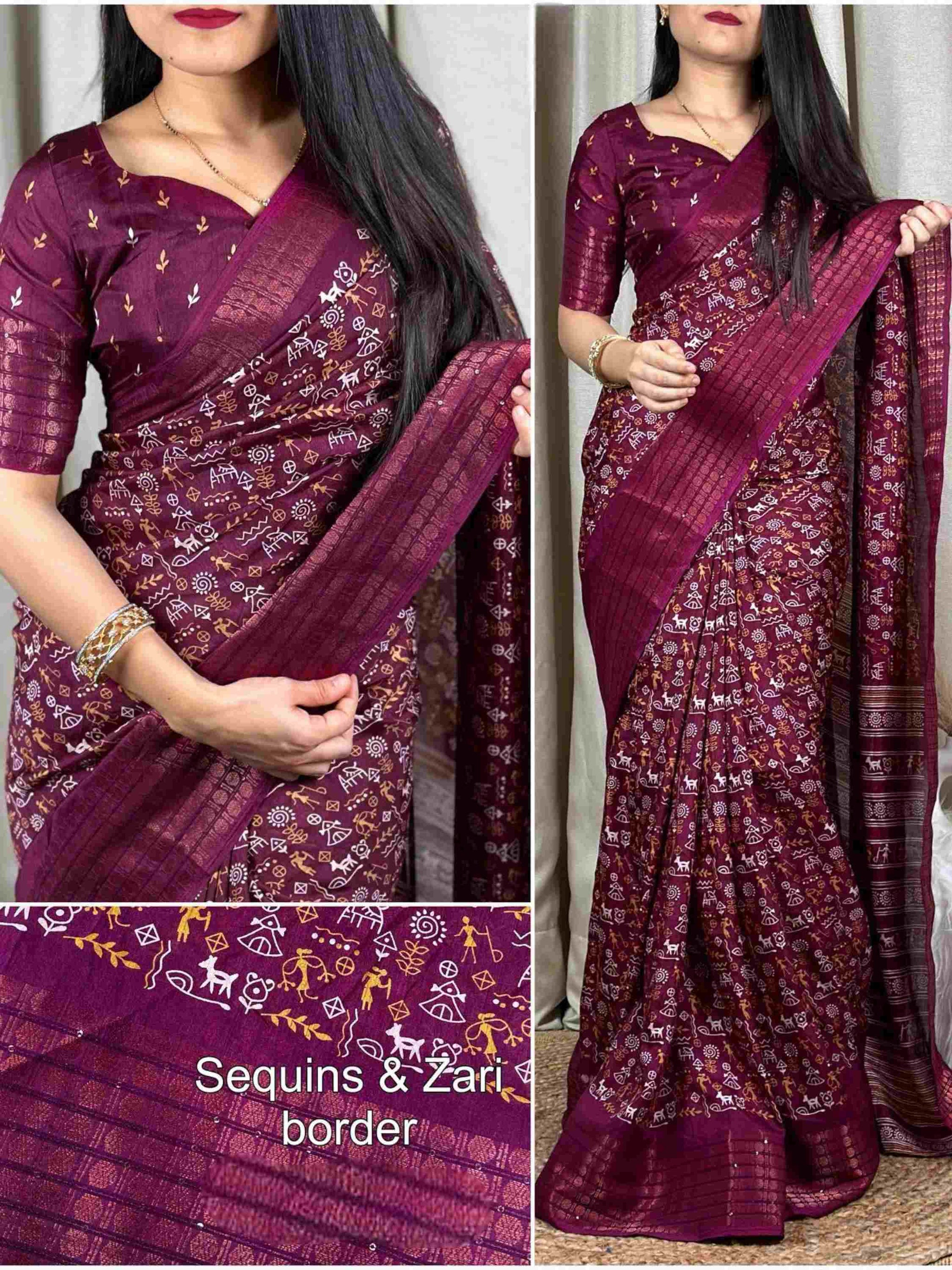 Dola Silk Saree Wine with zari and sequence border for women. This Best Seller silk cotton saree comes with matching printed blouse piece. 8 available colours
