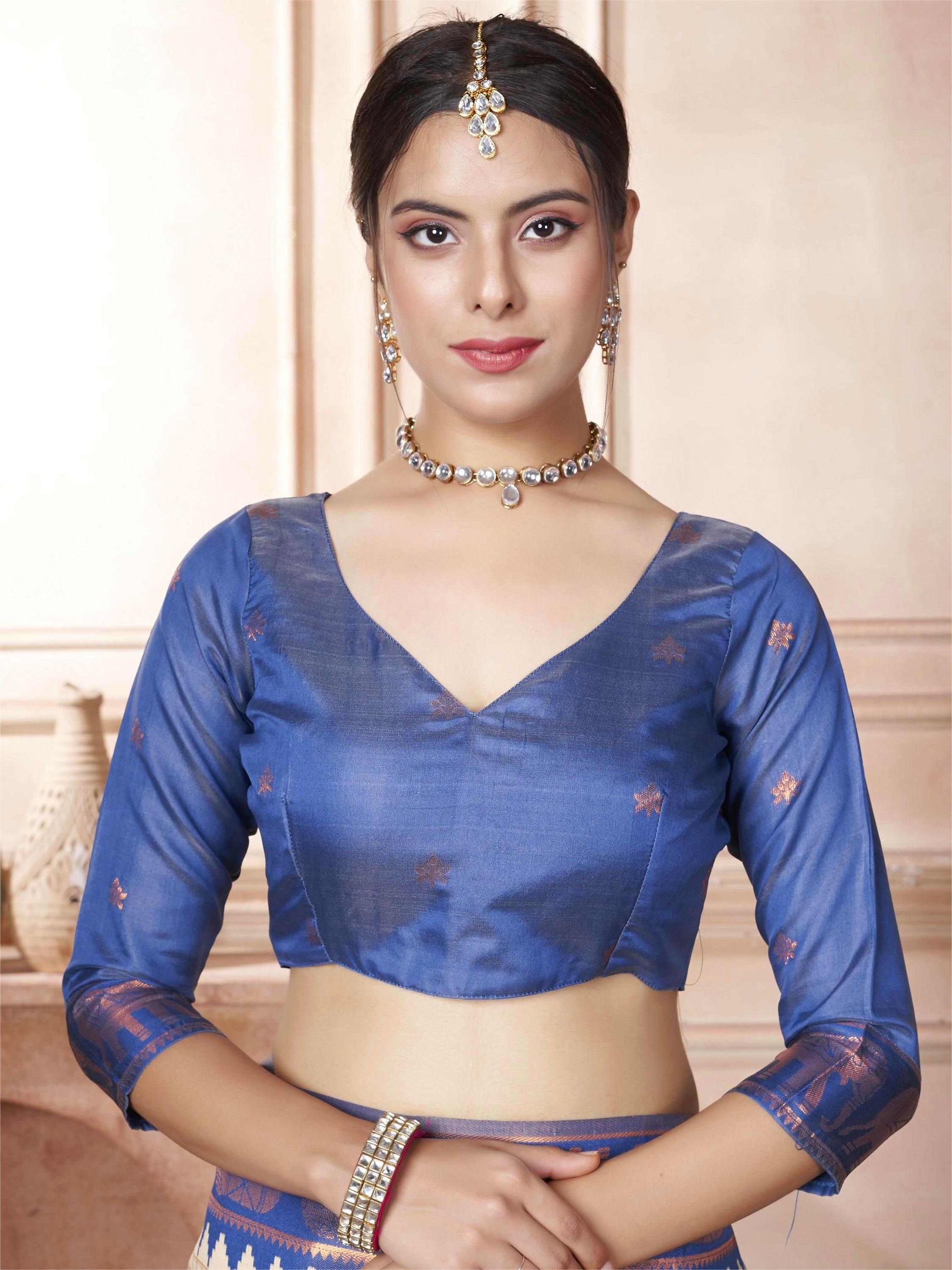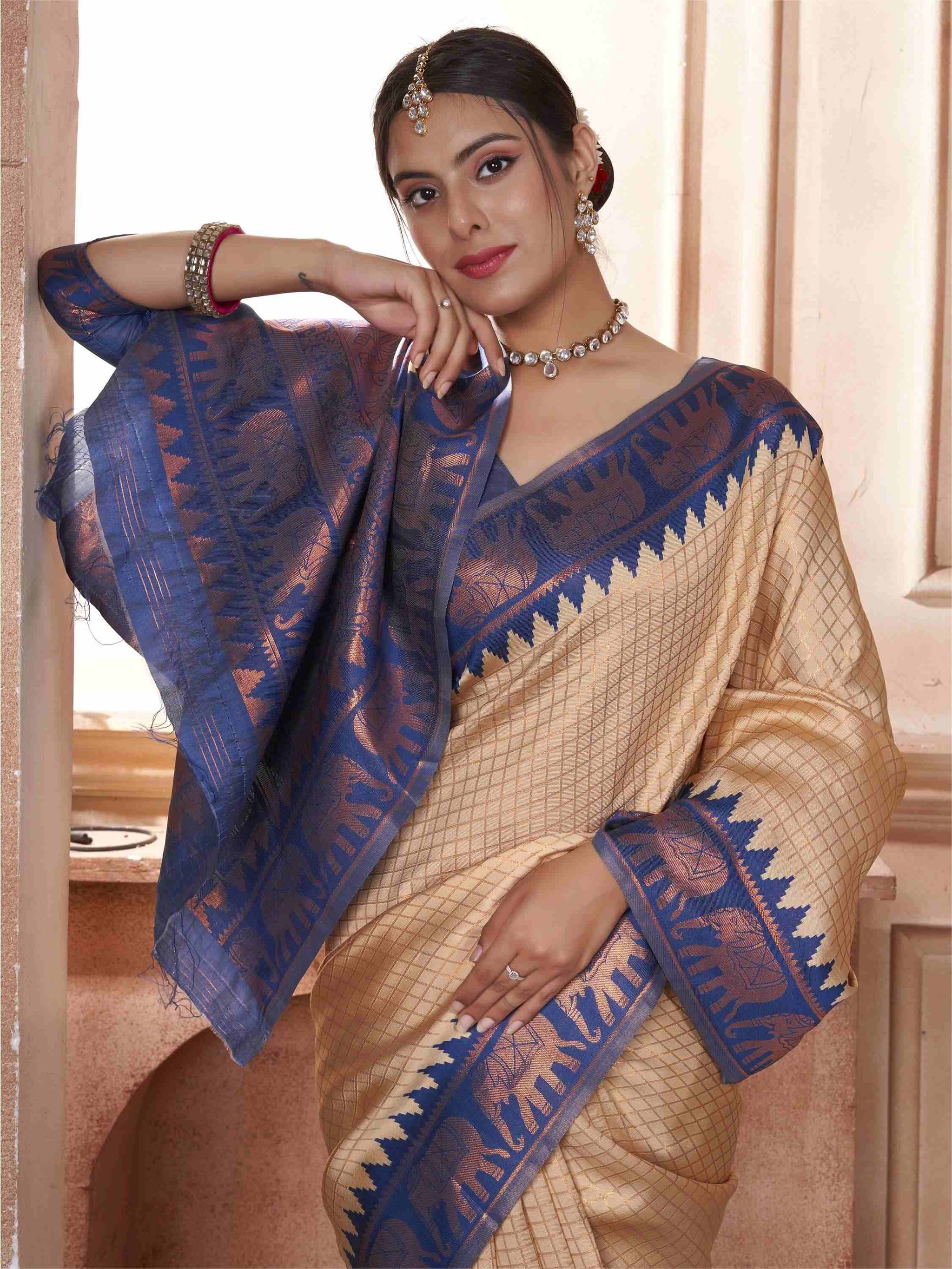 Cream Kanjivaram Silk Saree with Blue Border, featuring traditional ethnic motifs and rich zari weave—perfect for weddings, festivals, and party occasions.