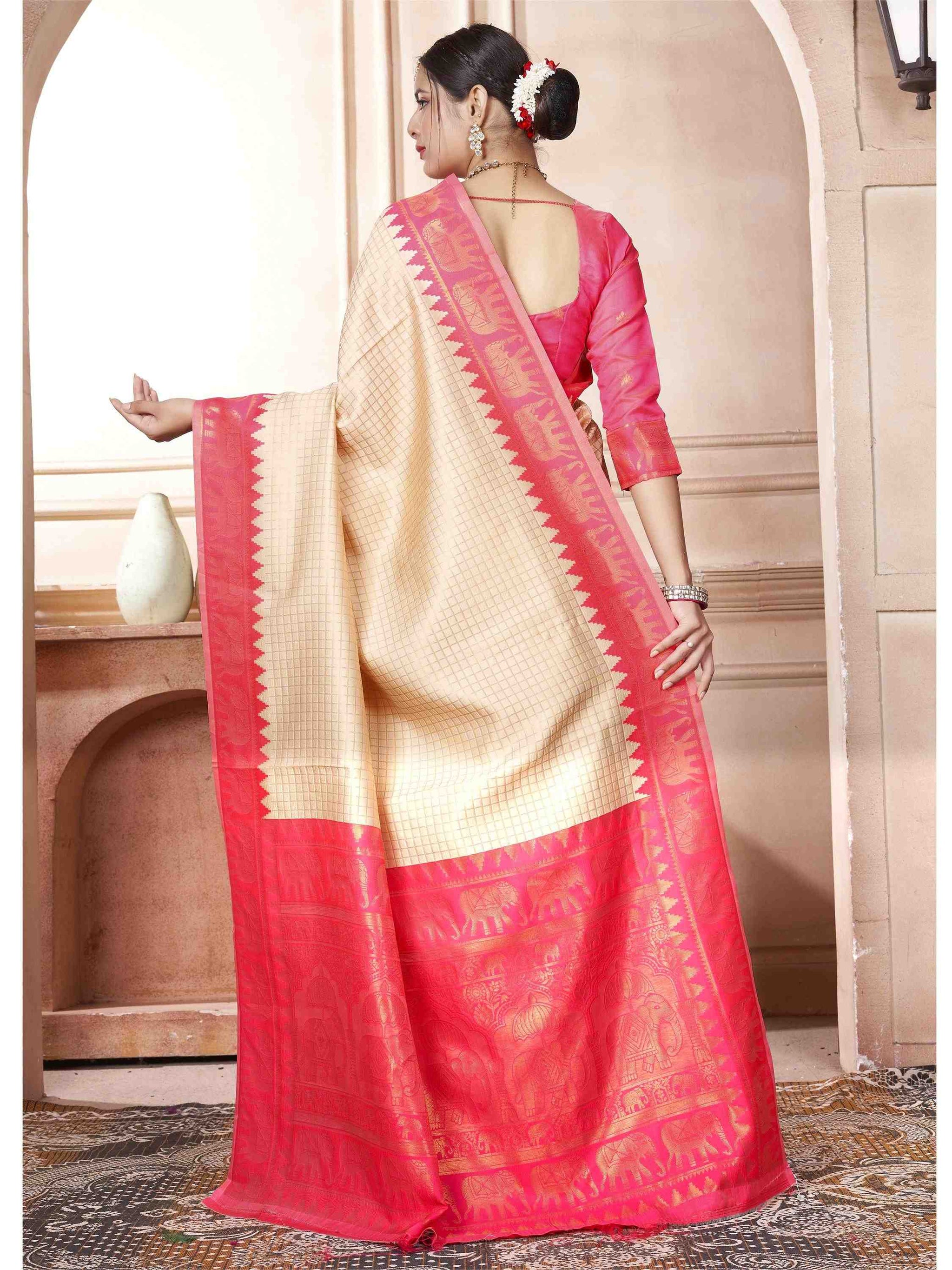 Cream Kanjivaram Silk Saree with Red Border, featuring traditional ethnic motifs and rich zari weave—perfect for weddings, festivals, and party occasions.