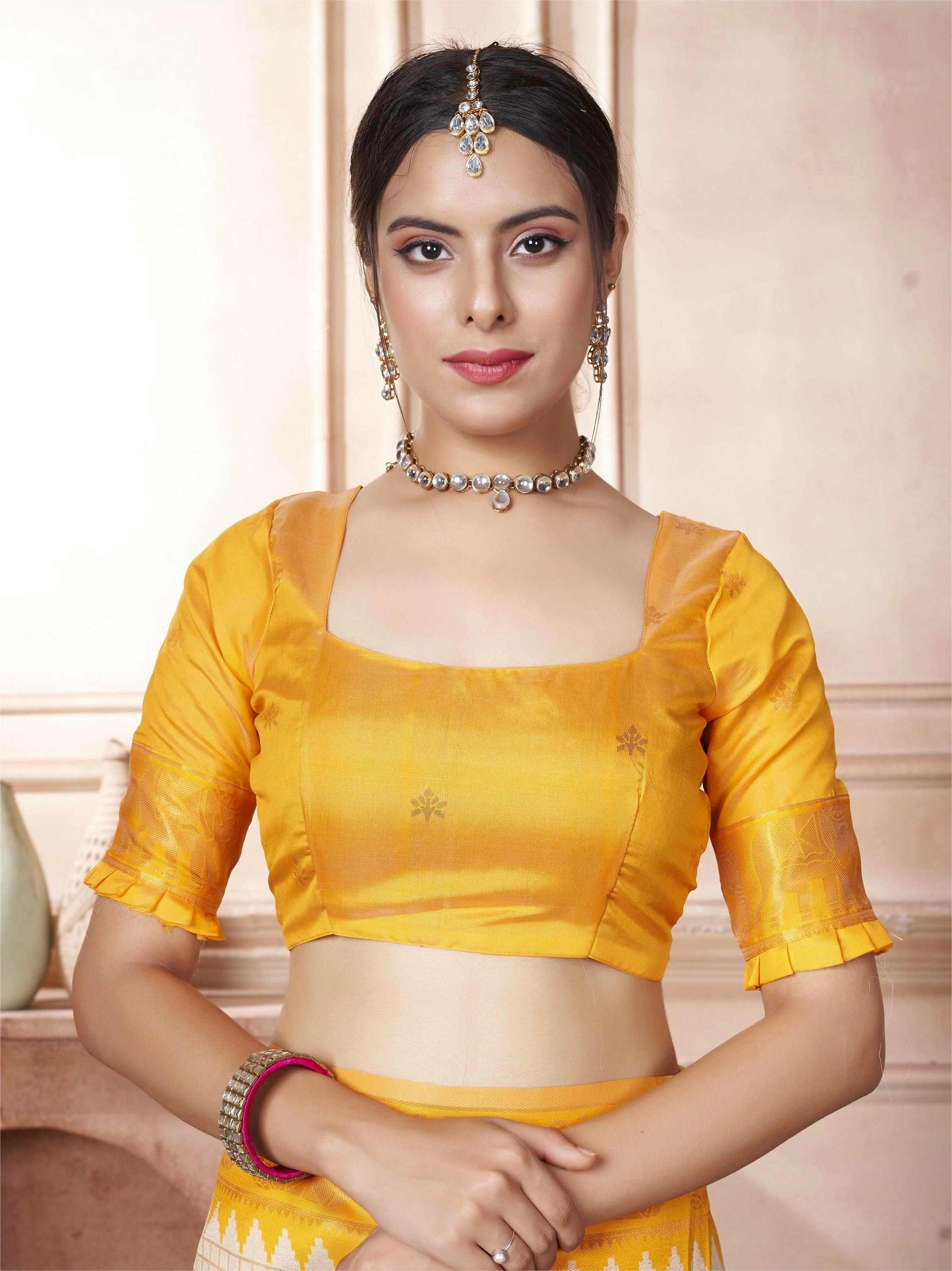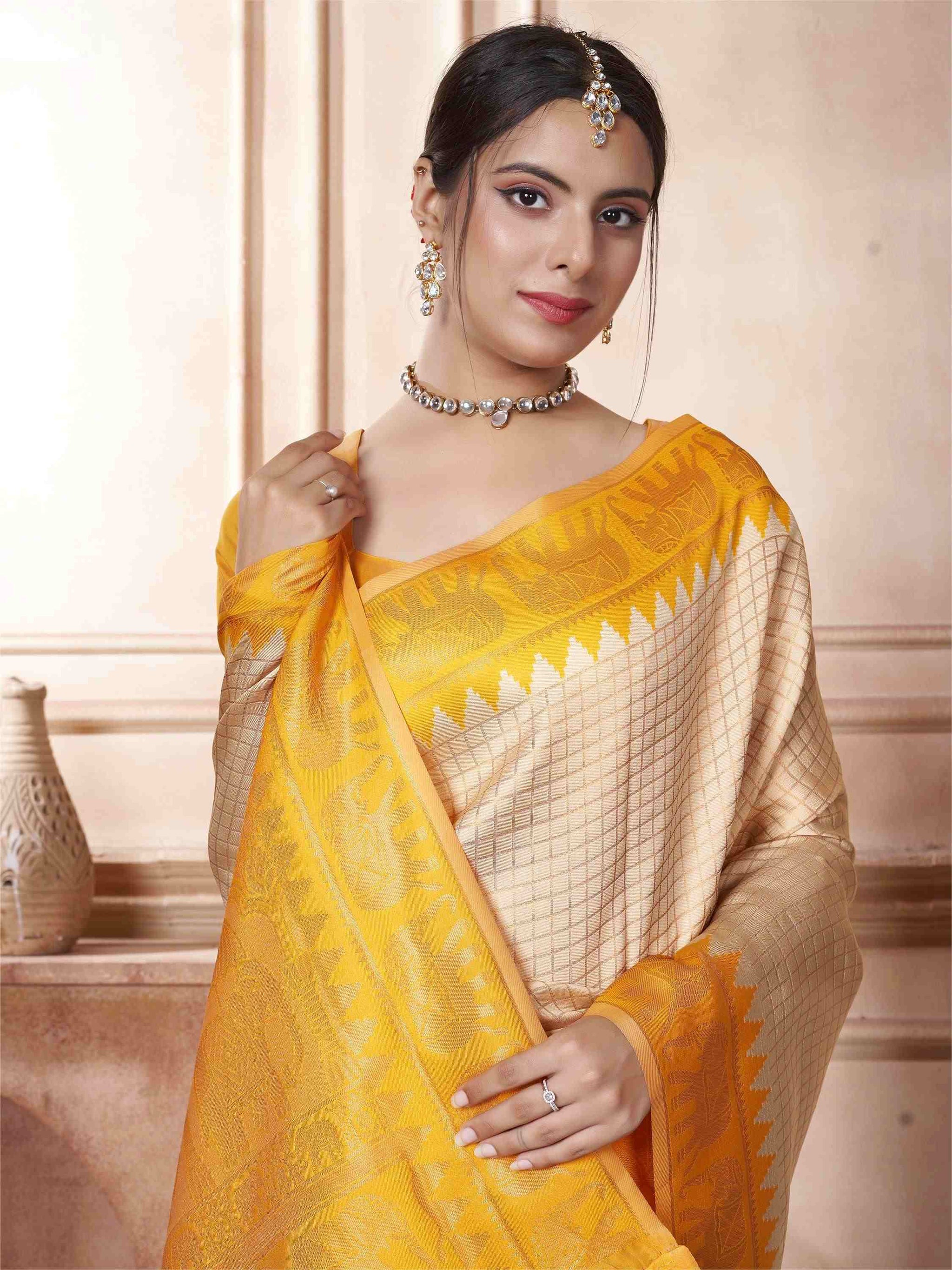 Cream Kanjivaram Silk Saree with Yellow Border, featuring traditional ethnic motifs and rich zari weave—perfect for weddings, festivals, and party occasions.