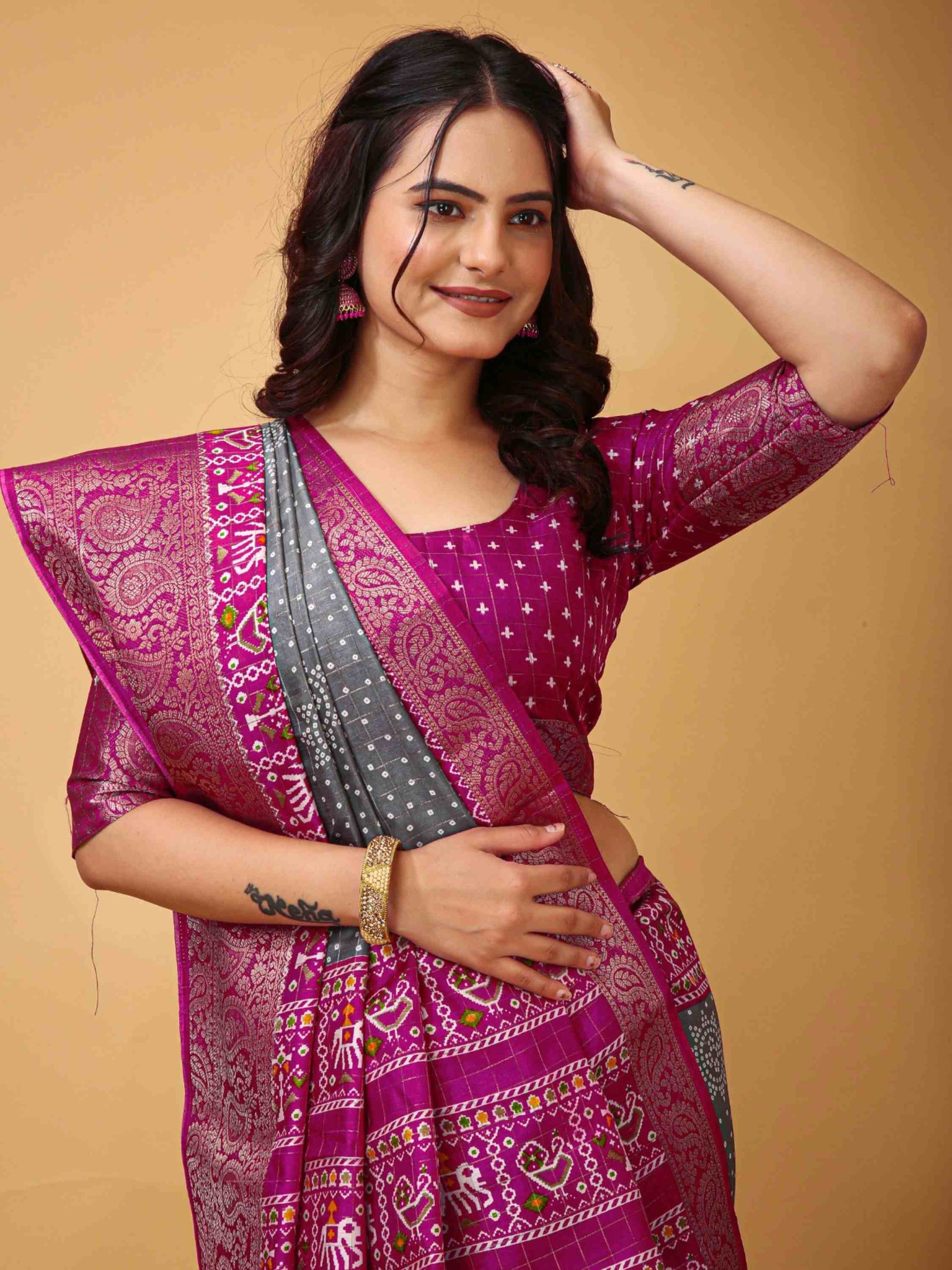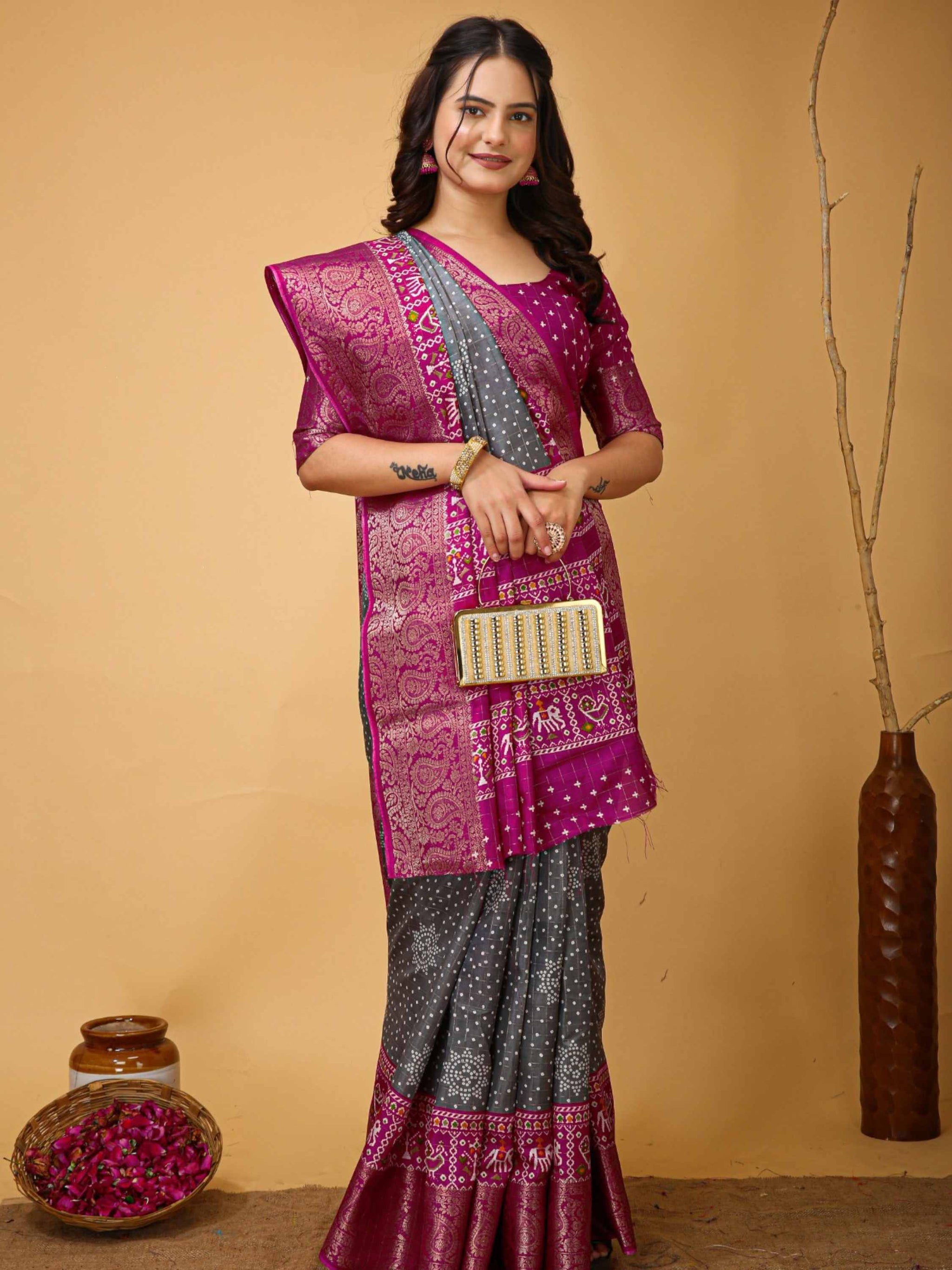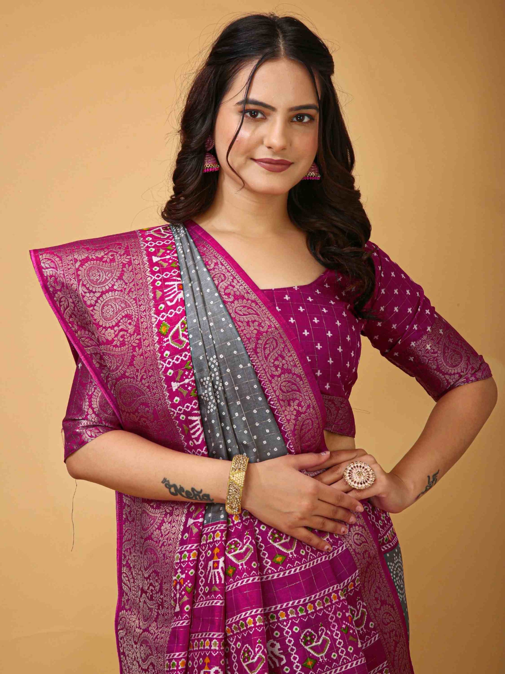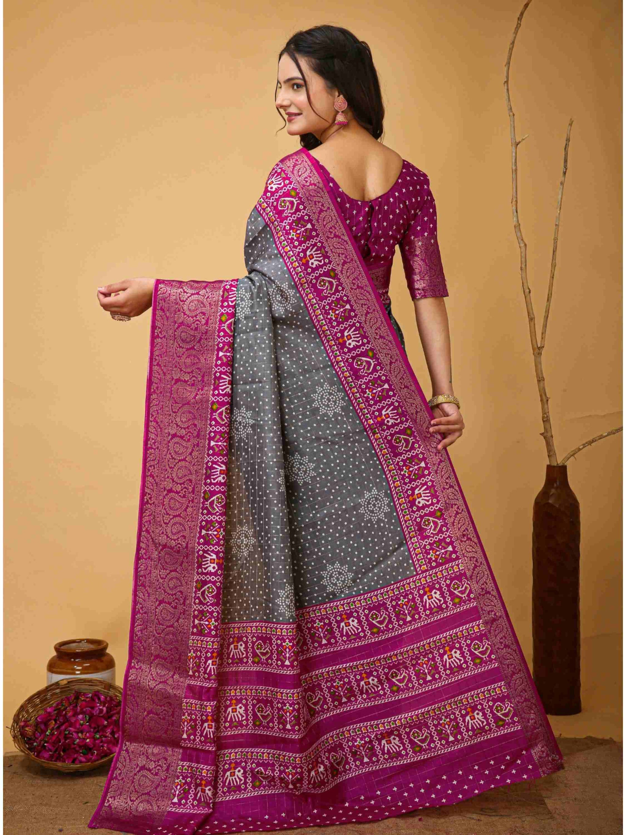 Dola Silk Cotton Bandhani Saree Grey colour has zari border and all-over woven zari checks with printed blouse piece, perfect for puja, festival, function.