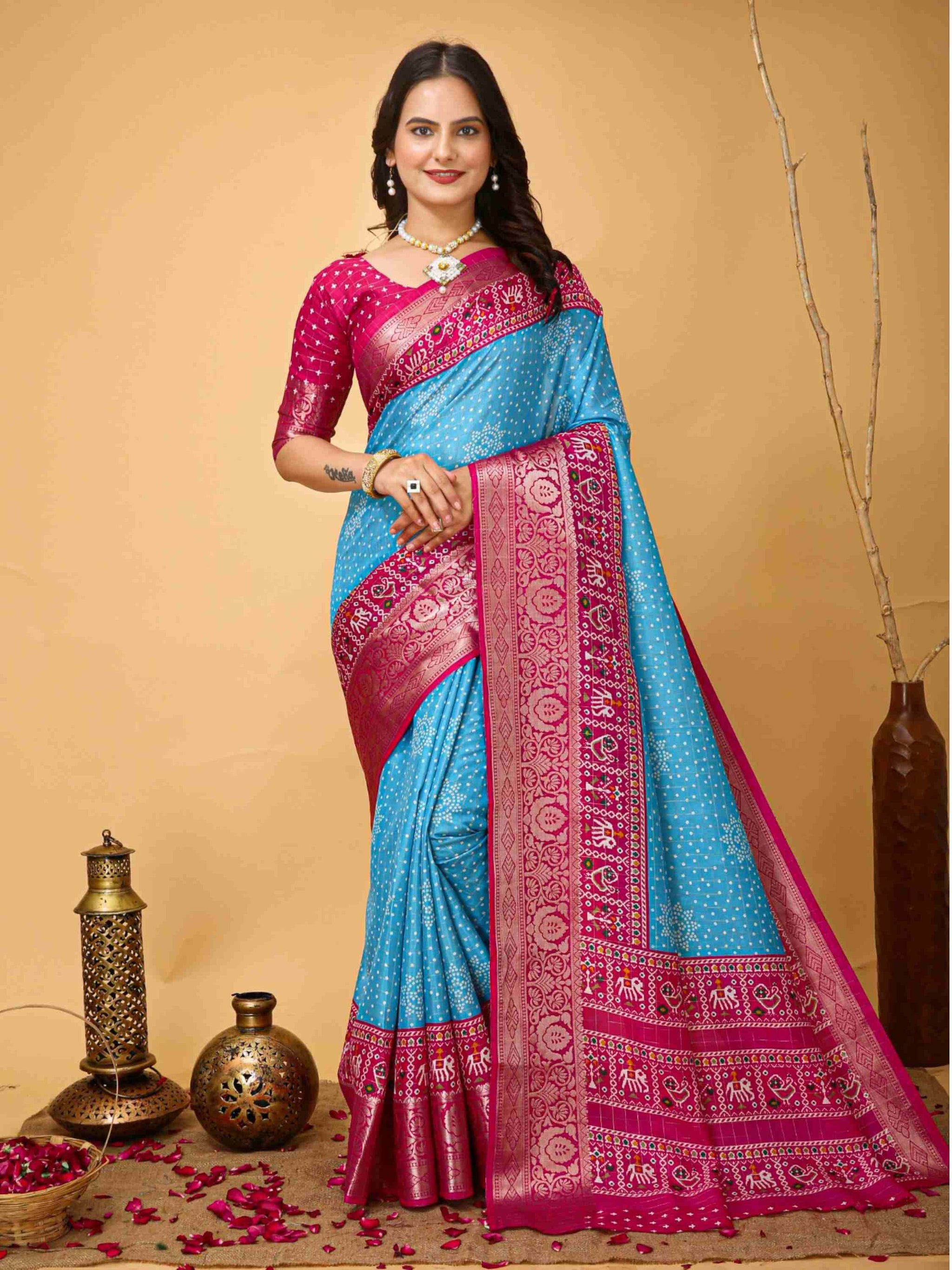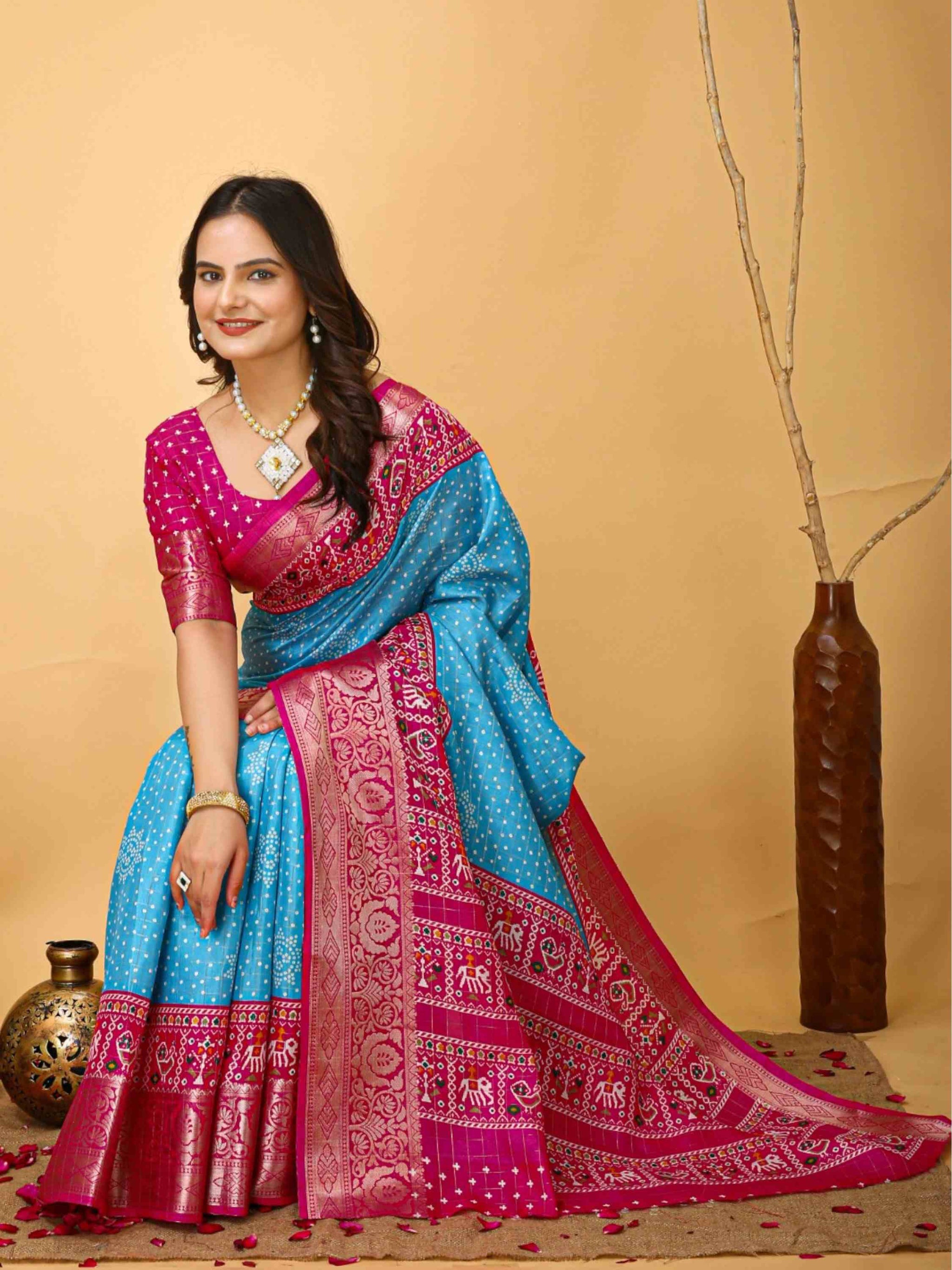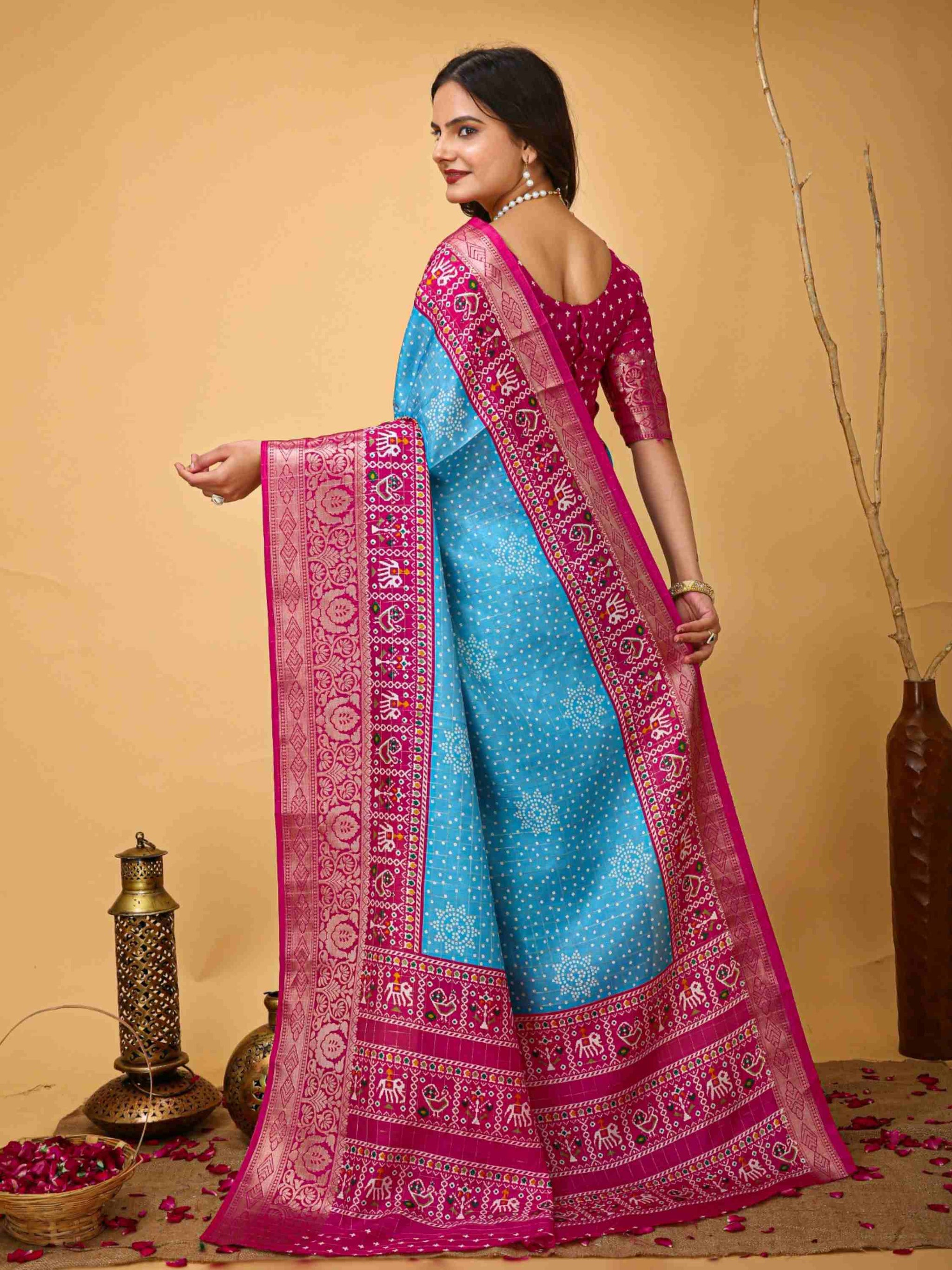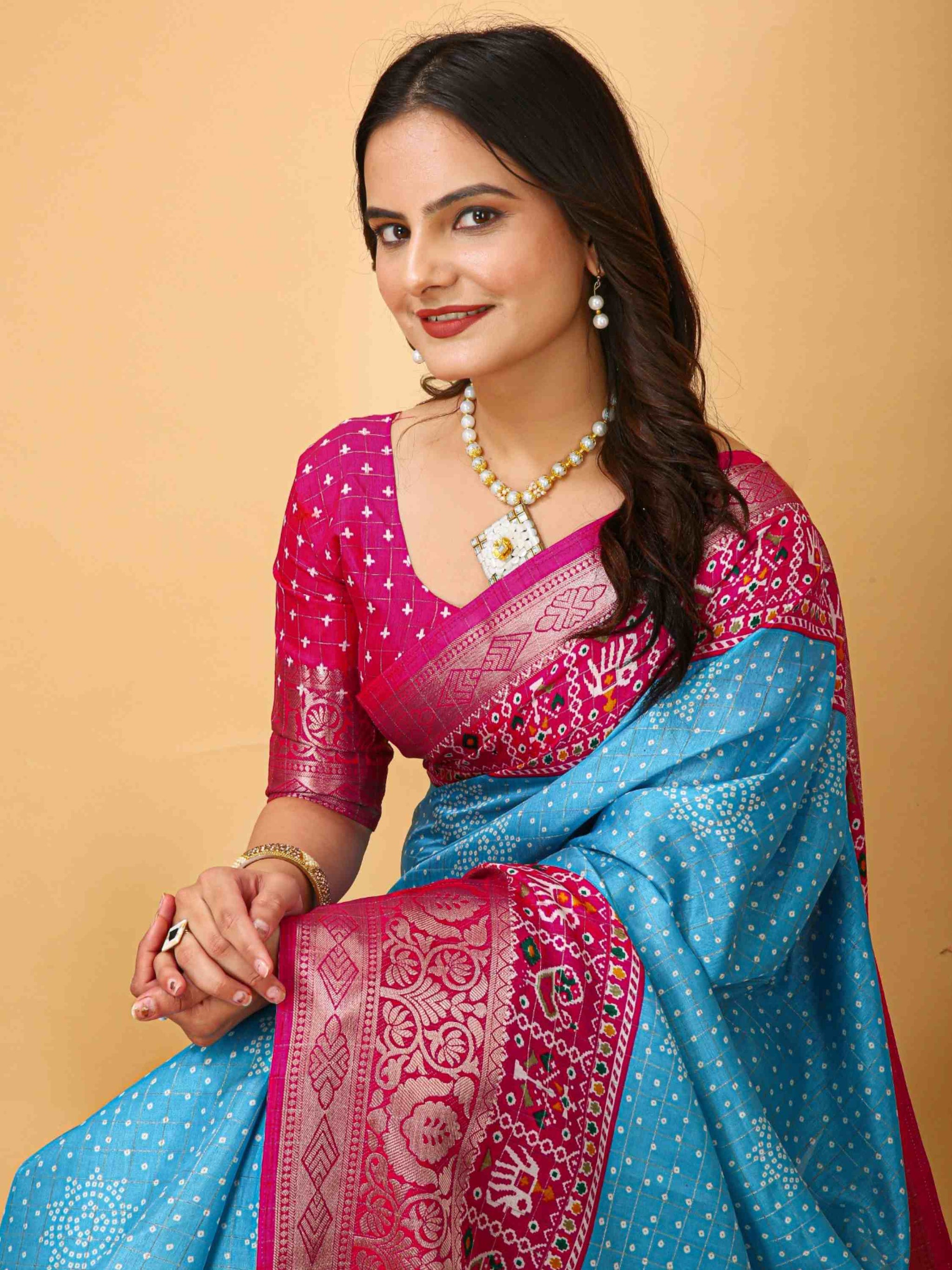 Dola Silk Cotton Bandhani Sky Blue Red colour has zari border and all-over woven zari checks with printed blouse piece, perfect for puja, festival, function.