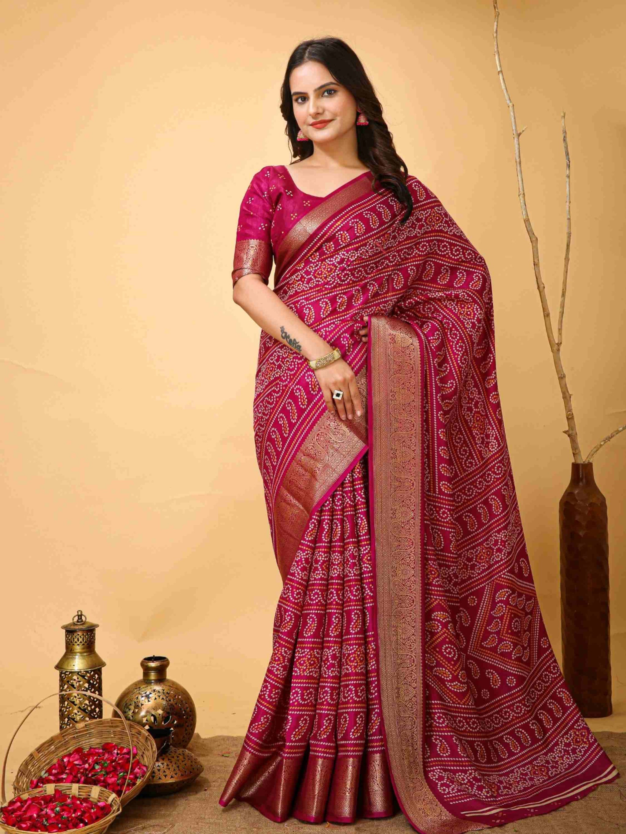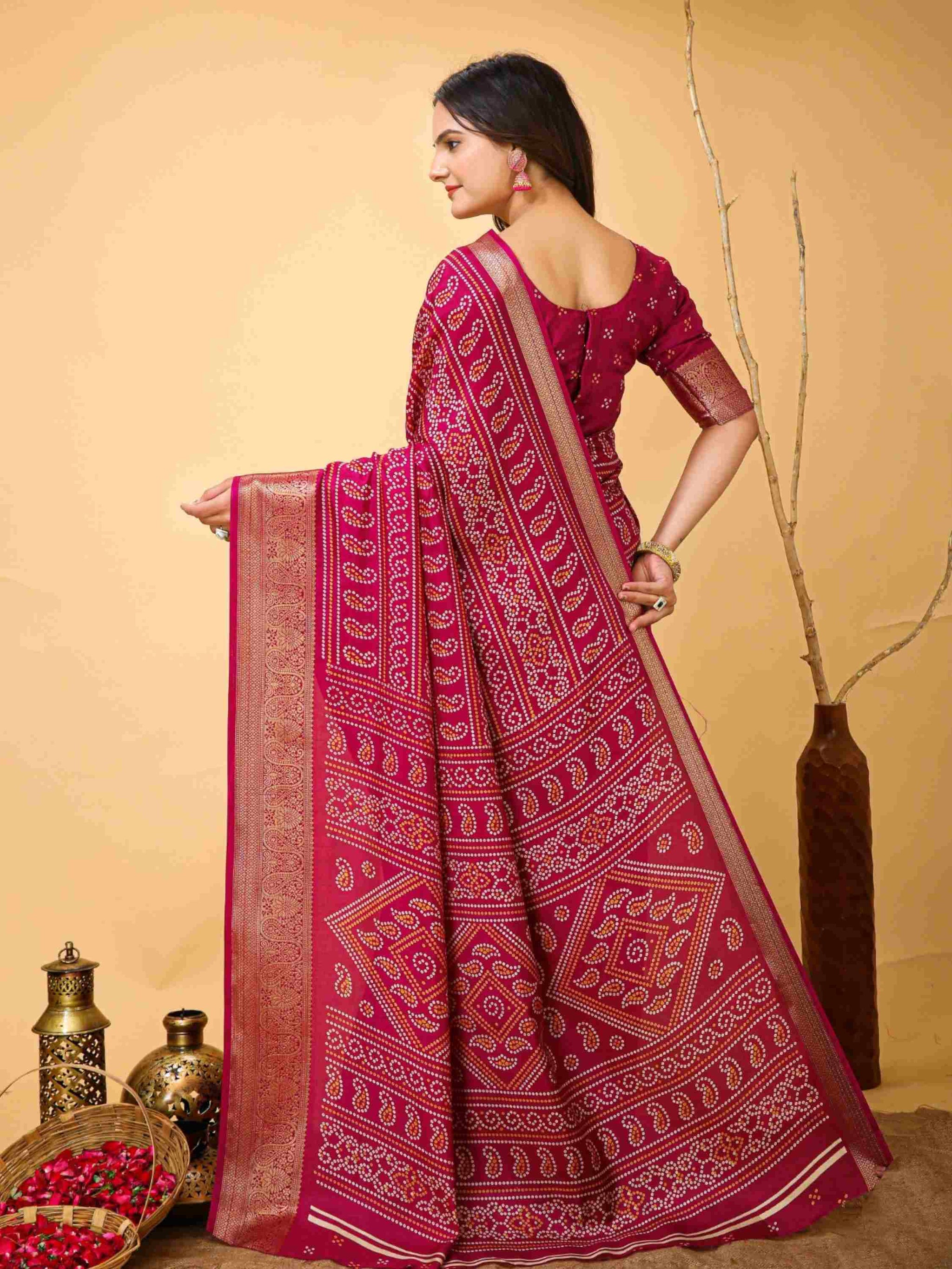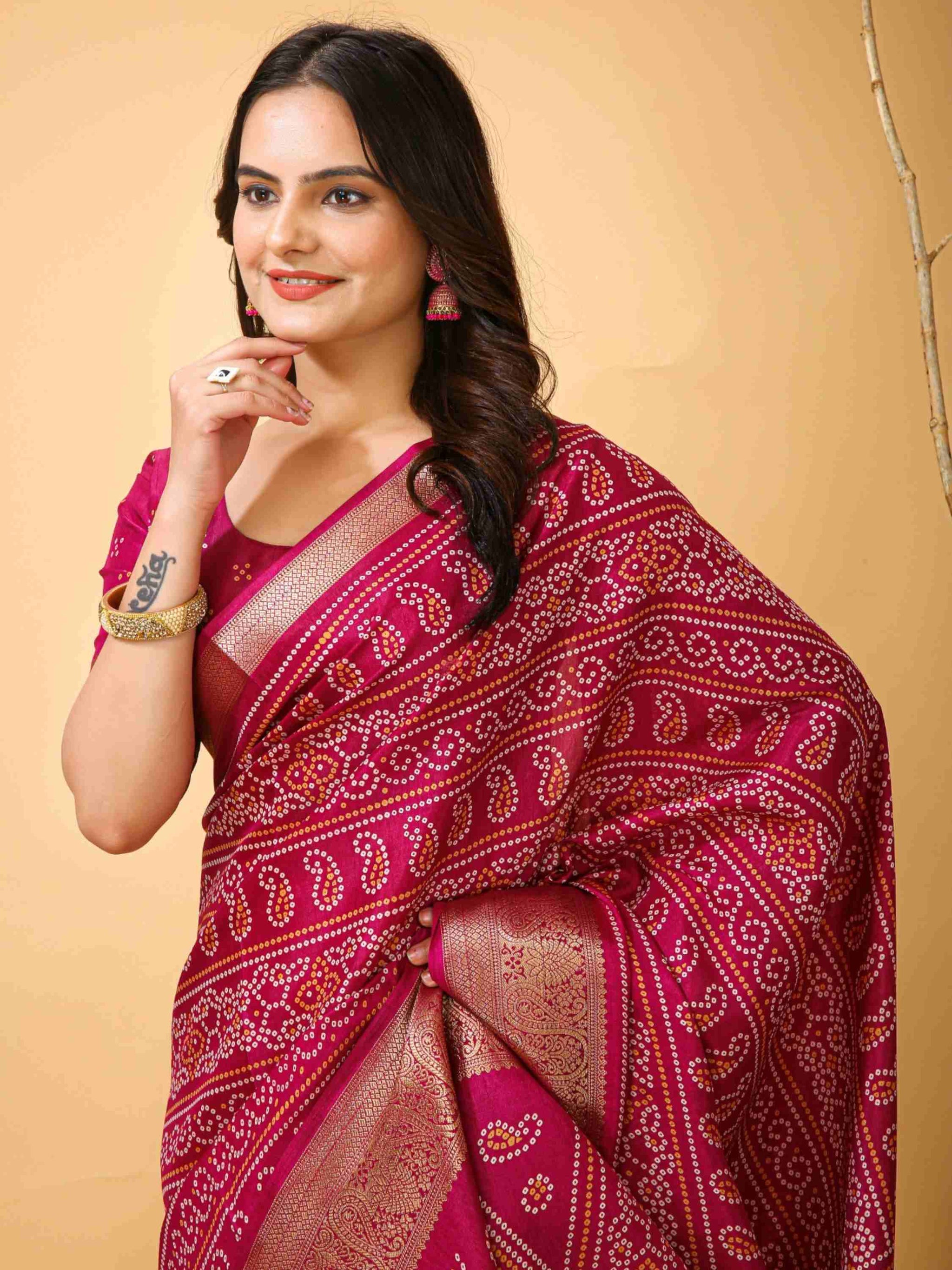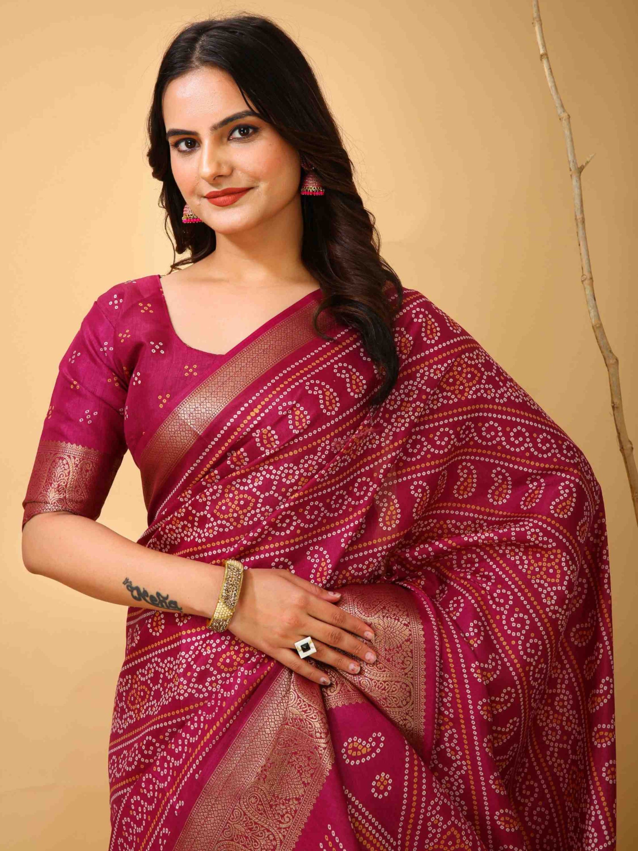 Elegant Dola Silk Cotton Pink Bandhani printed saree, zari checks, zari border and printed blouse piece. Perfect for festivals, weddings and pujas.