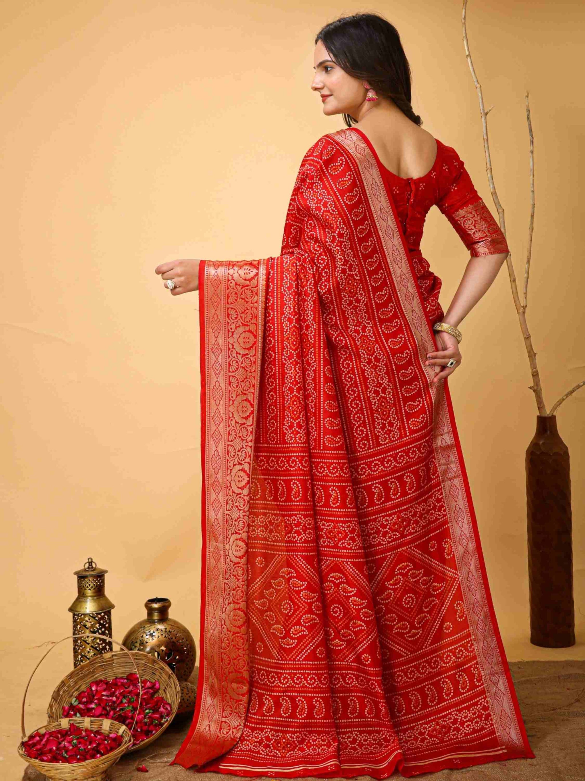 Elegant Dola Silk Cotton Red Bandhani printed saree, zari checks, zari border and printed blouse piece. Perfect for festivals, weddings and pujas.