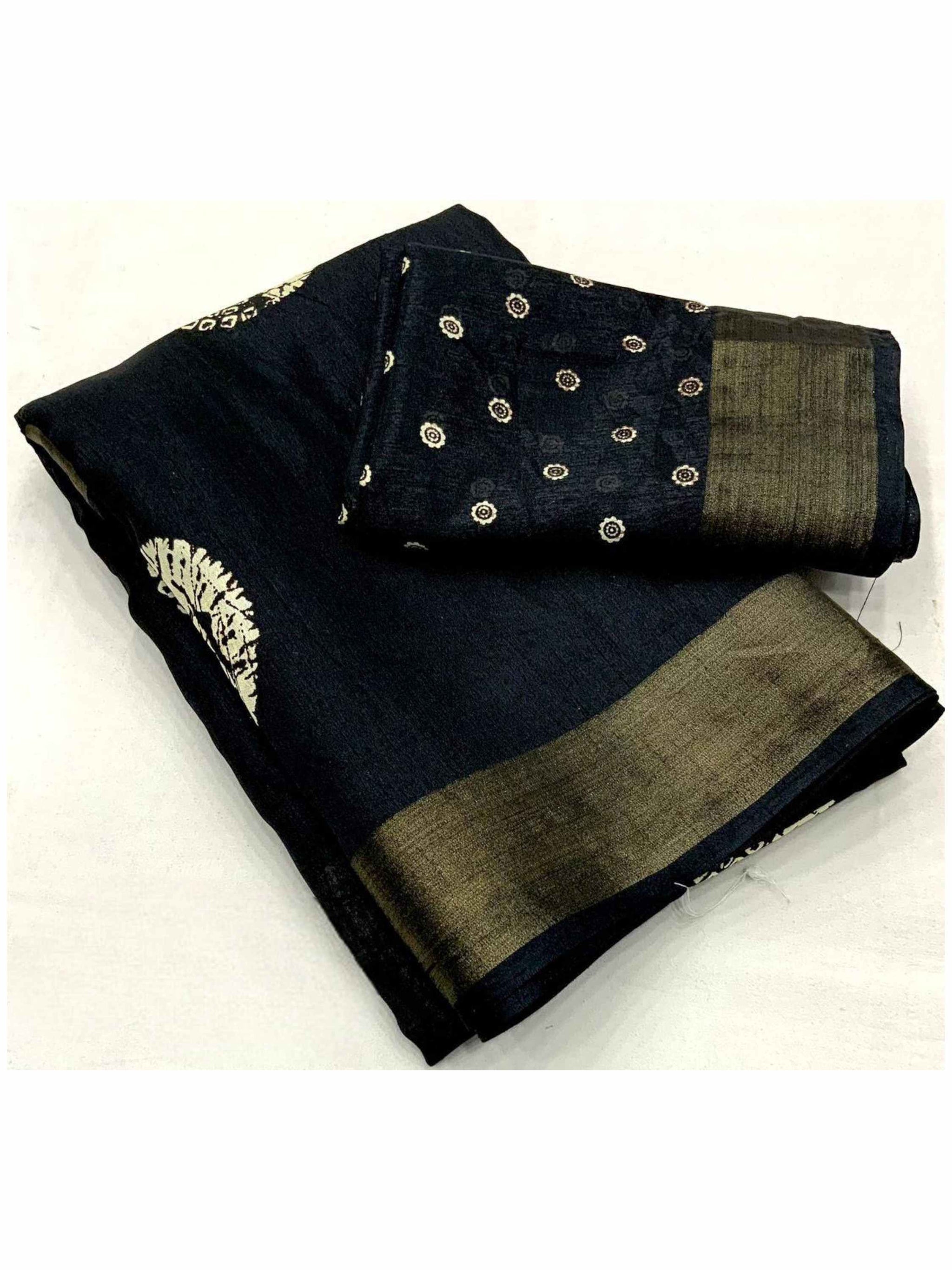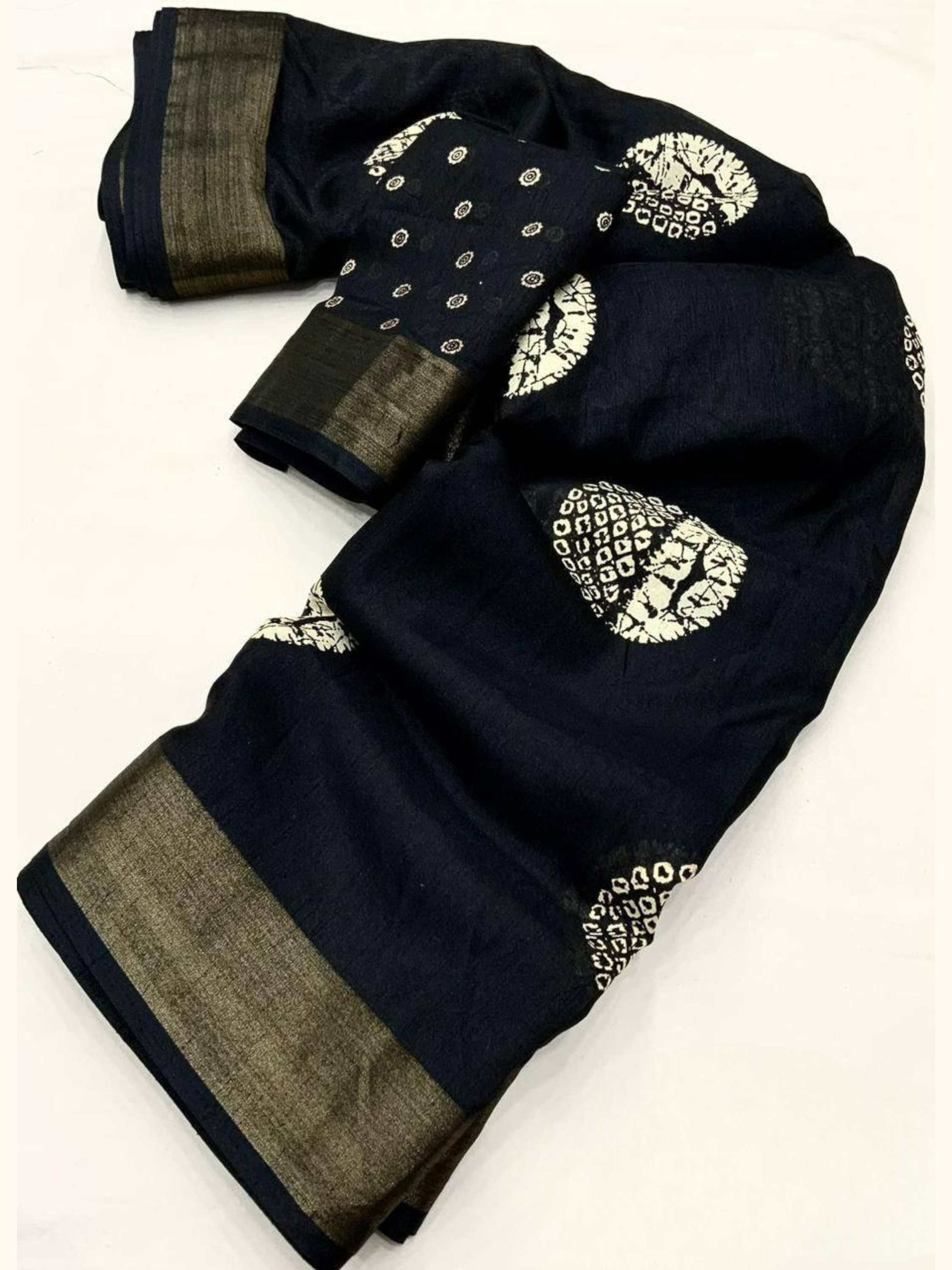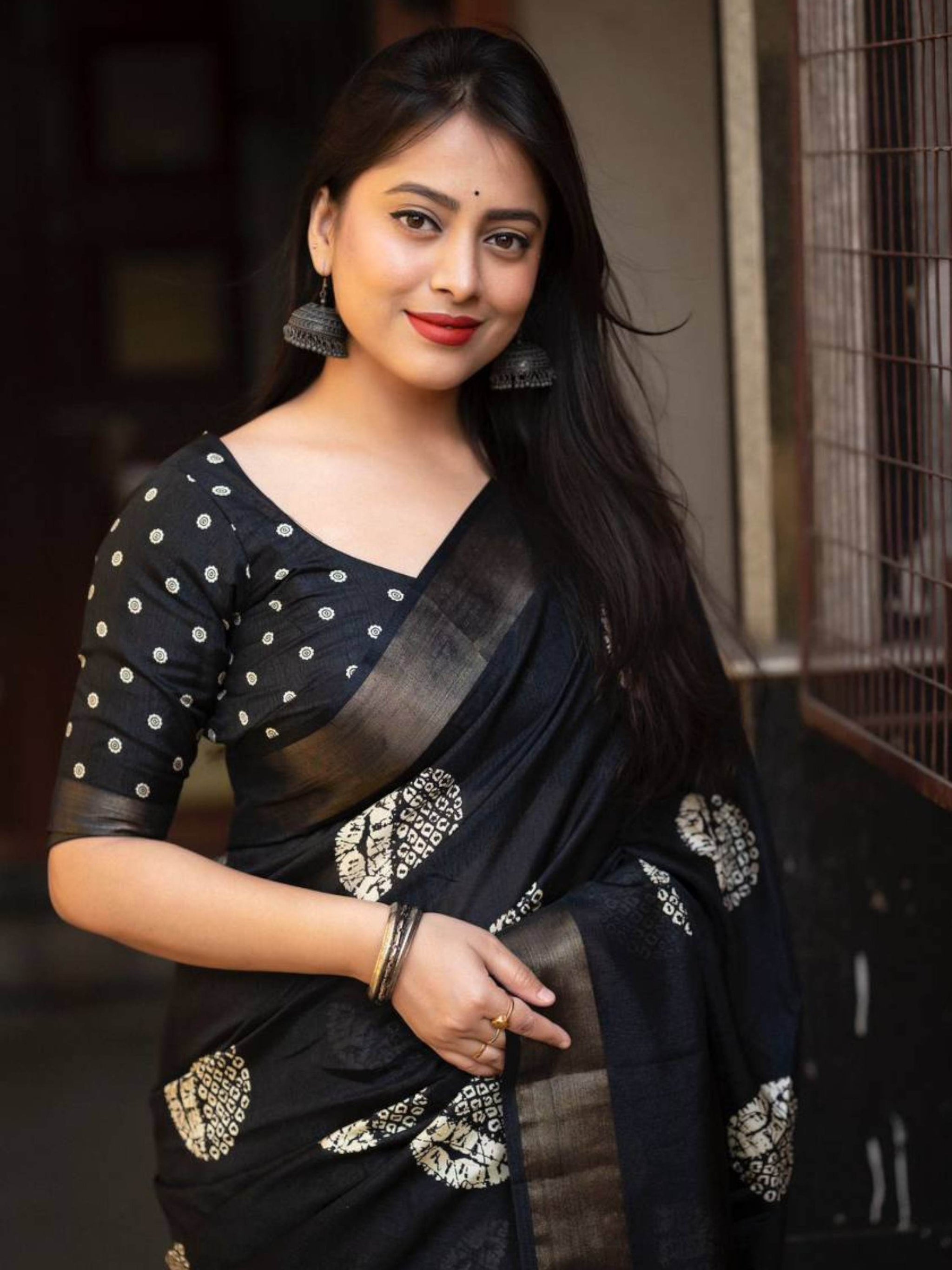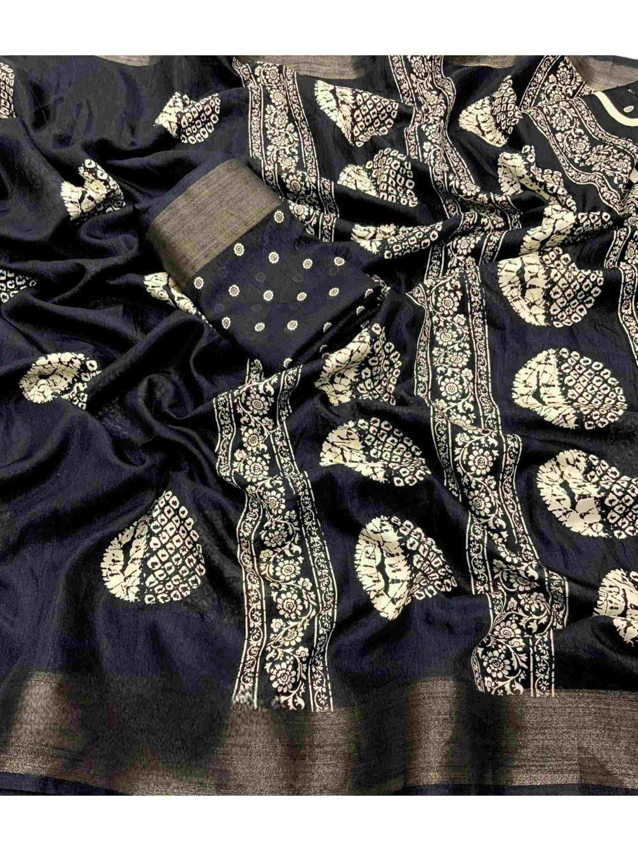 Dola Silk Cotton Saree Black comes with traditional batik print, zari border and matching printed blouse piece, can be styled for any occasion or function.