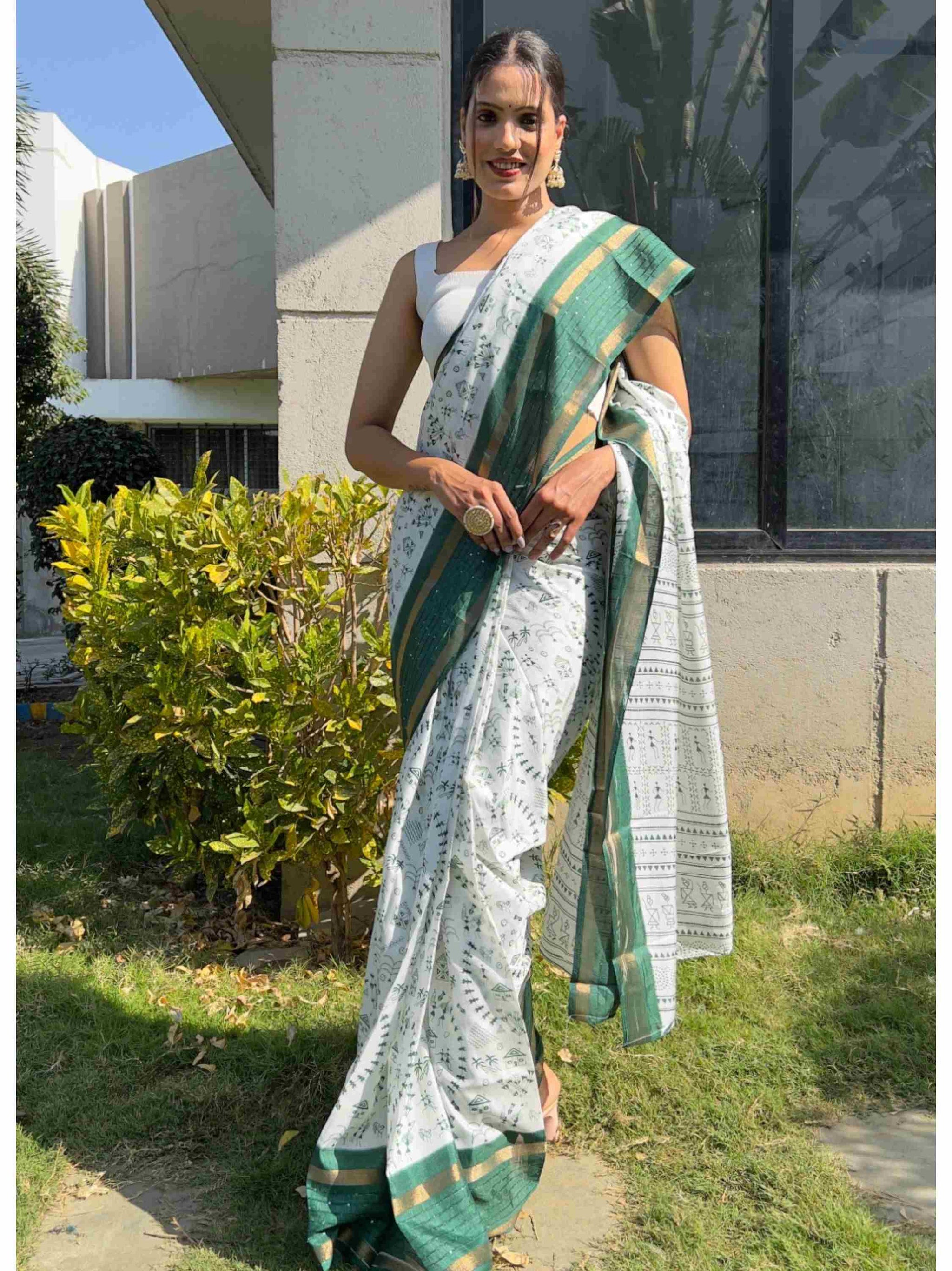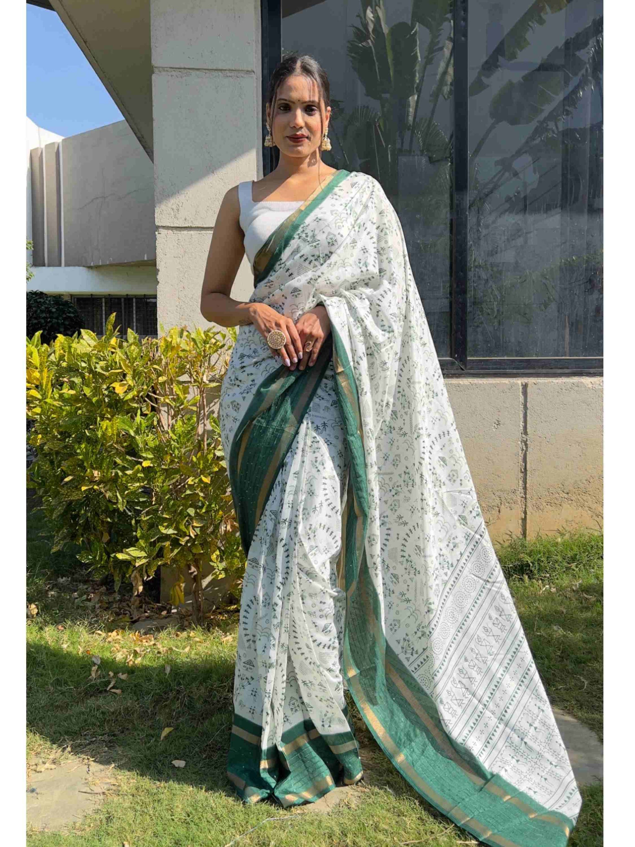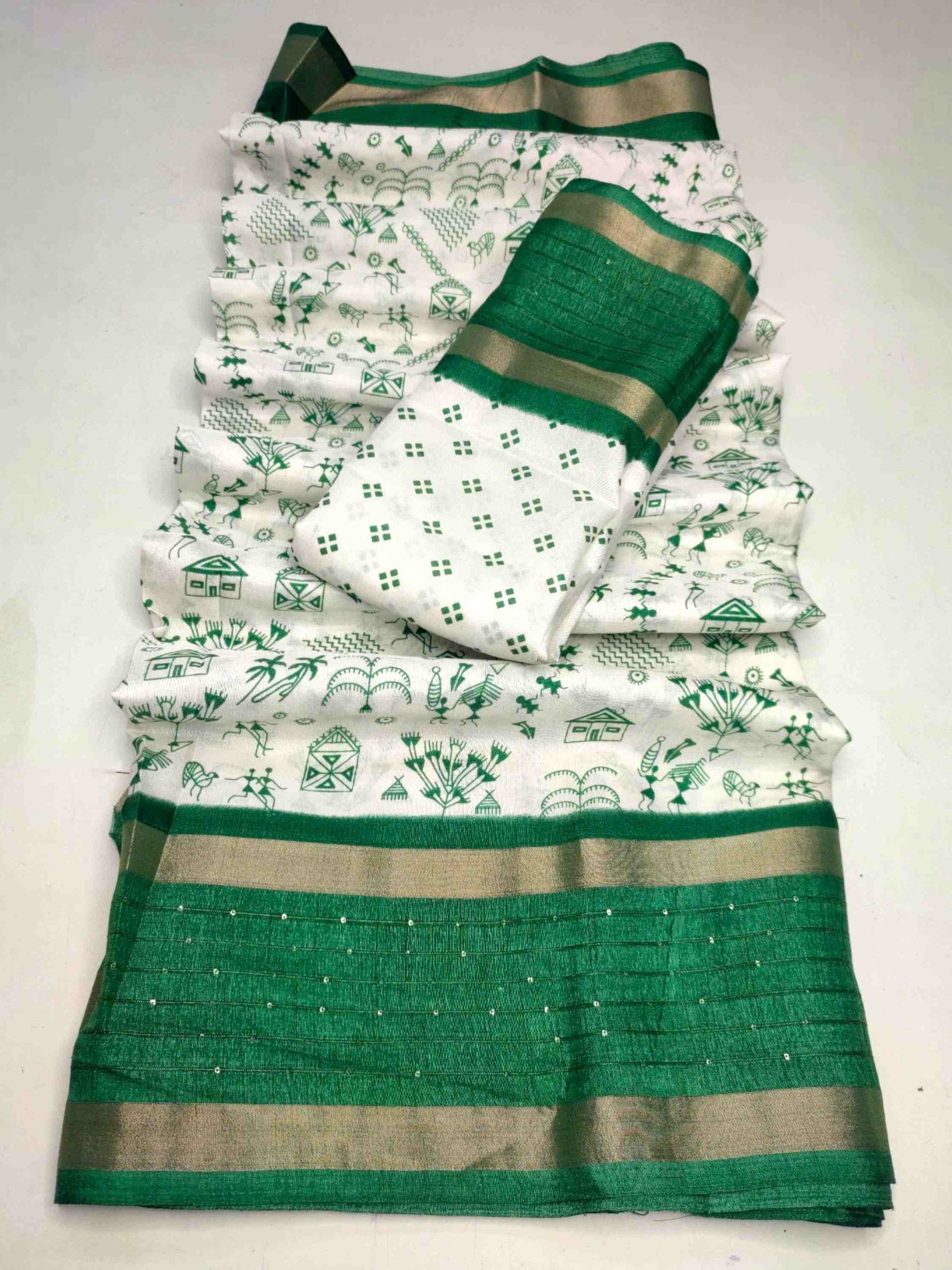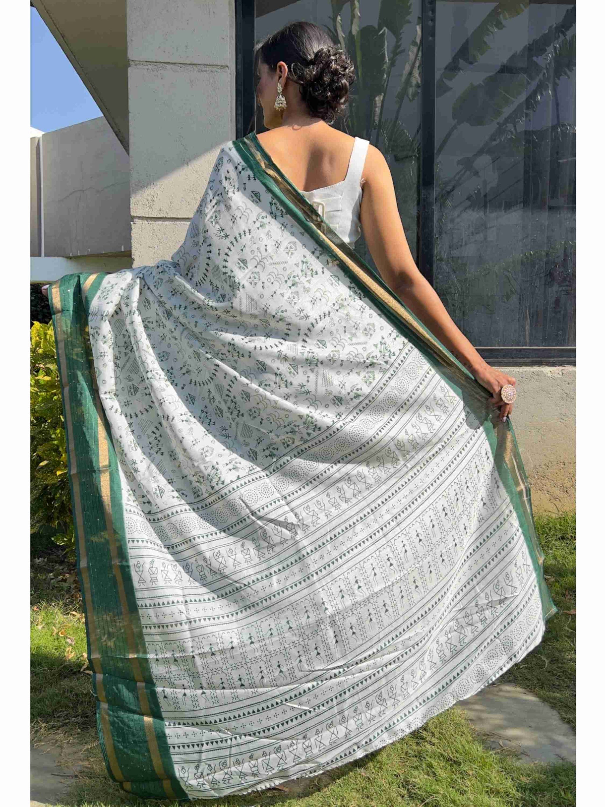 Dola Silk Cotton Saree in white colour has green warli print and border with sequence work. Best for summer, formal, festival and all-day wear.