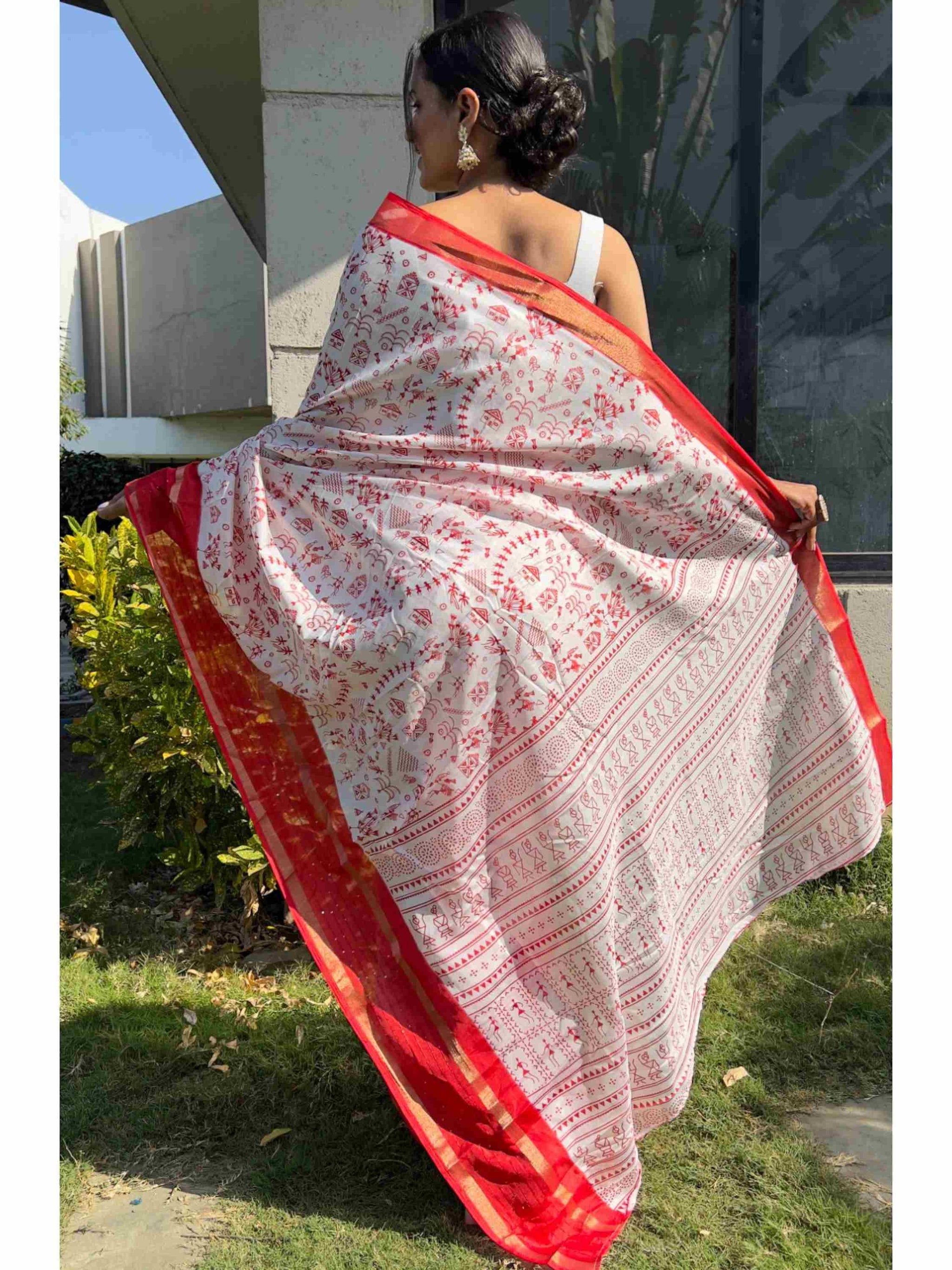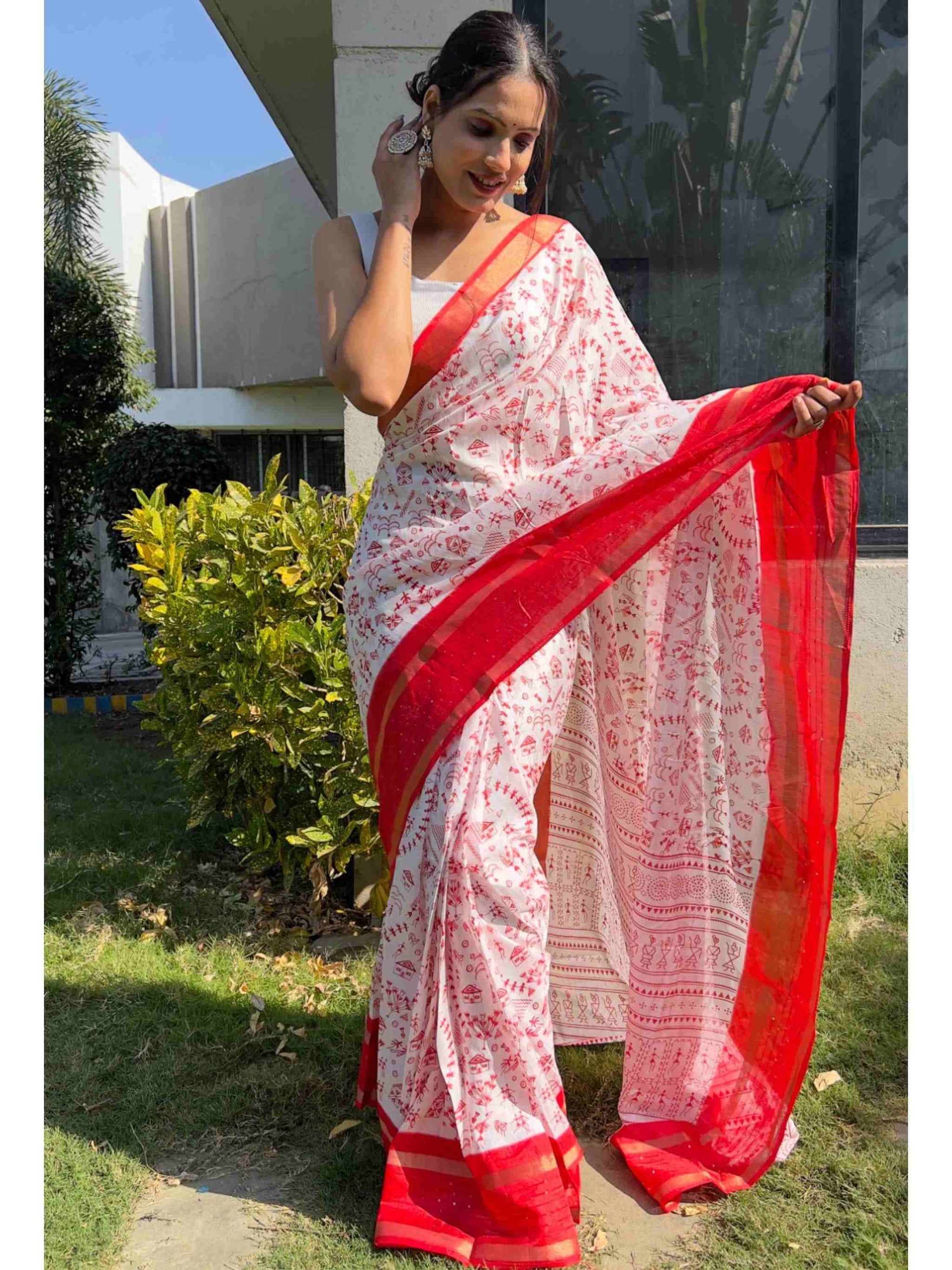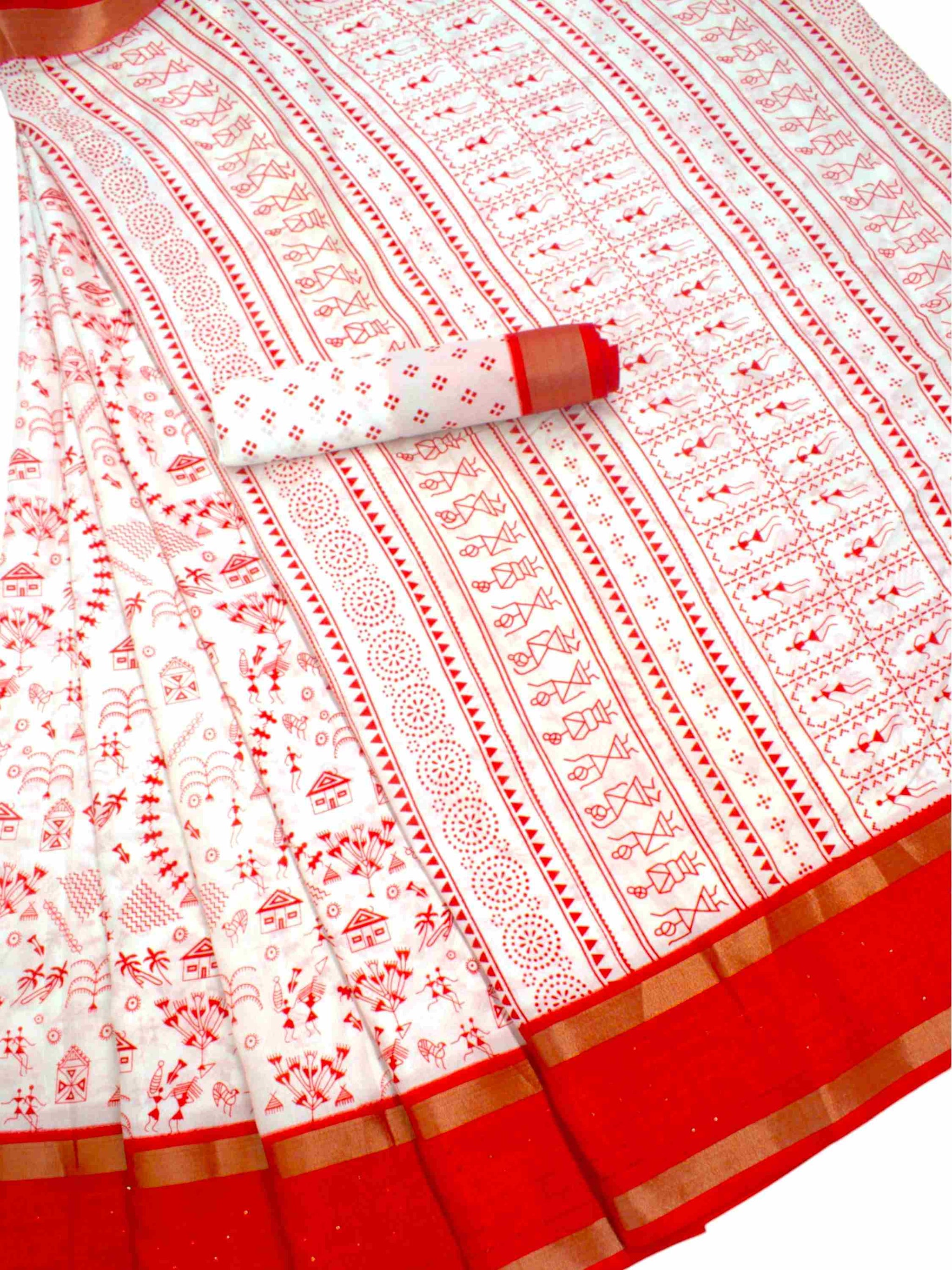 Dola Silk Cotton Saree in white colour has red warli print and border with sequence work. Best for summer, formal, festival and all-day wear.