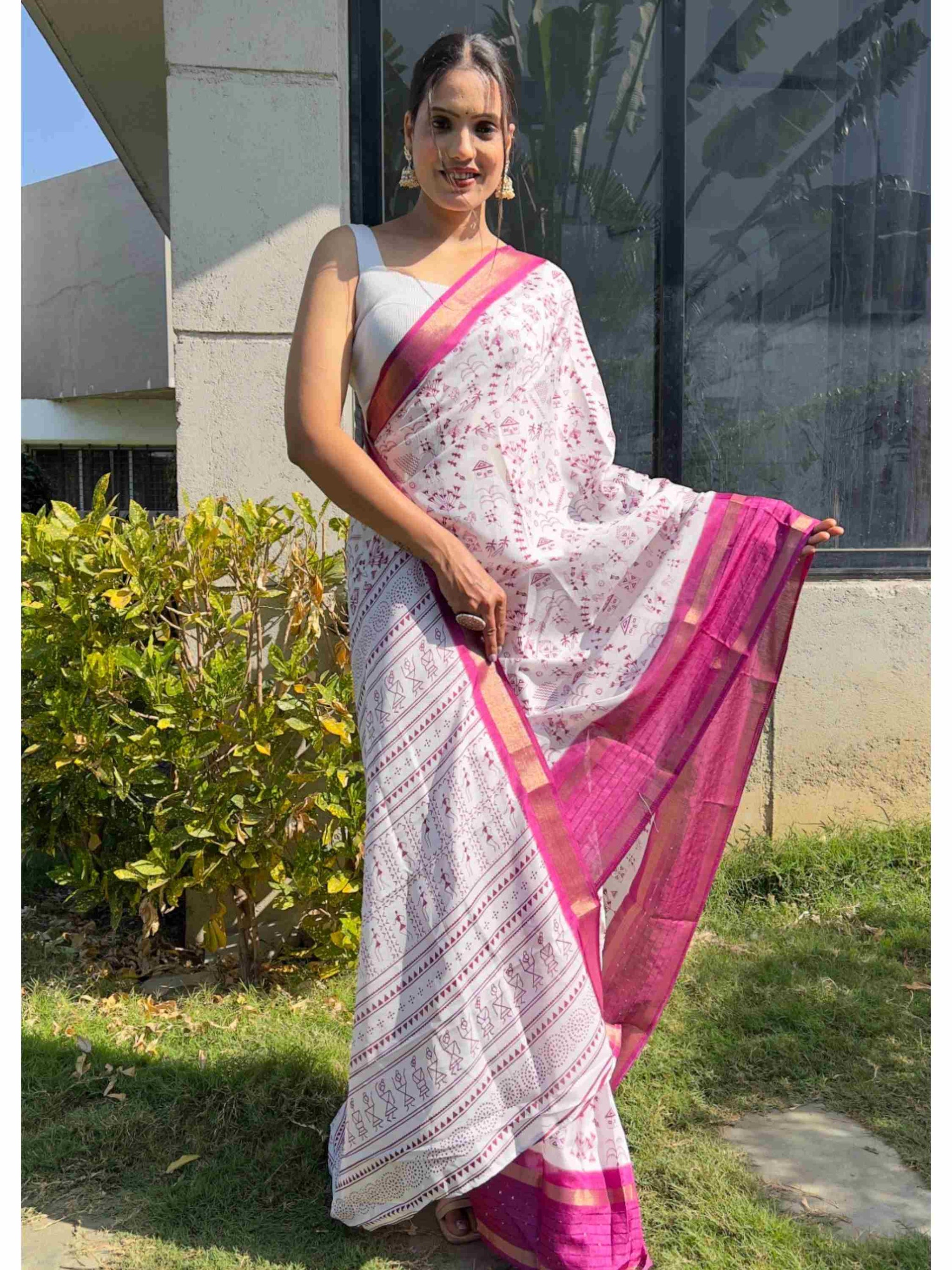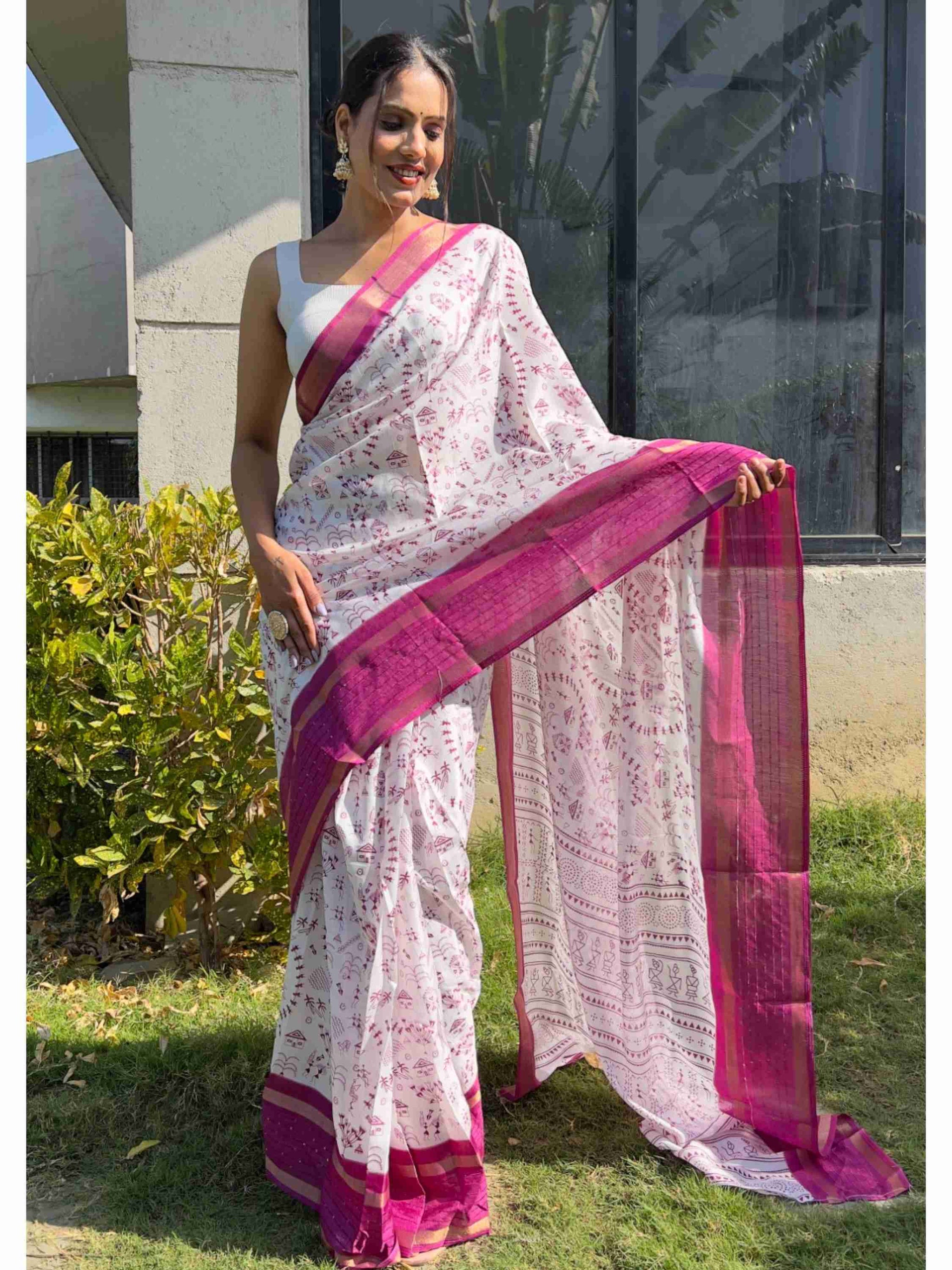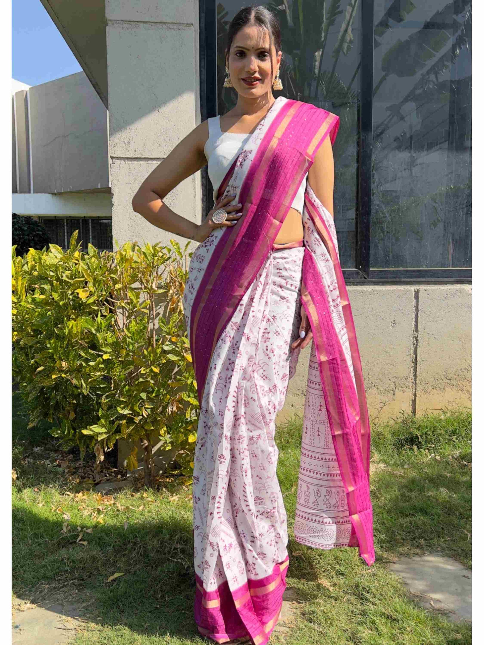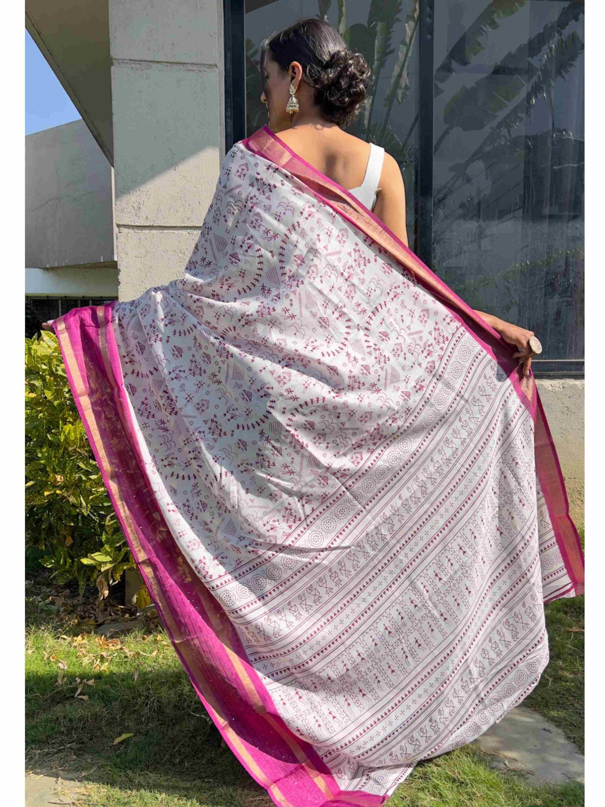 Dola Silk Cotton Saree in white colour has wine warli print and border with sequence work. Best for summer, formal, festival and all-day wear.