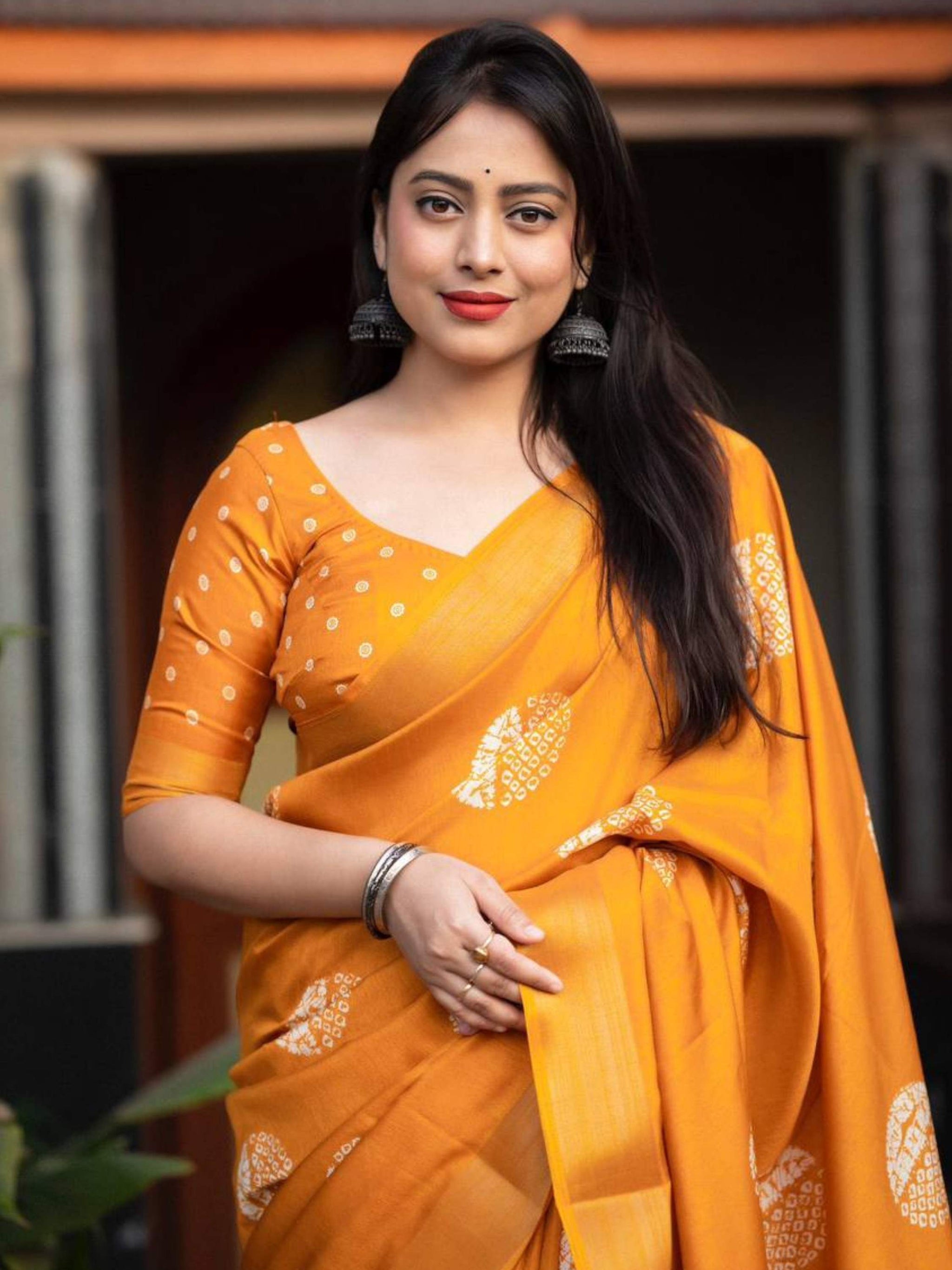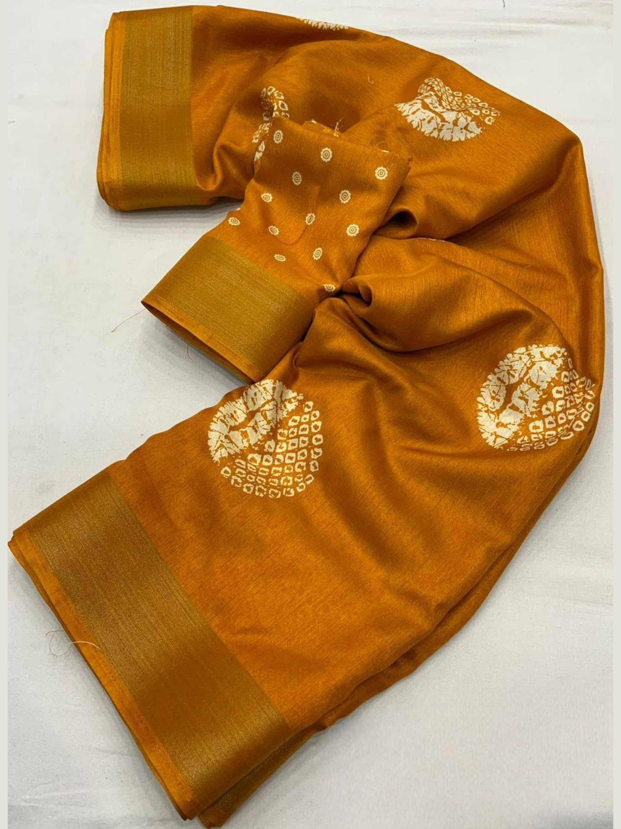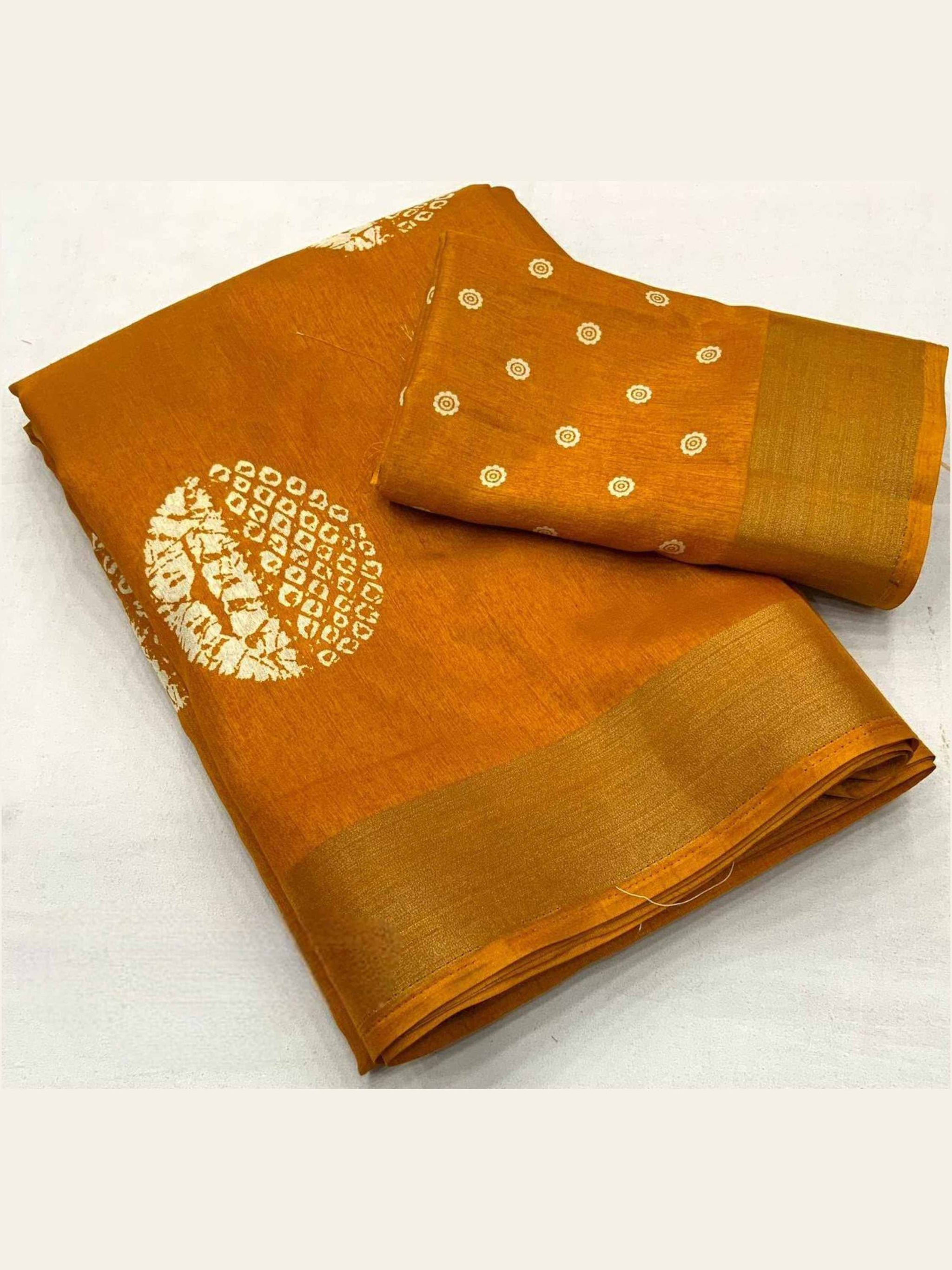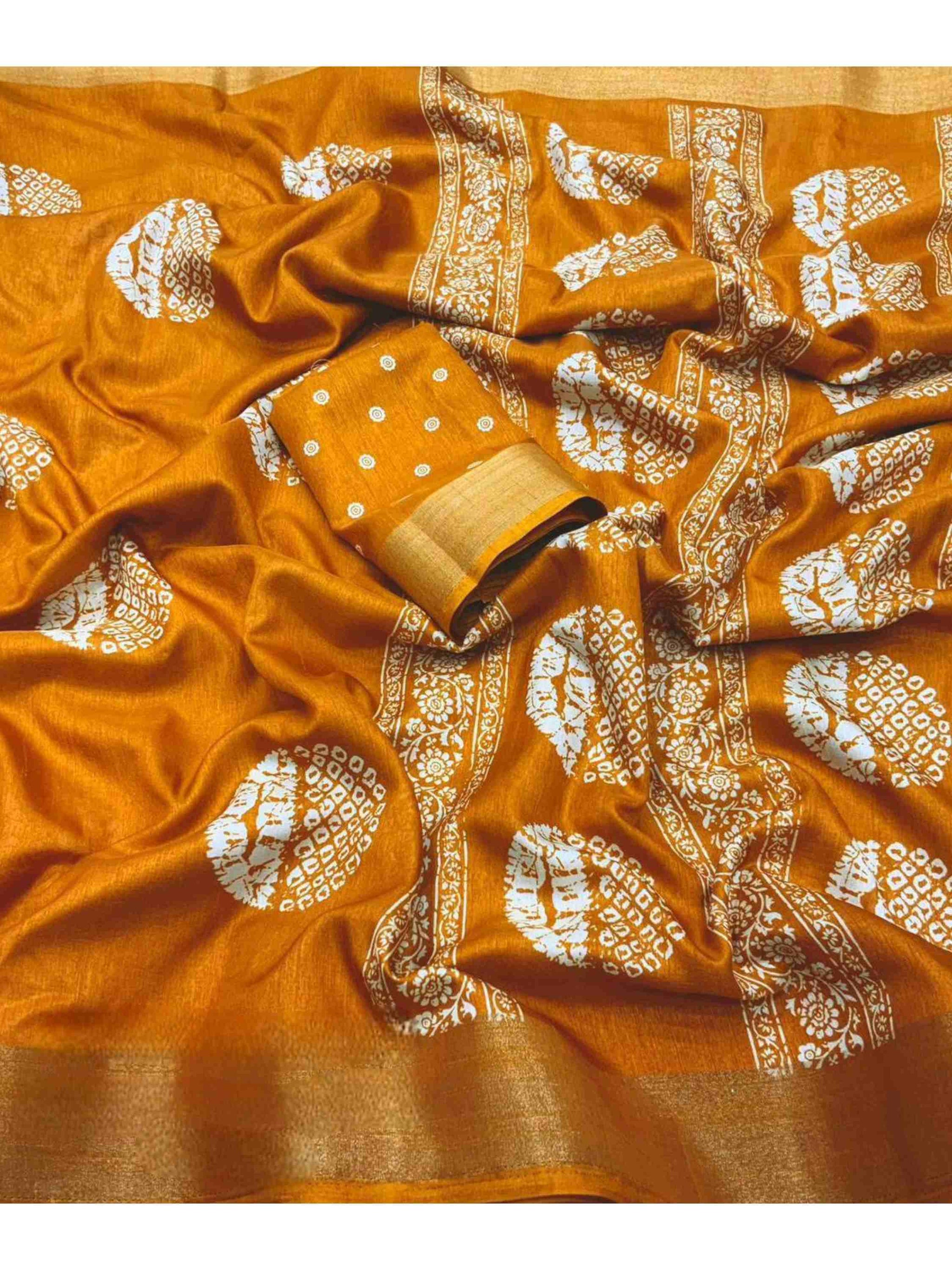 Dola Silk Cotton Saree Yellow comes with traditional batik print, zari border and matching printed blouse piece, can be styled for any occasion or function.