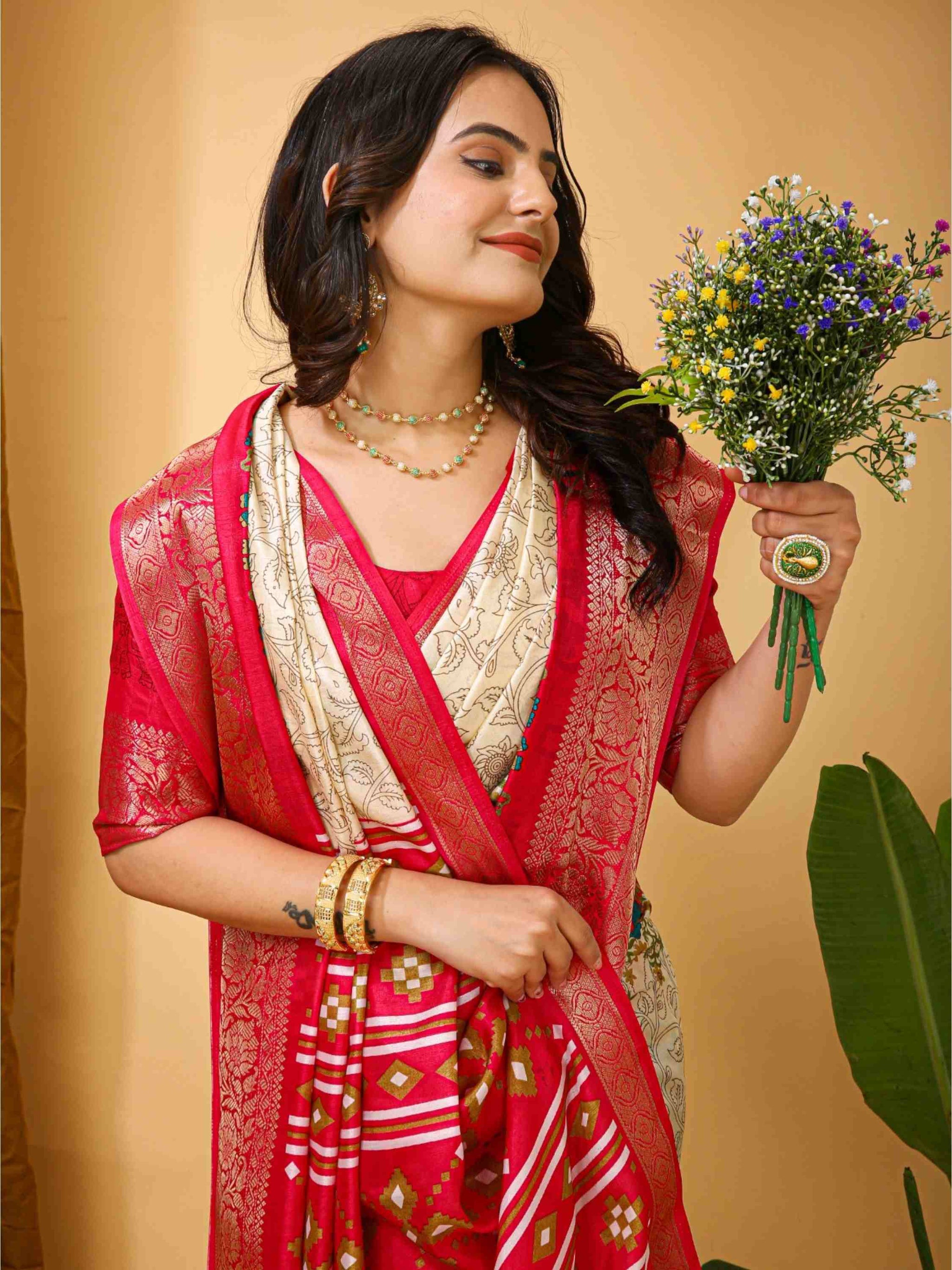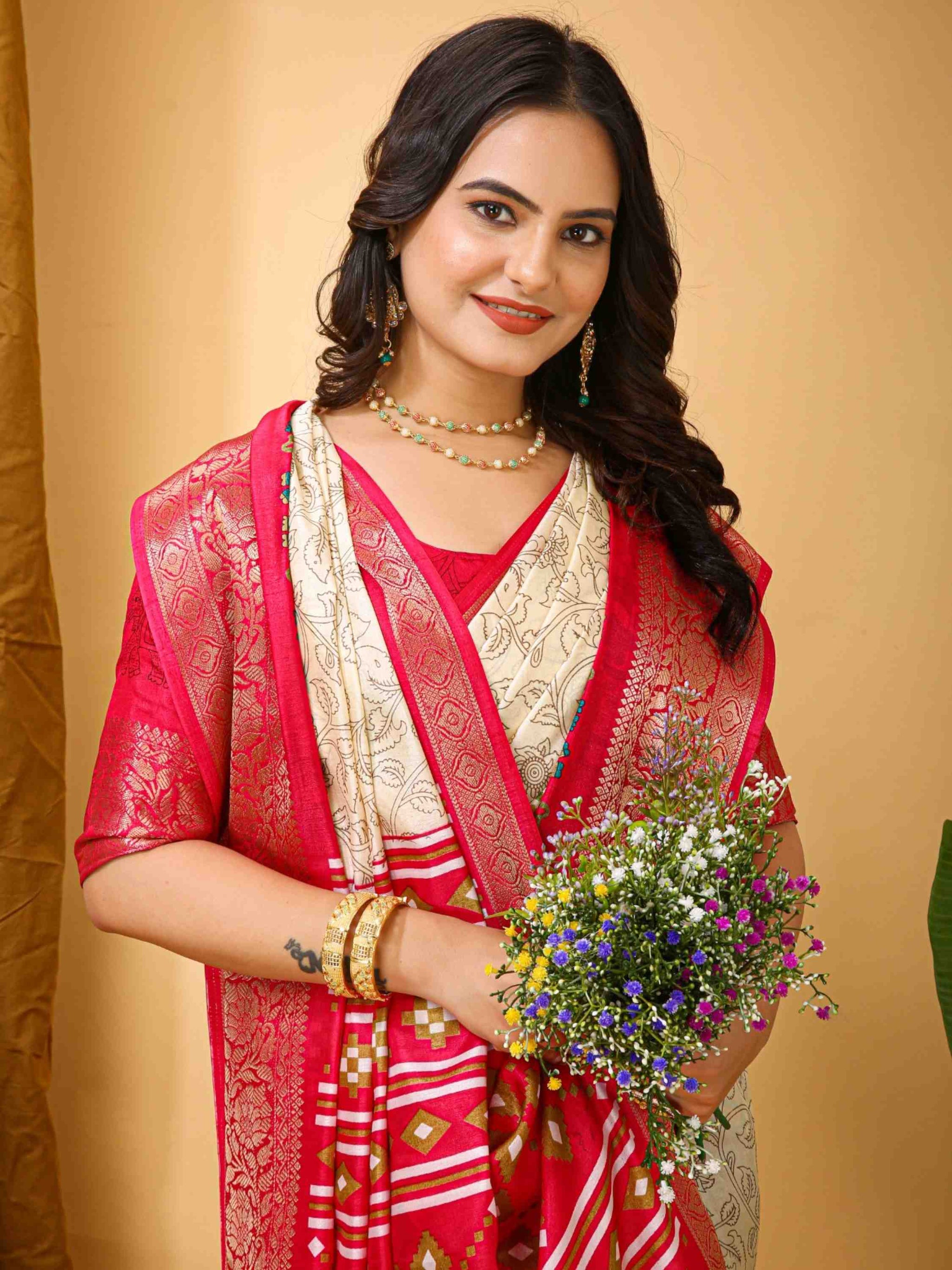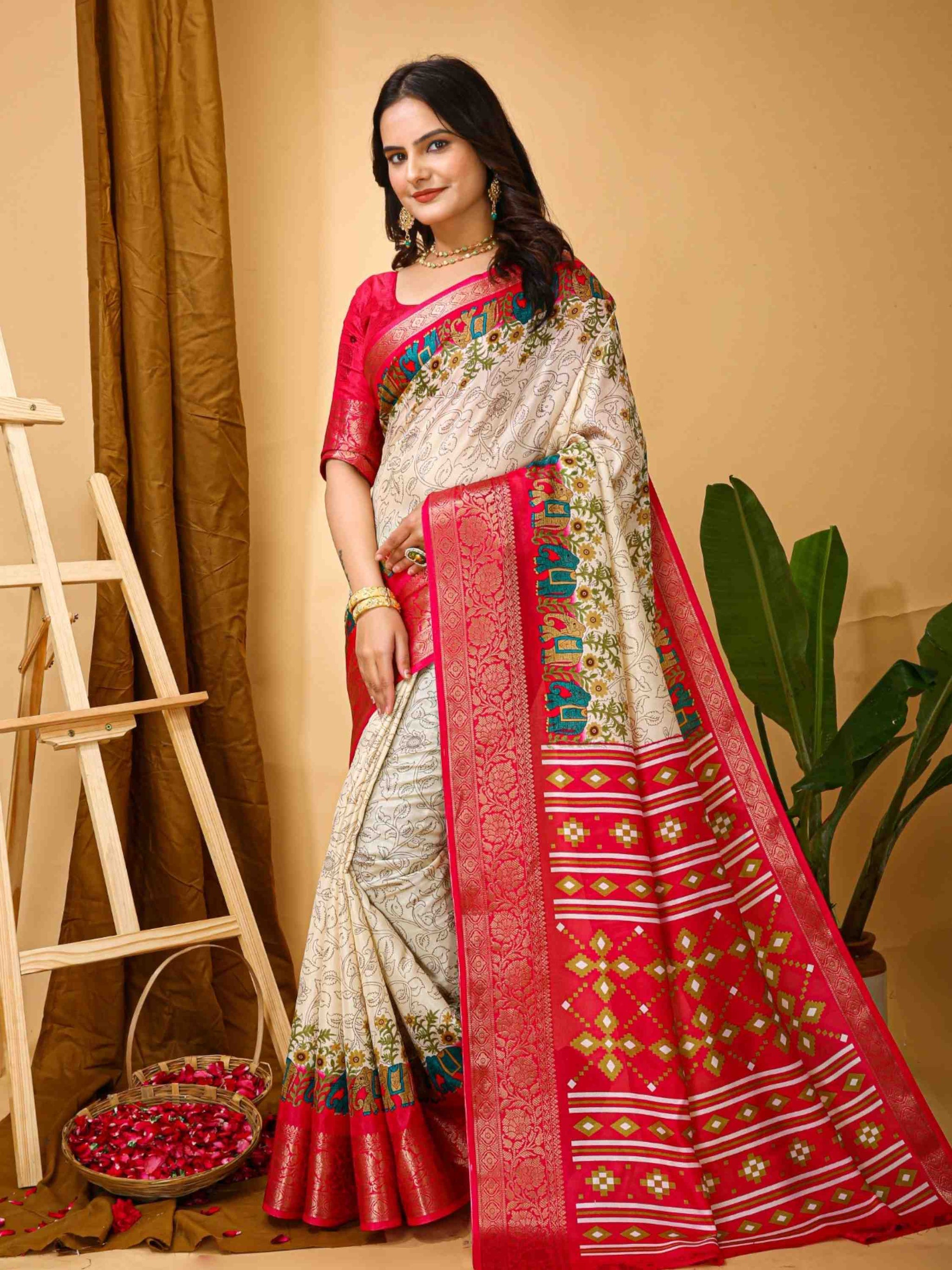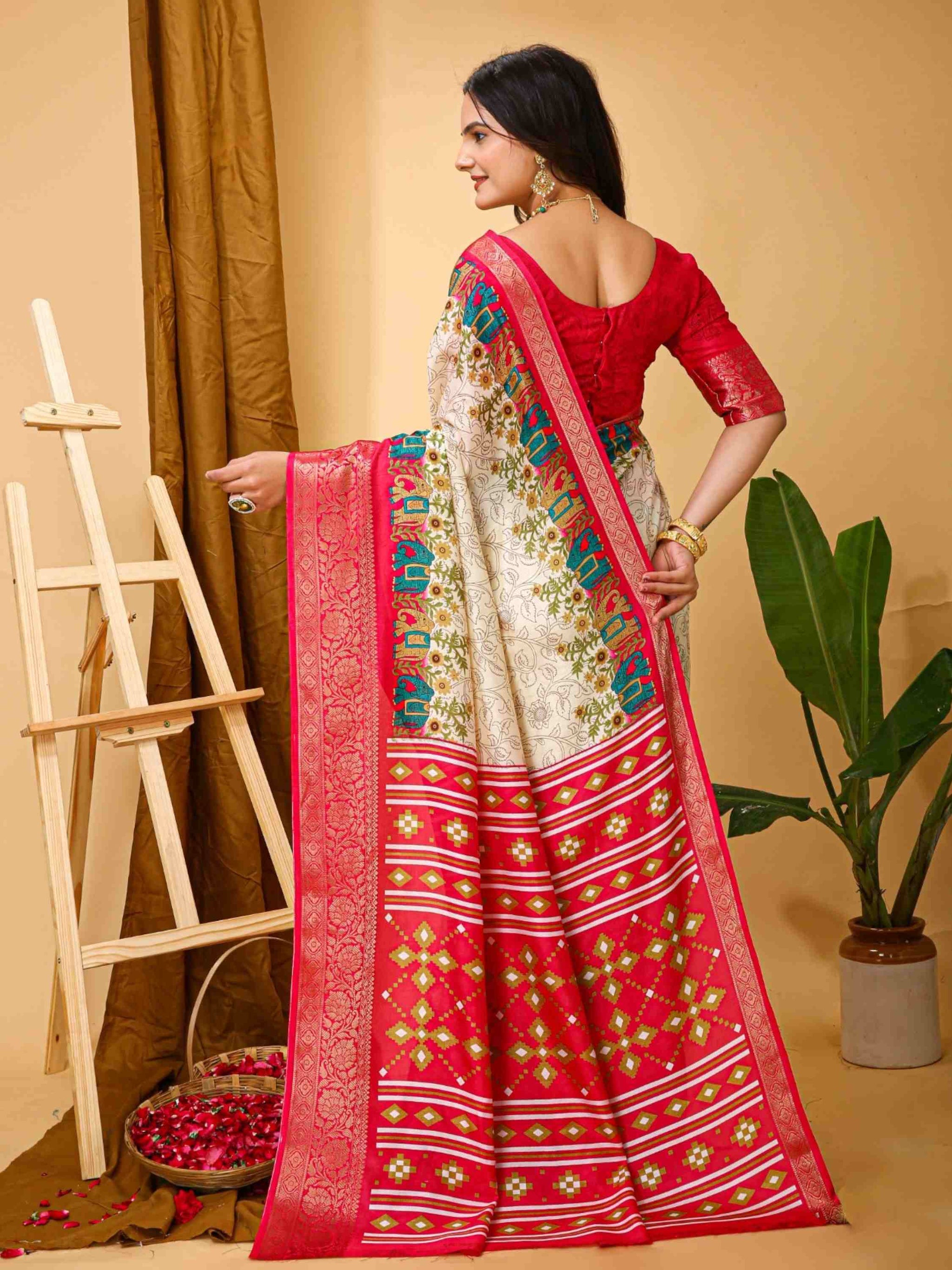 Dola Silk Saree Off White with Kalamkari print, mixed patterns, beautiful zari border and blouse piece. Perfect for festivals, parties, weddings or office wear.