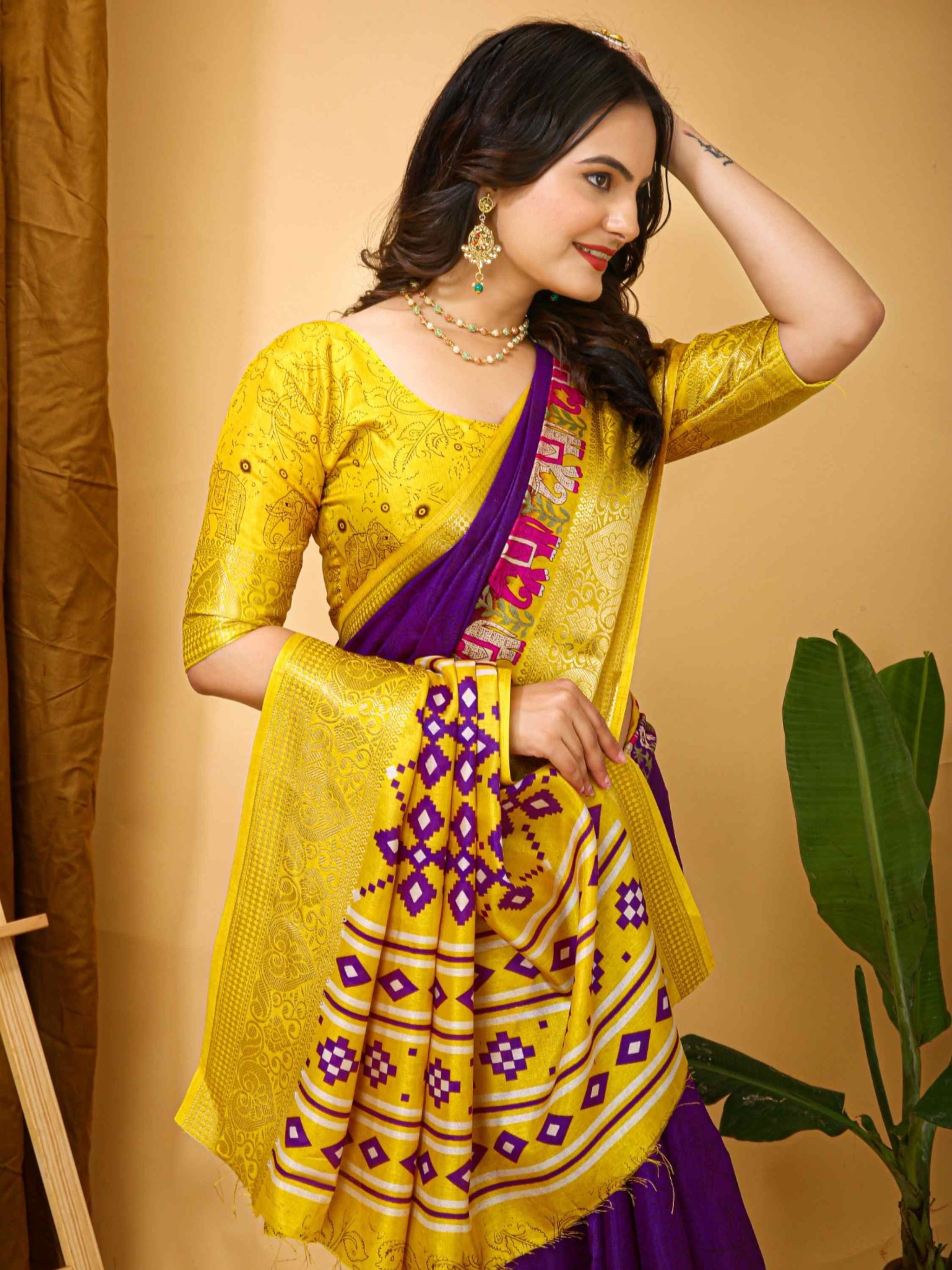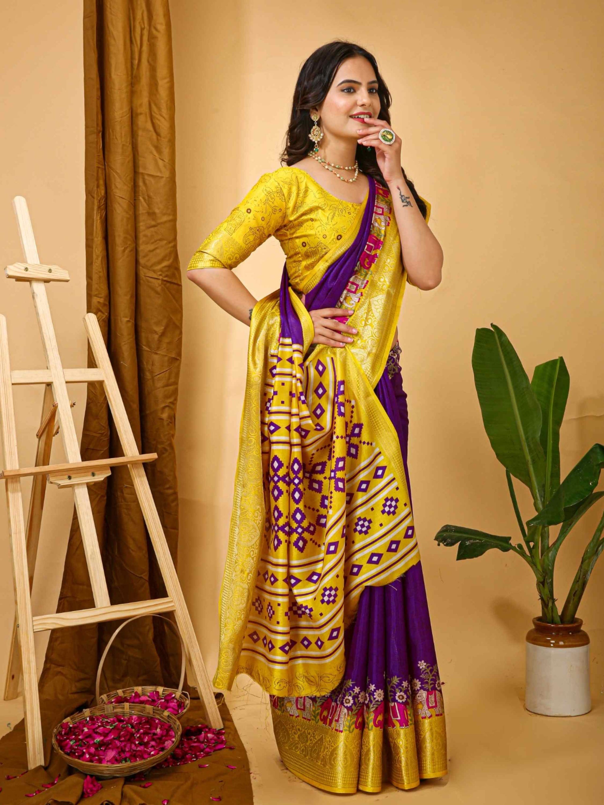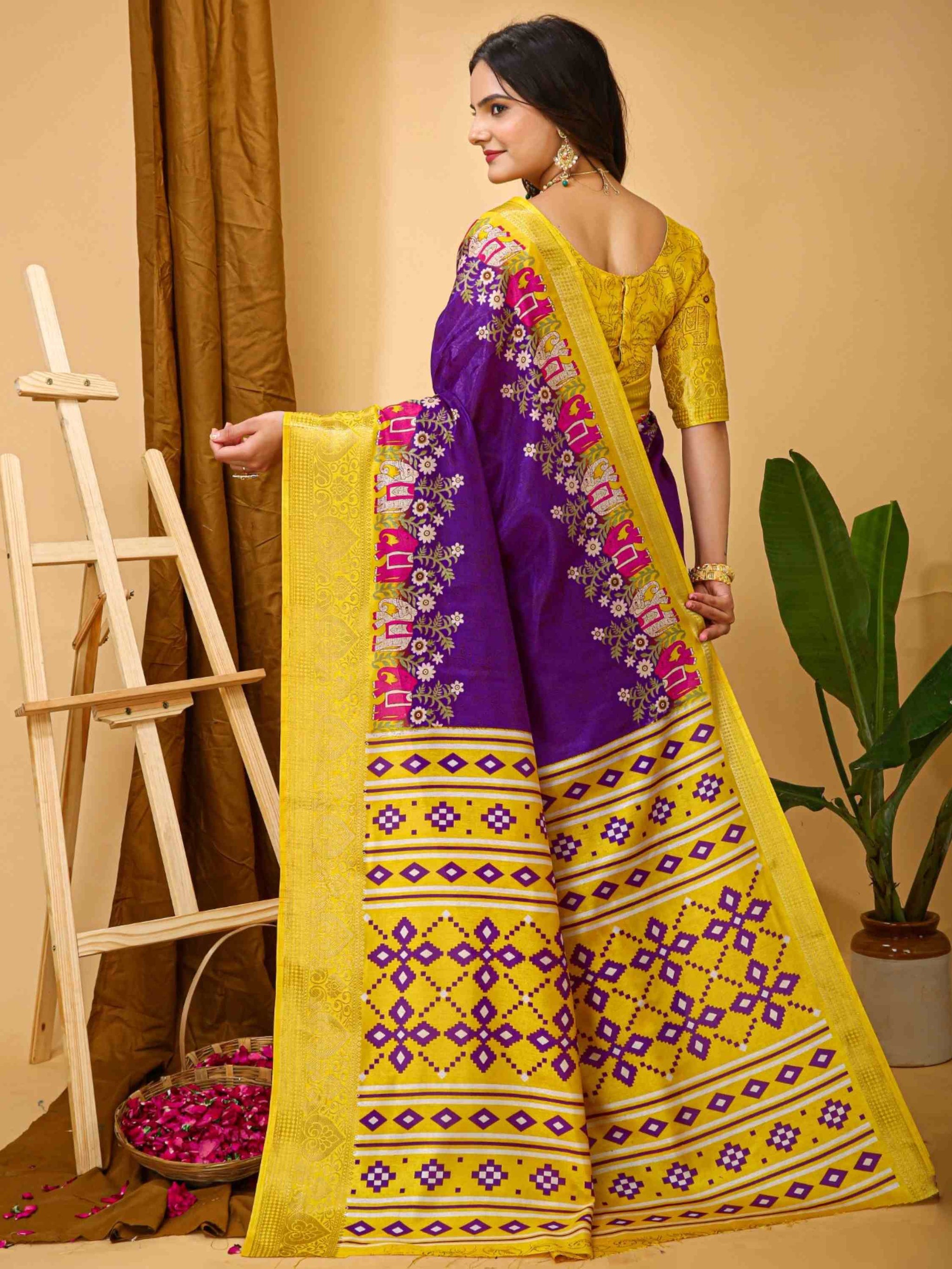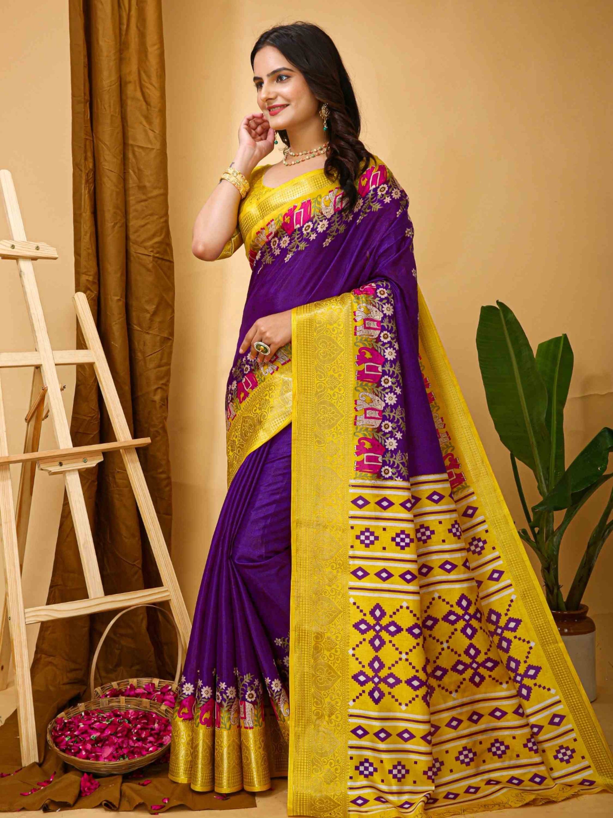 Dola Silk Saree Purple with Kalamkari print, mixed patterns, beautiful zari border and blouse piece. Perfect for festivals, parties, weddings, or office wear.