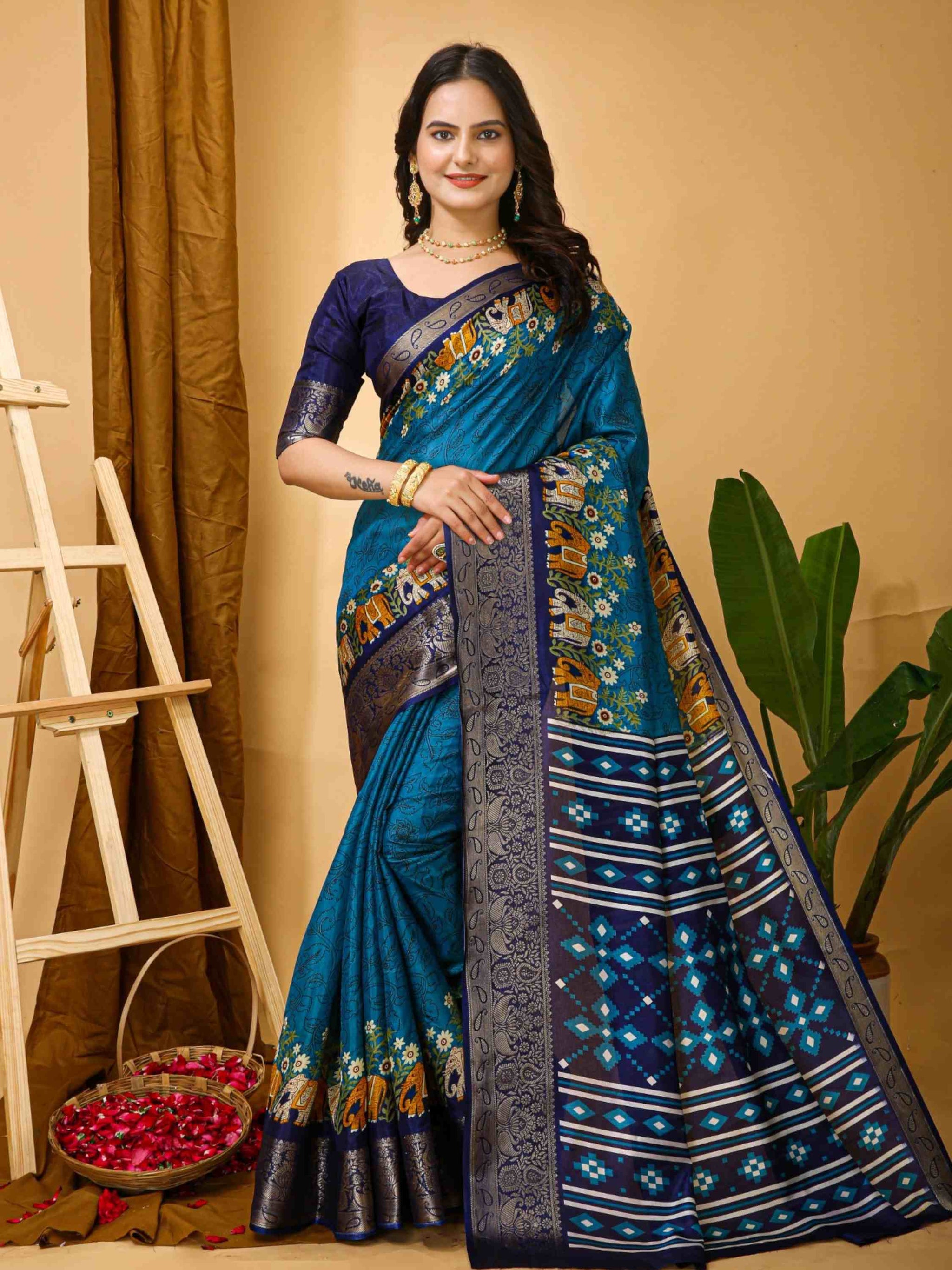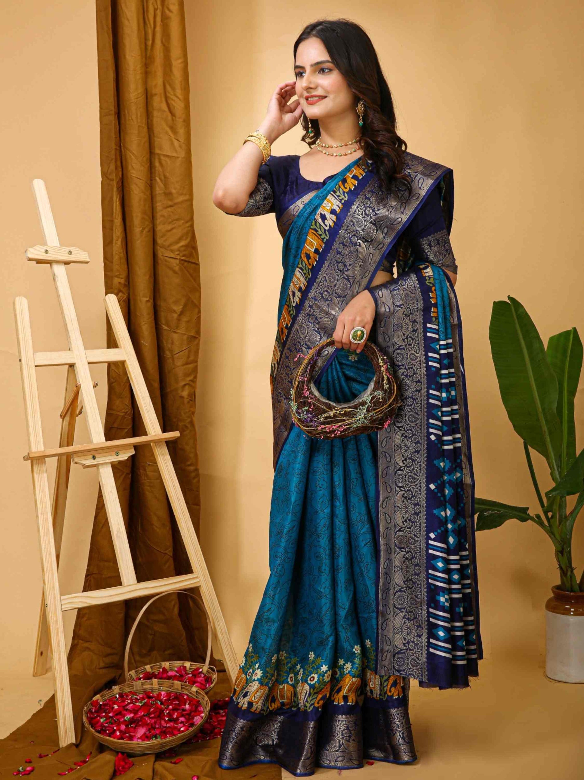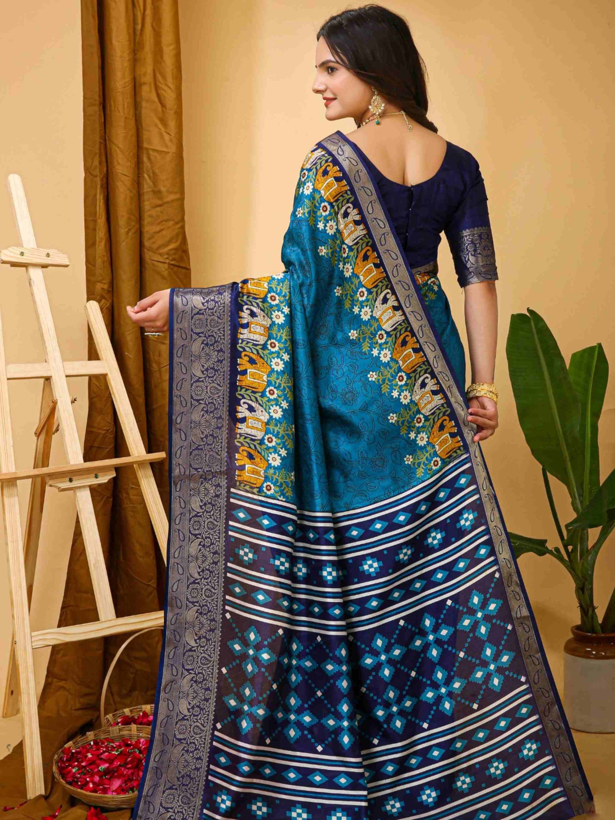 Dola Silk Saree Teal Blue with Kalamkari print, mixed patterns, beautiful zari border and blouse piece. Perfect for festivals, parties, weddings or office wear.