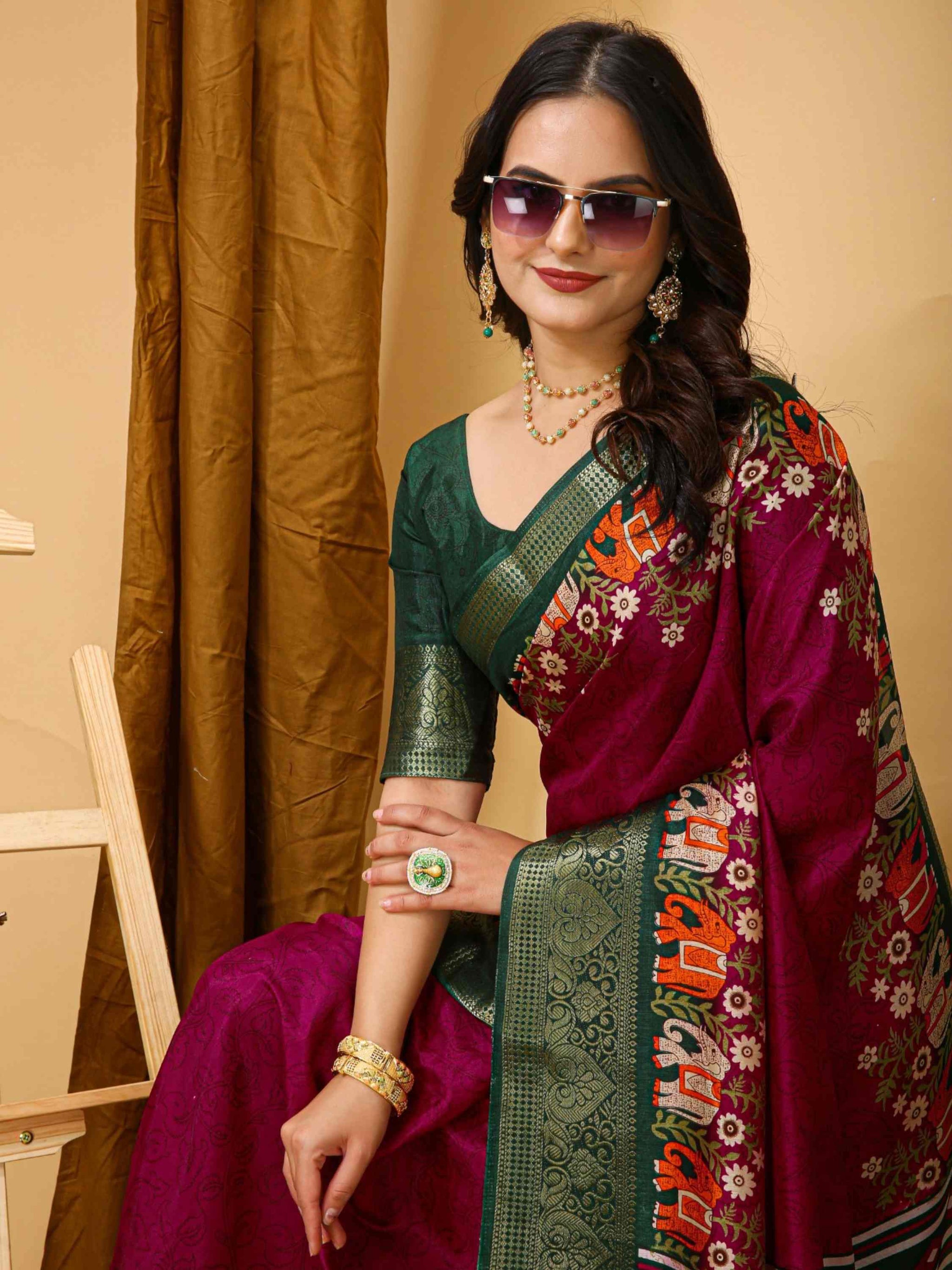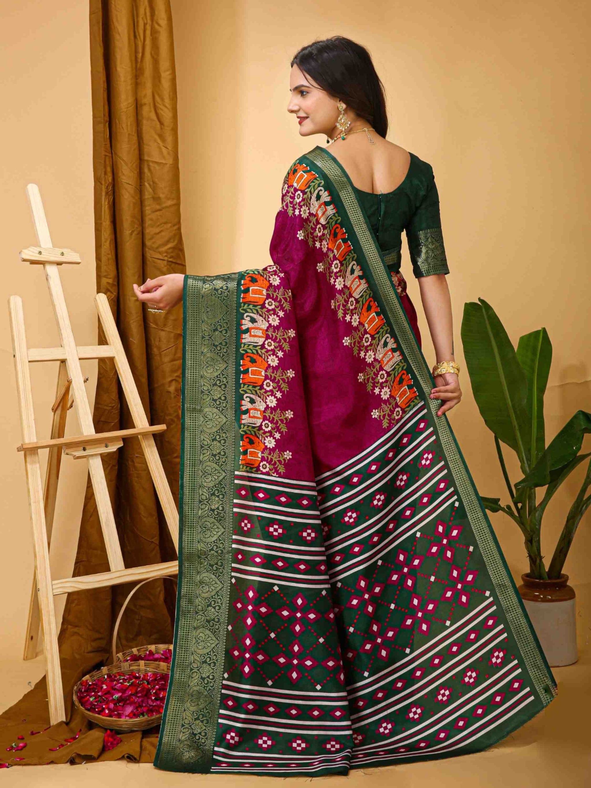 Dola Silk Saree Wine with Kalamkari print, mixed patterns, beautiful zari border and blouse piece. Perfect for festivals, parties, weddings, or office wear.
