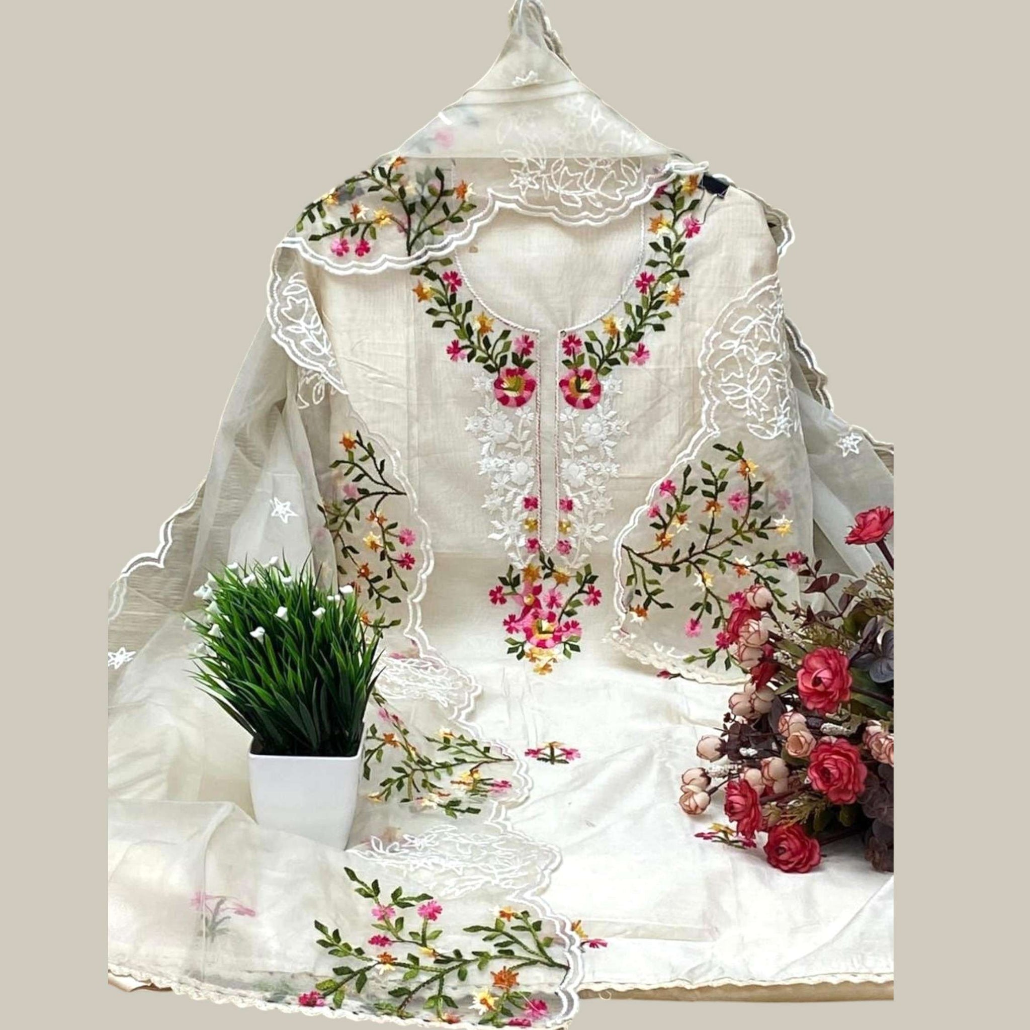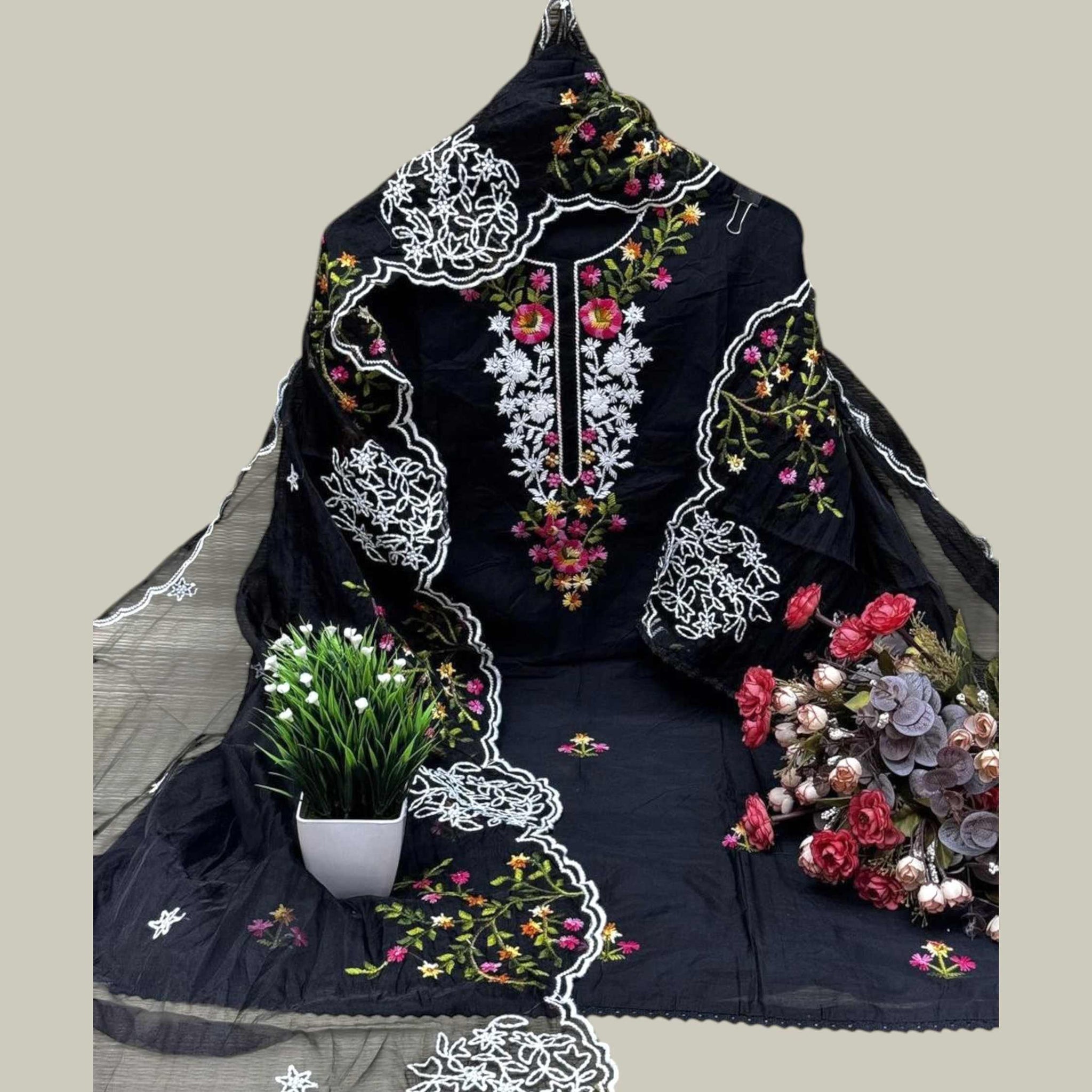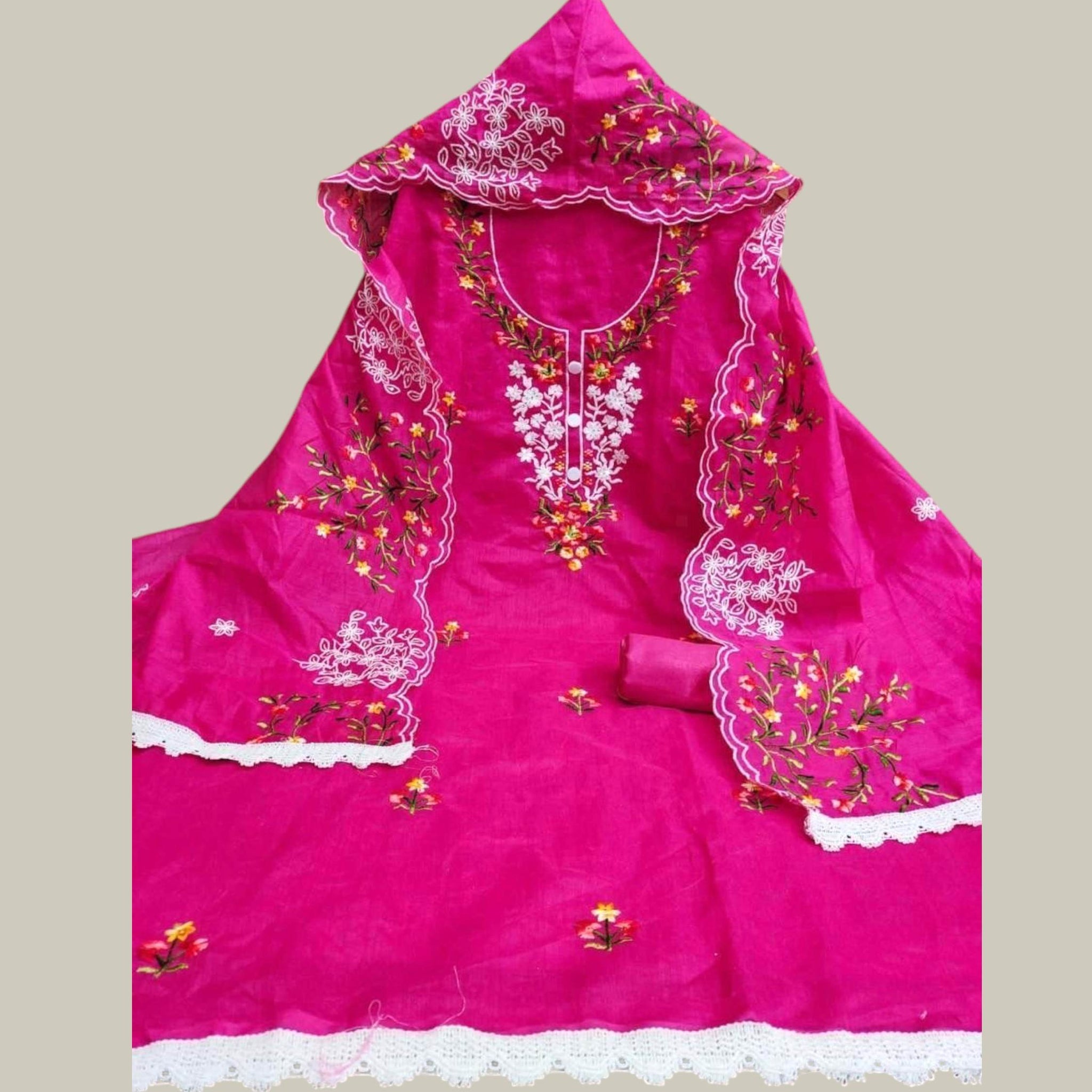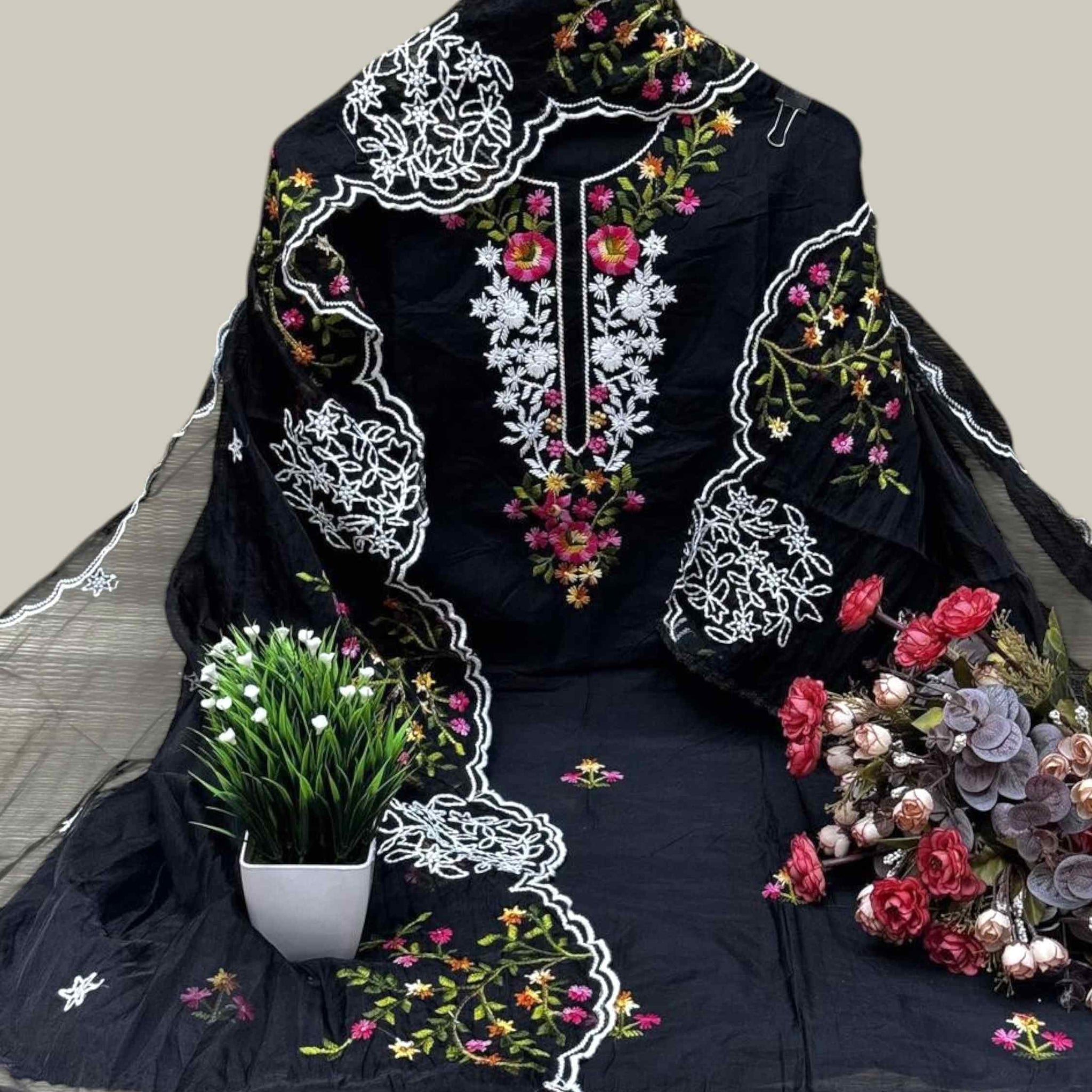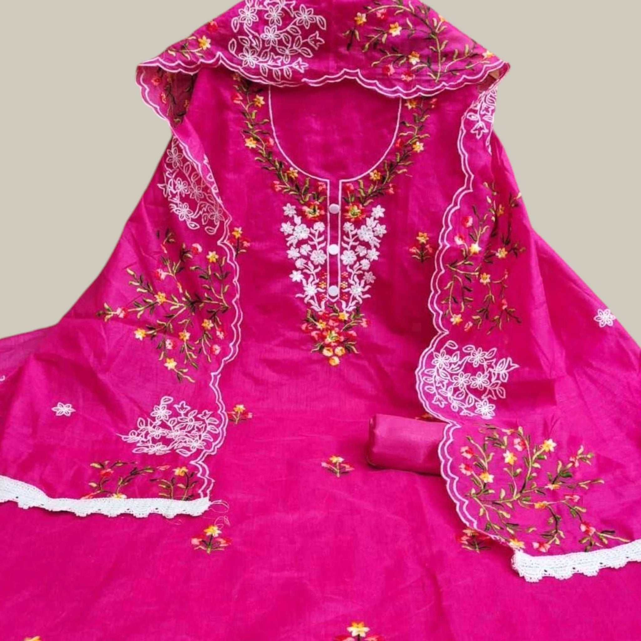 This Chanderi Dress Material has colourful thread work floral embroidery on kurta and dupatta. 3pc. kurta set | unstitched kurta set | Wedding, Festival, Party