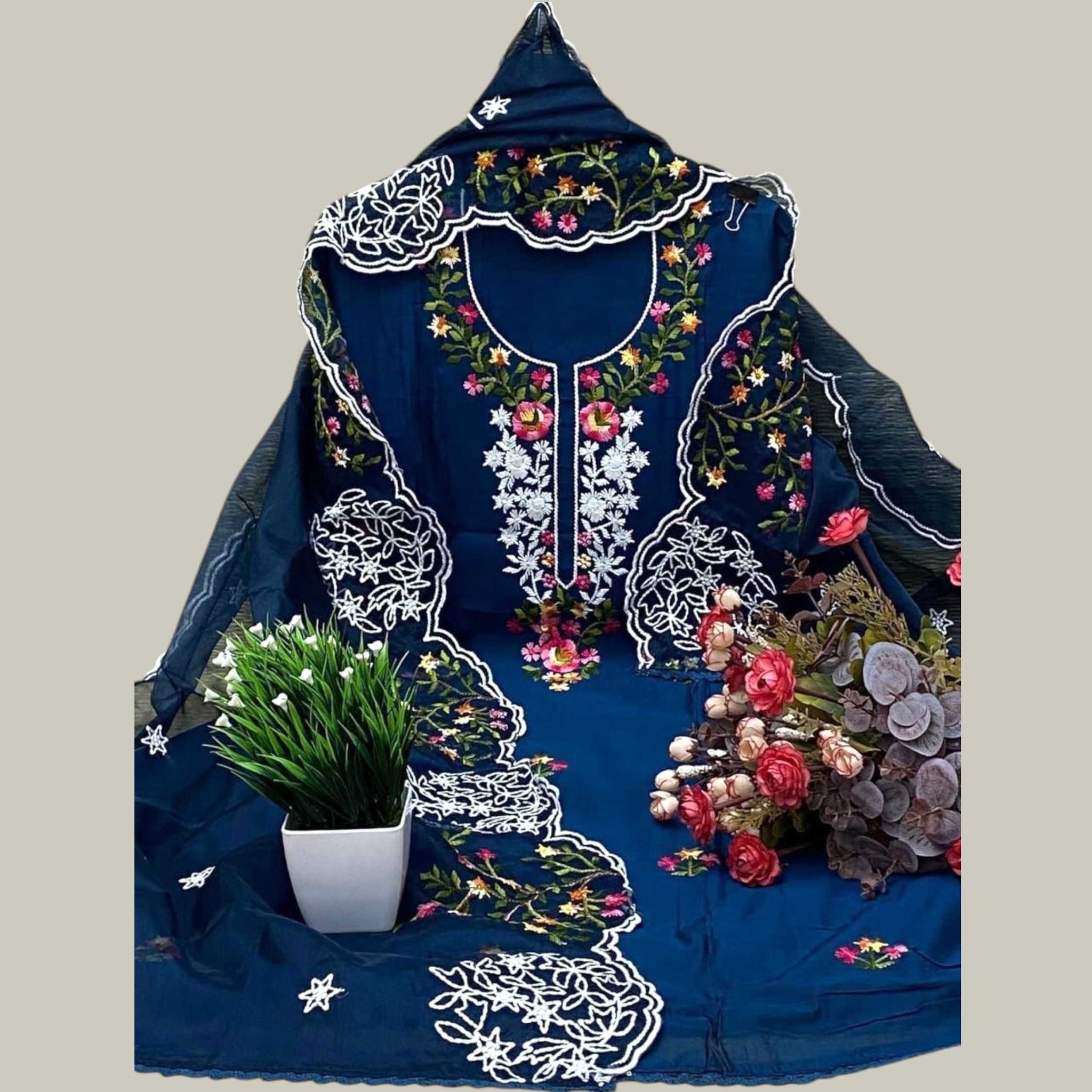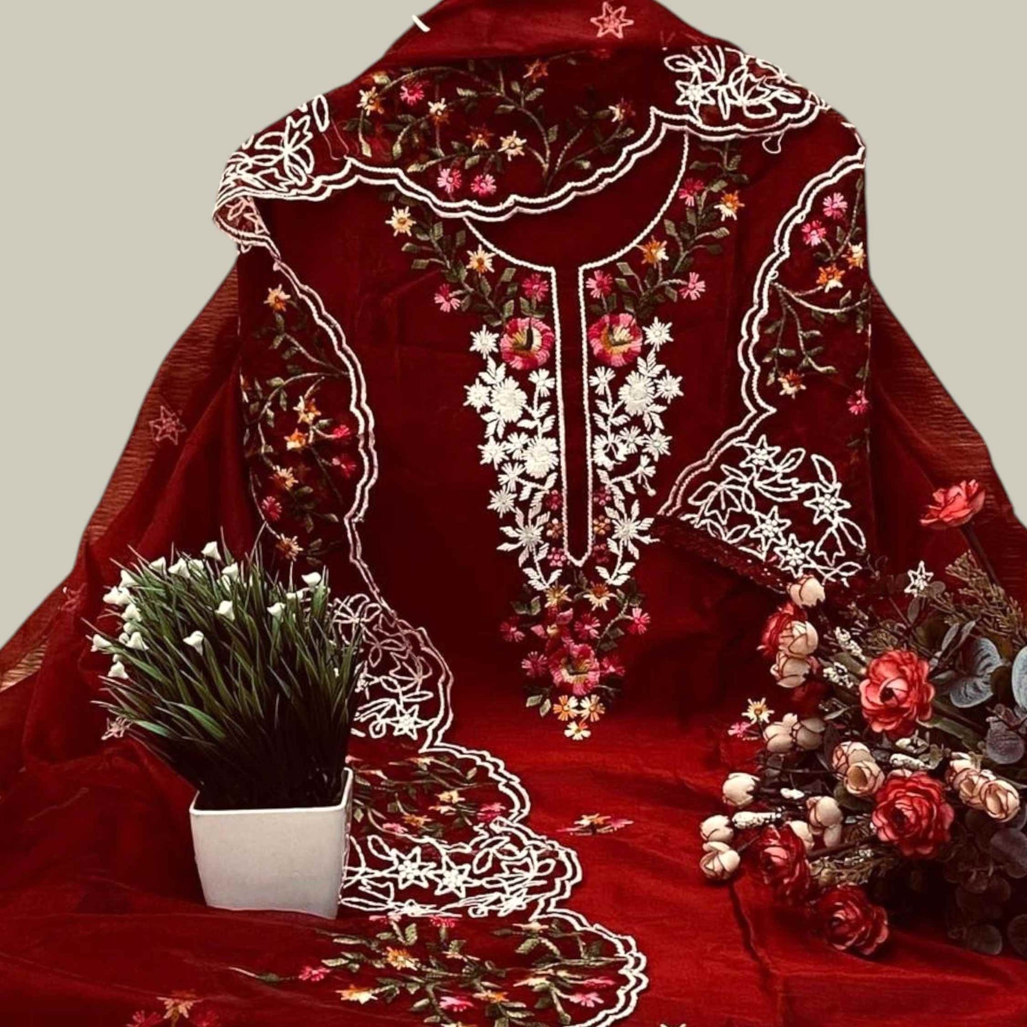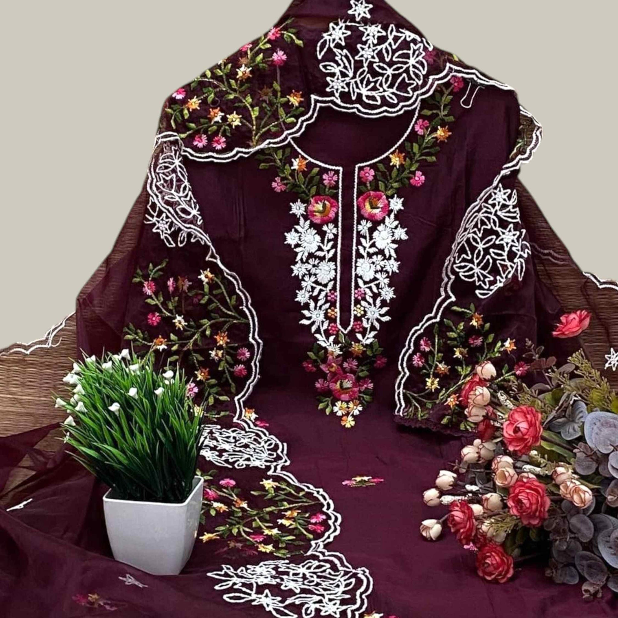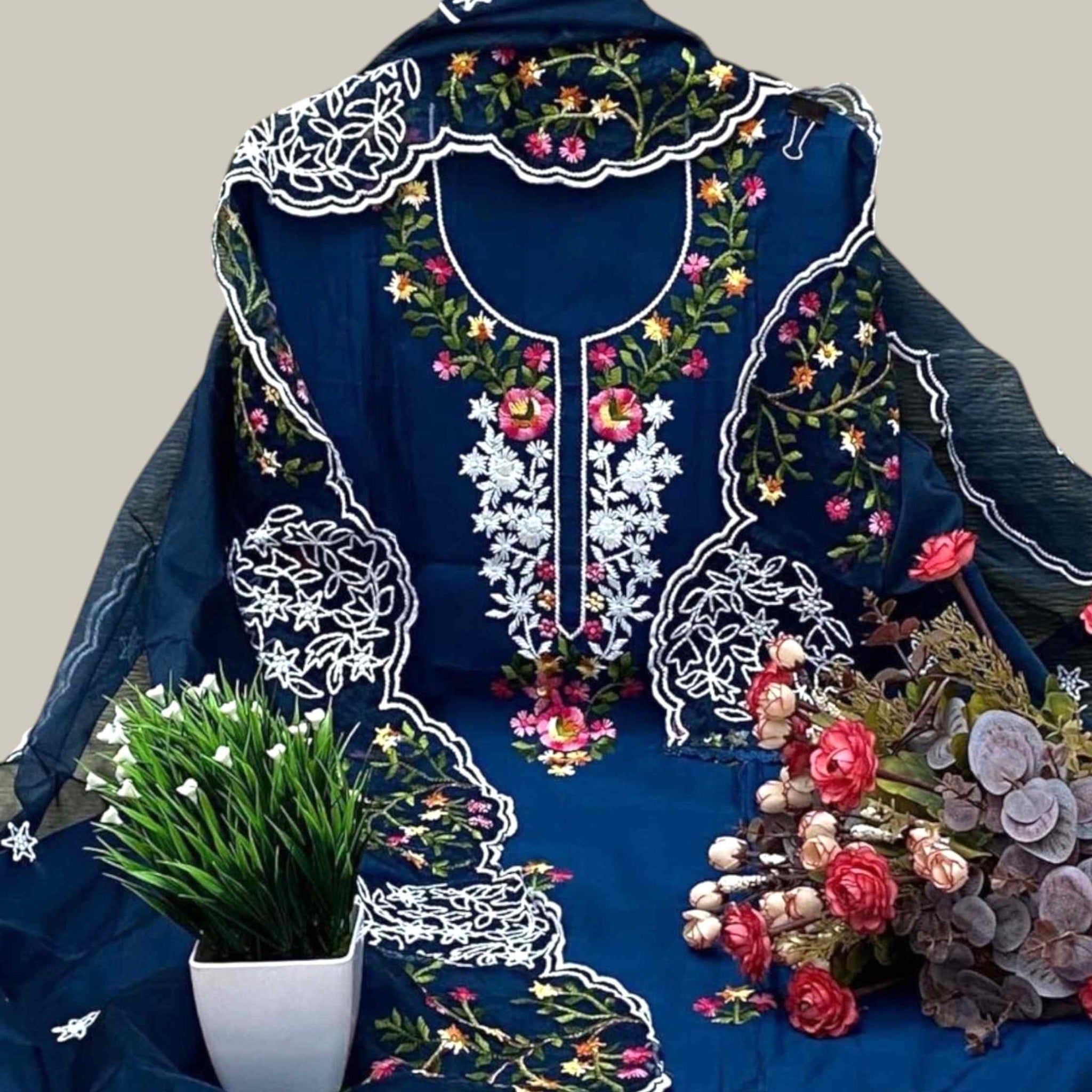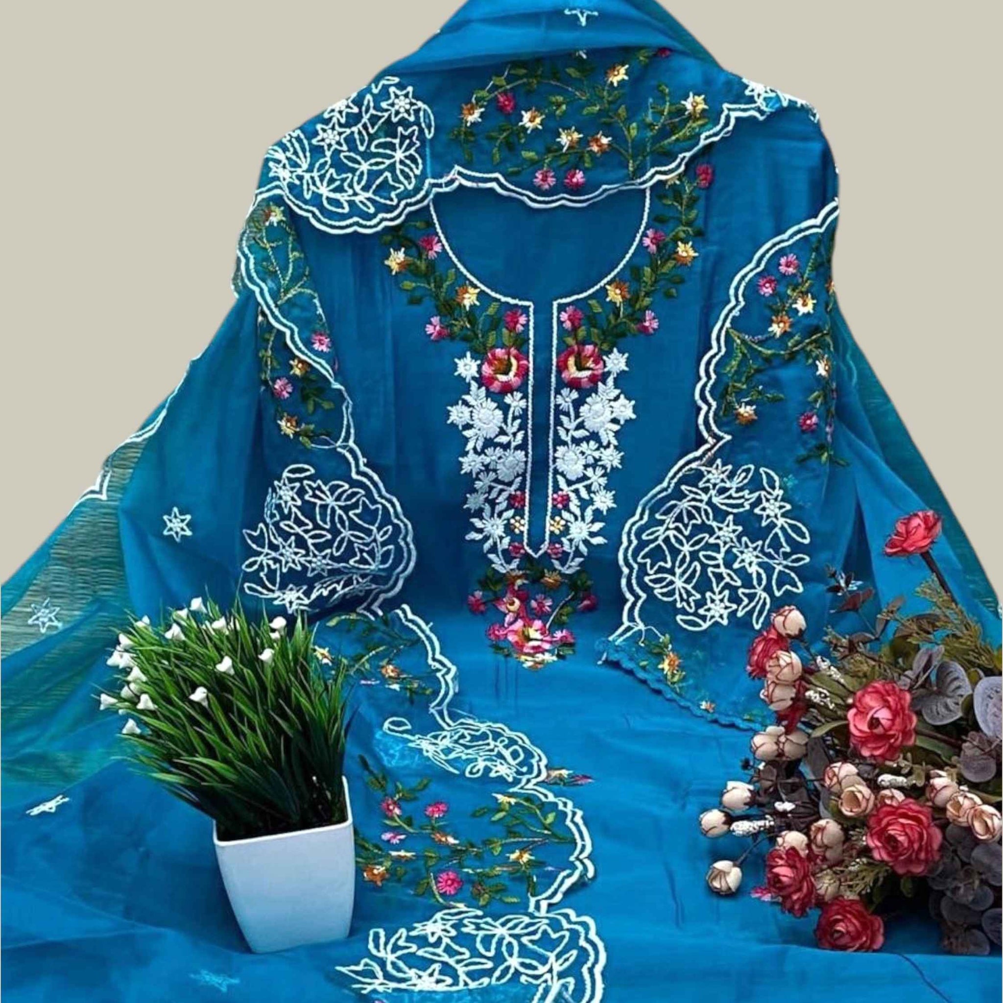 This Chanderi Dress Material has colourful thread work floral embroidery on kurta and dupatta. 3pc. kurta set | unstitched kurta set | Wedding, Festival, Party