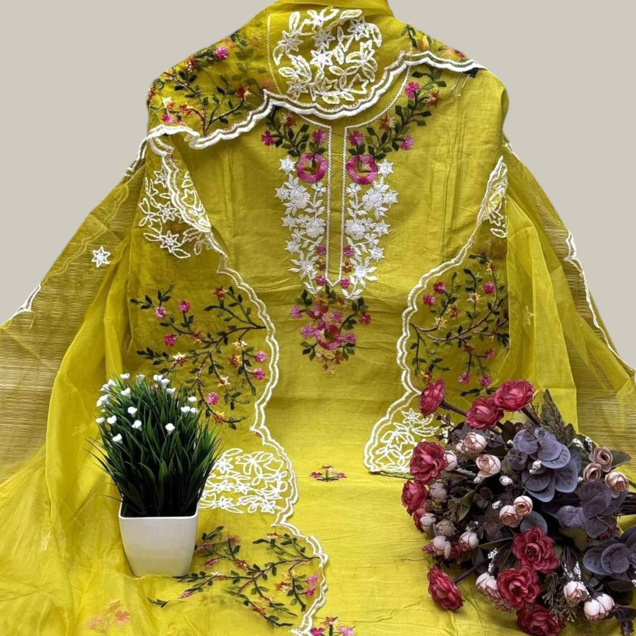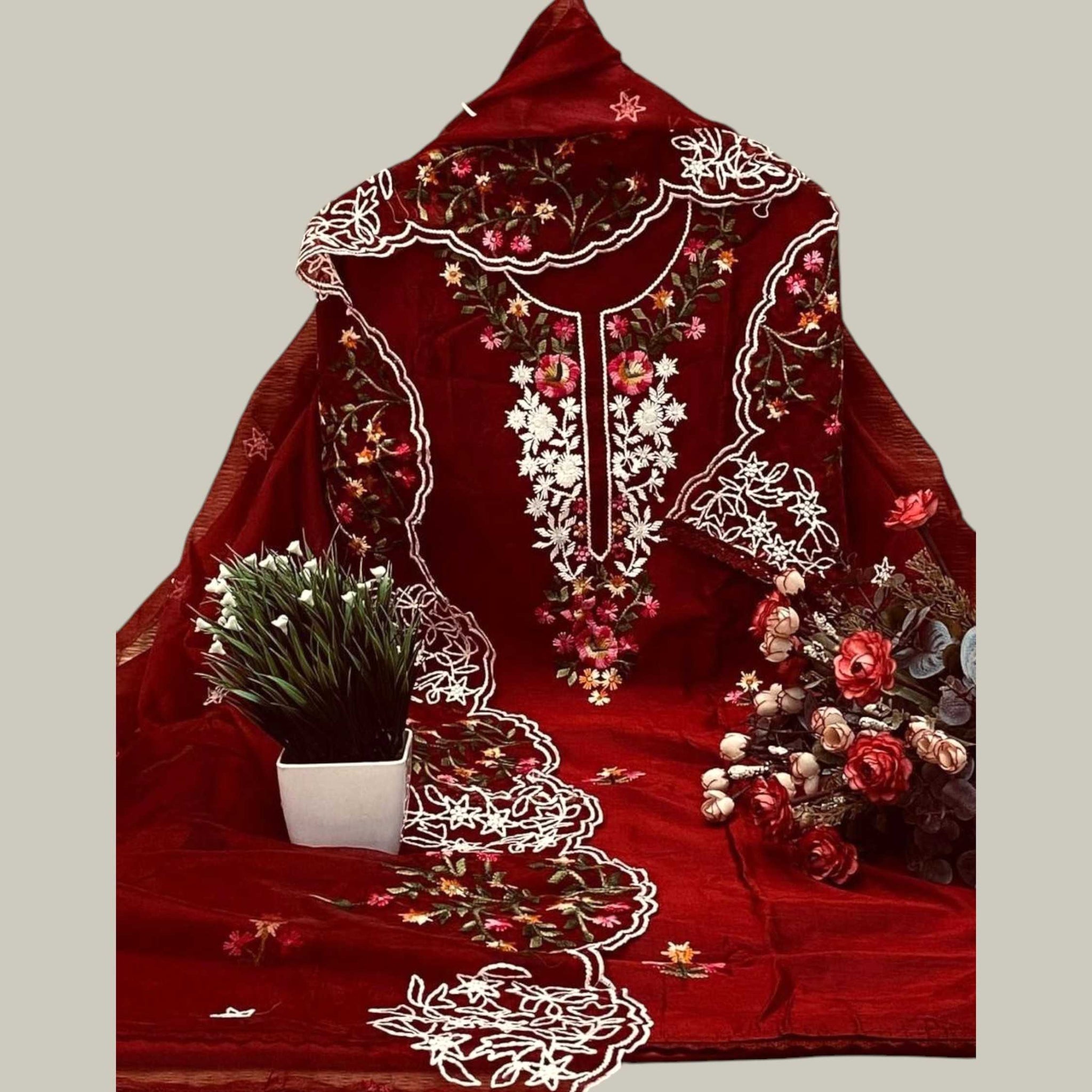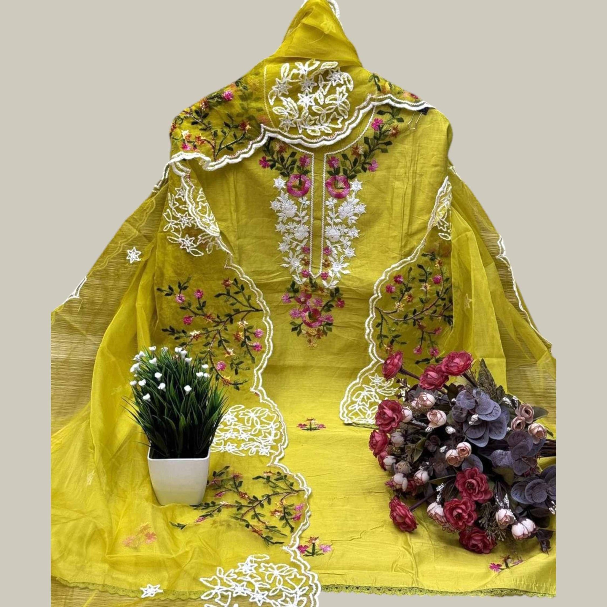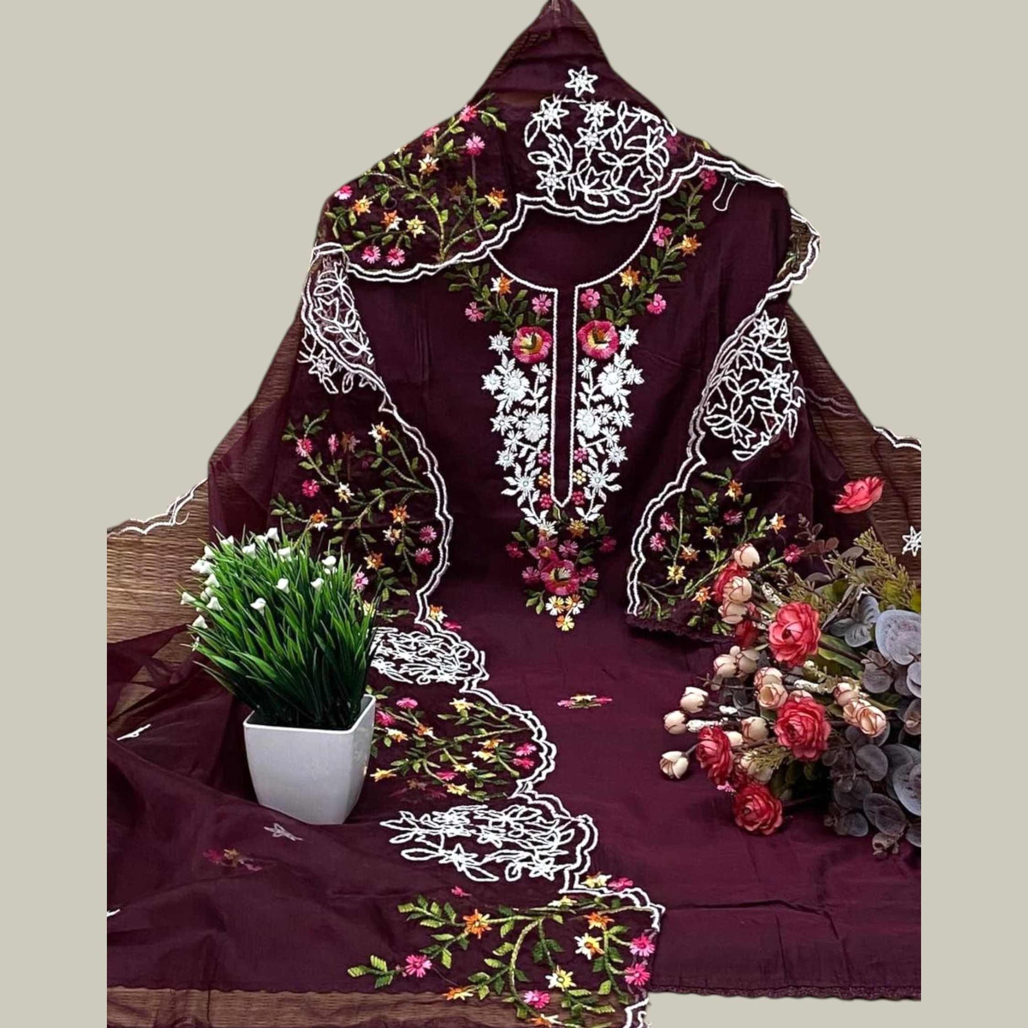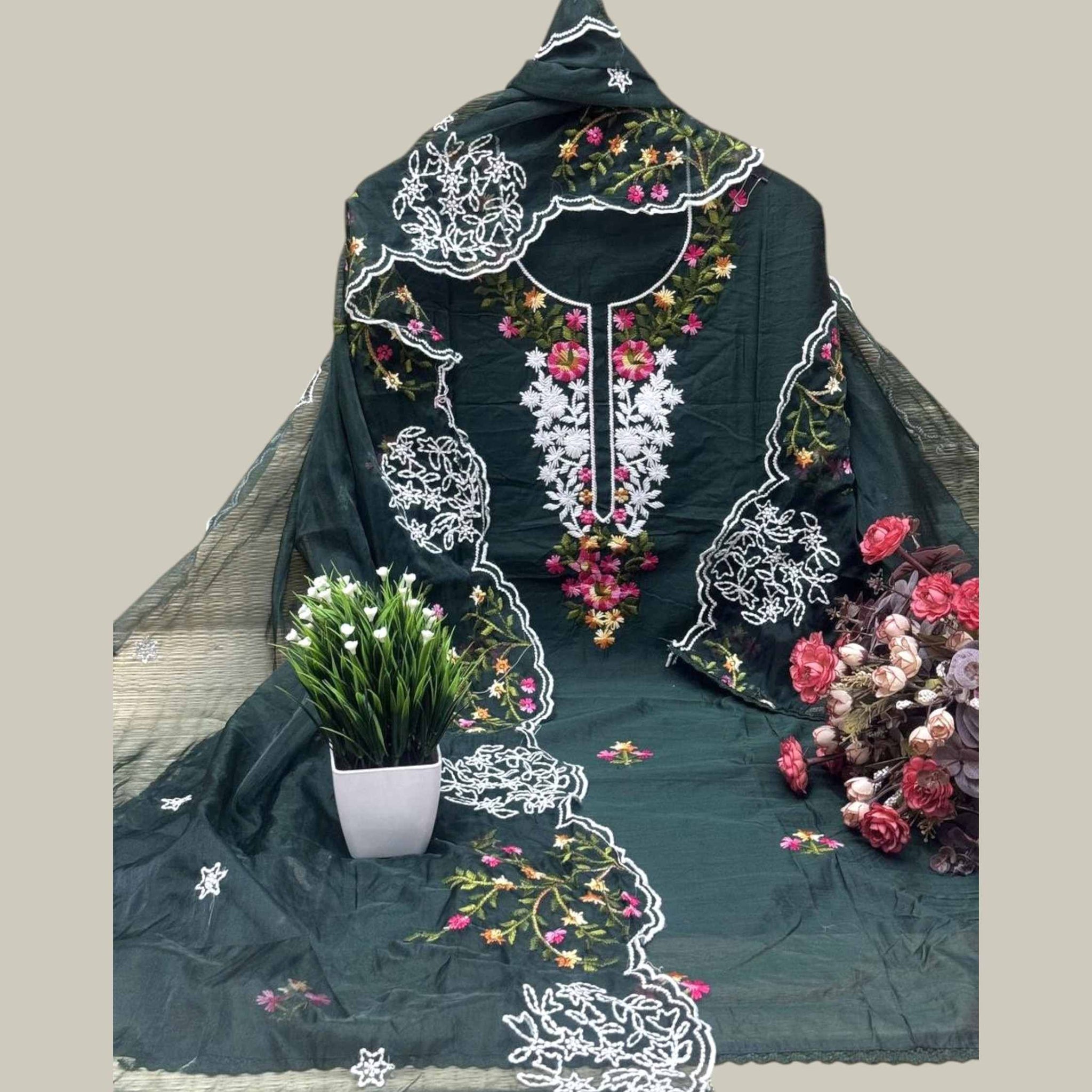 This Chanderi Dress Material has colourful thread work floral embroidery on kurta and dupatta. 3pc. kurta set | unstitched kurta set | Wedding, Festival, Party