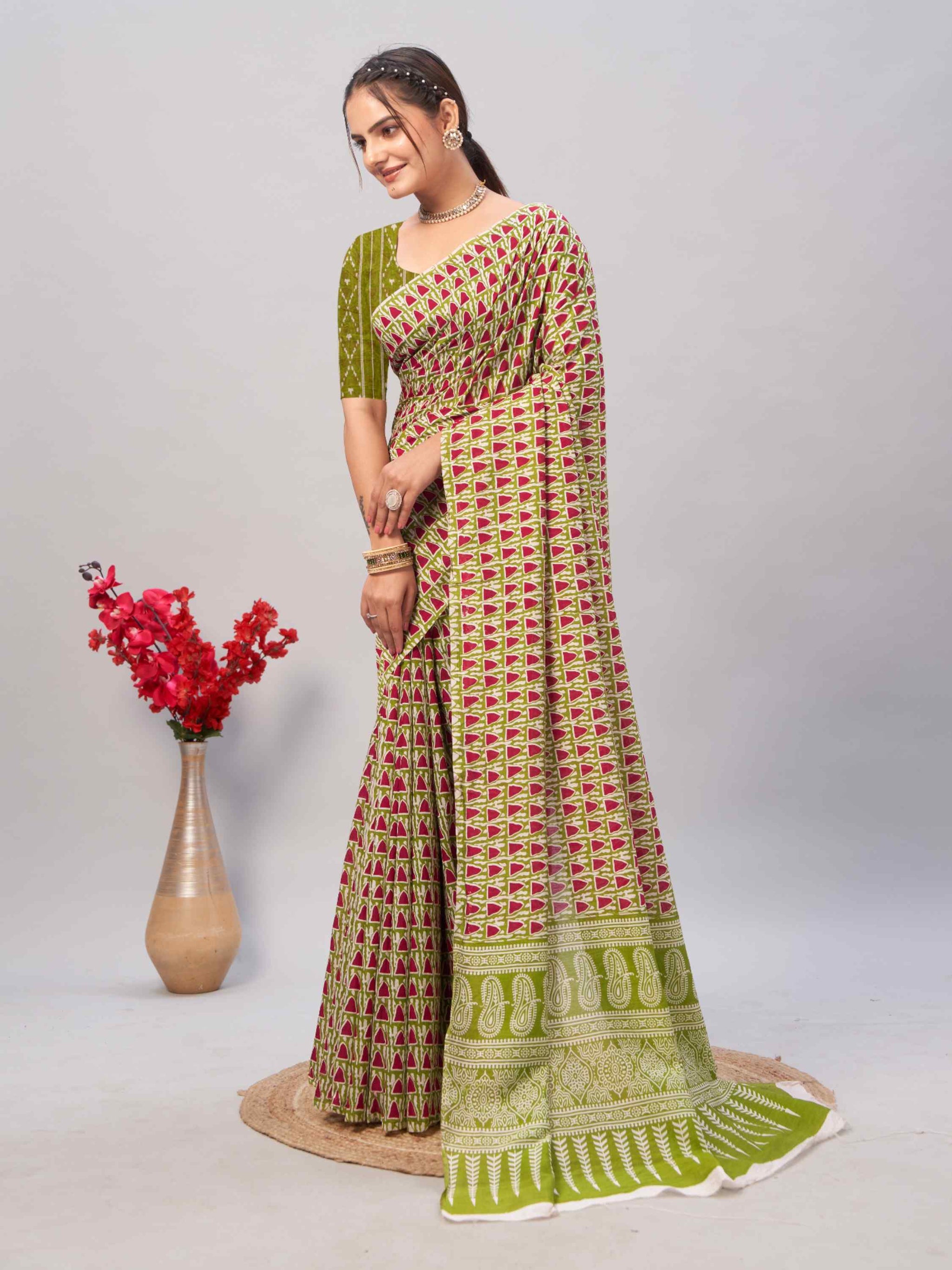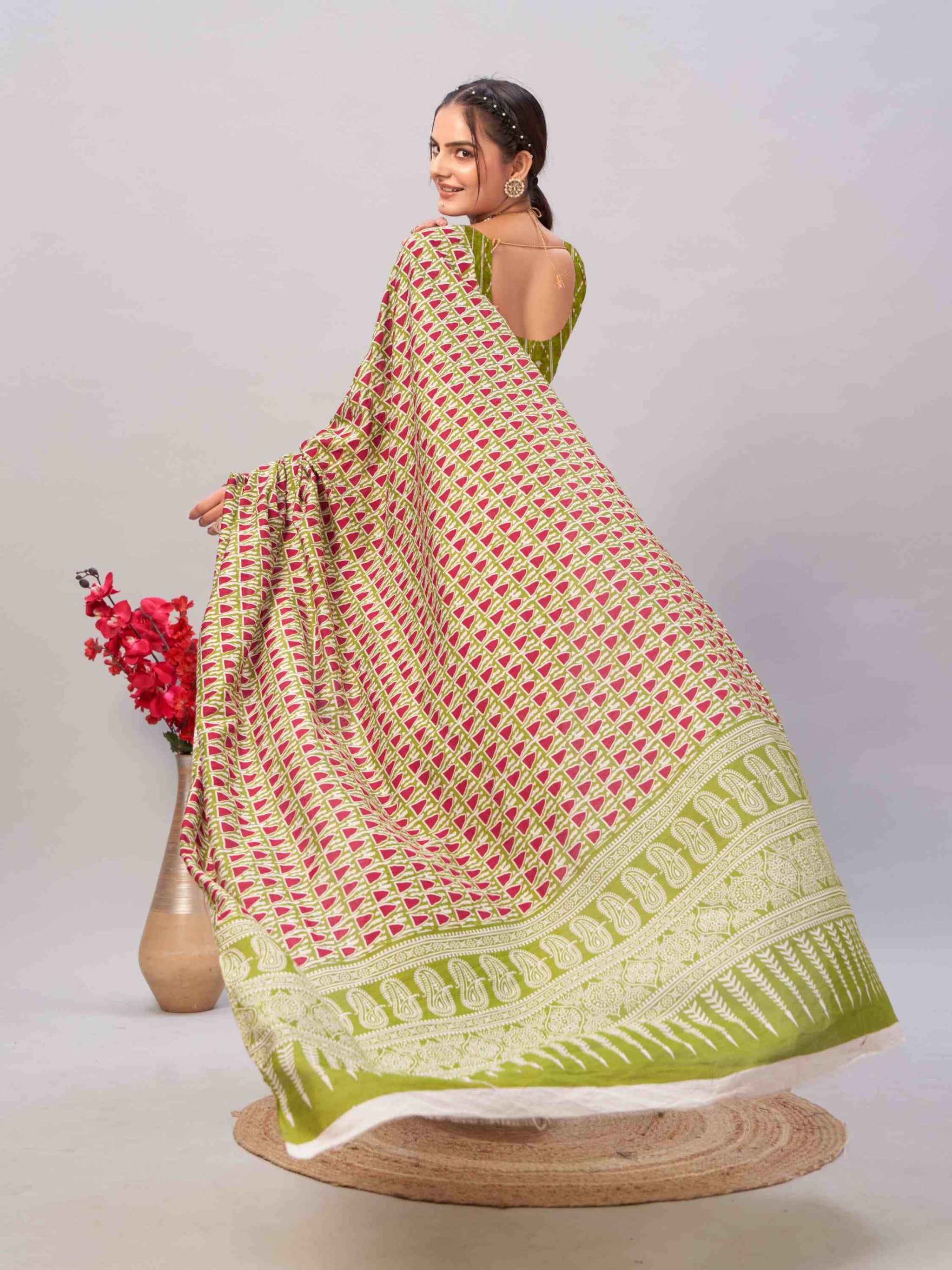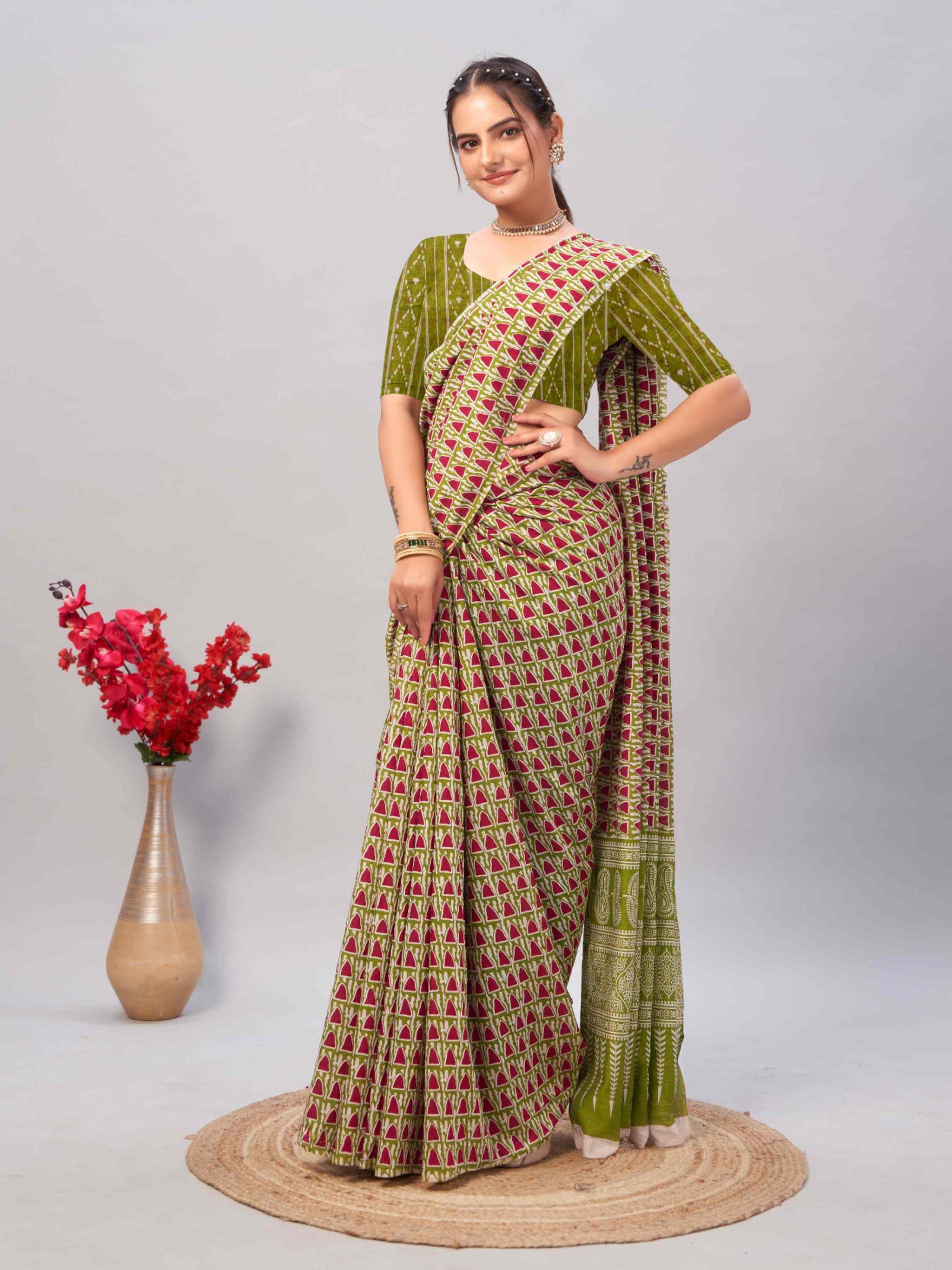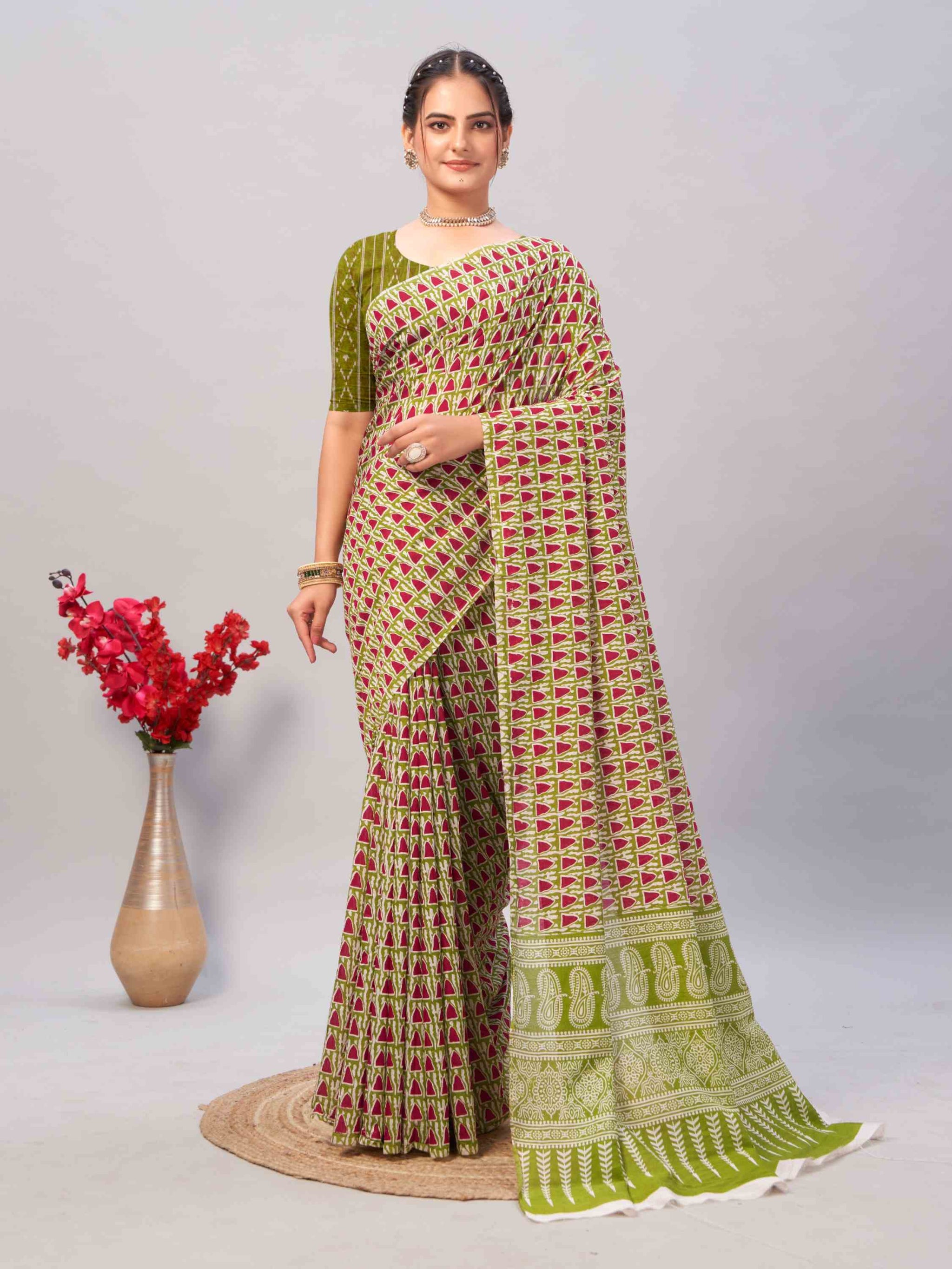 Shine this festival season in Jaipuri Cotton Saree Green, featuring hand block geometric prints, printed border, and blouse piece—ideal for summer occasions!