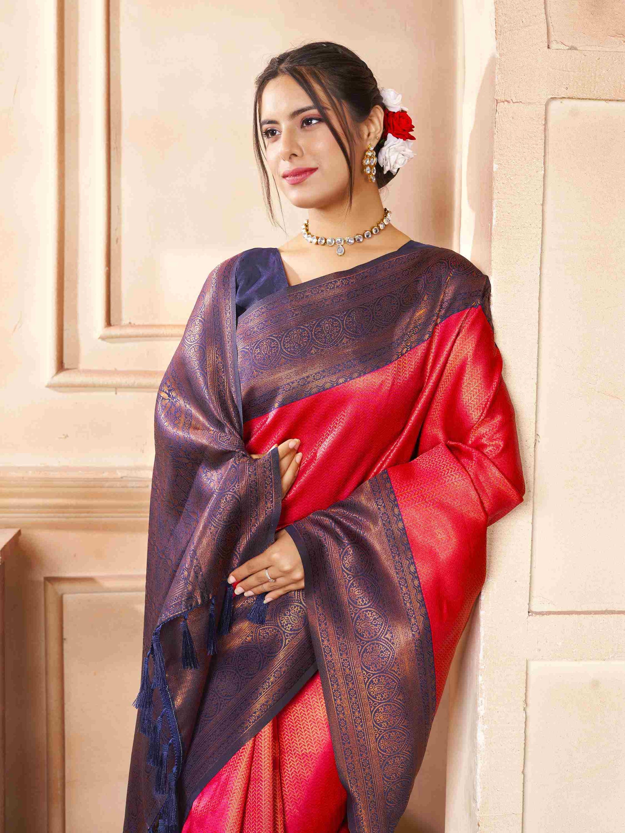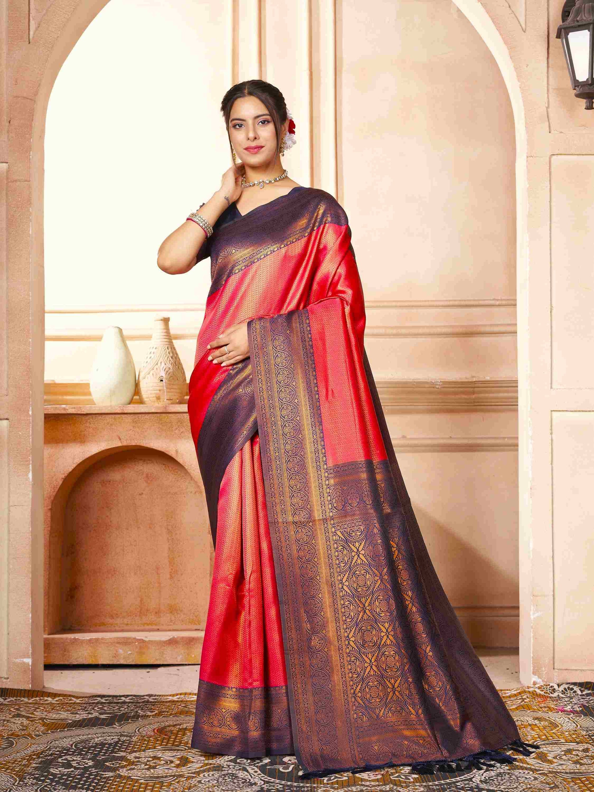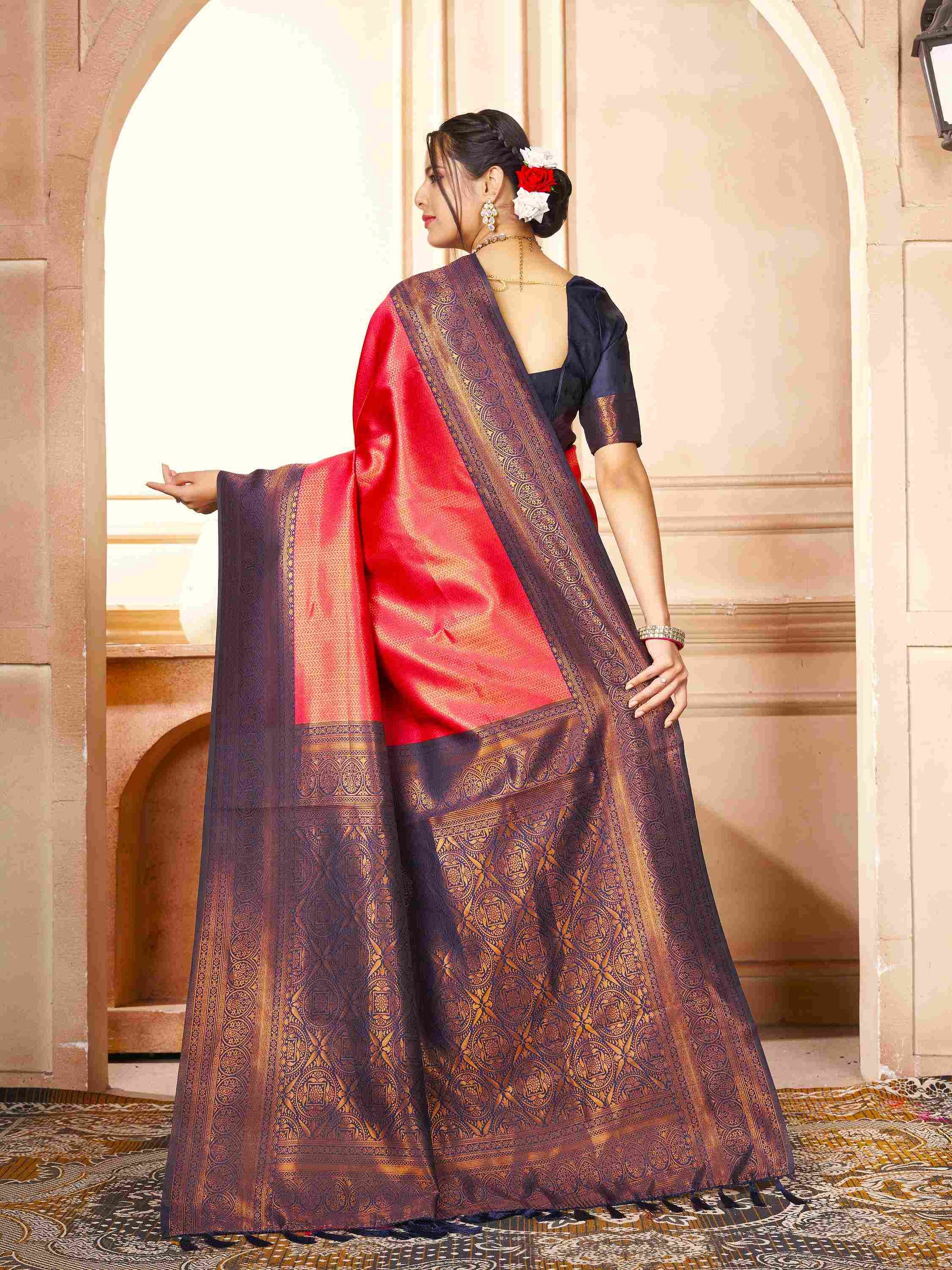 Kanchipuram Silk Saree Brick Red has all-over zari work comes navy blue border pallu, blouse piece. Premium Kanjivaram silk saree can wear in weddings/ parties.