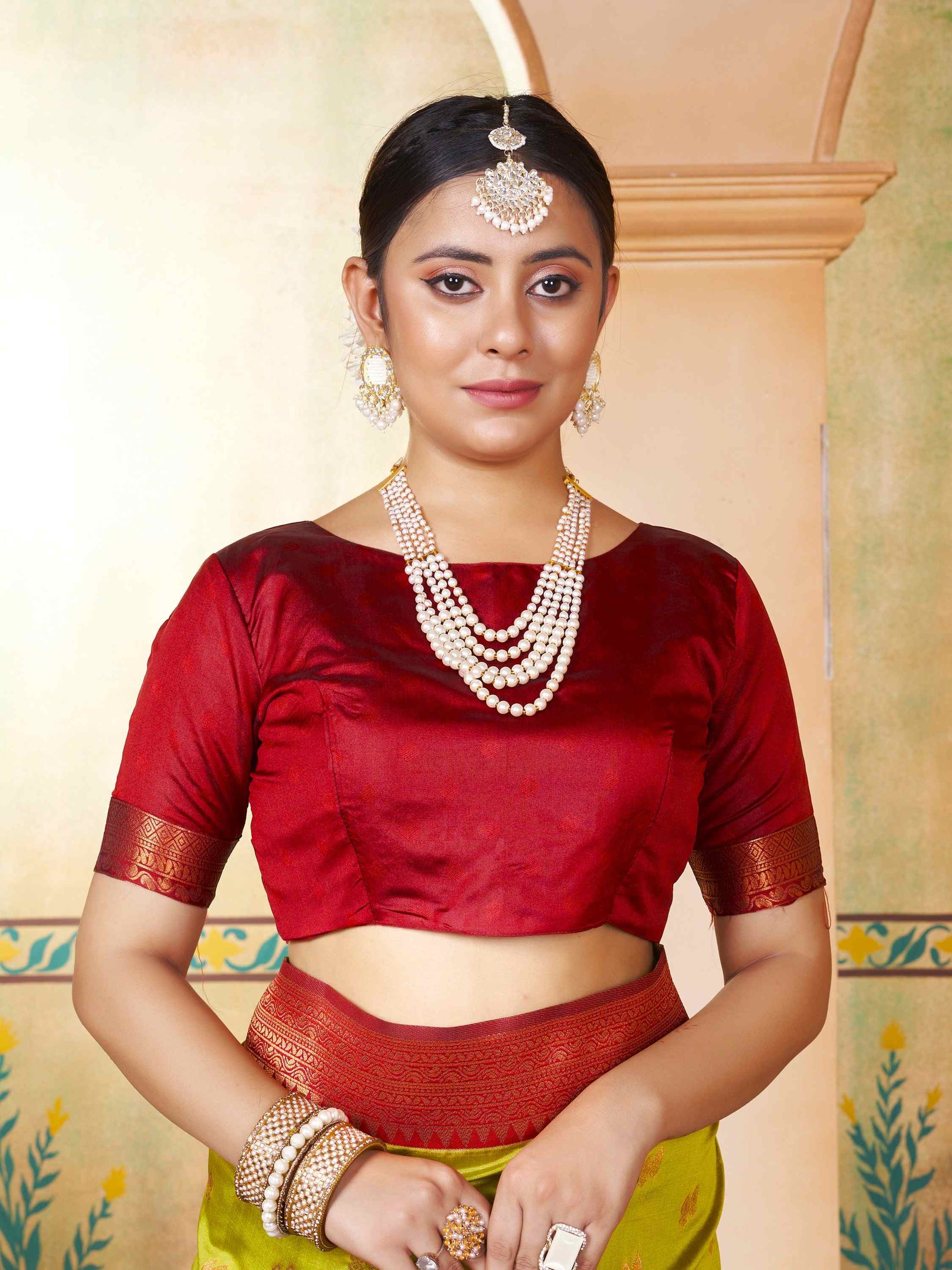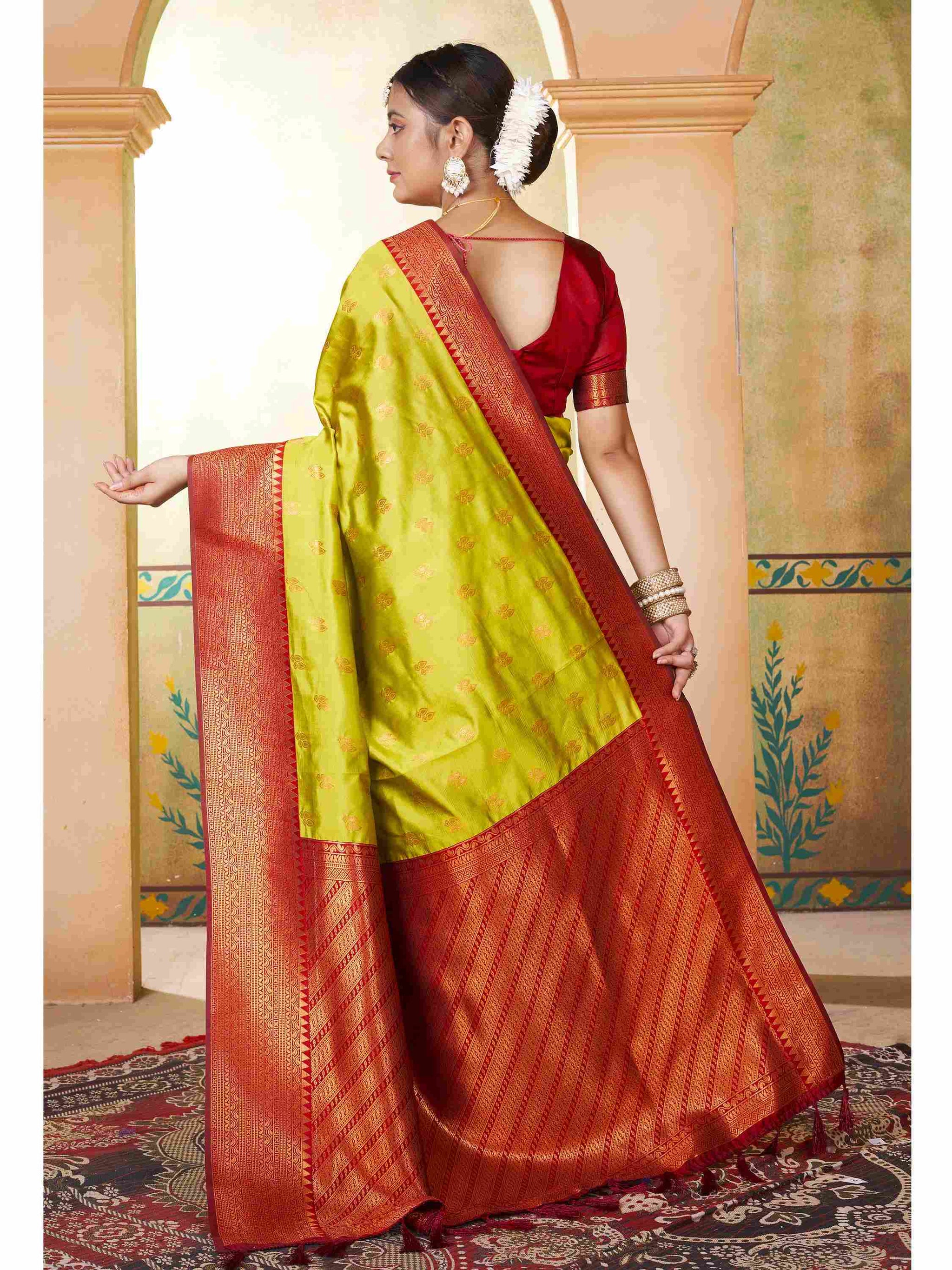 Kanjivaram /Kanchipuram Silk Saree Parrot Green comes with maroon blouse piece, border and pallu. Saree has zari border and all-over beautiful ethnic motifs.