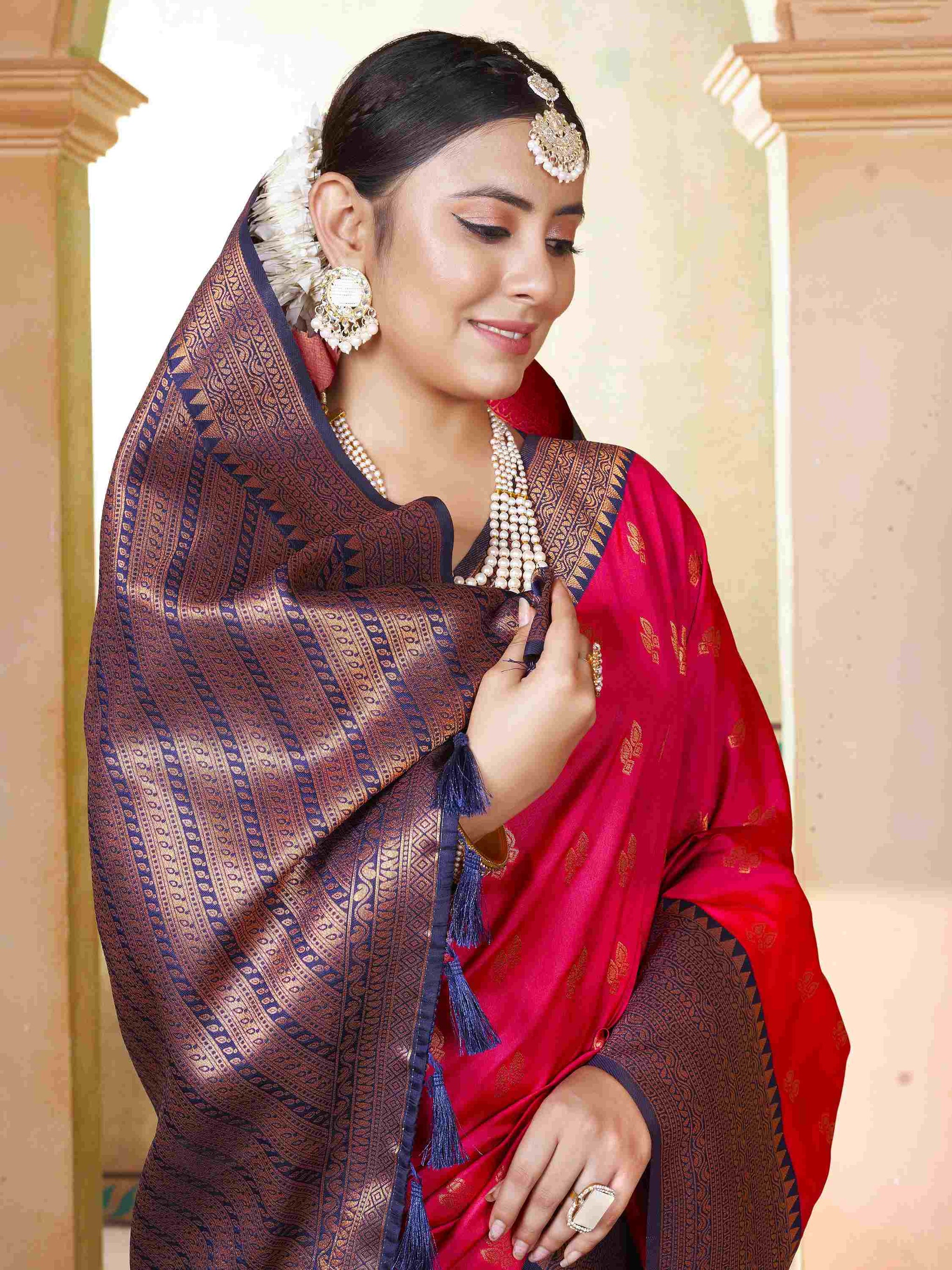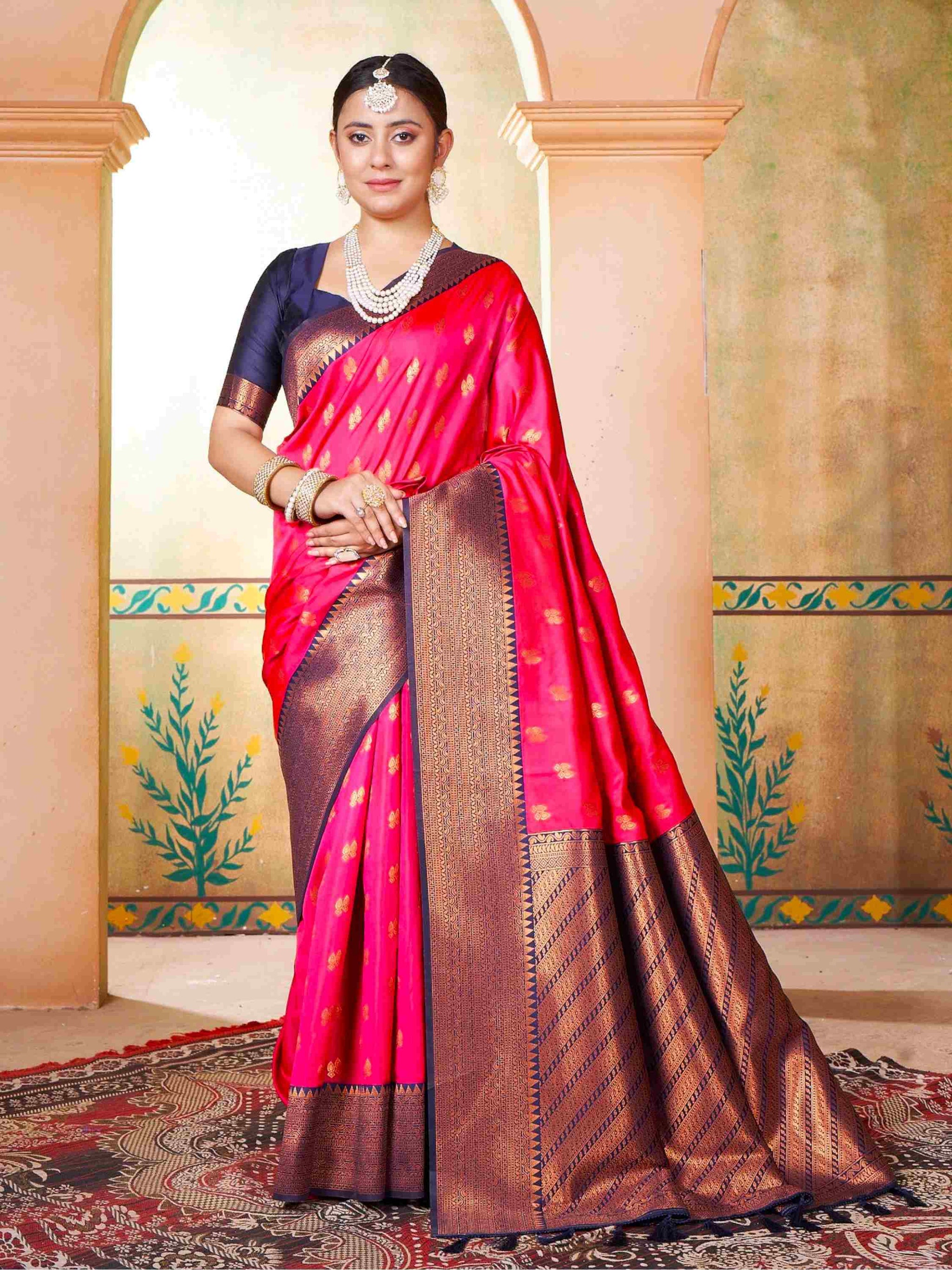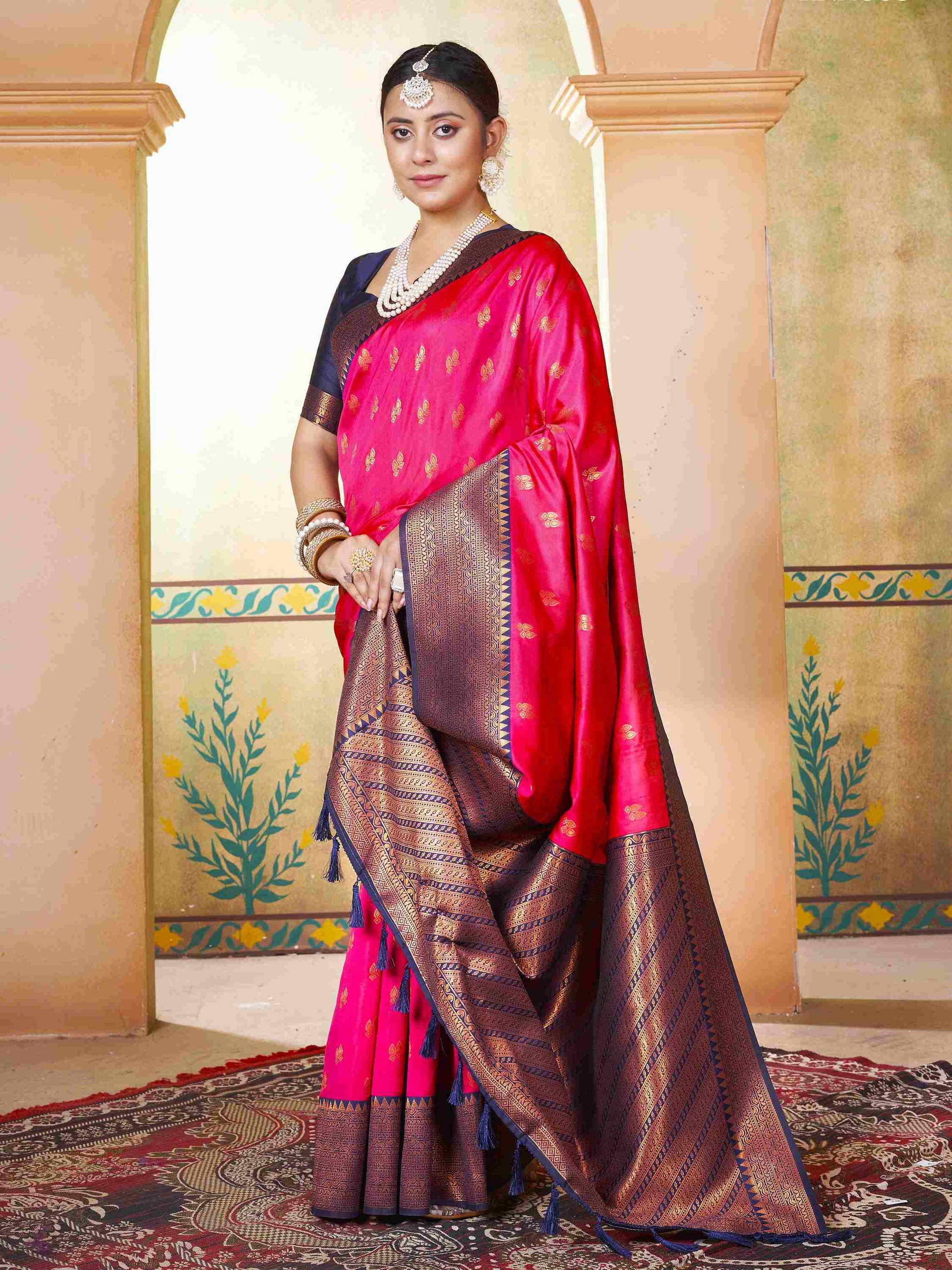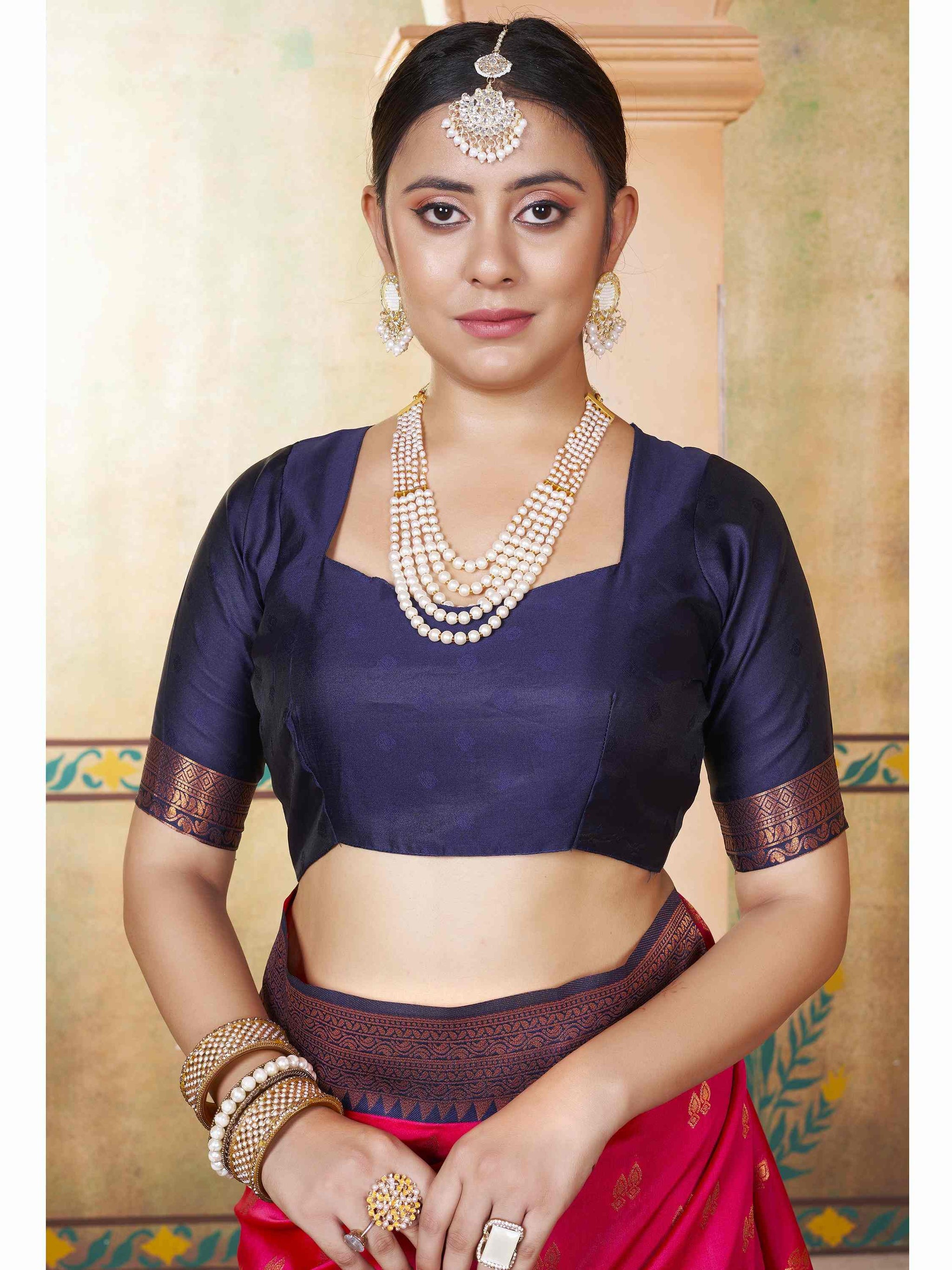 Kanjivaram /Kanchipuram Silk Saree Pink comes with navy blue blouse piece, border and pallu. Saree has zari border and all-over beautiful ethnic motifs.