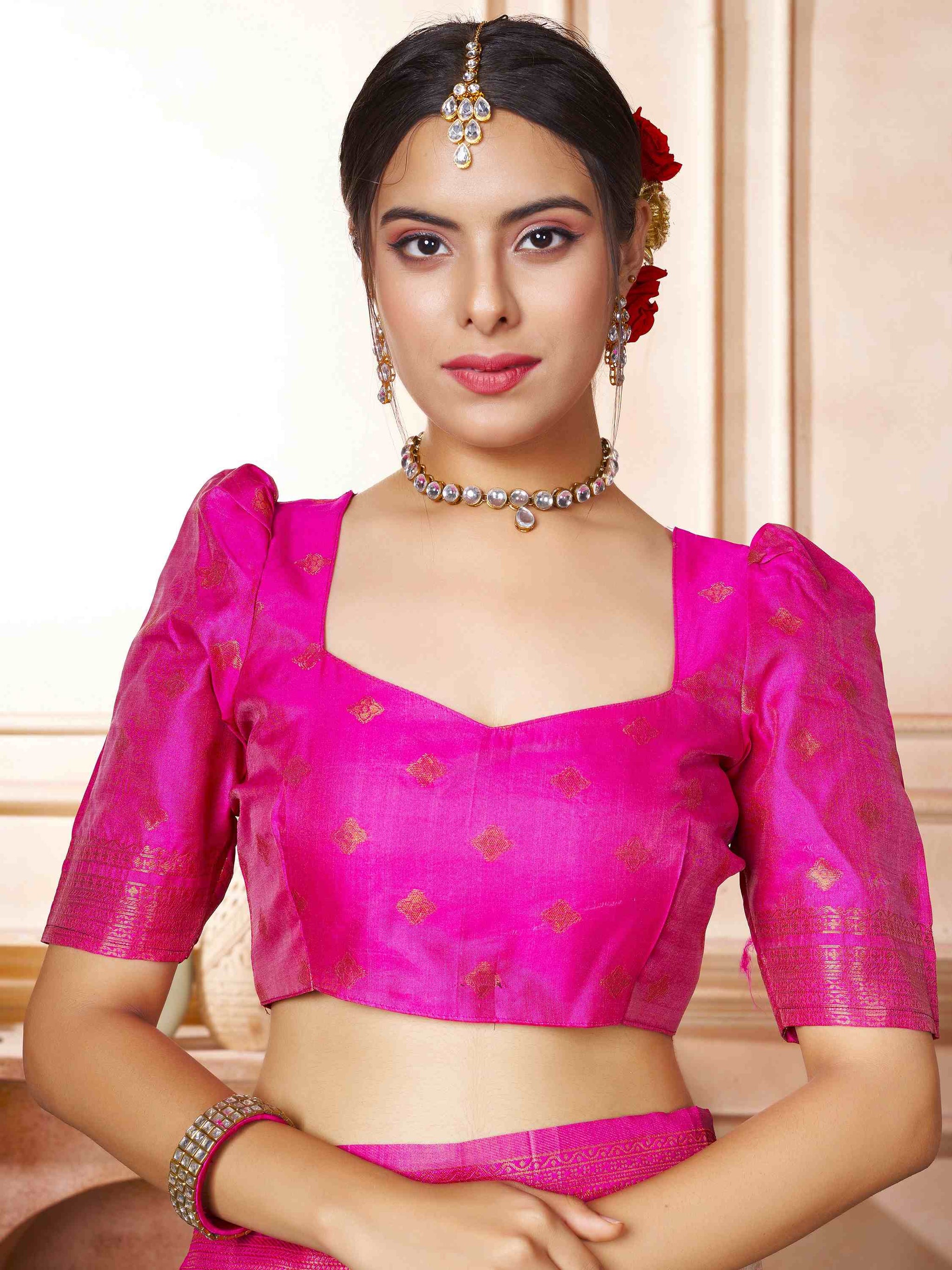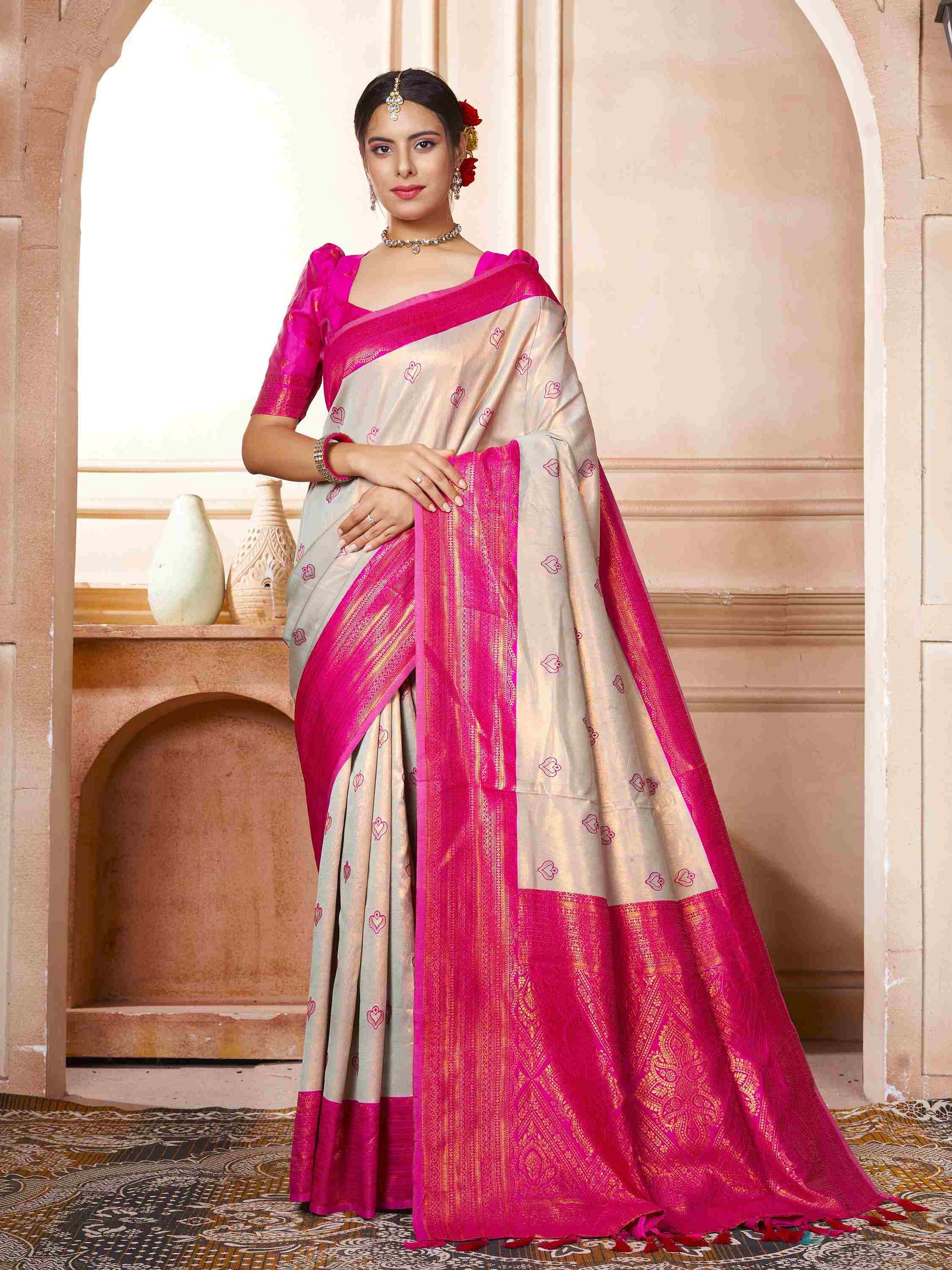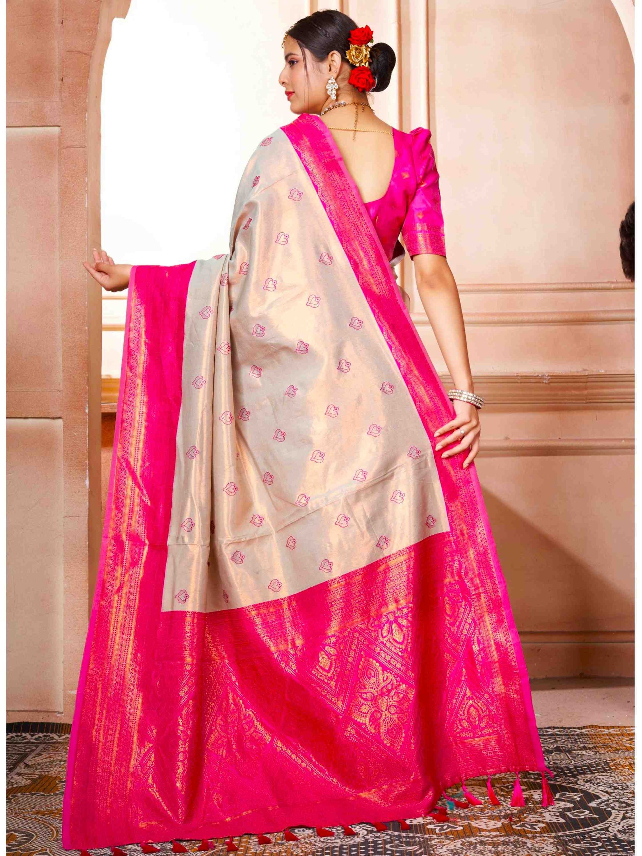 Kanjivaram Saree Cream has all-over zari work, which comes with pink border, pallu and blouse piece. Premium Kanchipuram silk saree can be worn in weddings.