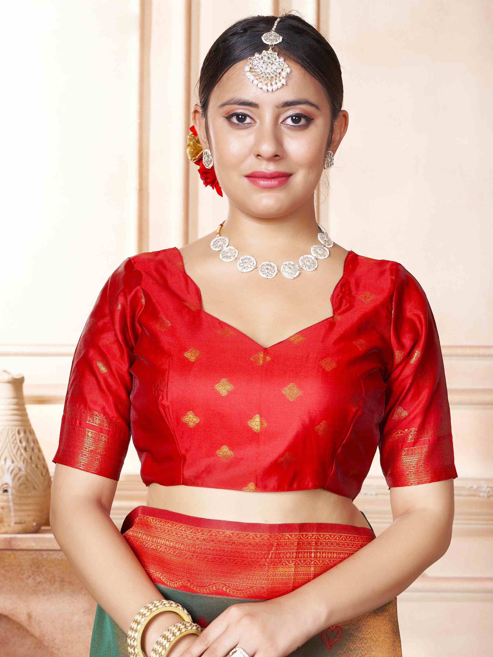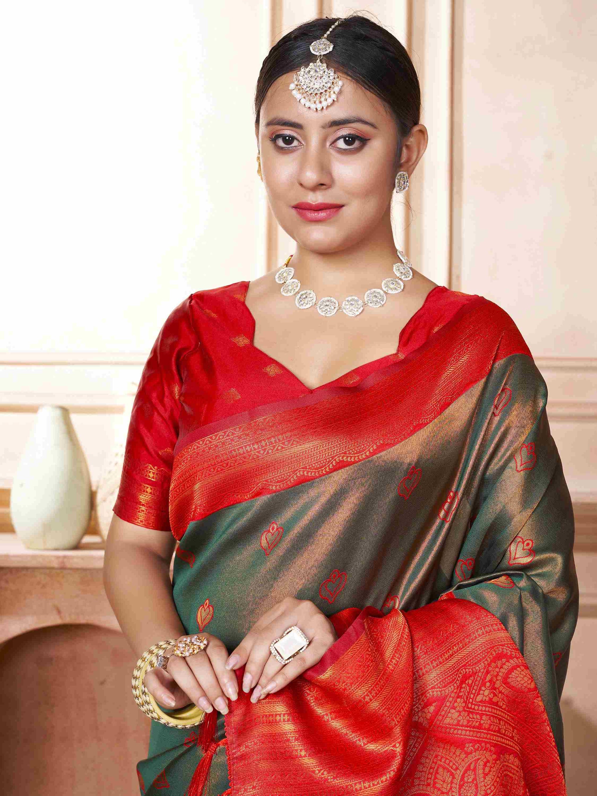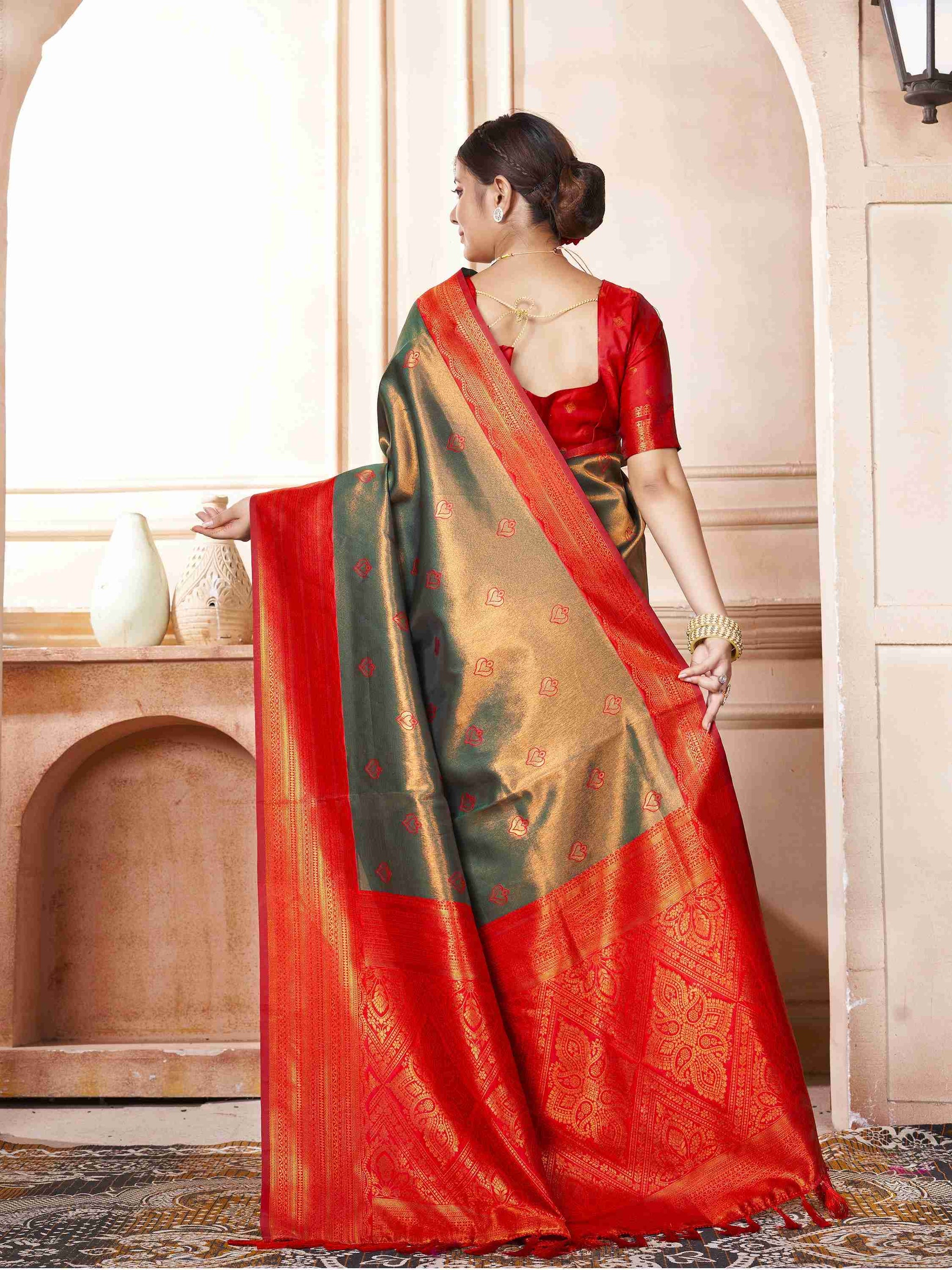 Kanjivaram Saree Green has all-over zari work, which comes with red border, pallu and blouse piece. Premium Kanchipuram silk saree can be worn in weddings.