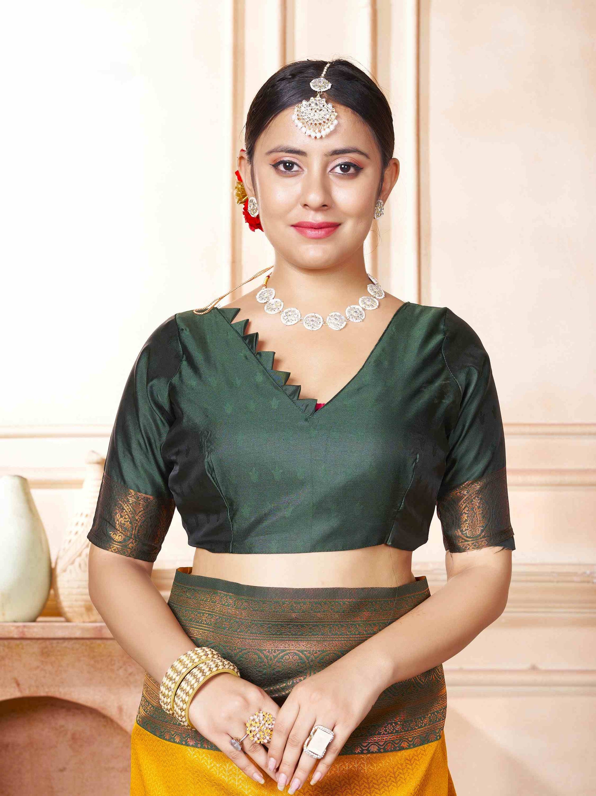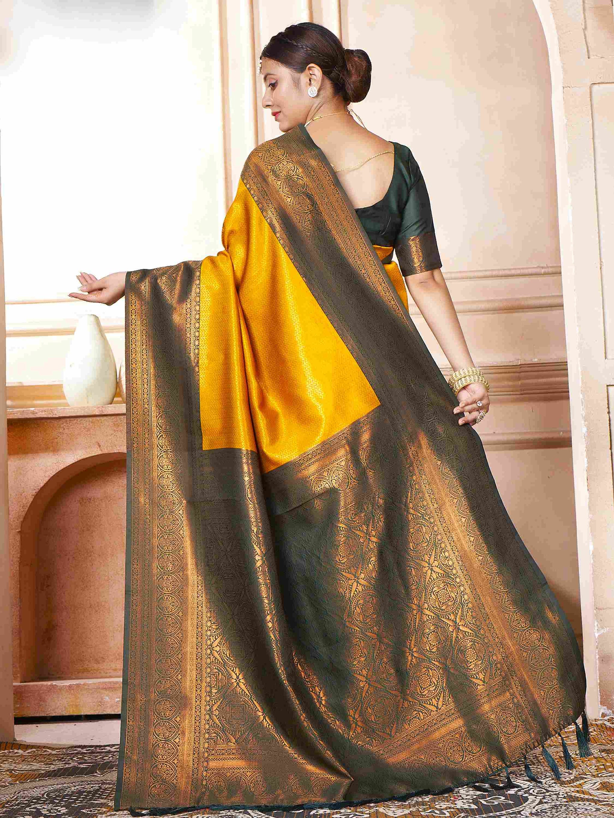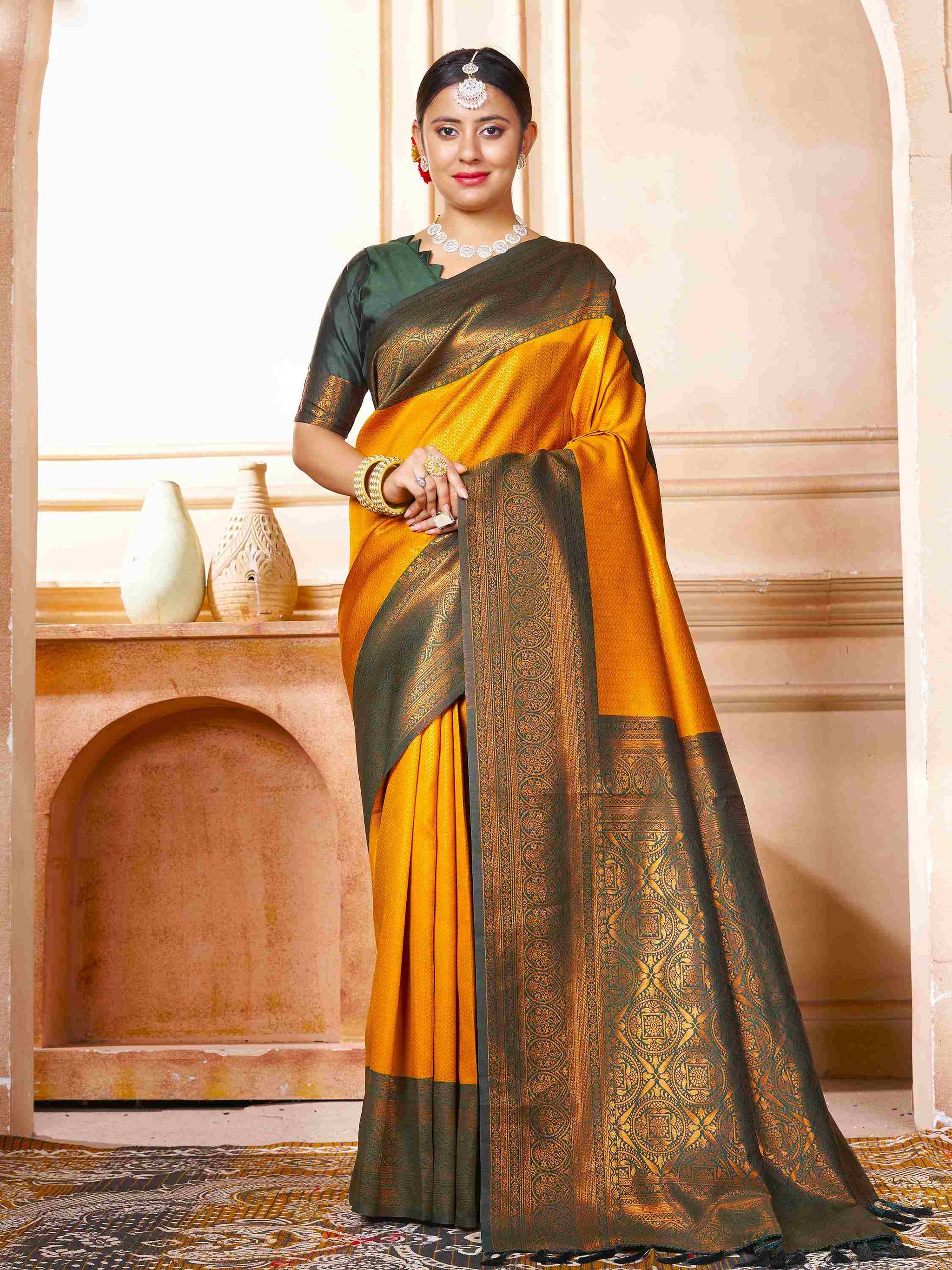 Kanjivaram Saree Mustard has all-over zari work comes with green border, pallu, and blouse piece. Premium Kanchipuram silk saree can wear in weddings/ parties.