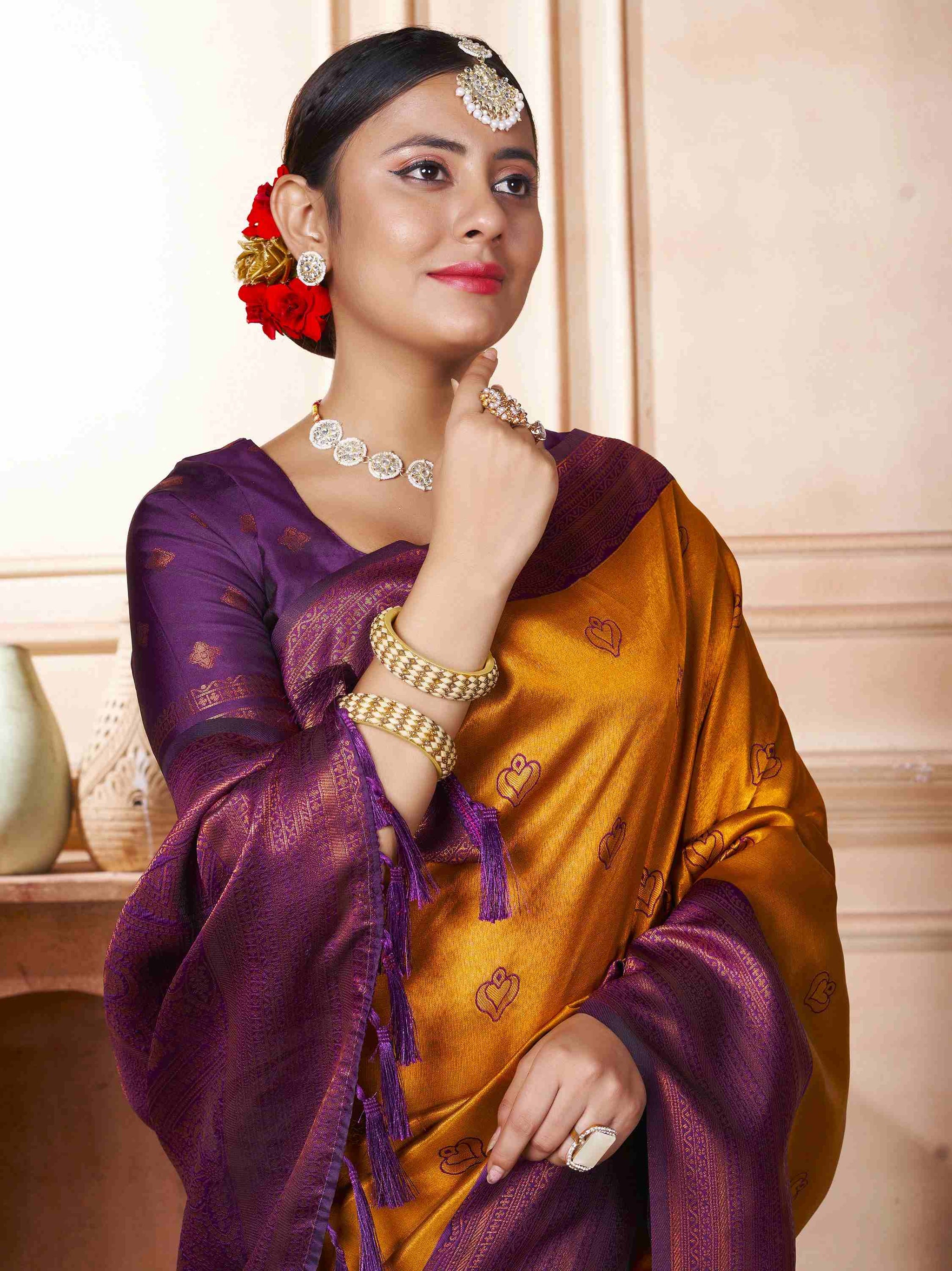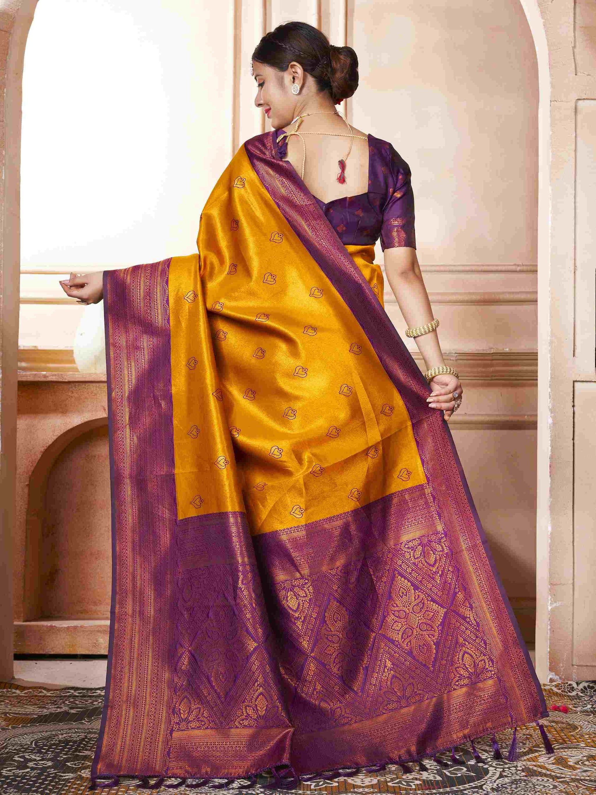 Kanjivaram Saree Mustard has all-over zari work, which comes with purple border, pallu and blouse piece. Premium Kanchipuram silk saree can be worn in weddings.