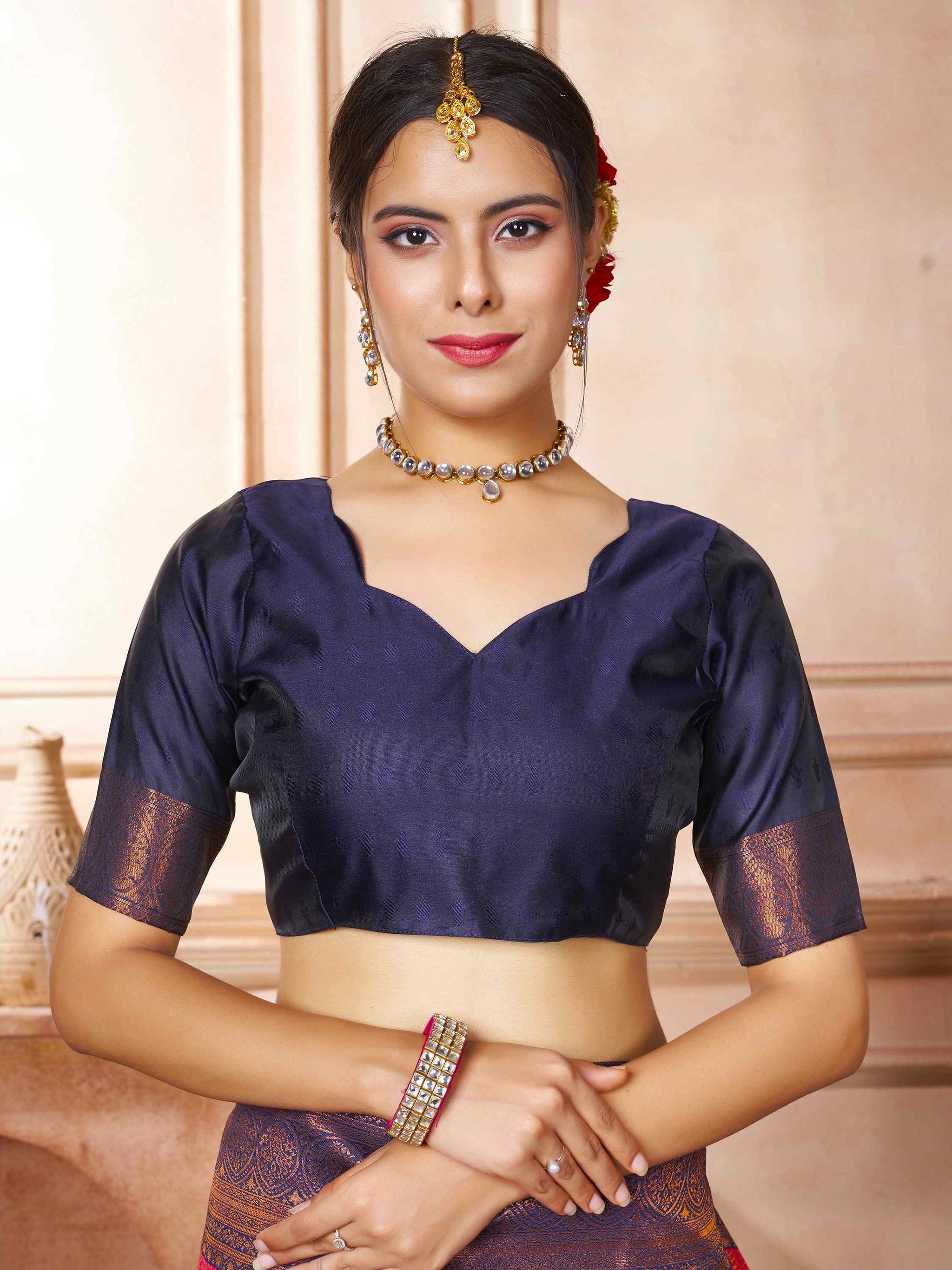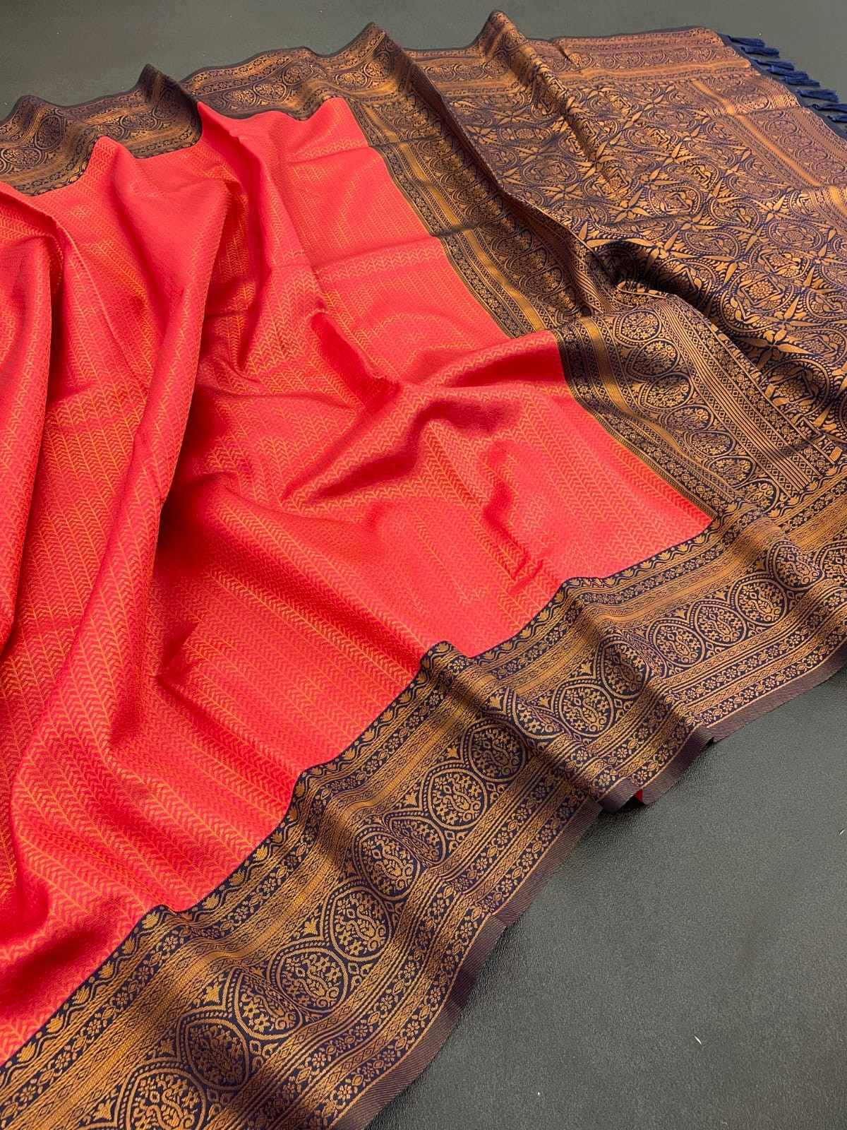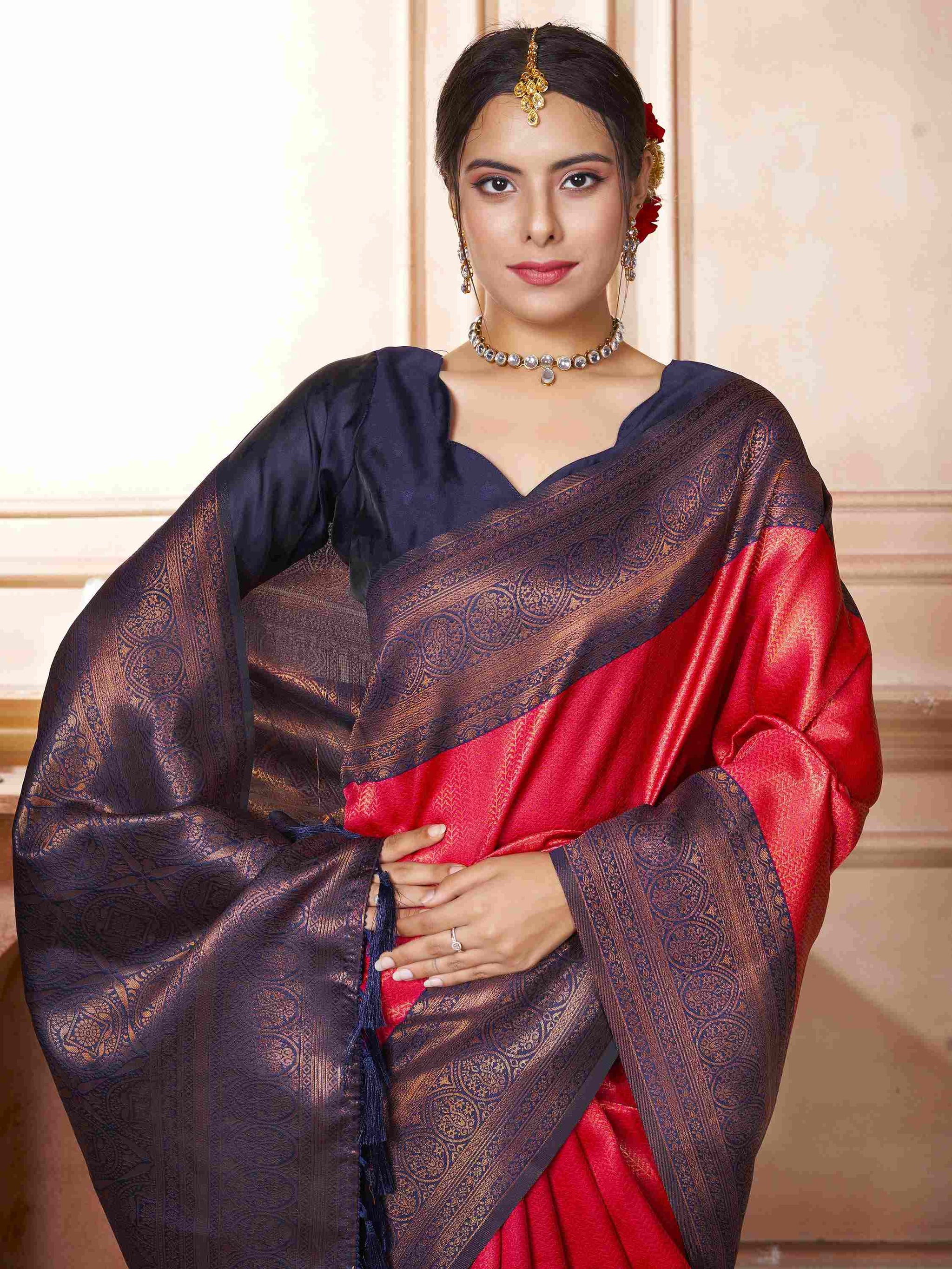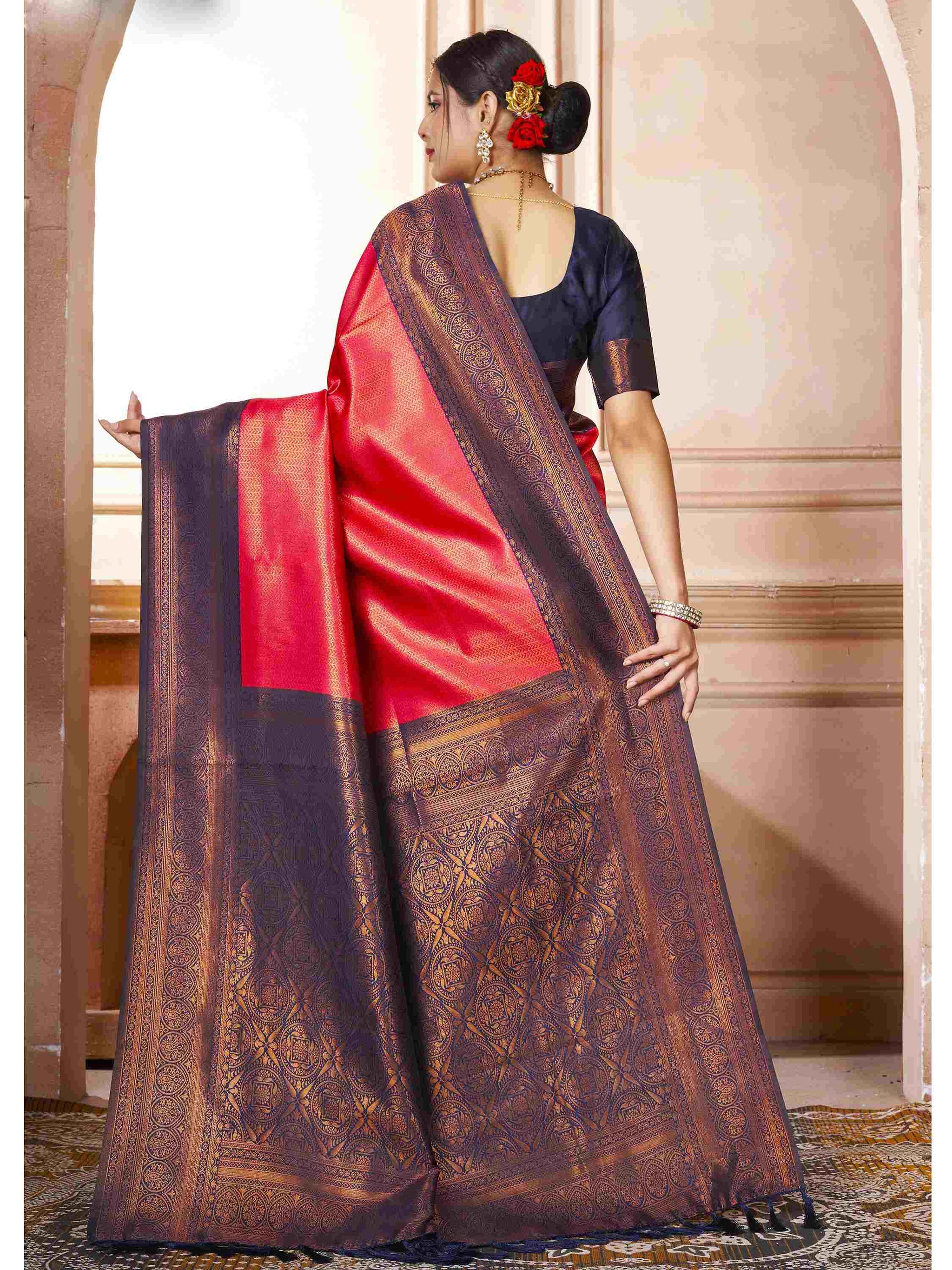 Kanjivaram Saree Red has all-over zari work comes with navy blue border, pallu, and blouse piece. Premium Kanchipuram silk saree can wear in weddings/ parties.