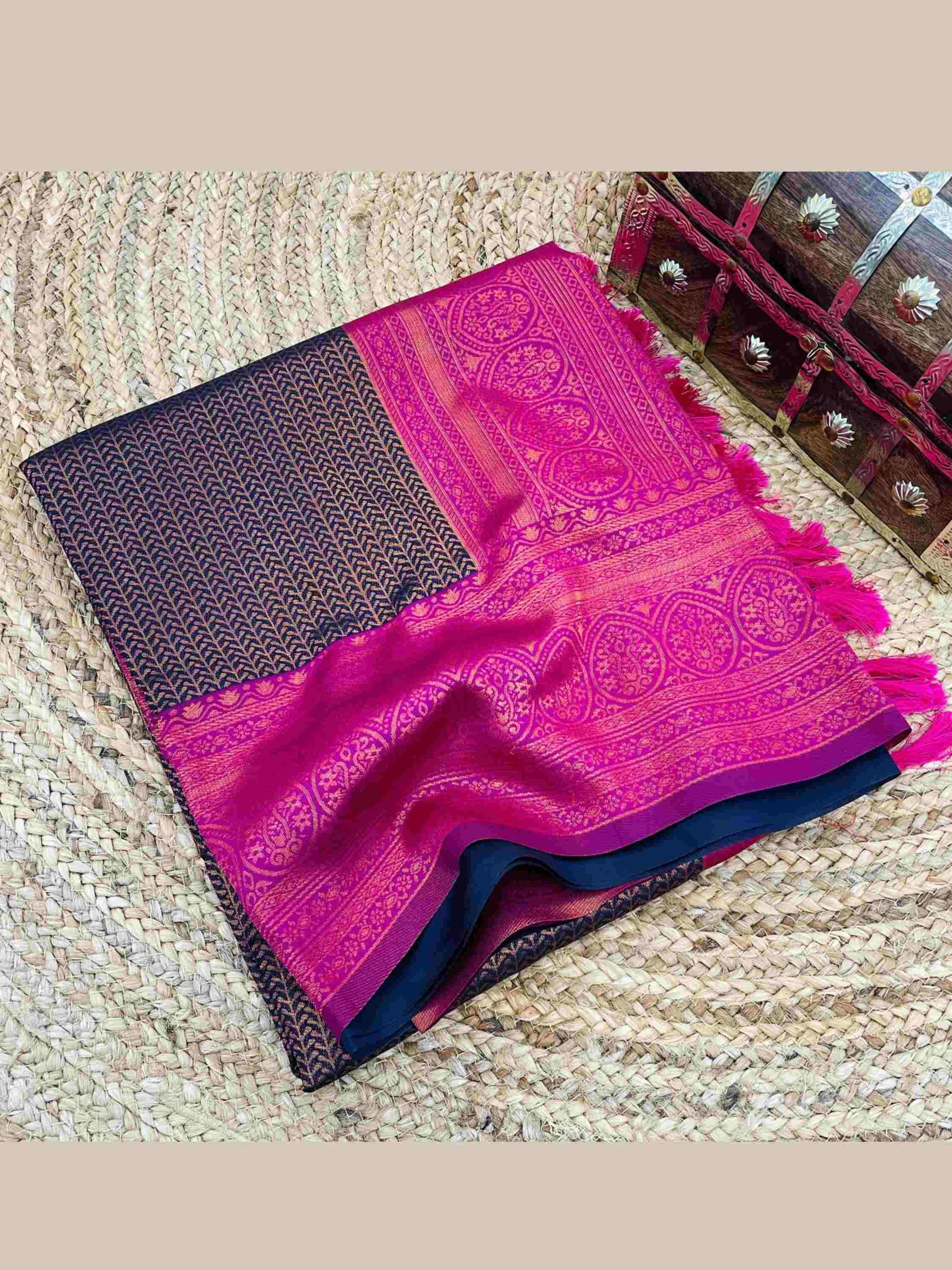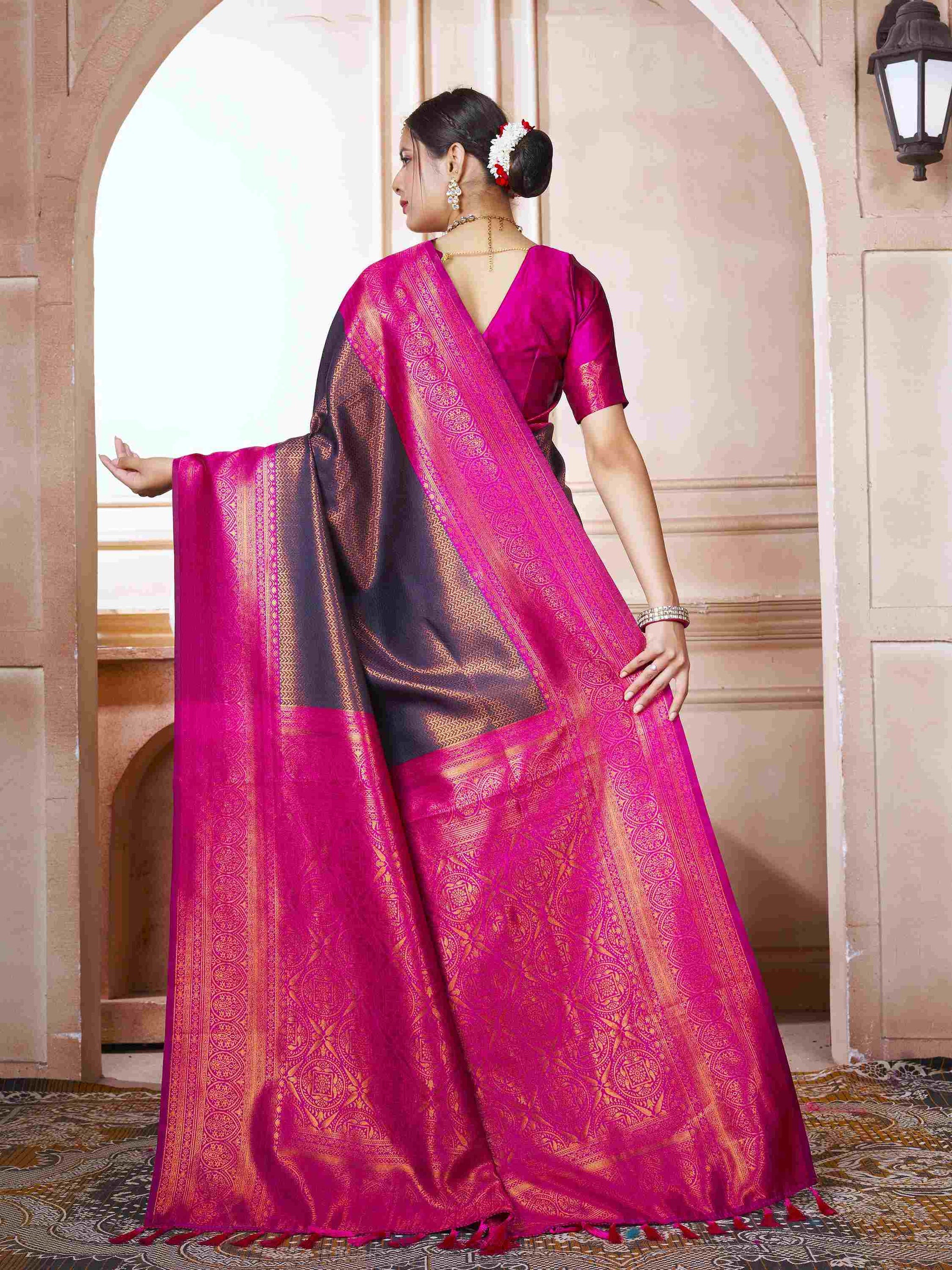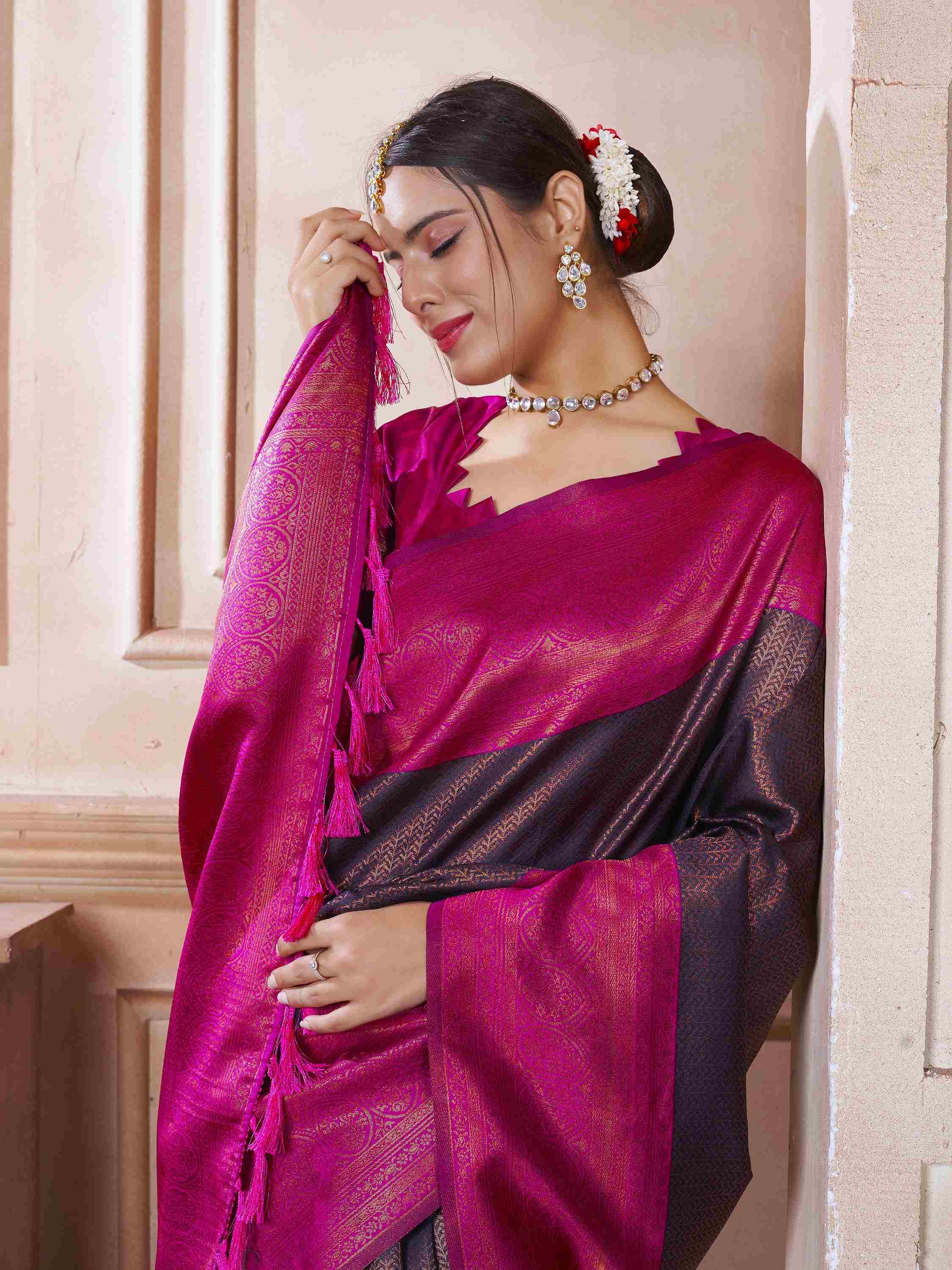 Kanjivaram Saree Wine has all-over zari work comes with pink border, pallu, and blouse piece. Premium Kanchipuram silk saree can wear in weddings/ parties.