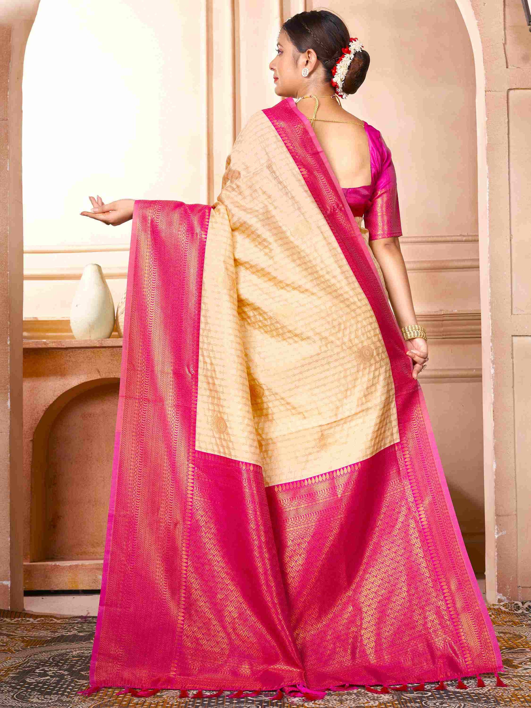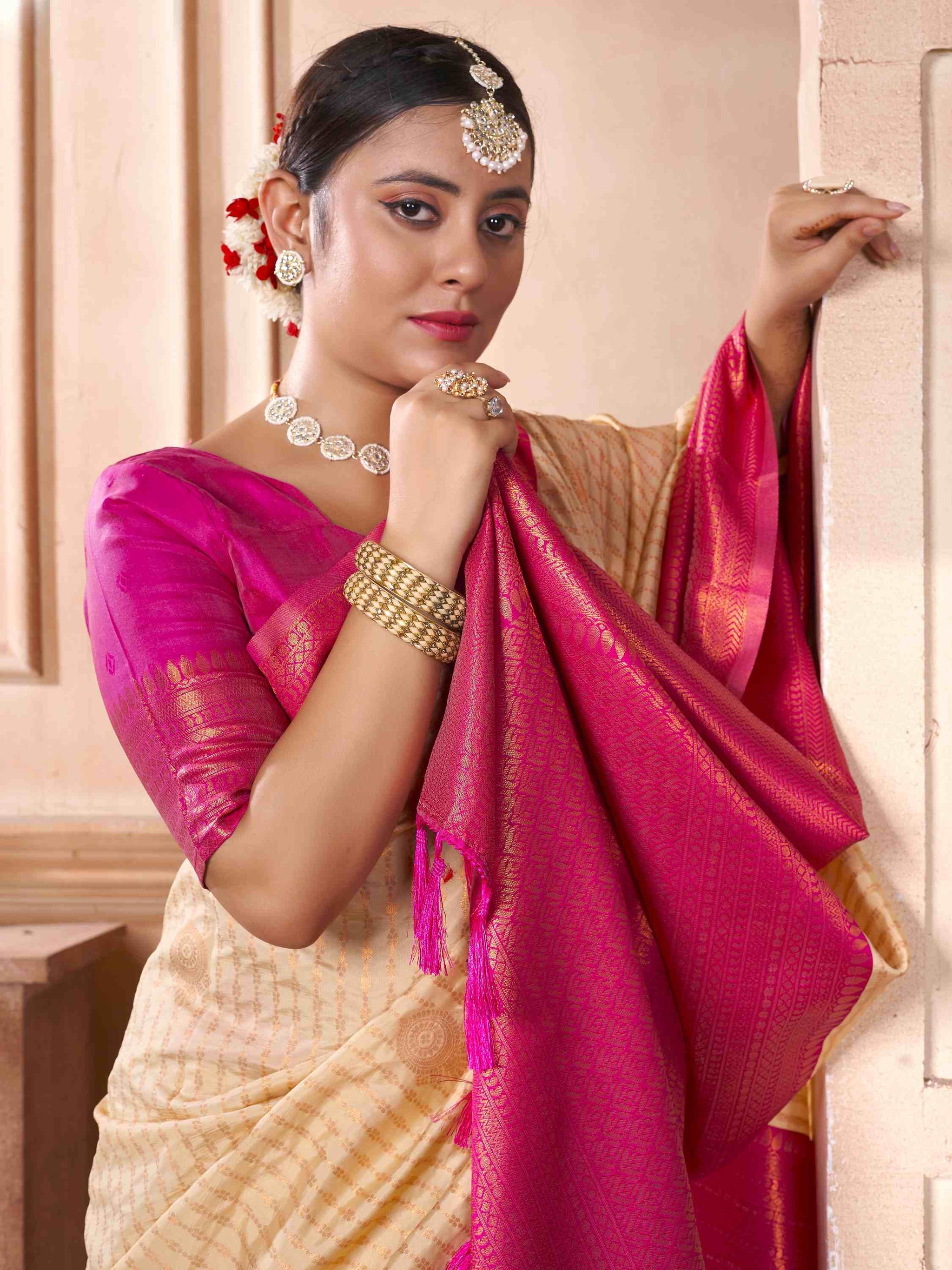Kanjivaram Silk Saree Beige comes with pink blouse piece, border and pallu. This Kanchipuram Saree has zari border and all-over beautiful ethnic motifs.