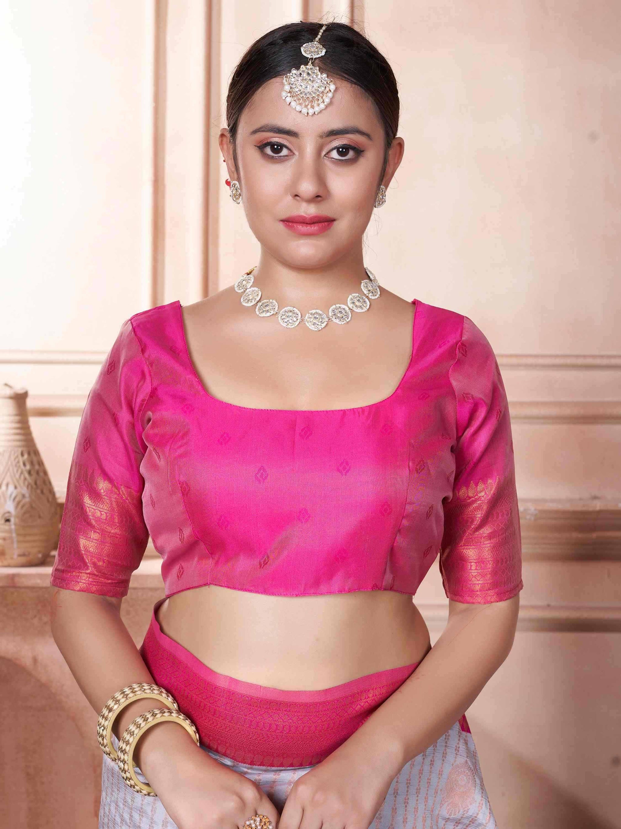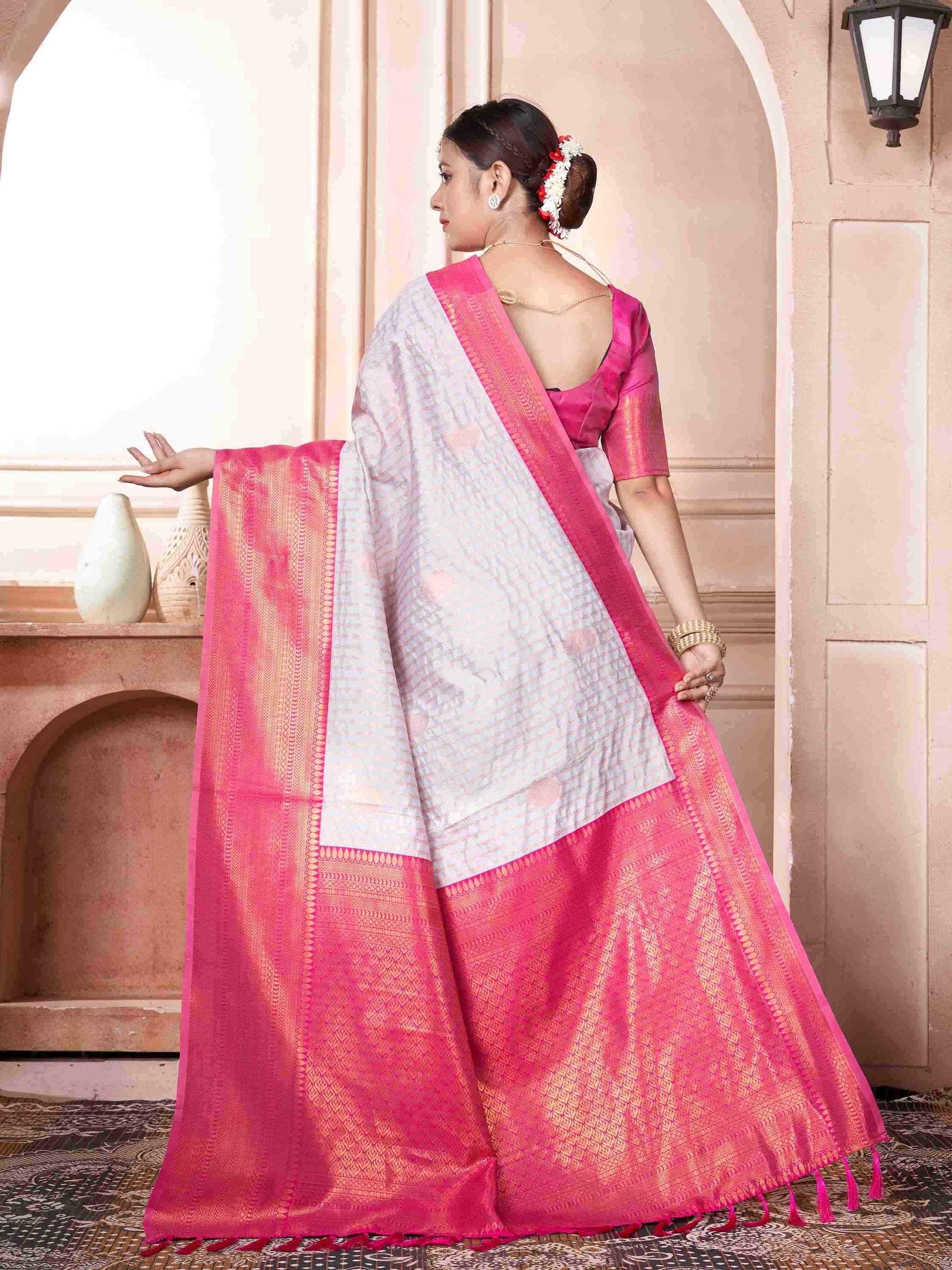 Kanjivaram Silk Saree Lavender comes with pink blouse piece, border and pallu. This Kanchipuram Saree has zari border and all-over beautiful ethnic motifs.