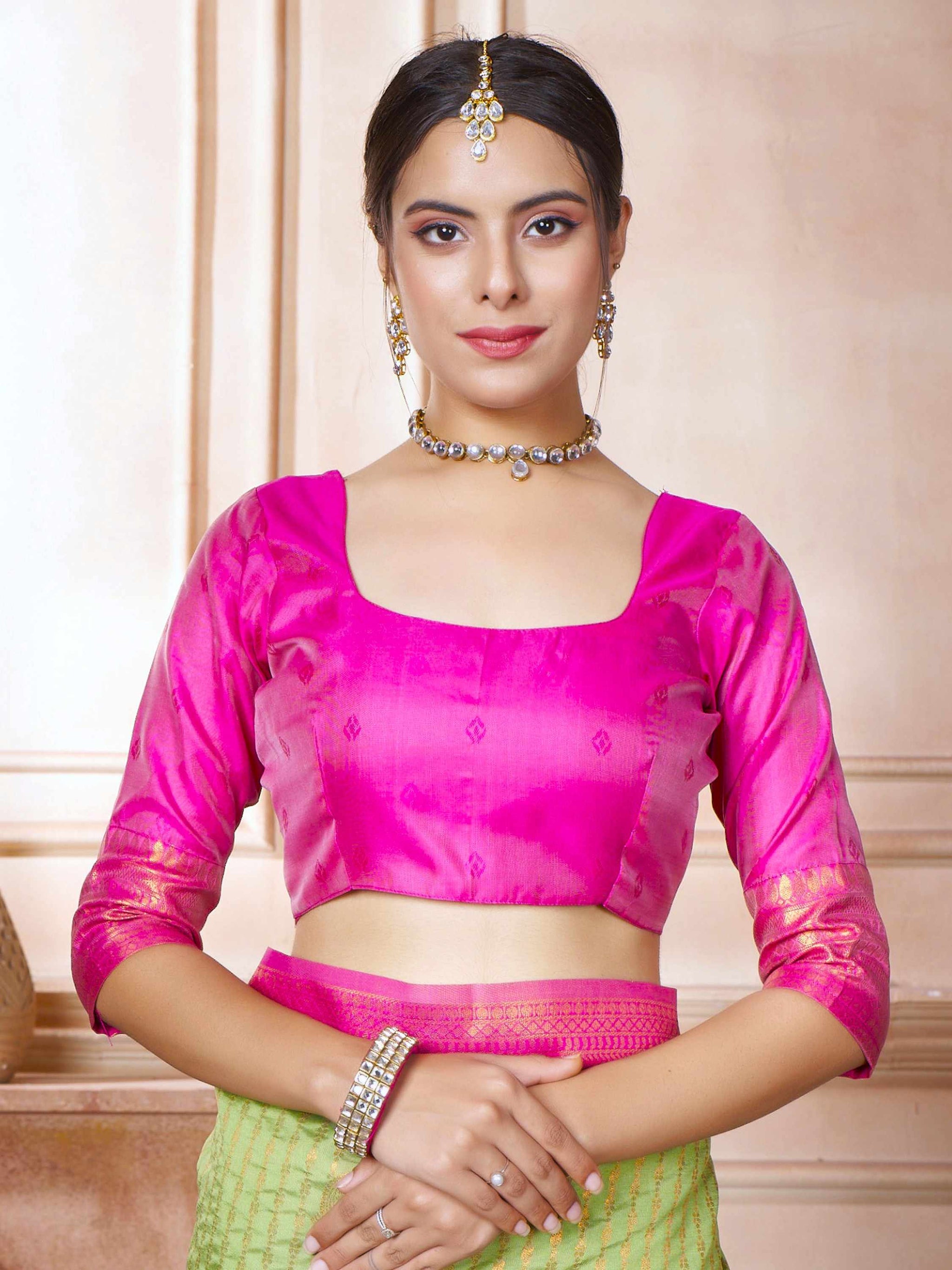 Kanjivaram Silk Saree Light Green comes with pink blouse piece, border and pallu. This Kanchipuram Saree has zari border and all-over beautiful ethnic motifs.