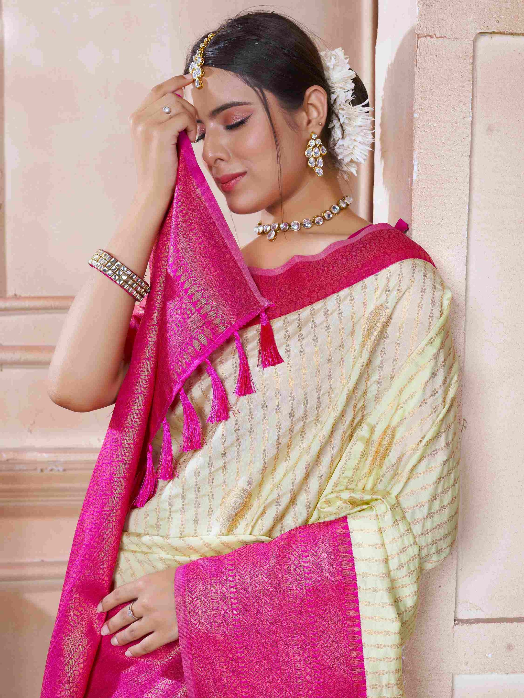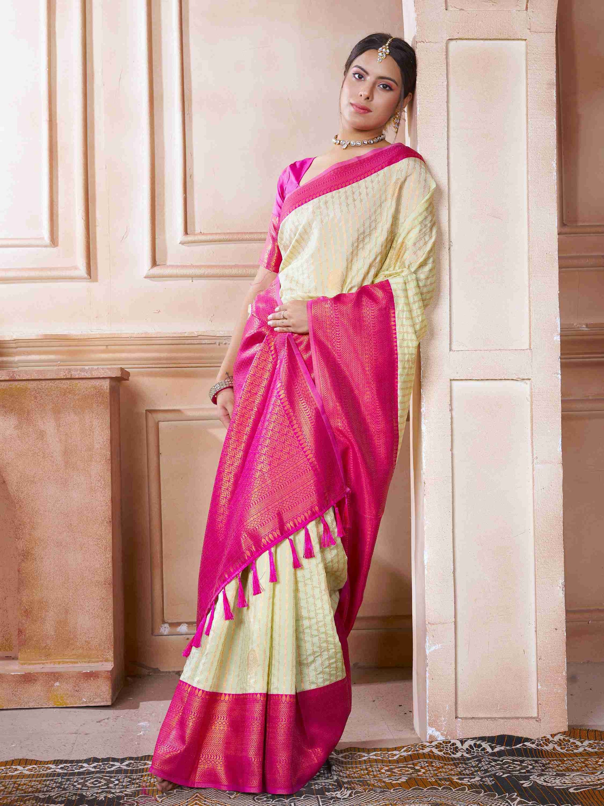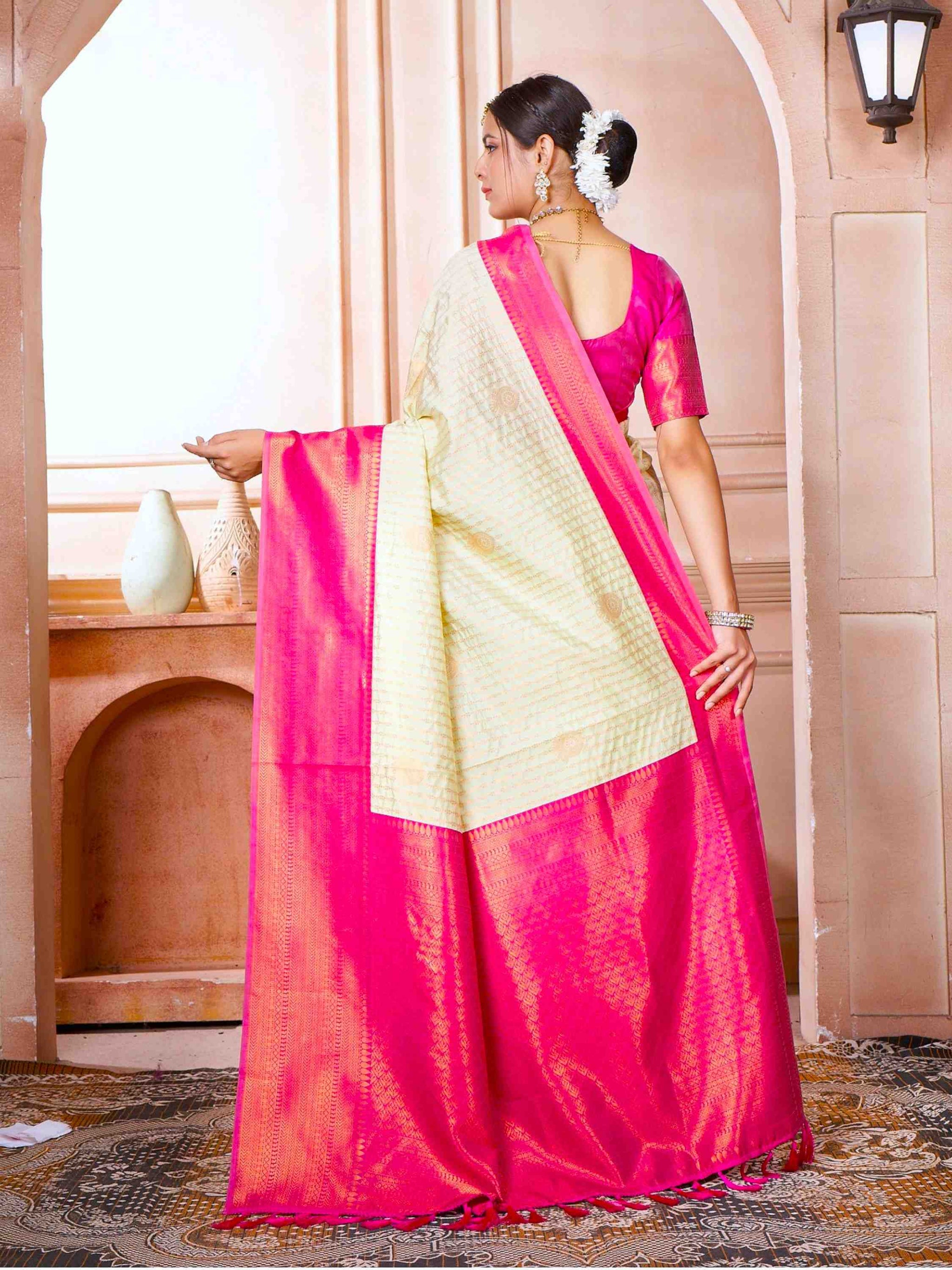 Kanjivaram Silk Saree Off White comes with pink blouse piece, border and pallu. This Kanchipuram Saree has zari border and all-over beautiful ethnic motifs.