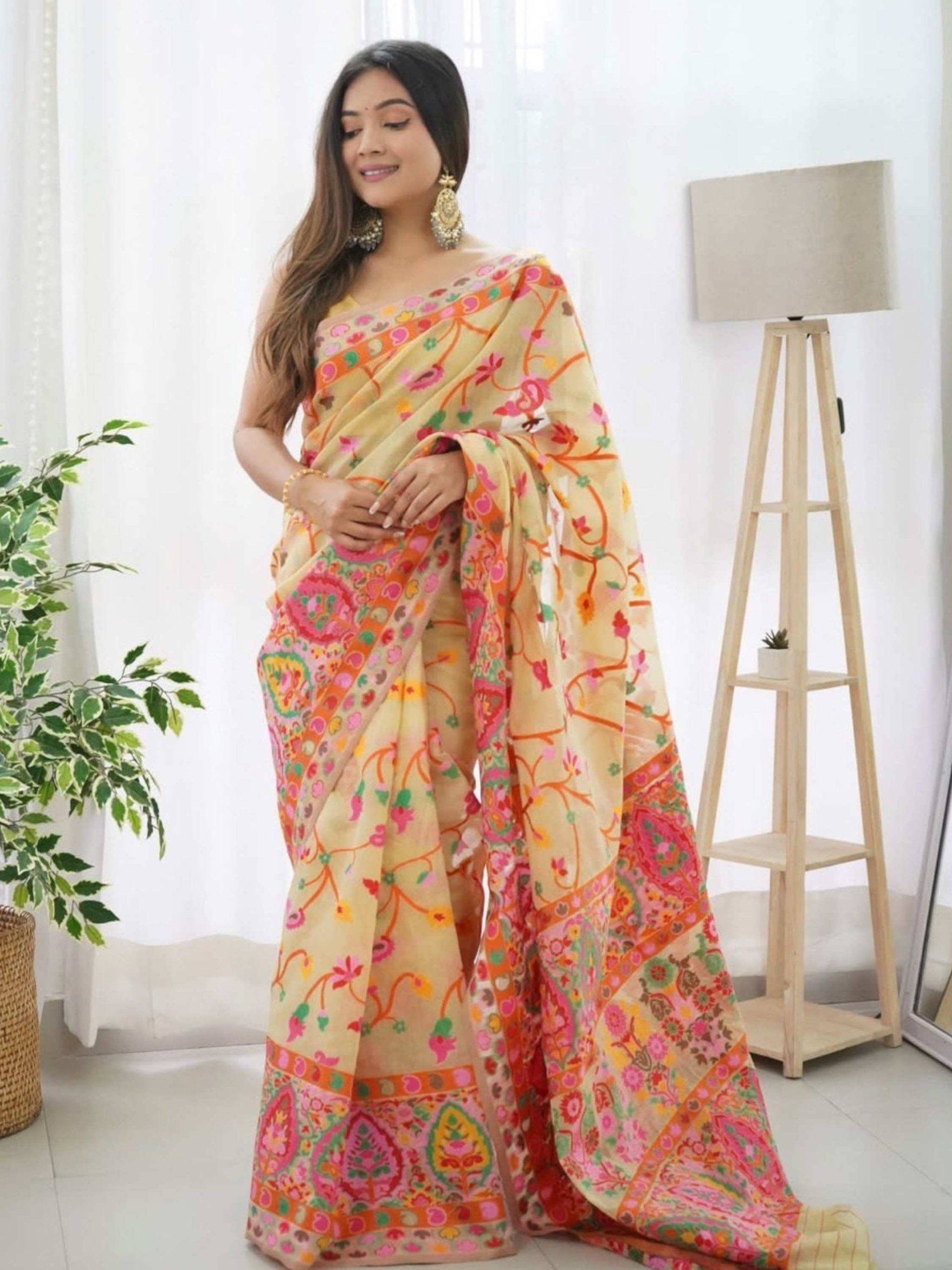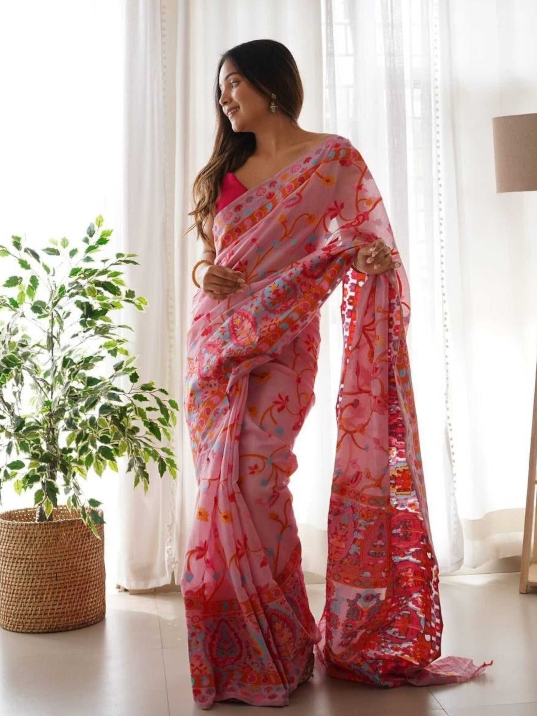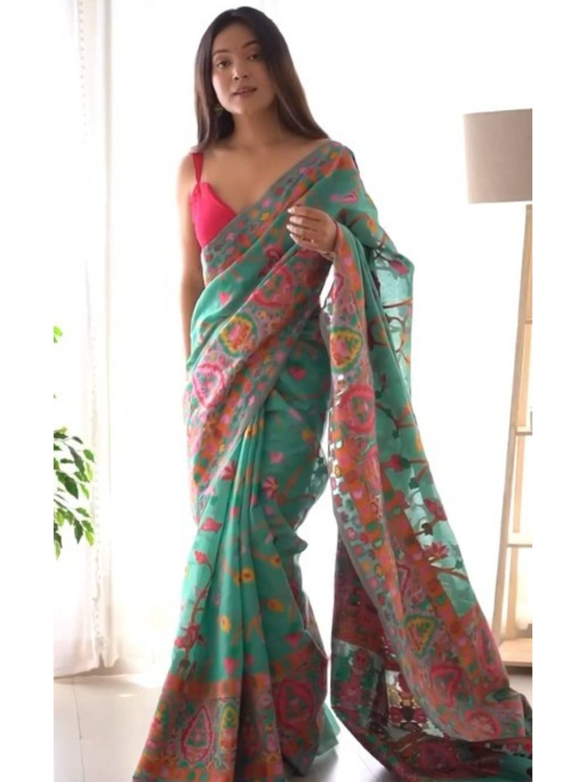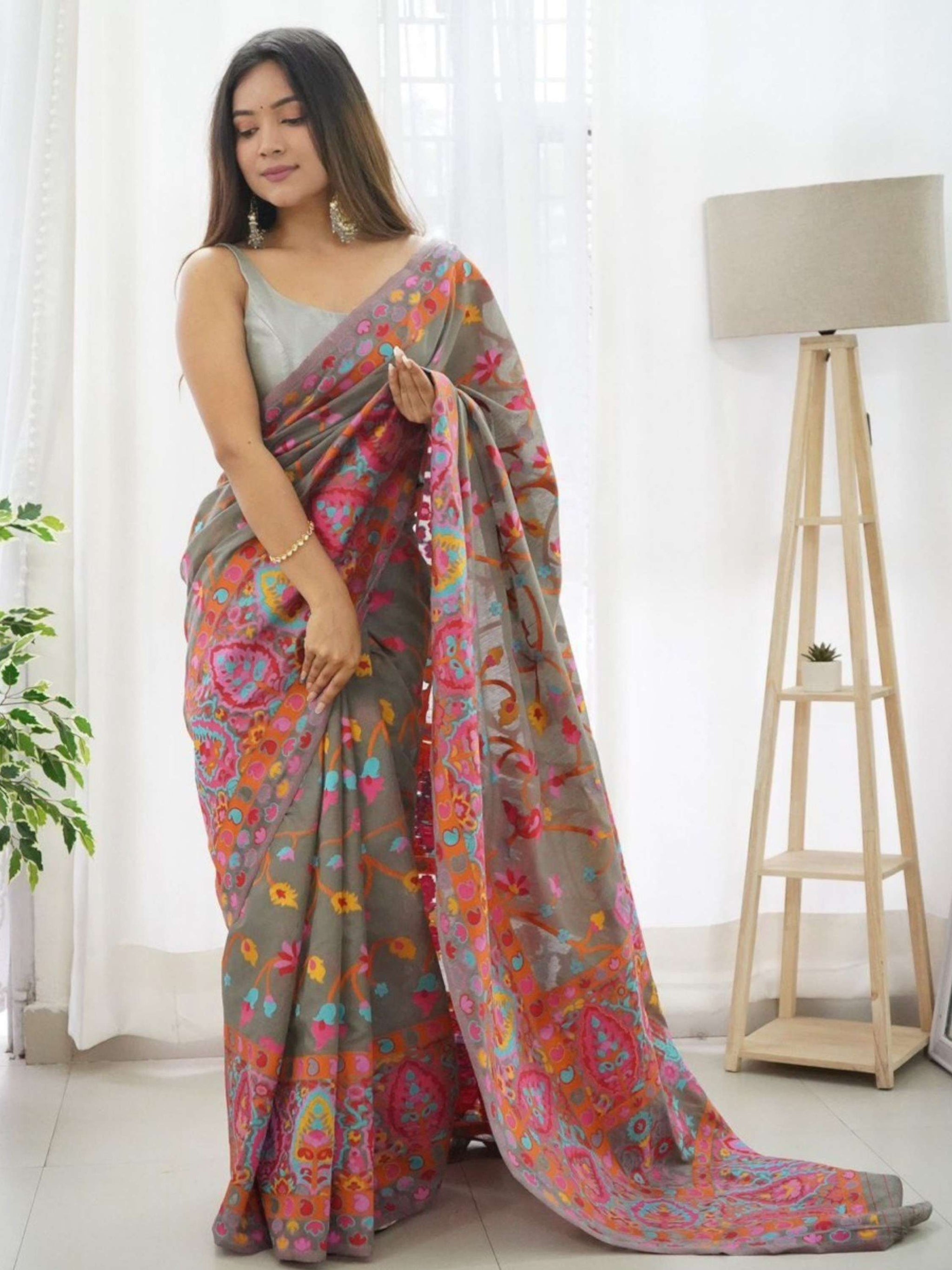 Grace any occasion in this Pashmina saree intricate Kachi work, floral patterns, and a matching running blouse piece—ideal for parties and weddings!