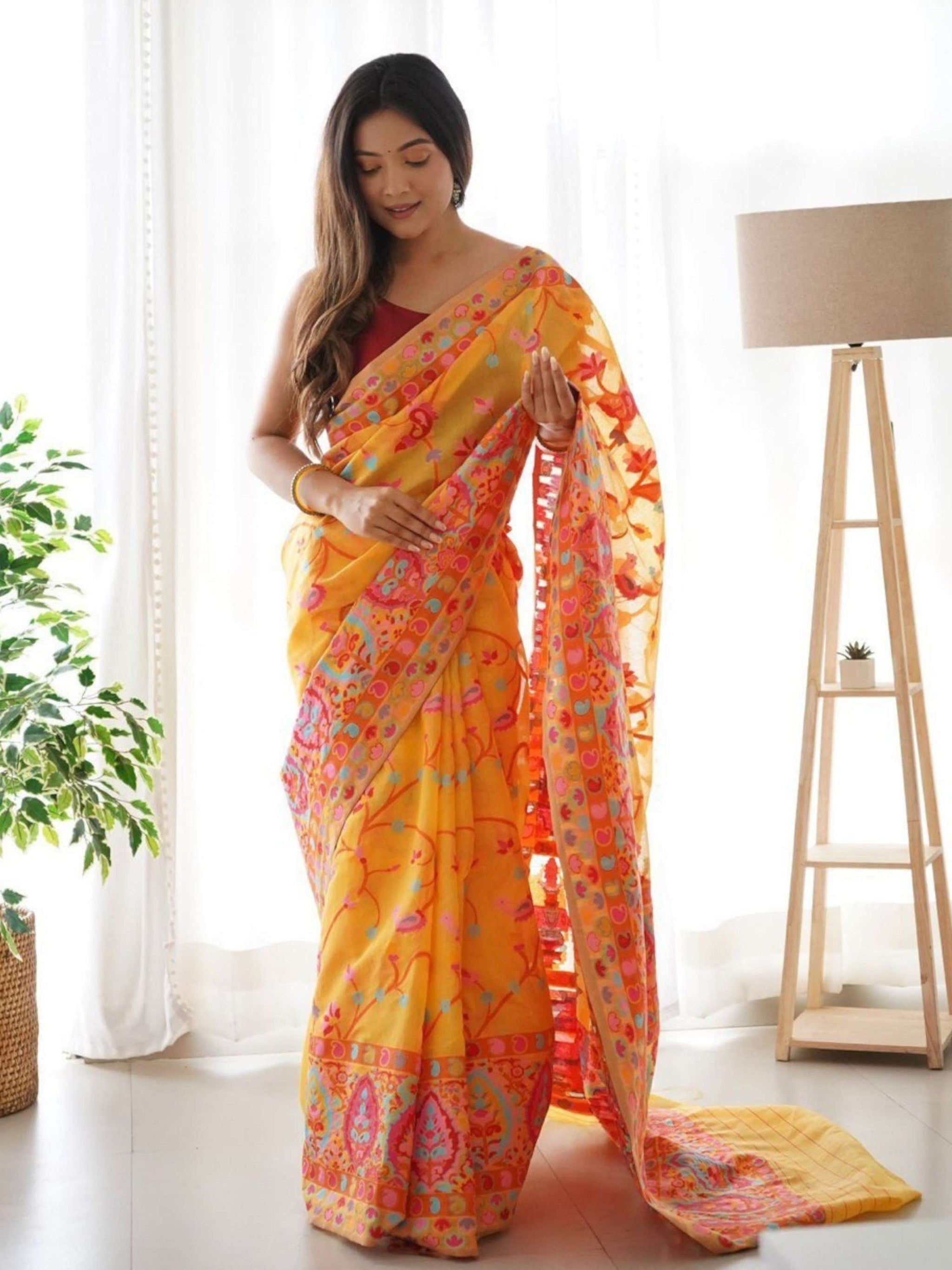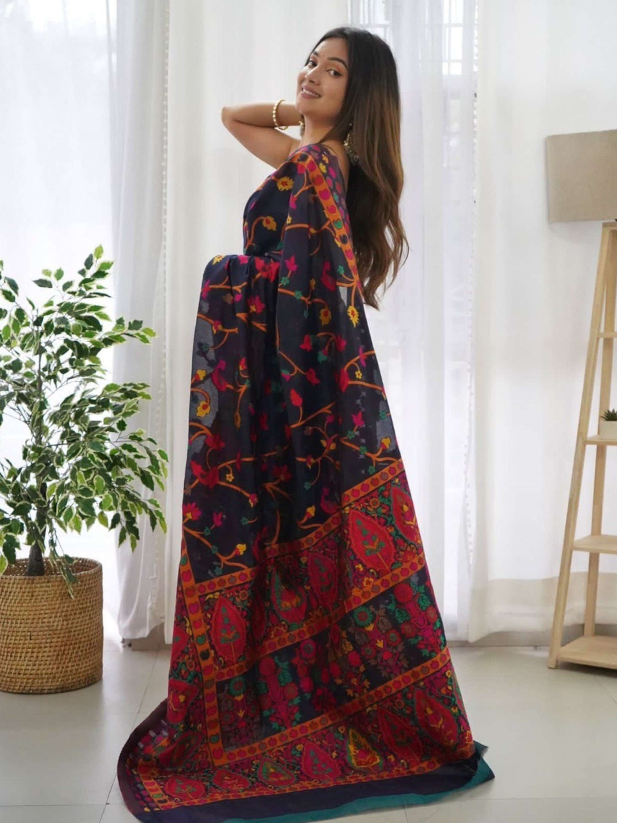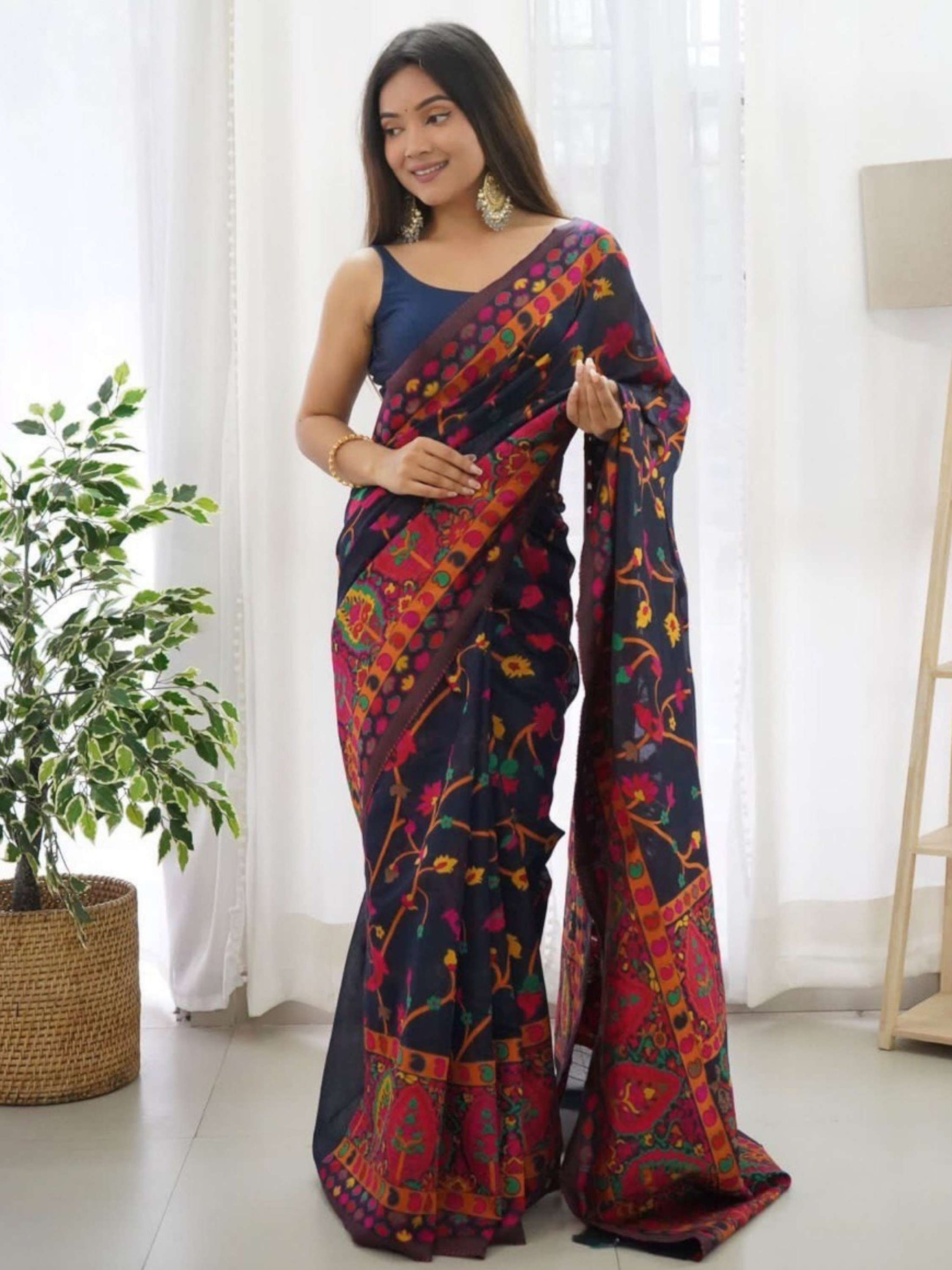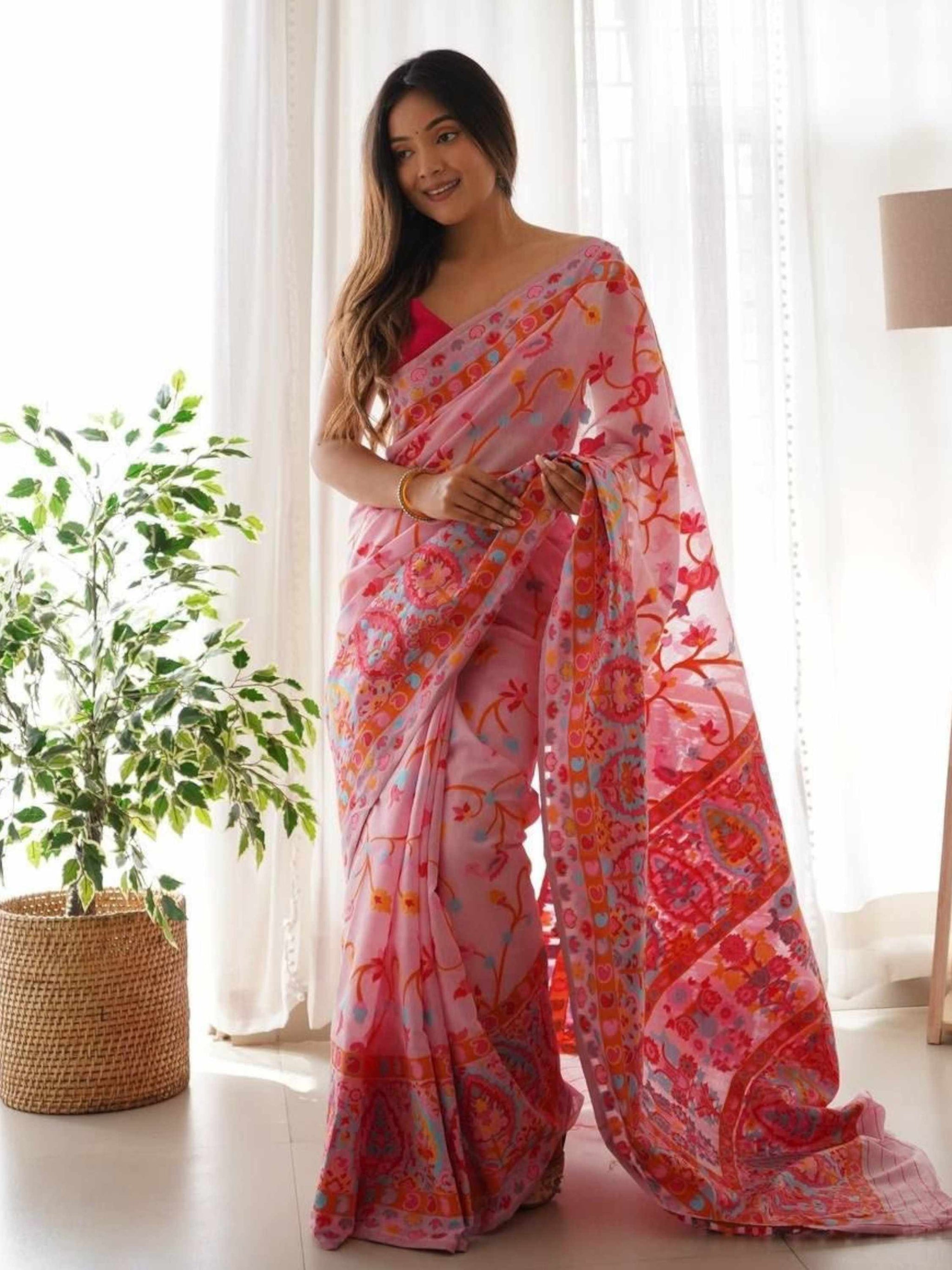 Grace any occasion in this Pashmina saree intricate Kachi work, floral patterns, and a matching running blouse piece—ideal for parties and weddings!
