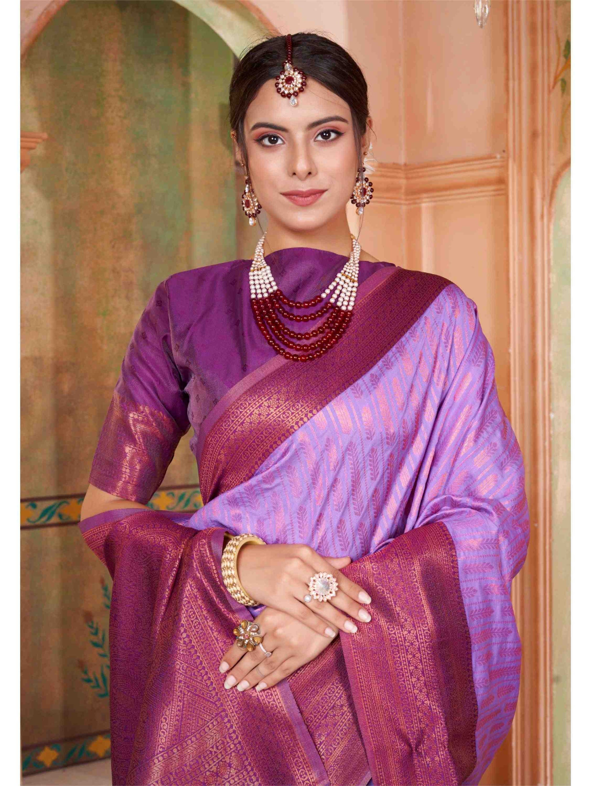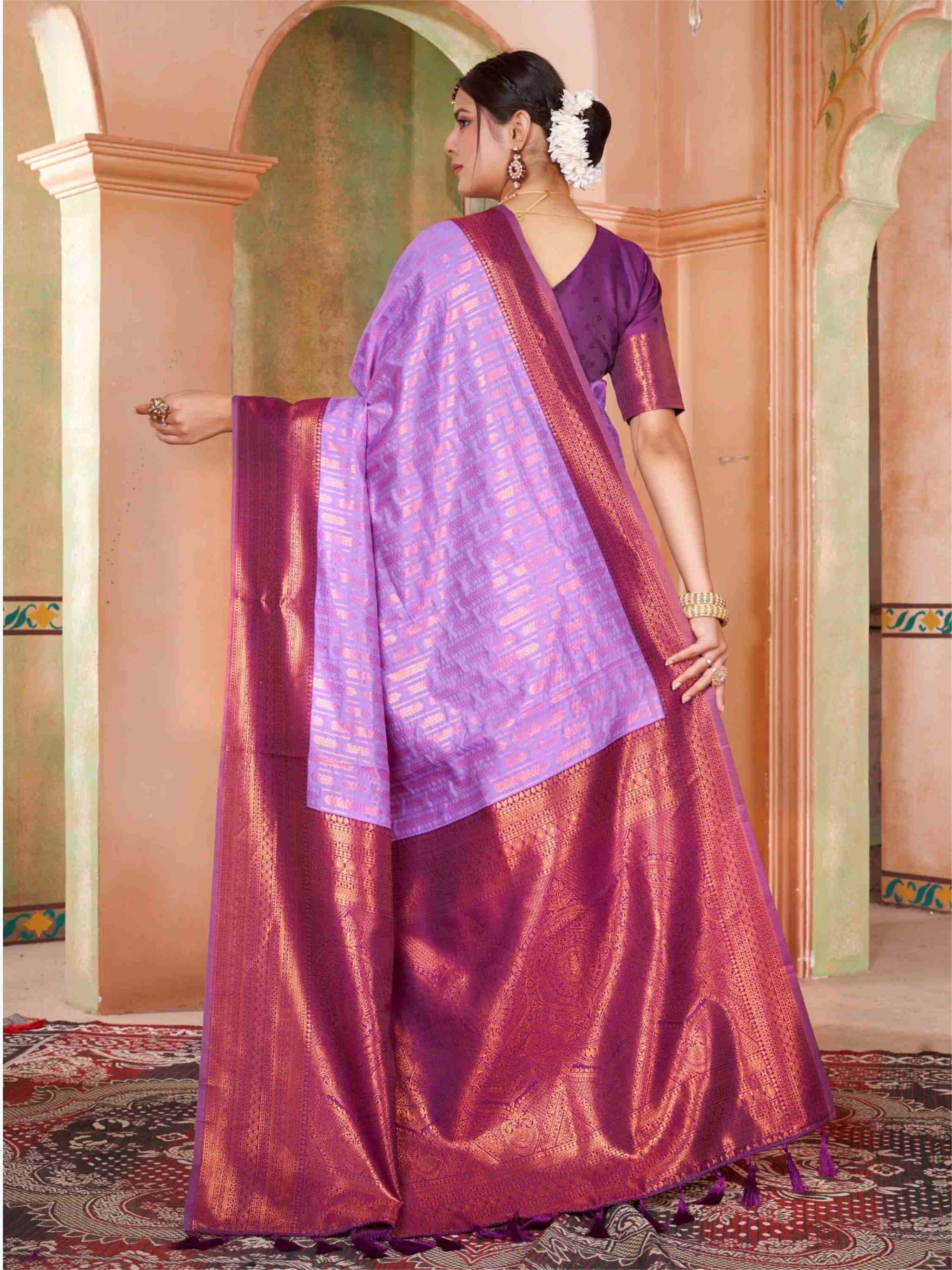 Lavender Kanjivaram Silk Saree with Purple Border, featuring traditional ethnic motifs and rich zari weave—perfect for weddings, festivals, and party occasions,